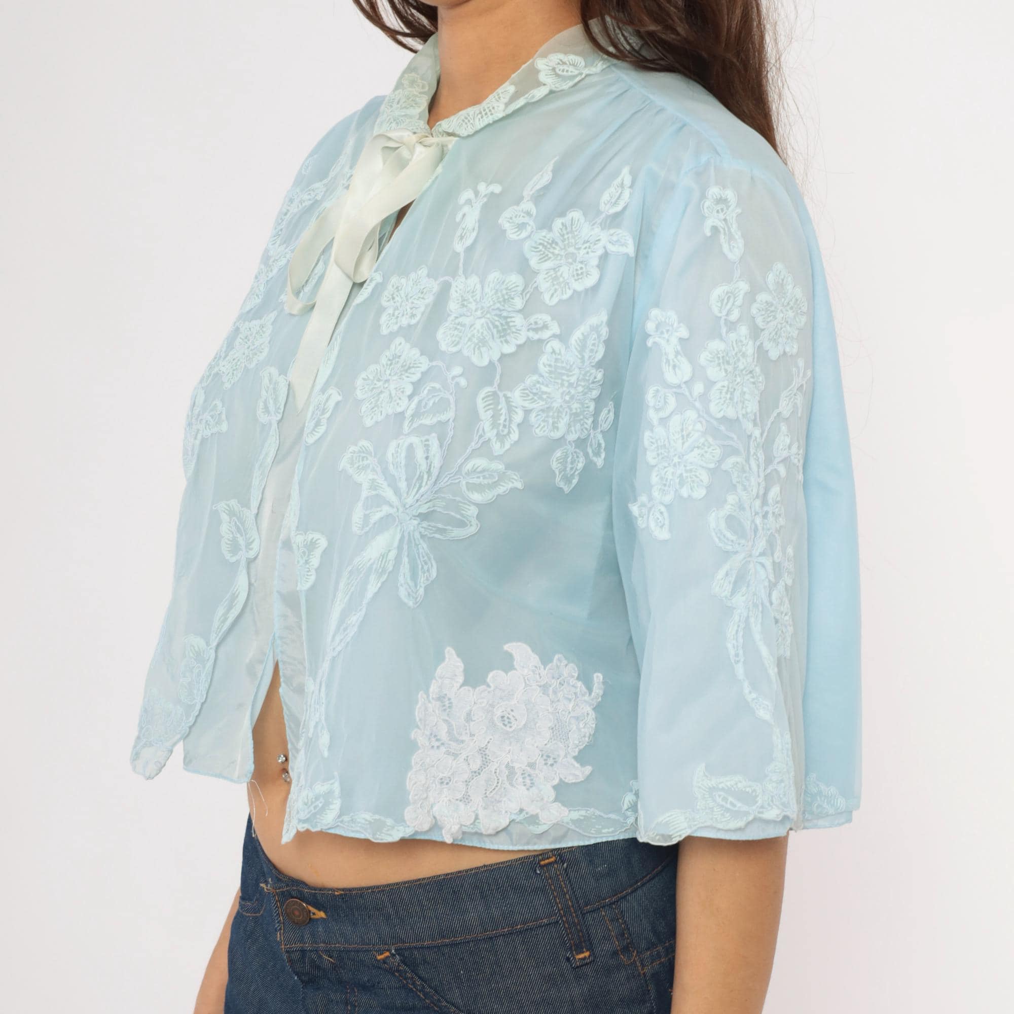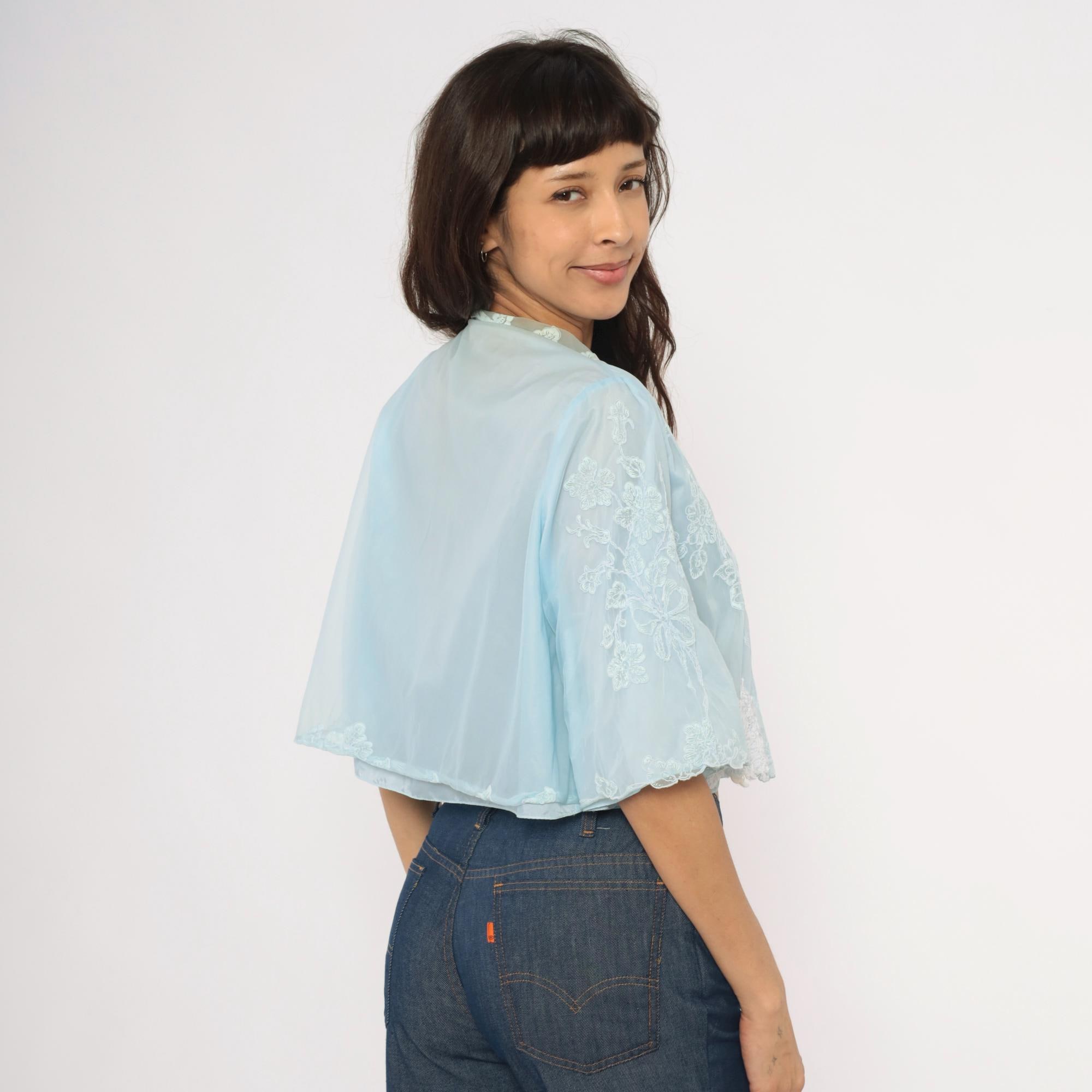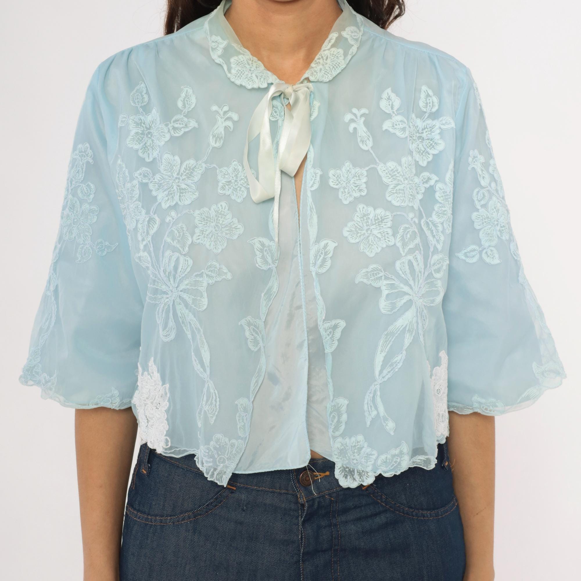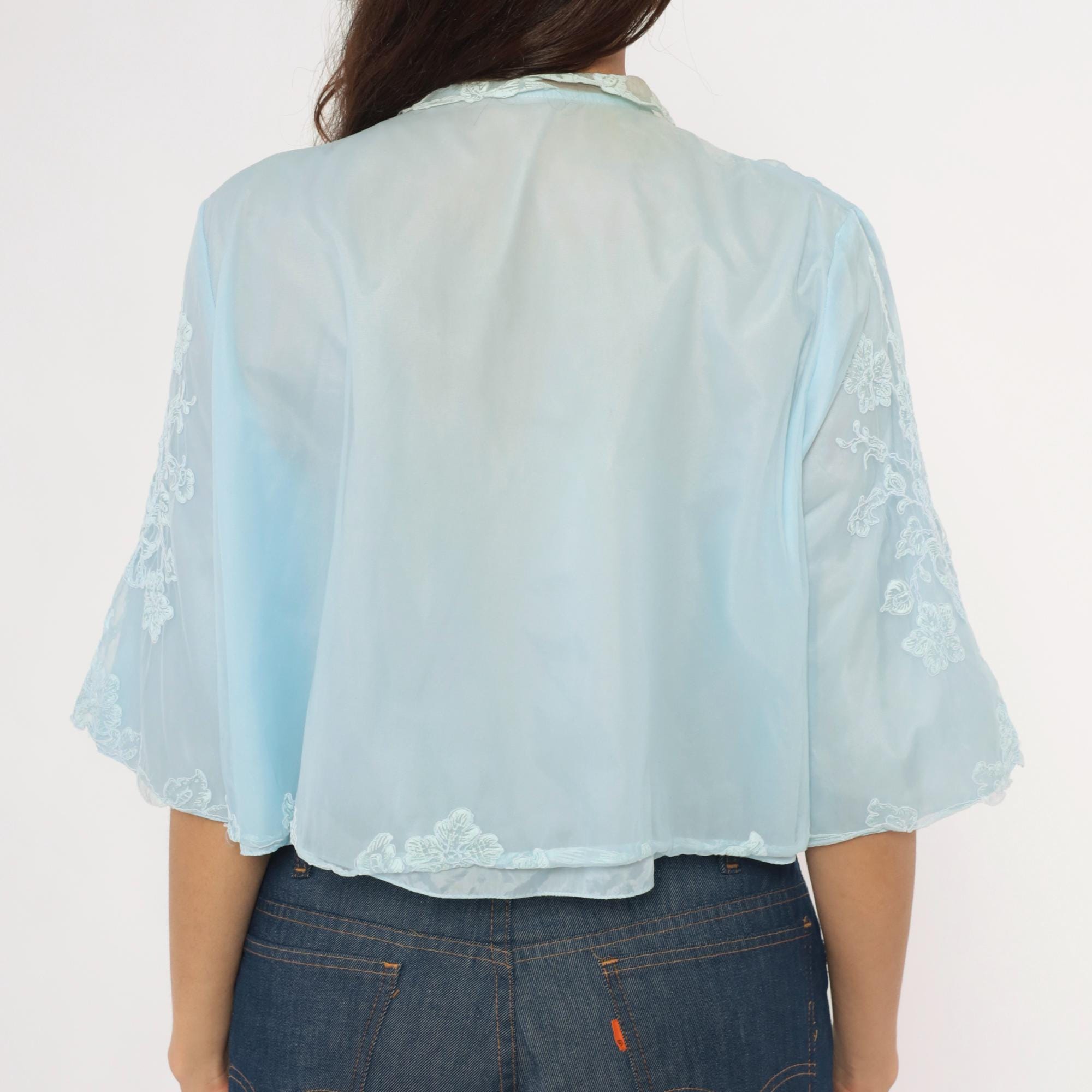 70s pale blue bed jacket from Odette Barsa with allover white floral embroidery on sheer fabric. Peter Pan collar with lace appliqué detail and satin ribbon tie closure at the neck. Wide bell sleeves with scalloped embroidered edges and a cropped open-front silhouette hitting at the waist.