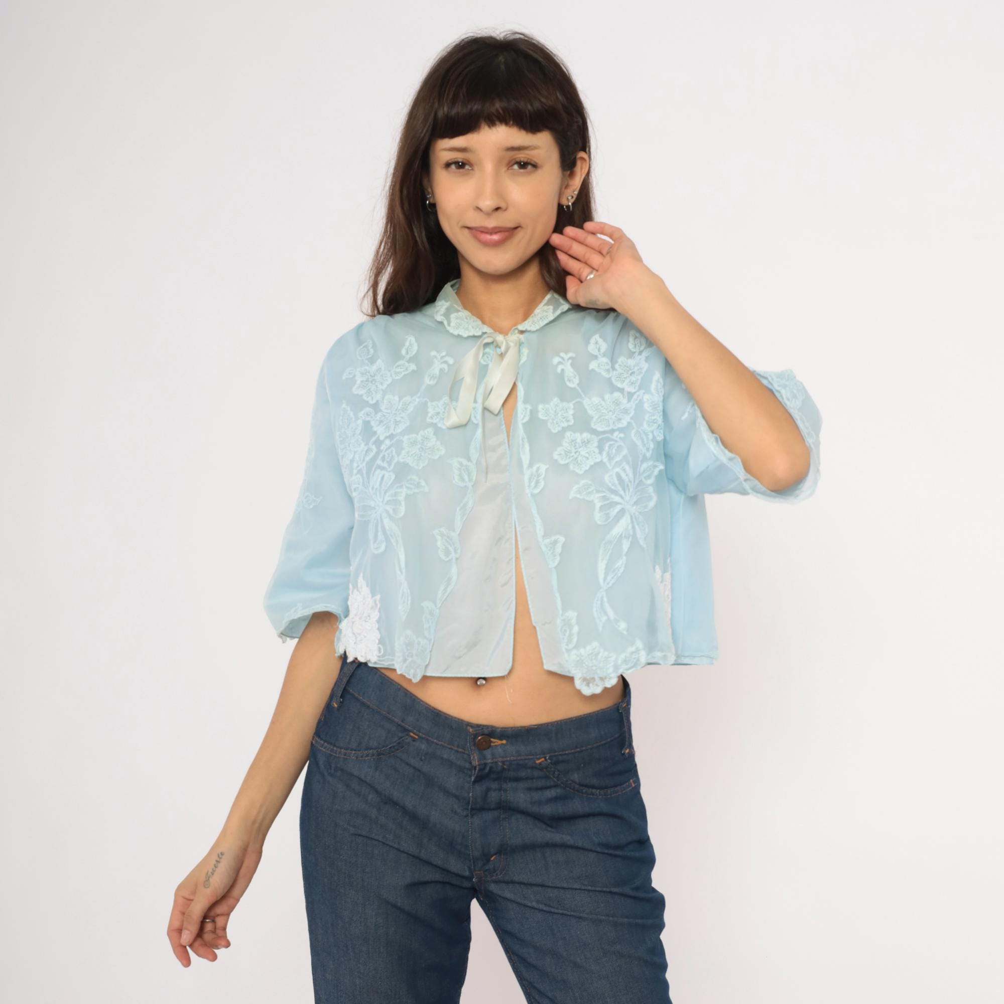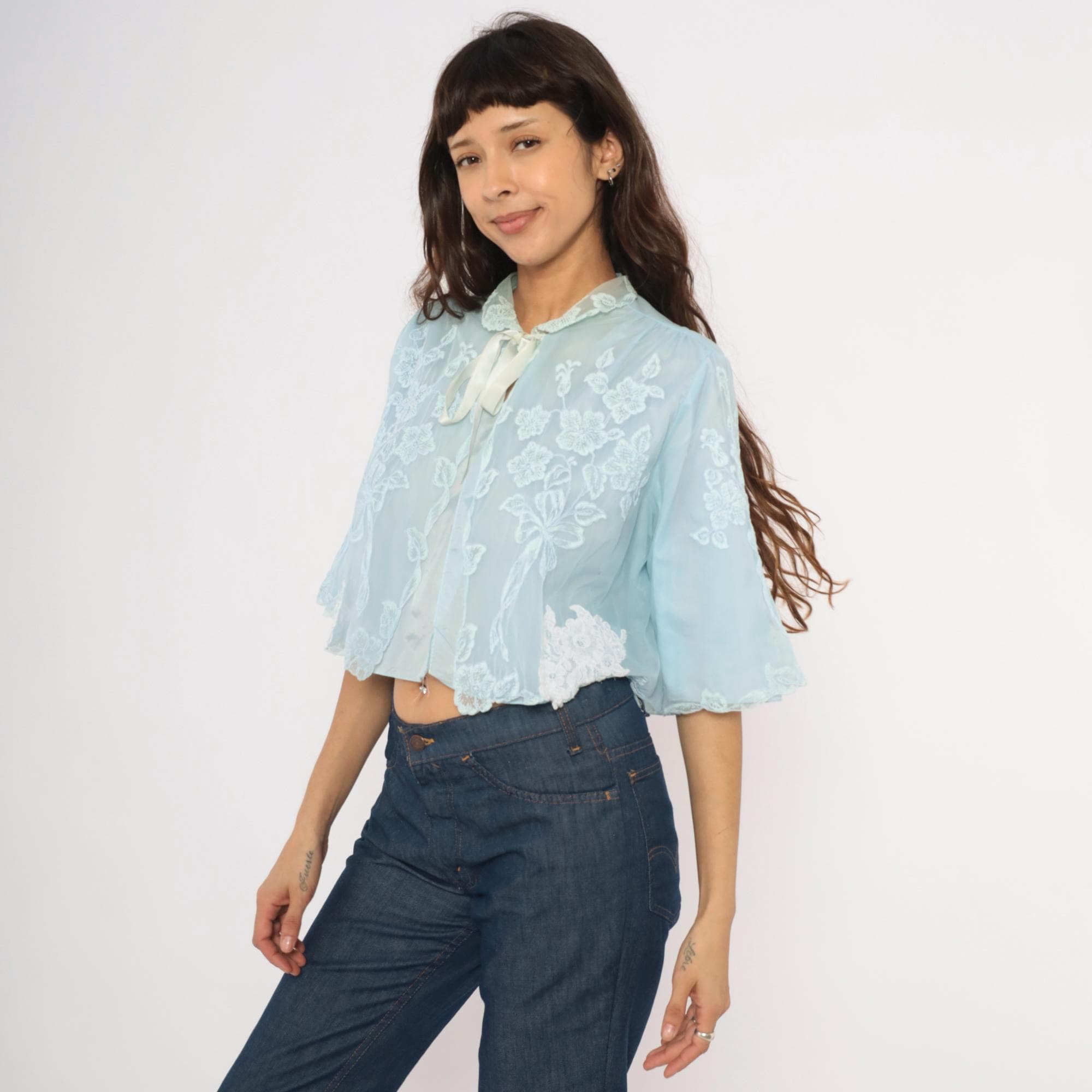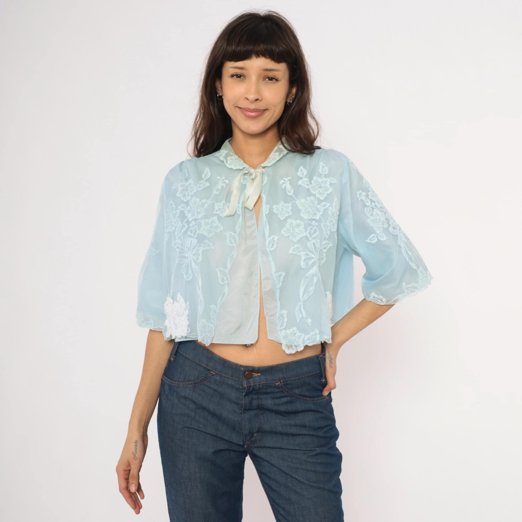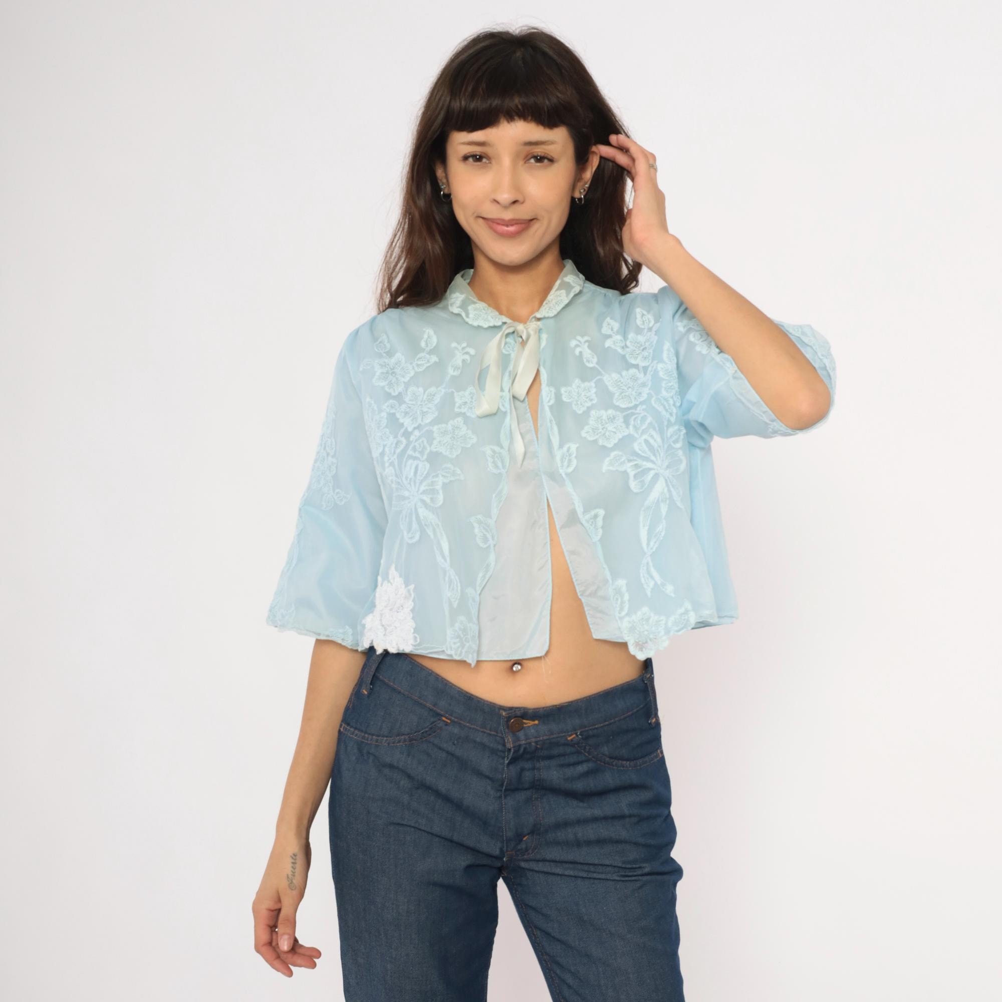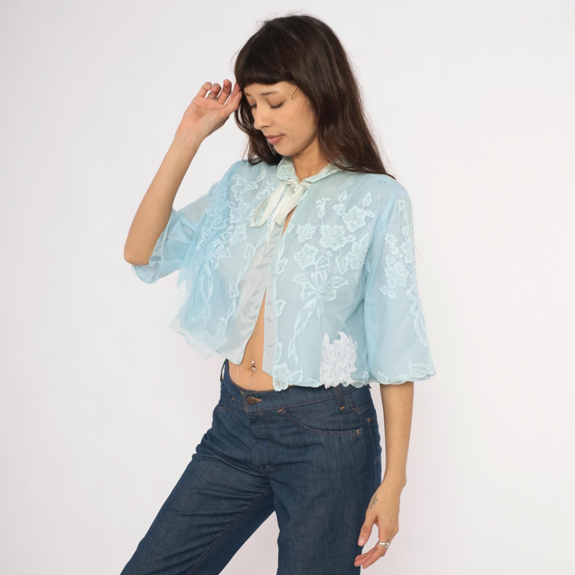 70s pale blue bed jacket from Odette Barsa with allover white floral embroidery on sheer fabric. Peter Pan collar with lace appliqué detail and satin ribbon tie closure at the neck. Wide bell sleeves with scalloped embroidered edges and a cropped open-front silhouette hitting at the waist.