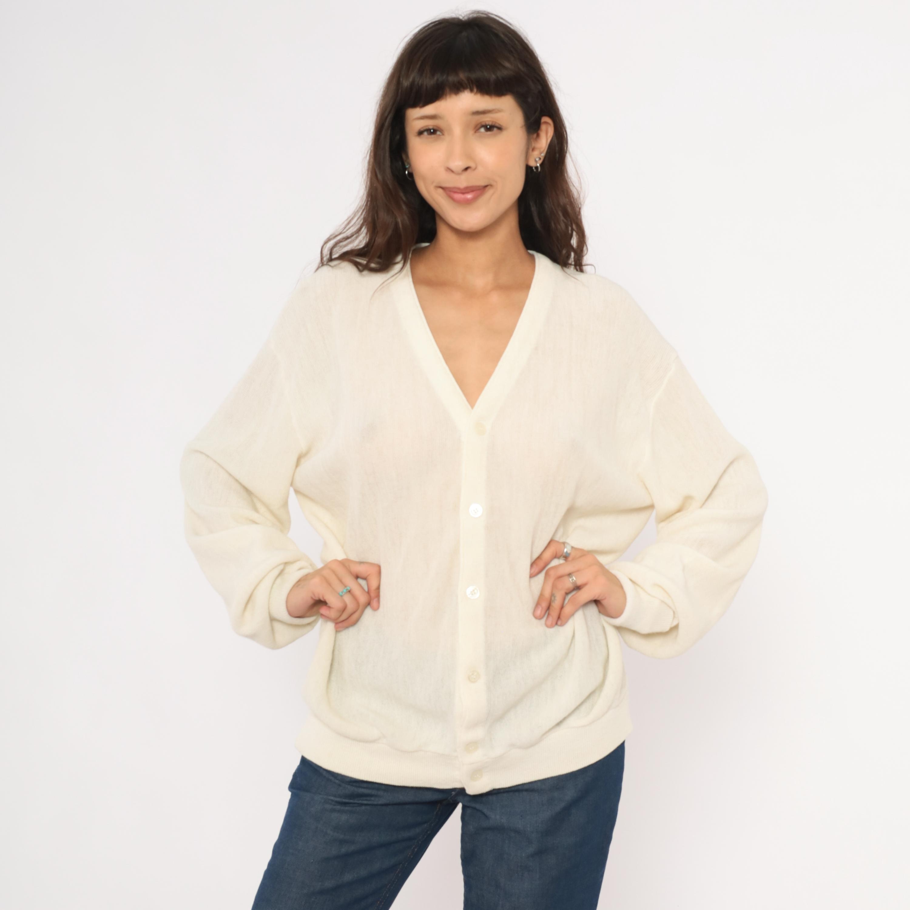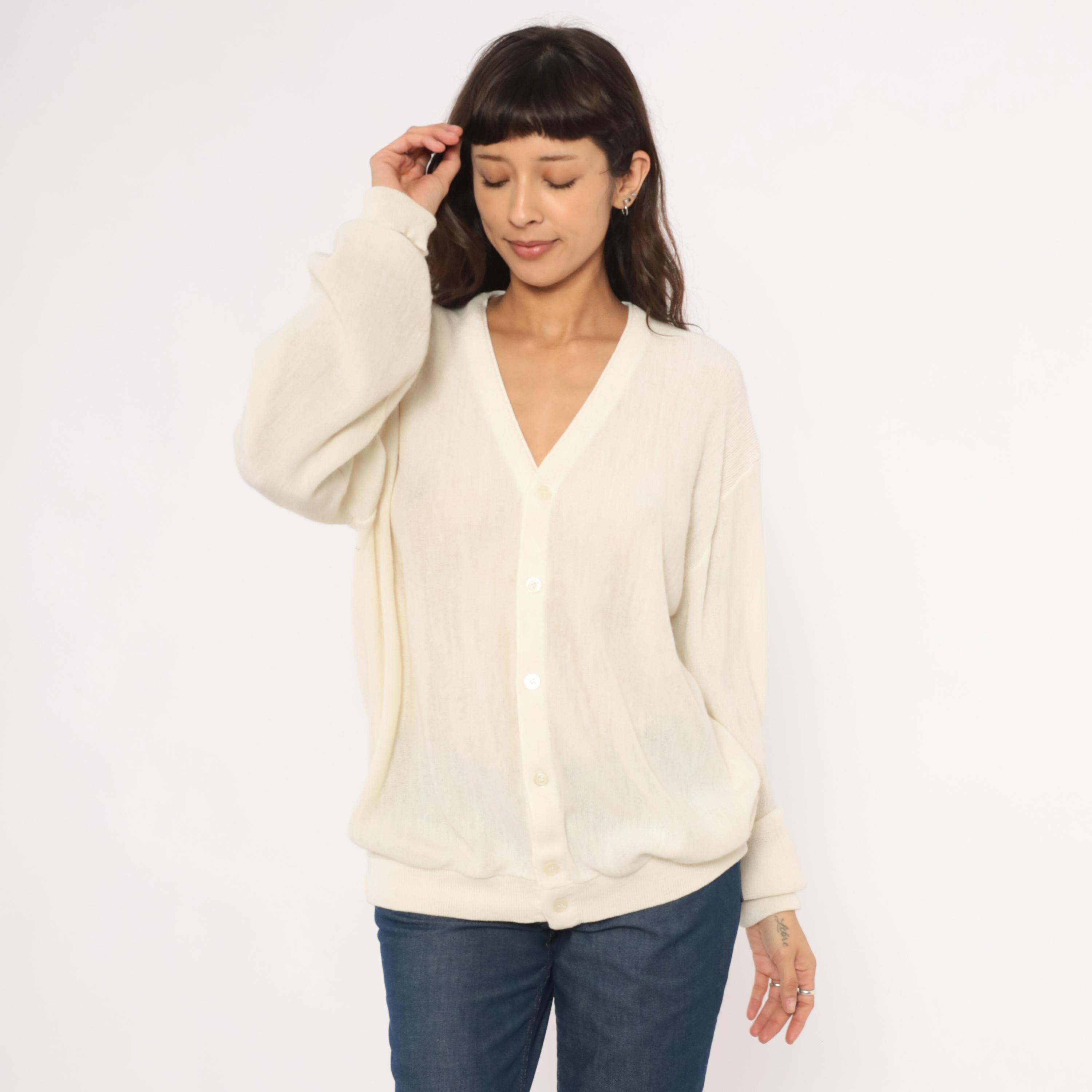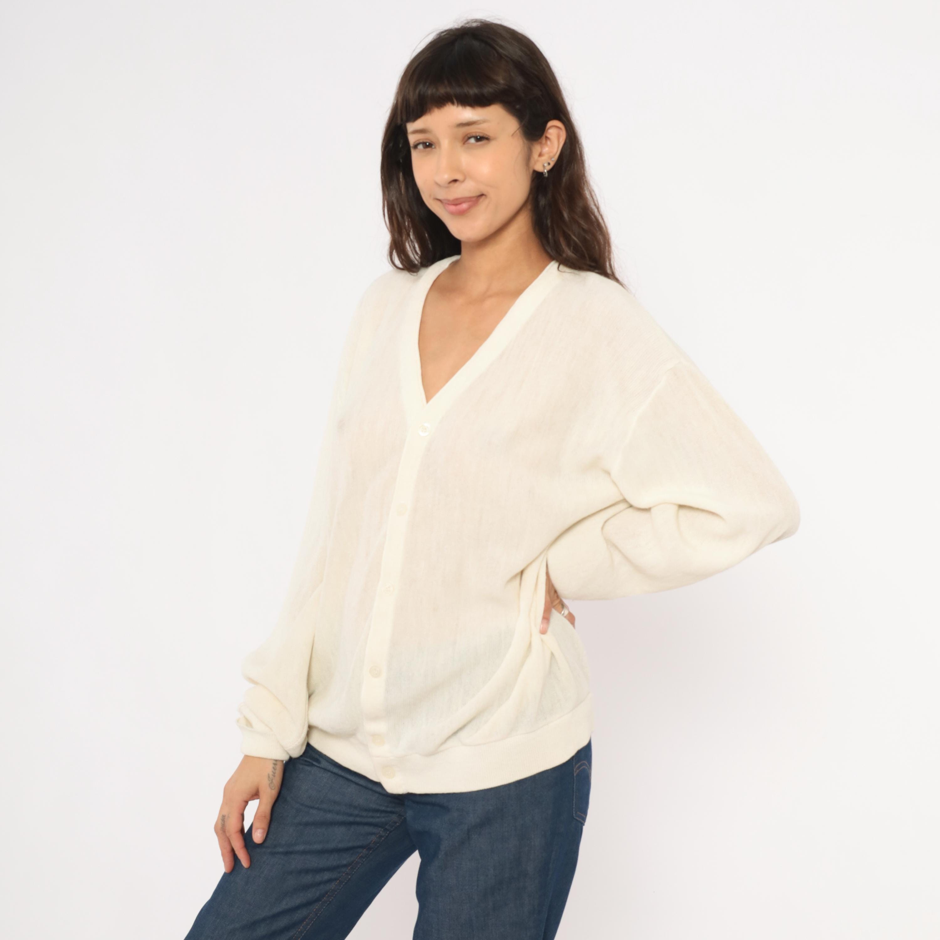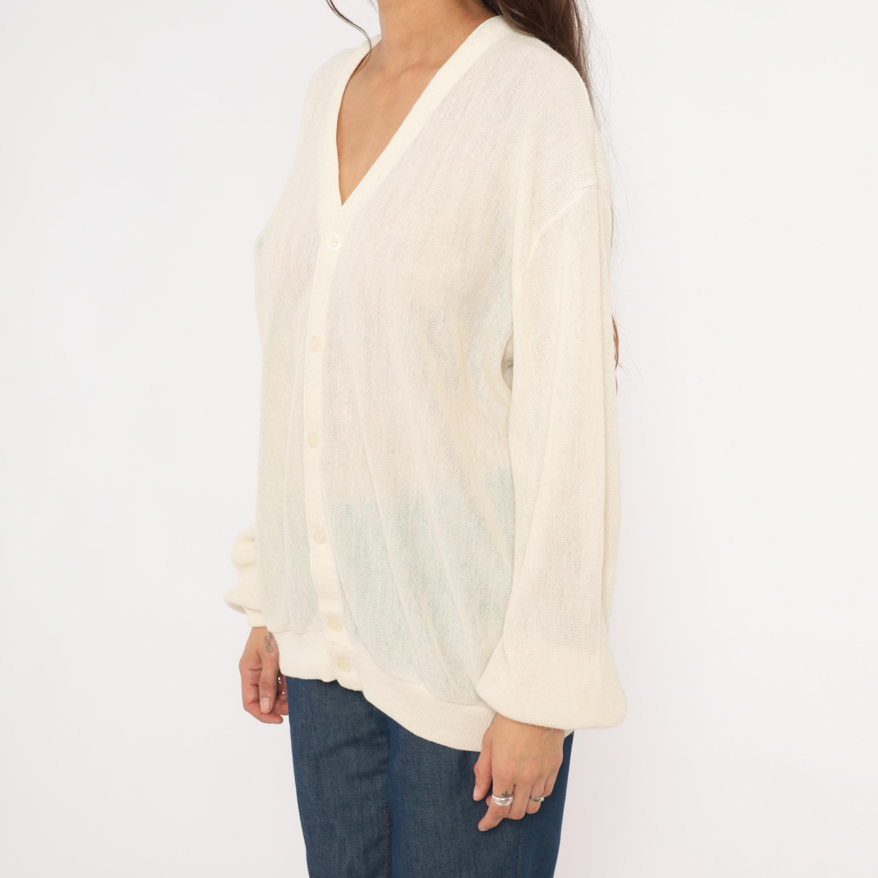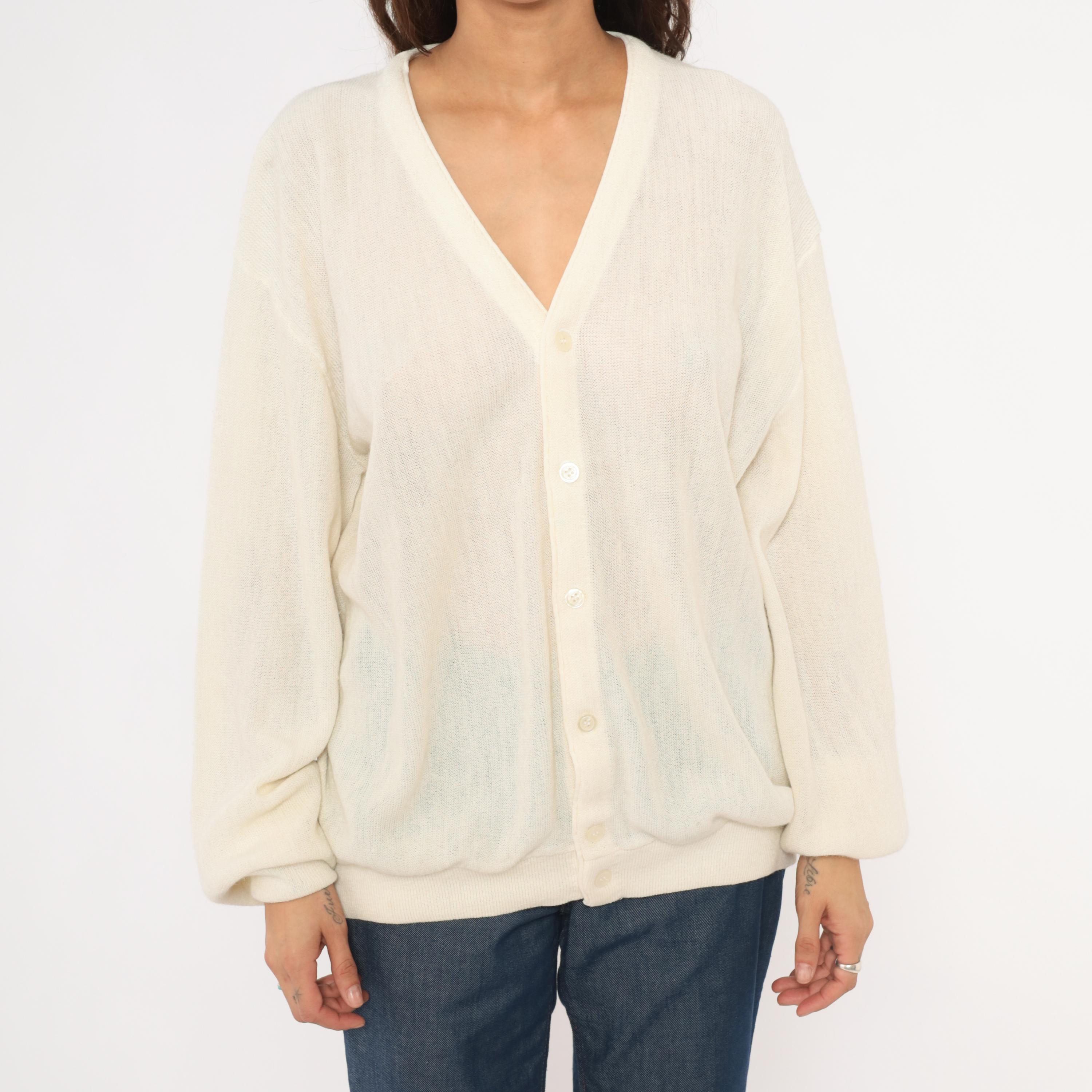 80s ivory knit cardigan from Jantzen with a deep V neckline and front button closure. Sheer, open-gauge knit throughout the body and long sleeves with ribbed cuffs, hem band, and neckline trim.