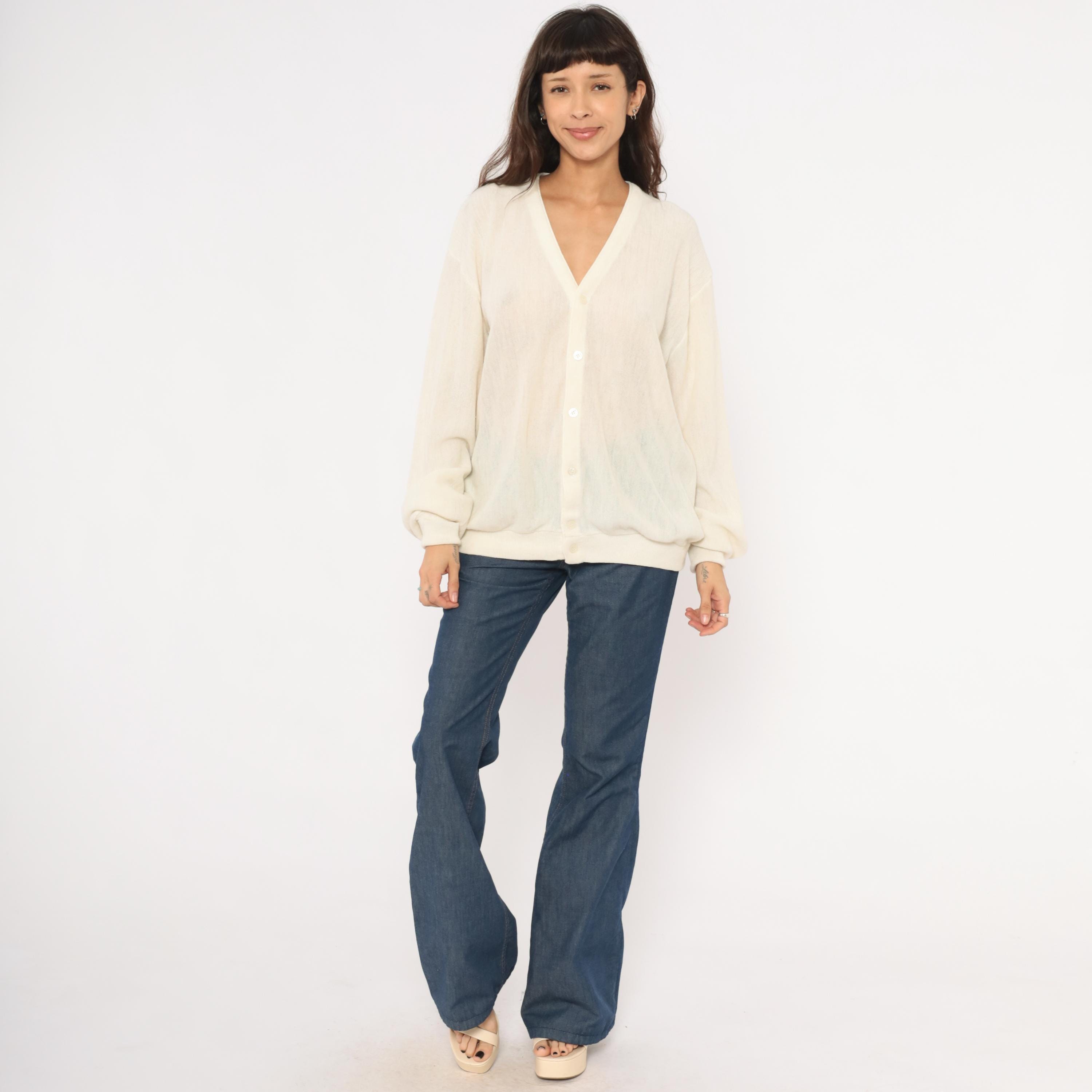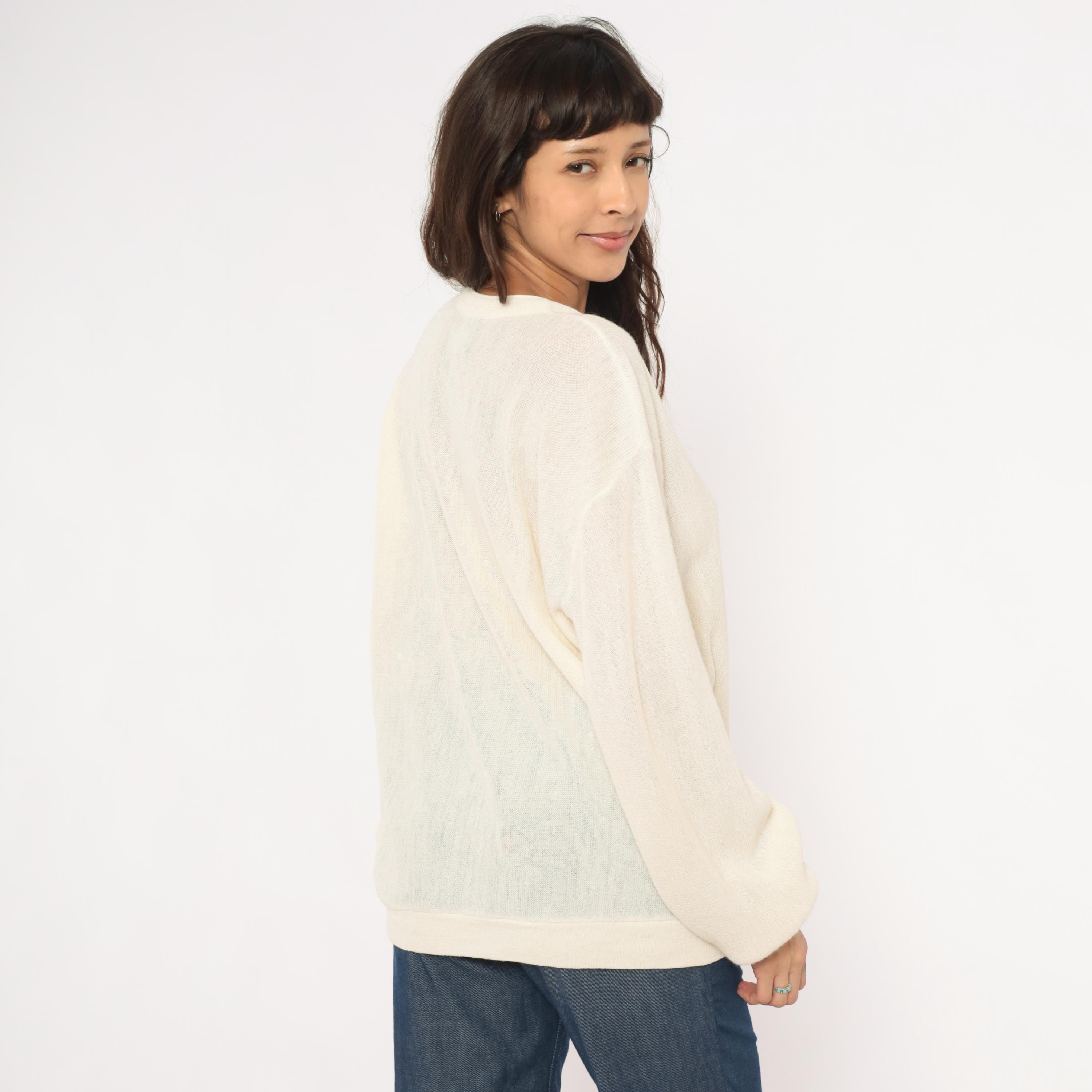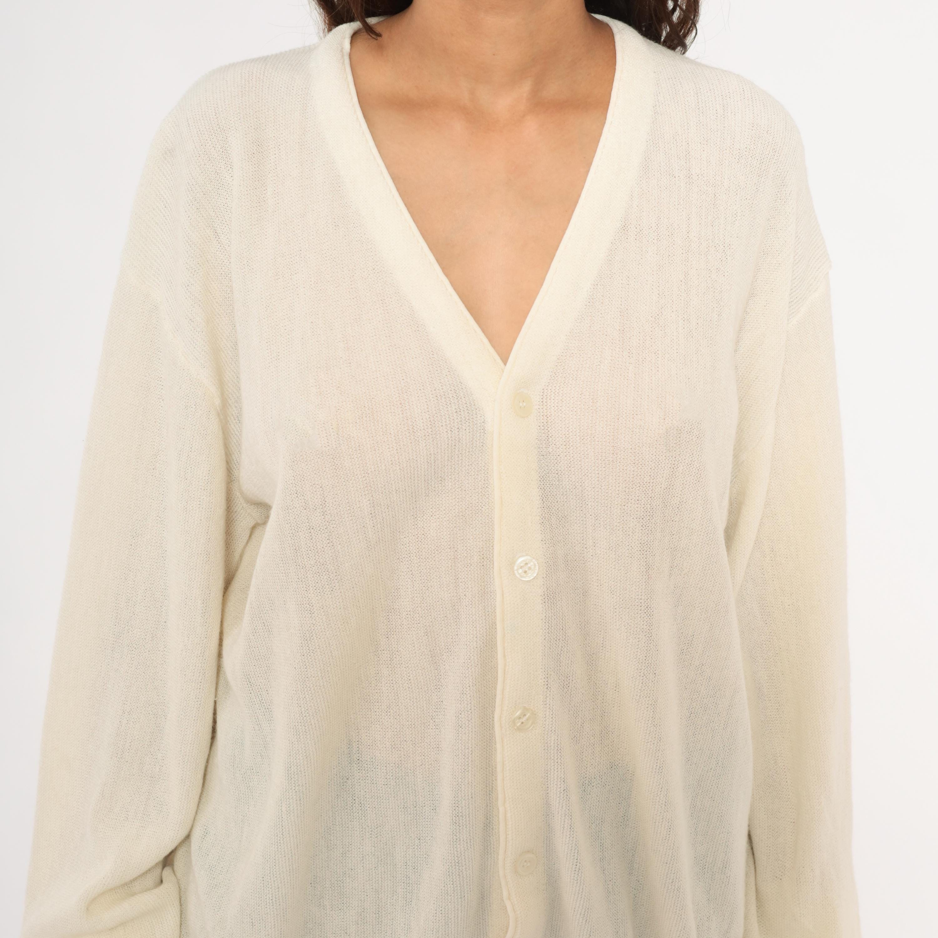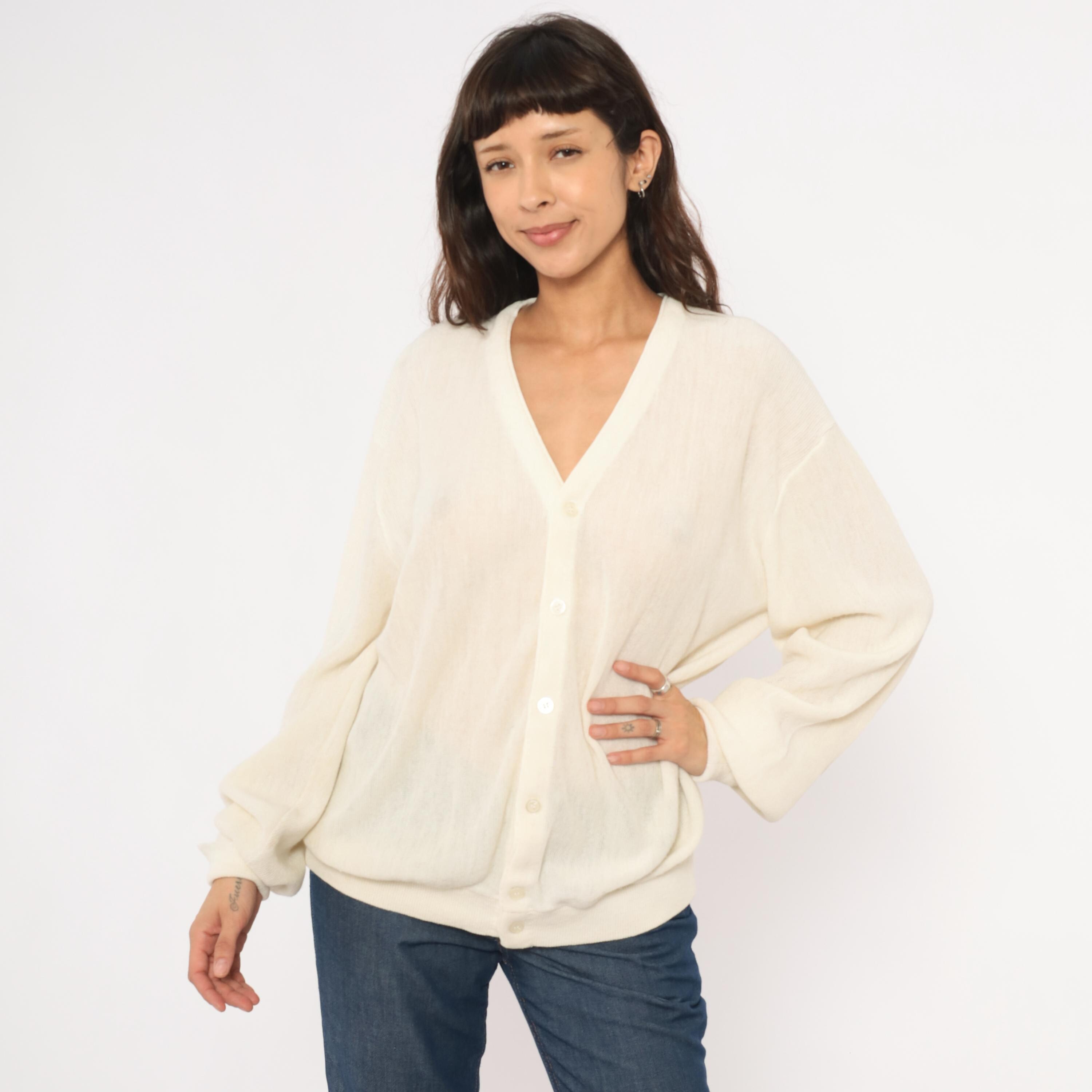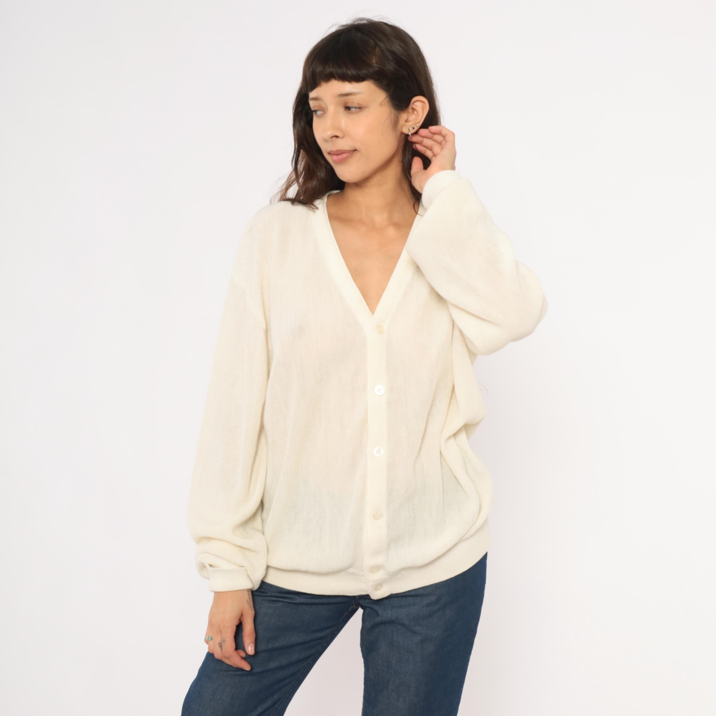 80s ivory knit cardigan from Jantzen with a deep V neckline and front button closure. Sheer, open-gauge knit throughout the body and long sleeves with ribbed cuffs, hem band, and neckline trim.