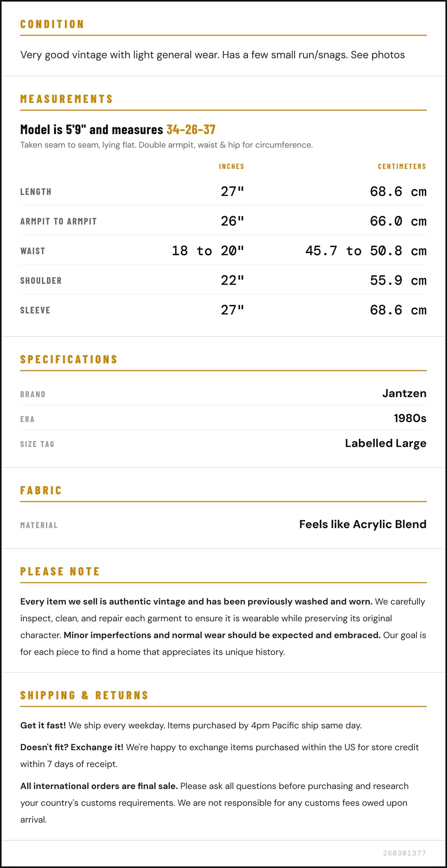 Condition: Very good vintage with light general wear. Has a few small run/snags. See photos