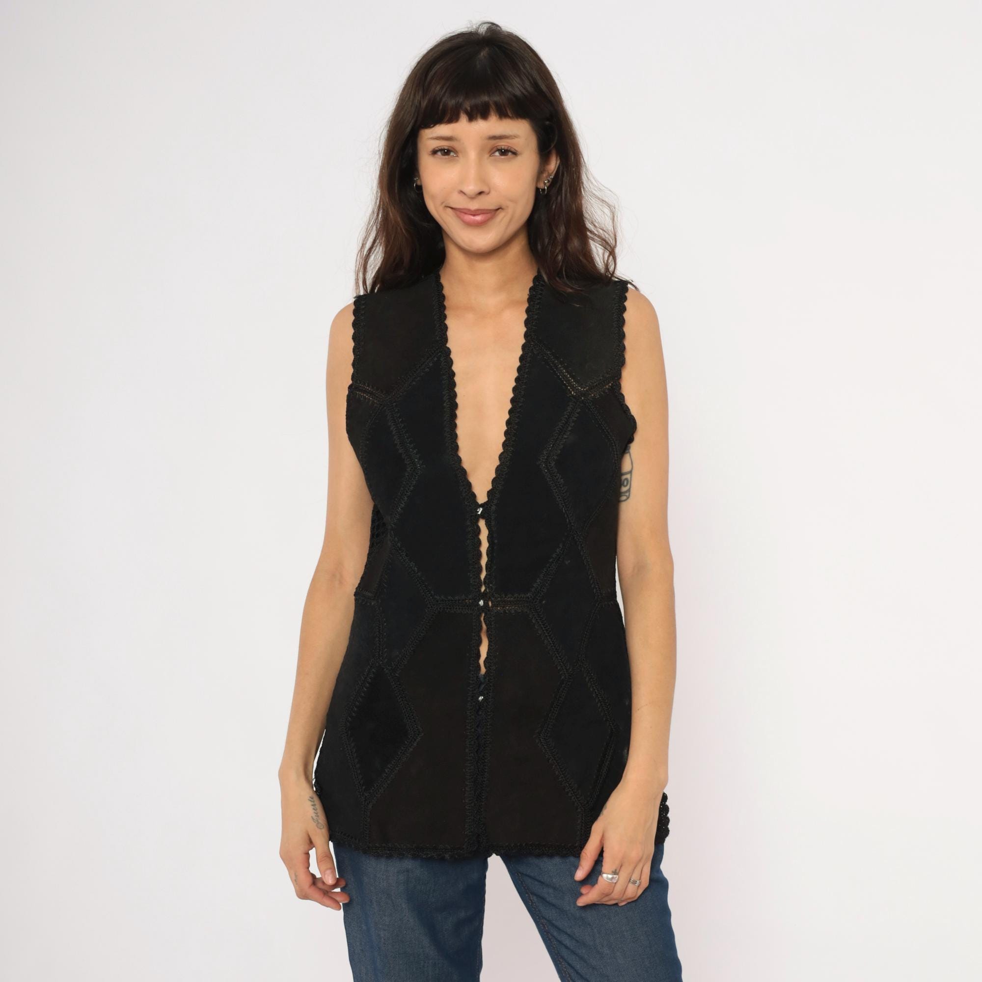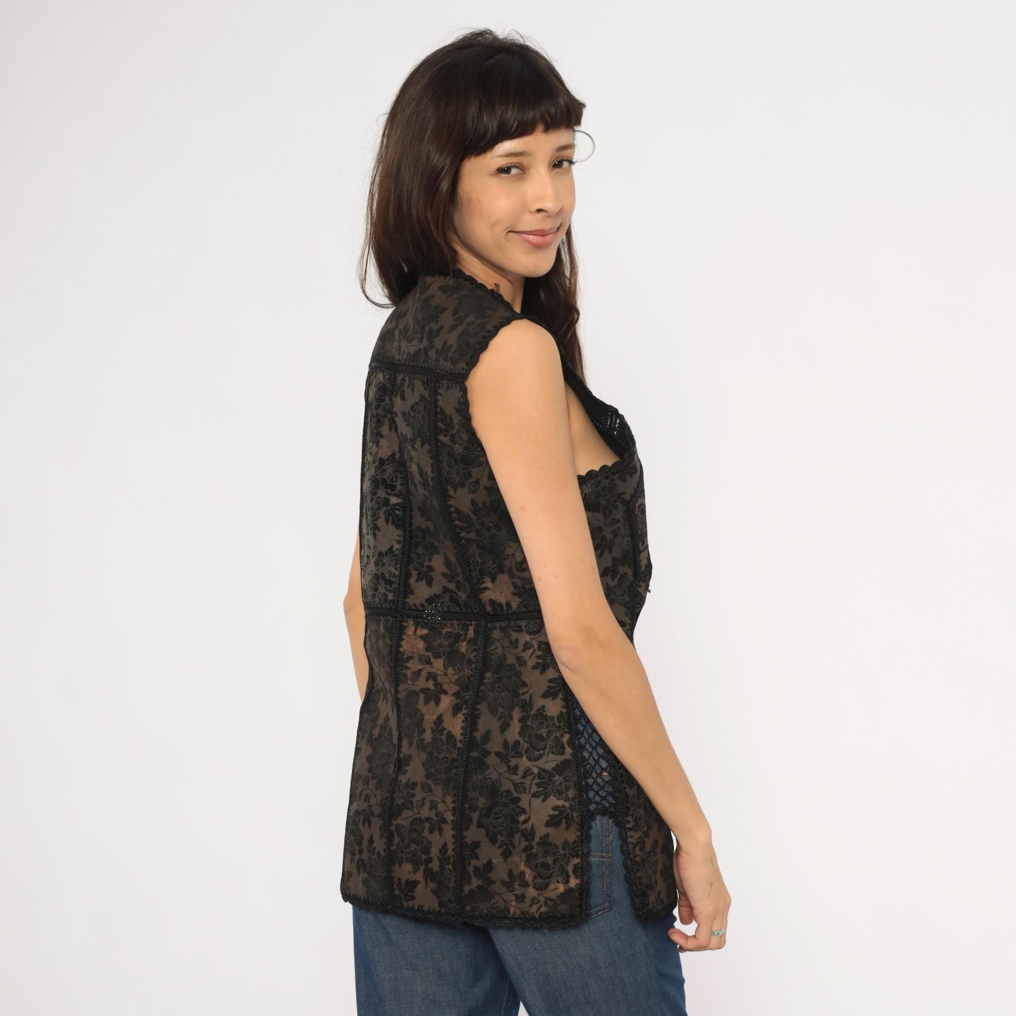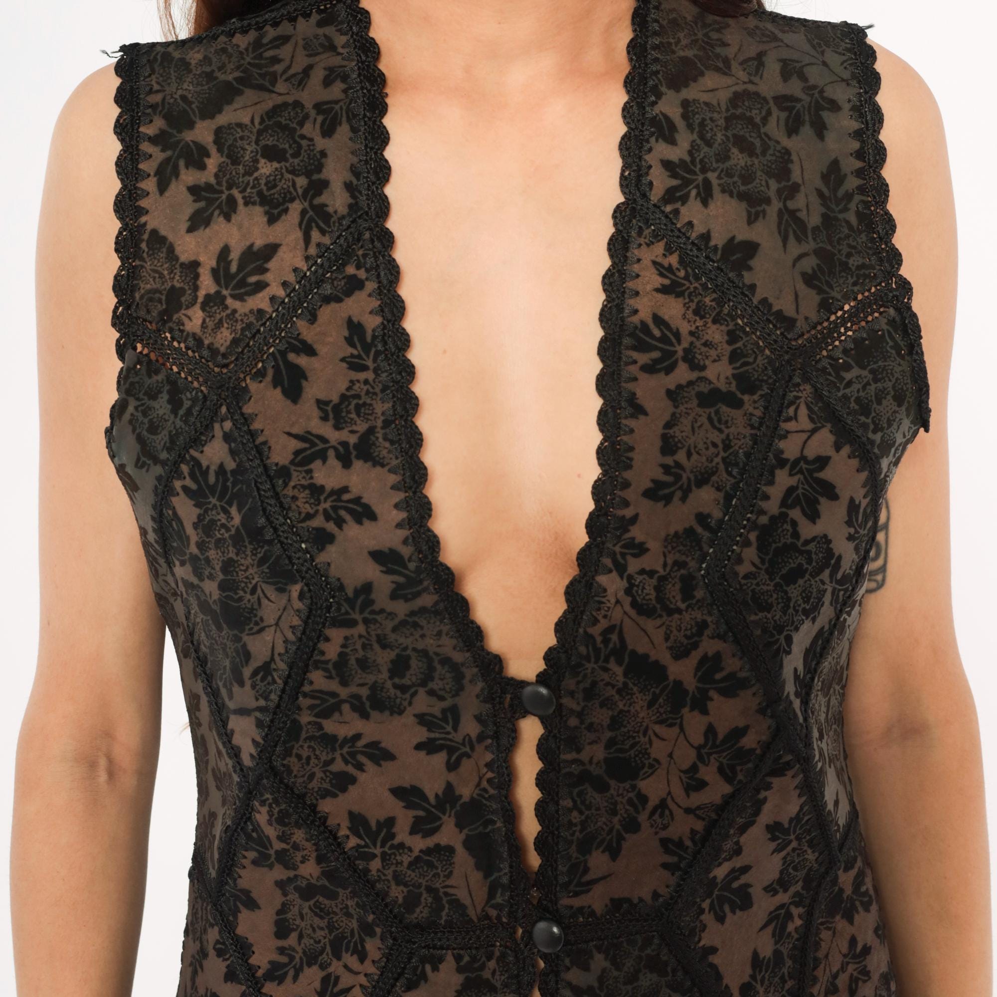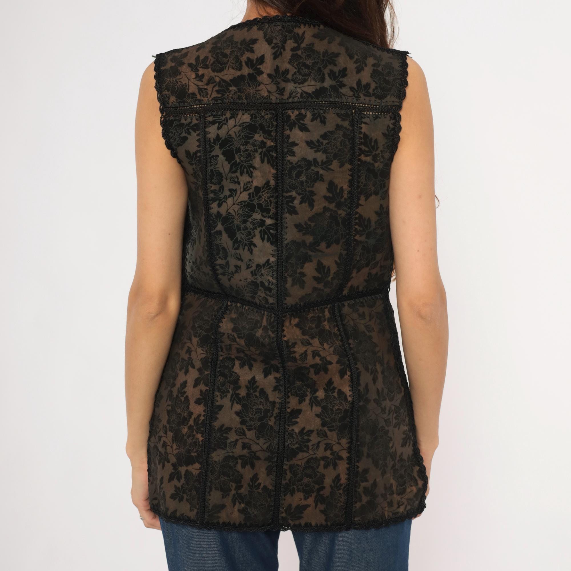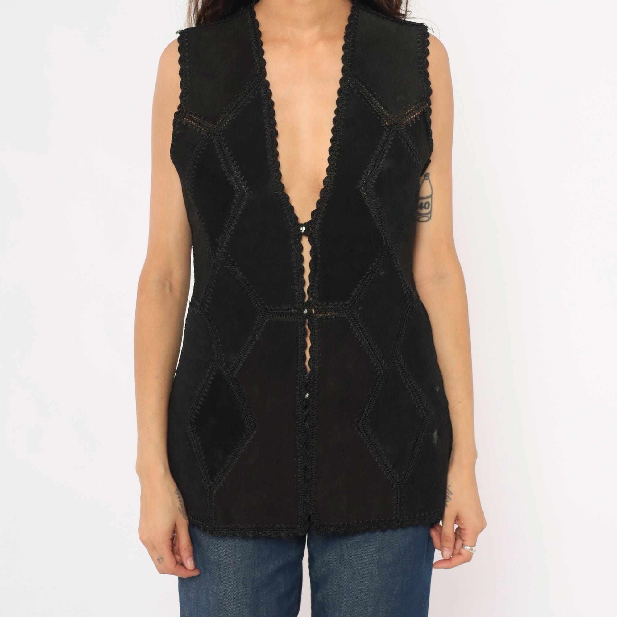 Reversible 90s vest with a black floral lace side and a solid black suede side, each offering a distinct look. Deep V neckline with scalloped crochet trim along the front opening, armholes, and hem. Button front closure with small round buttons, diamond-shaped panel seaming on the lace side, and vertical seam construction on the suede side.