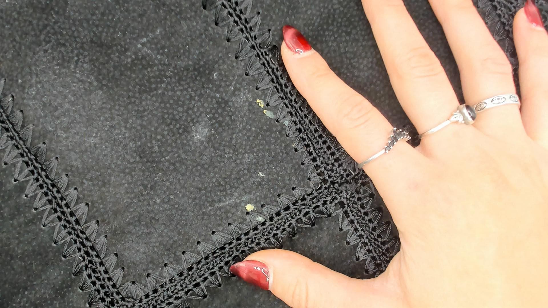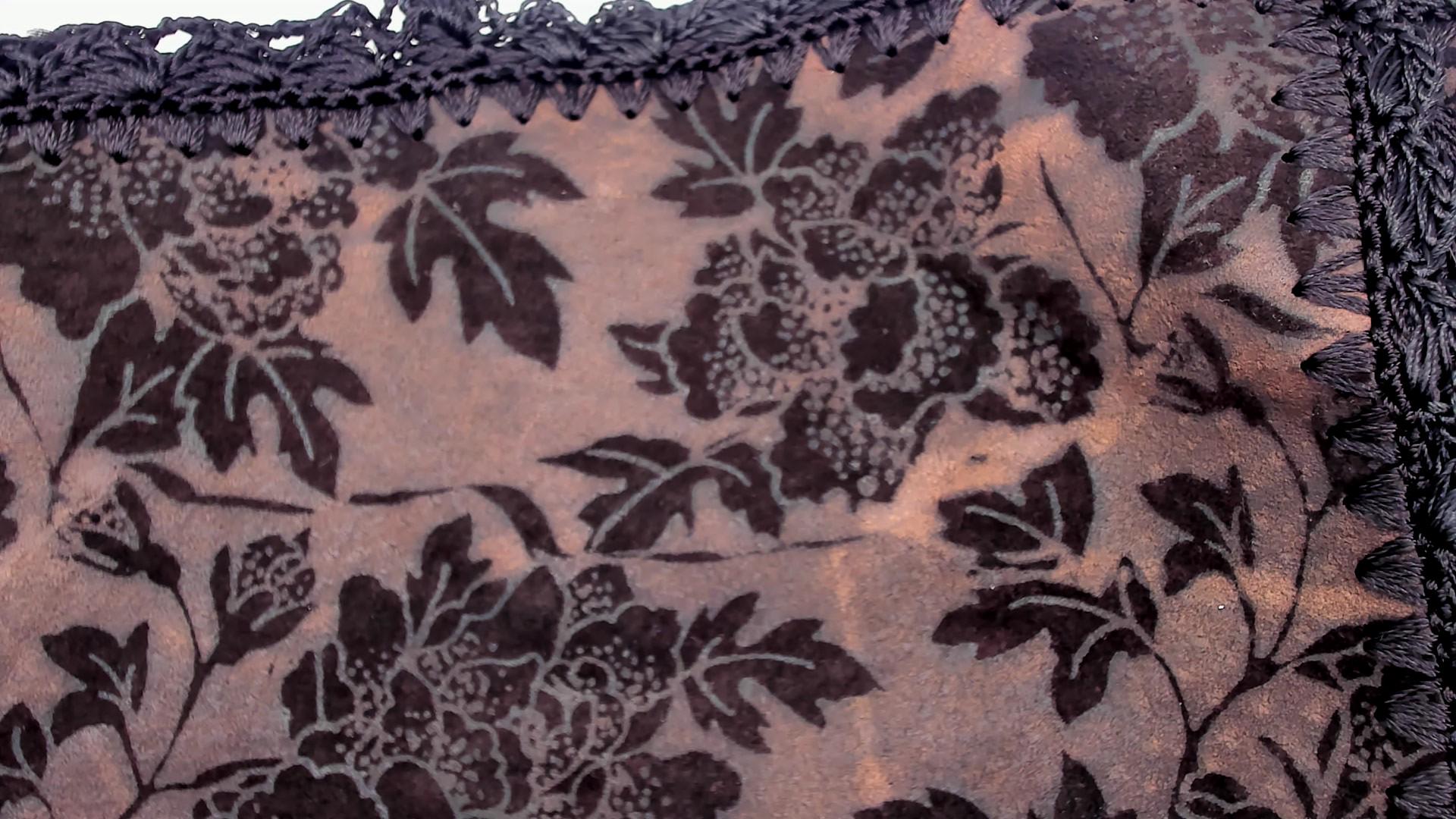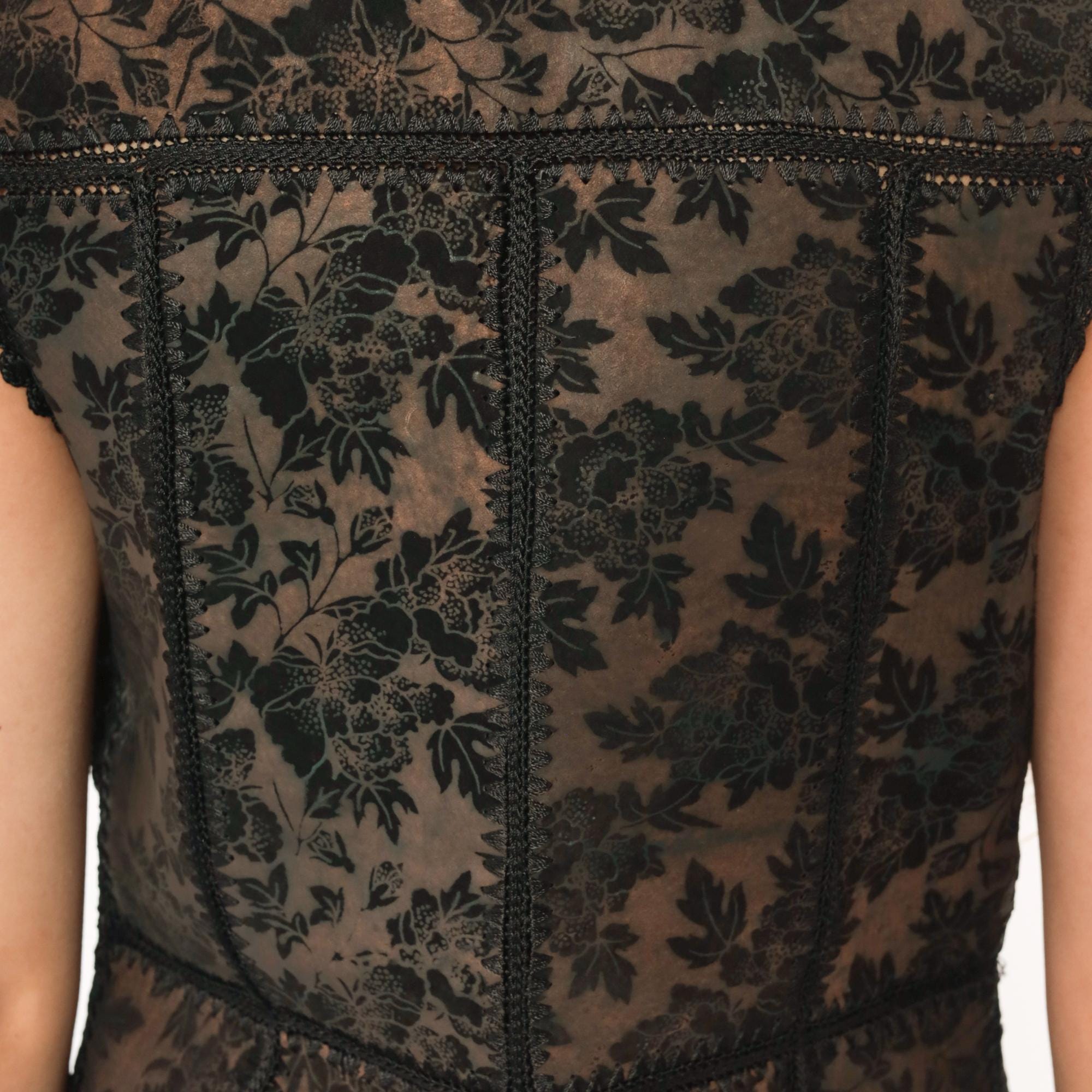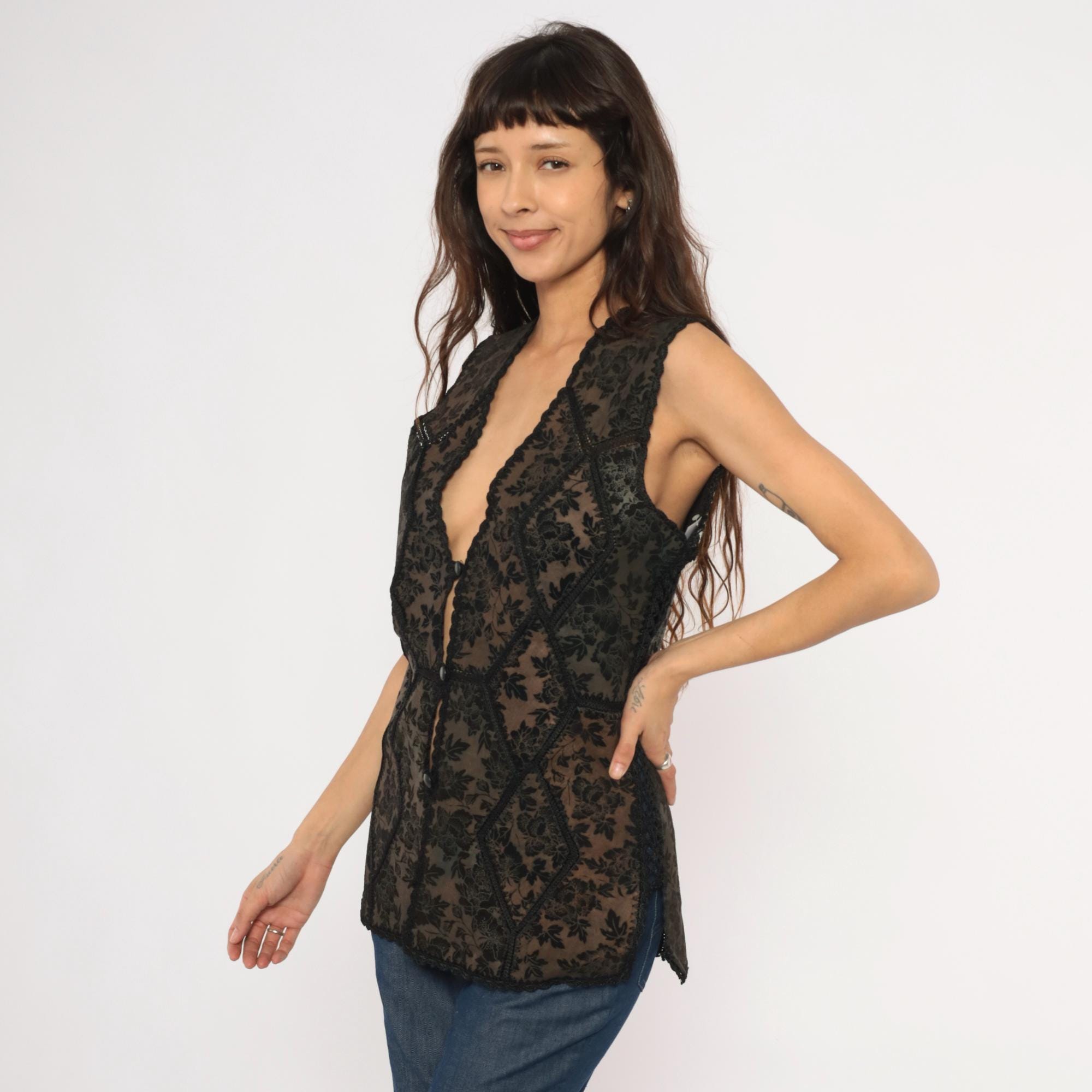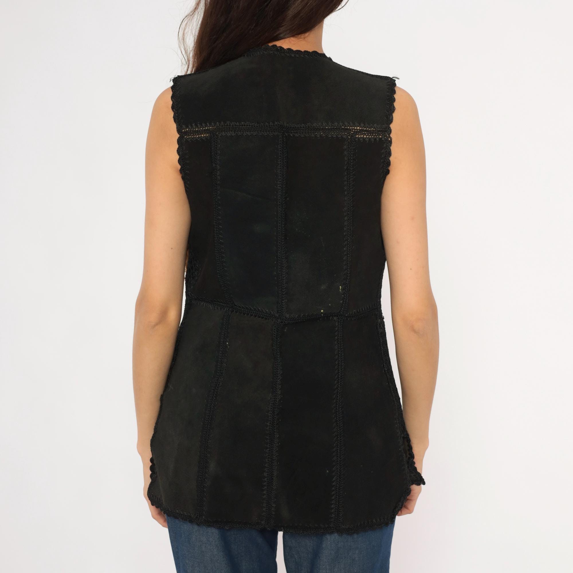 Reversible 90s vest with a black floral lace side and a solid black suede side, each offering a distinct look. Deep V neckline with scalloped crochet trim along the front opening, armholes, and hem. Button front closure with small round buttons, diamond-shaped panel seaming on the lace side, and vertical seam construction on the suede side.