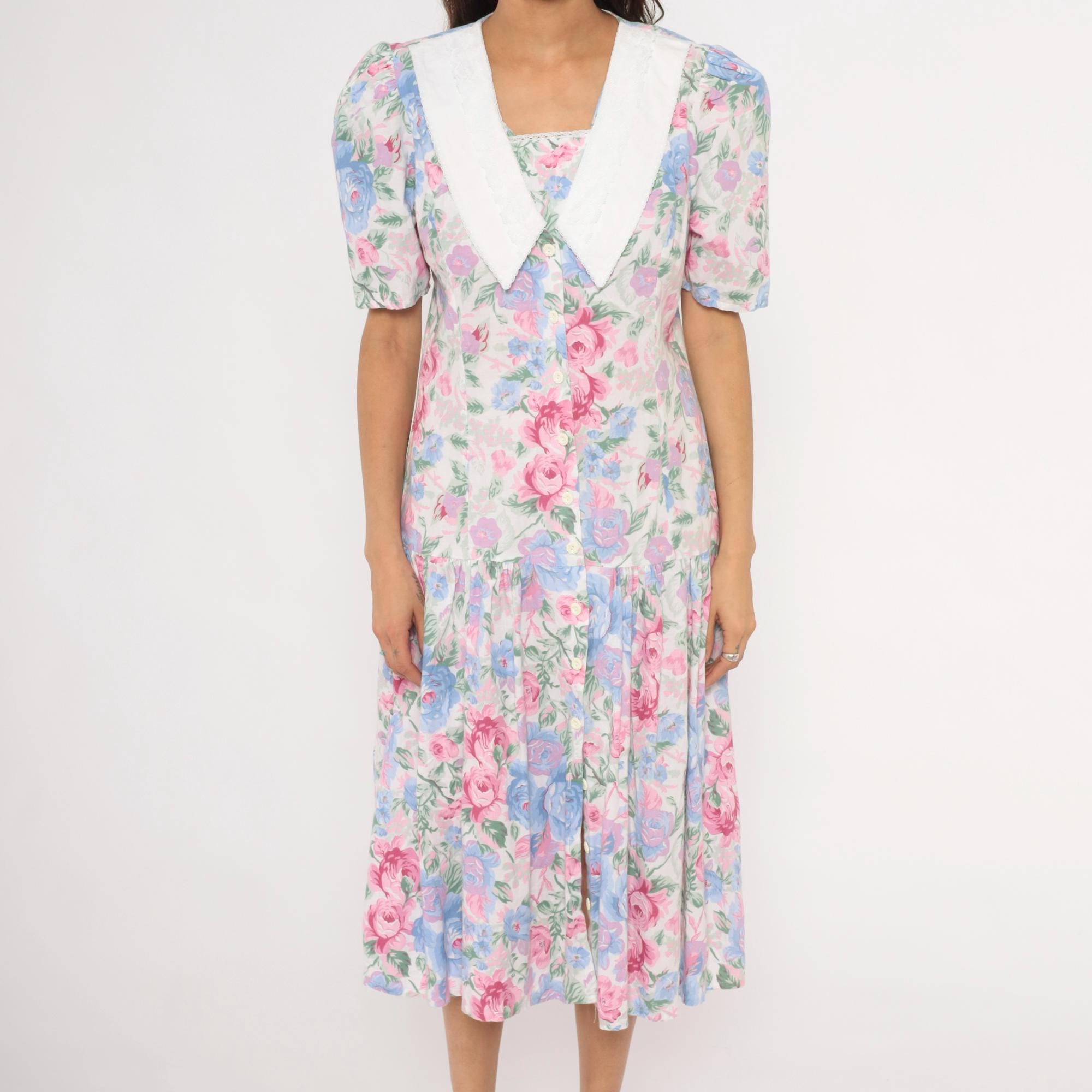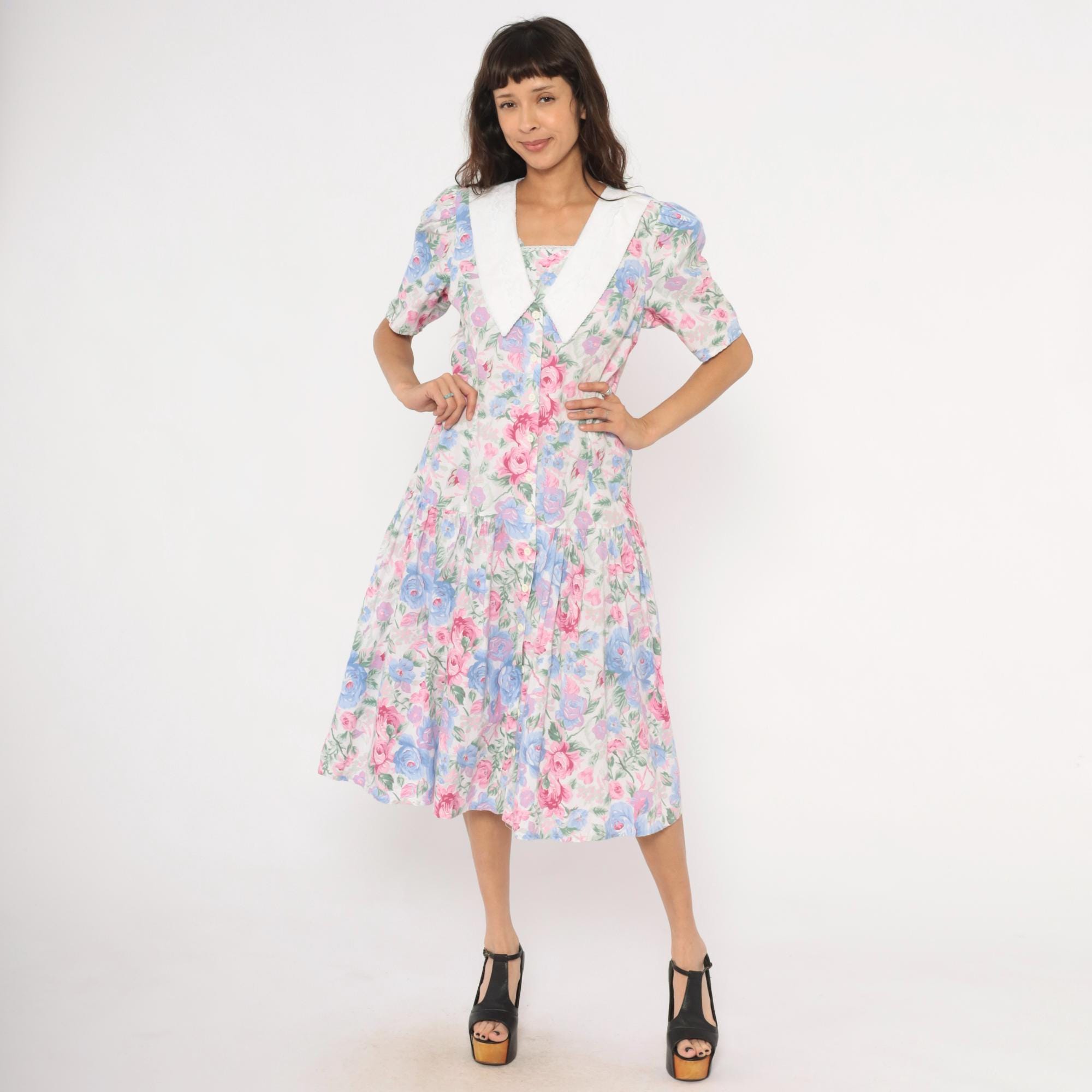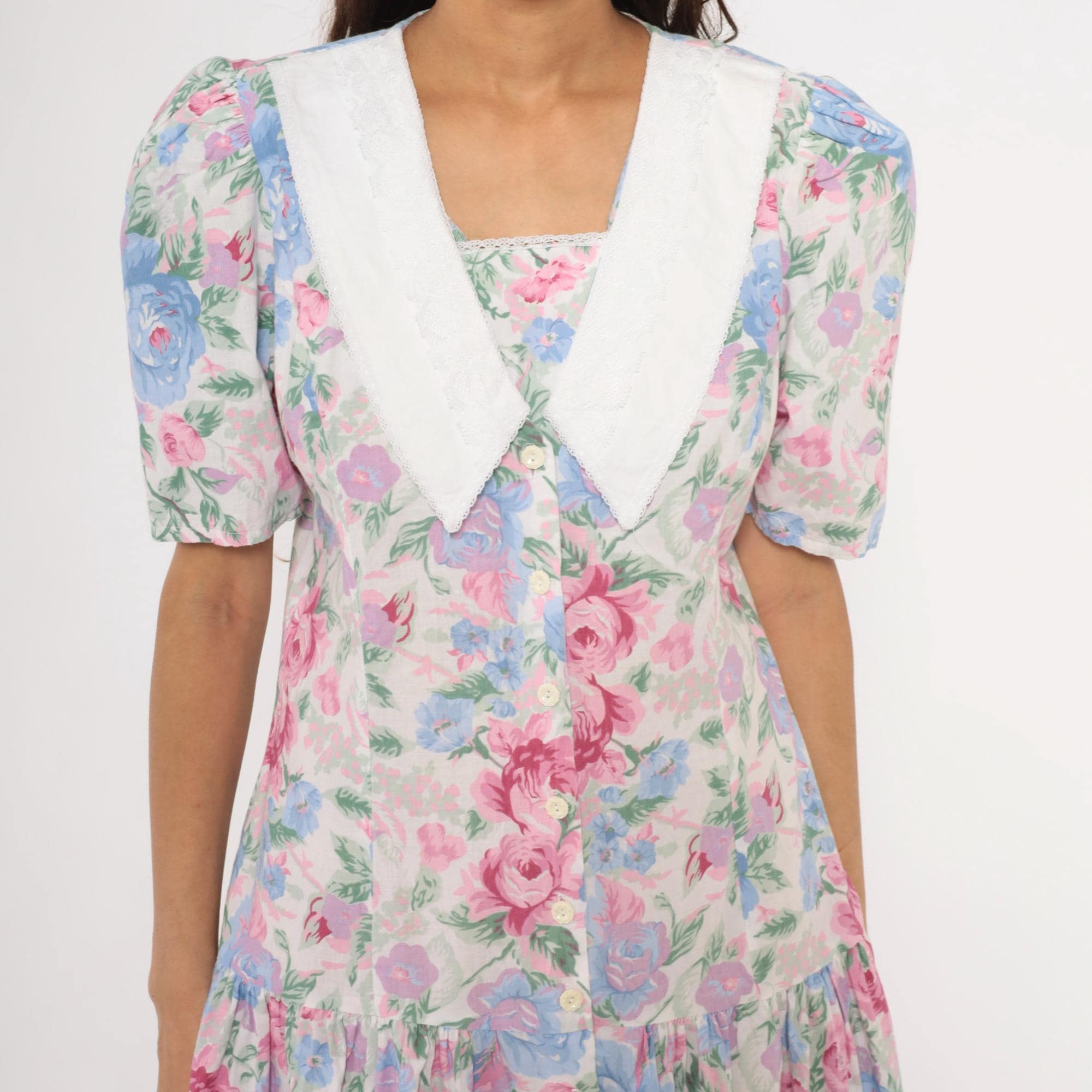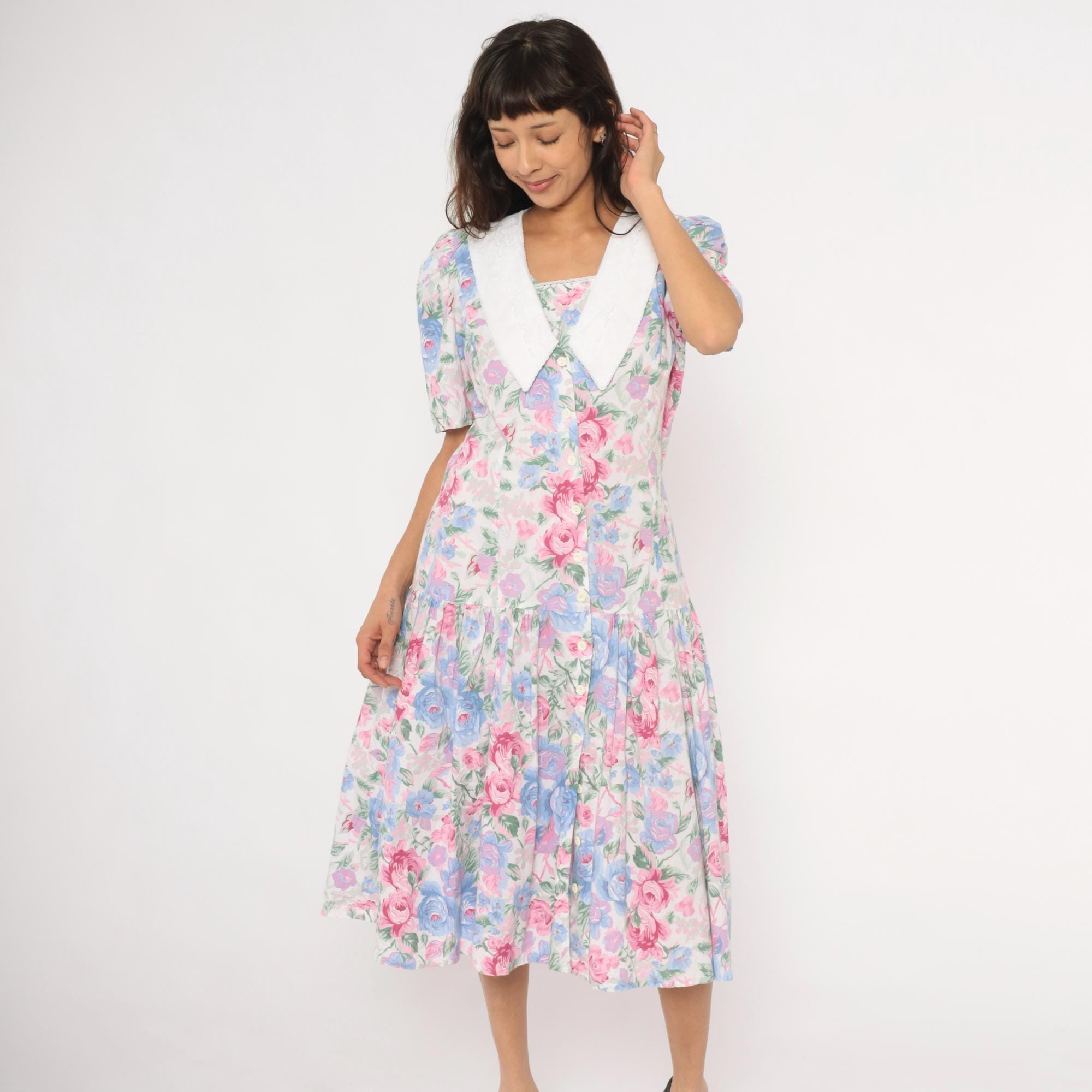 80s floral midi dress from Robin Gayle in pink, blue, and periwinkle roses with green foliage on a white ground. Large pointed white lace collar with a deep V shape, puff sleeves, and button front closure down the center.