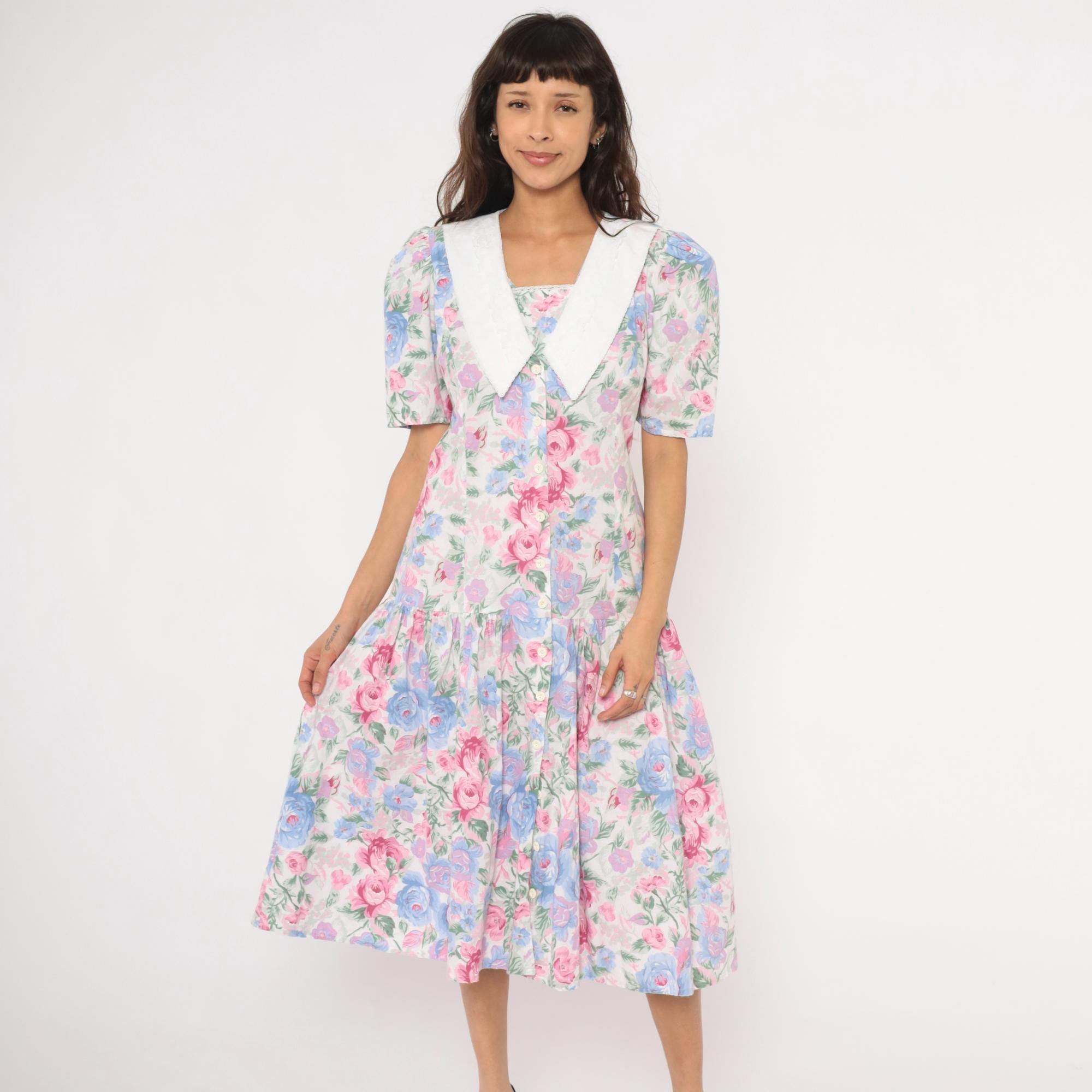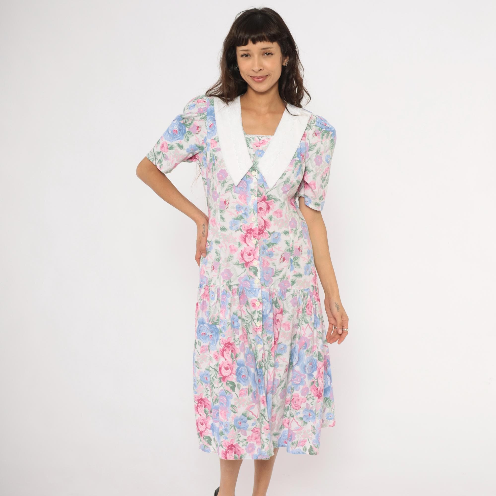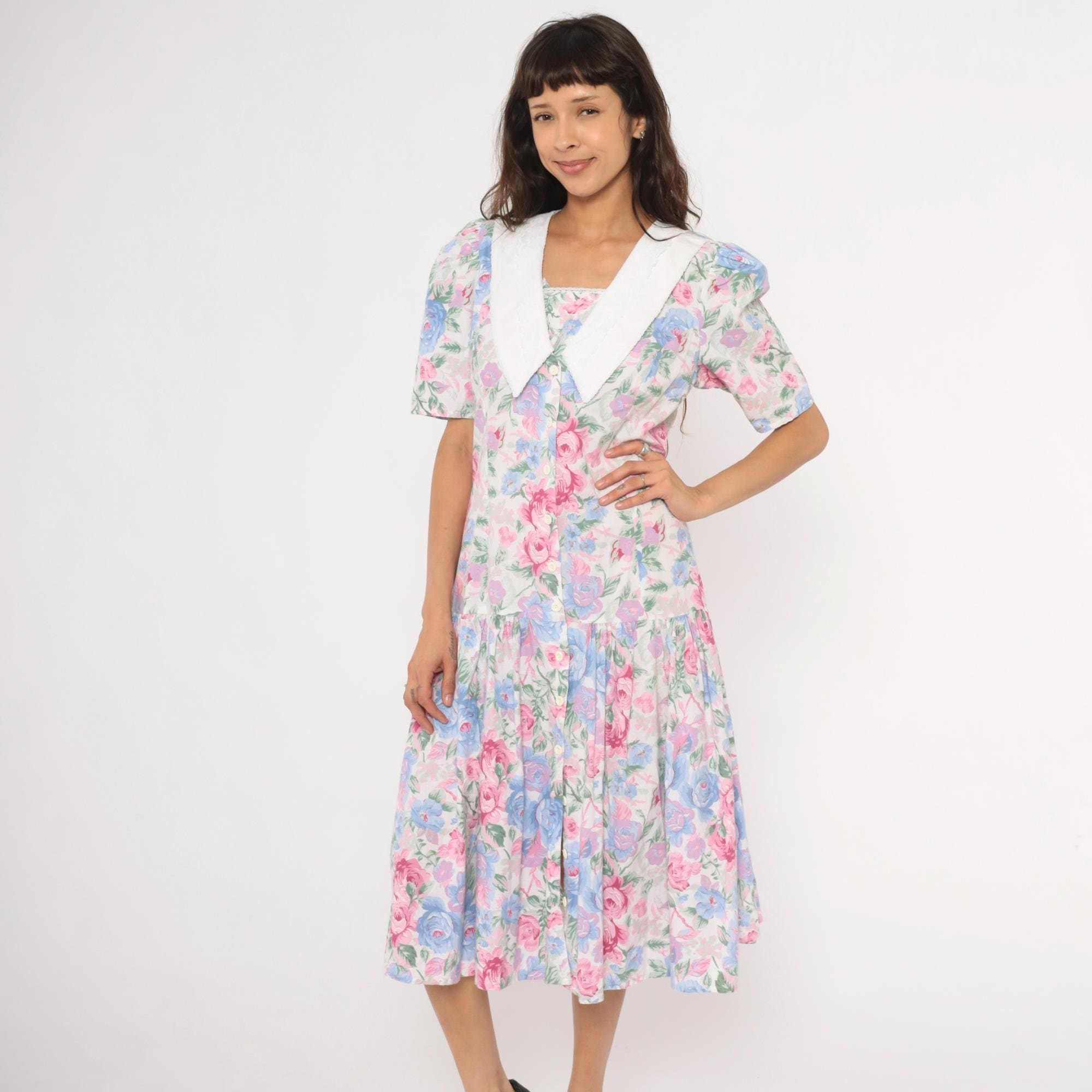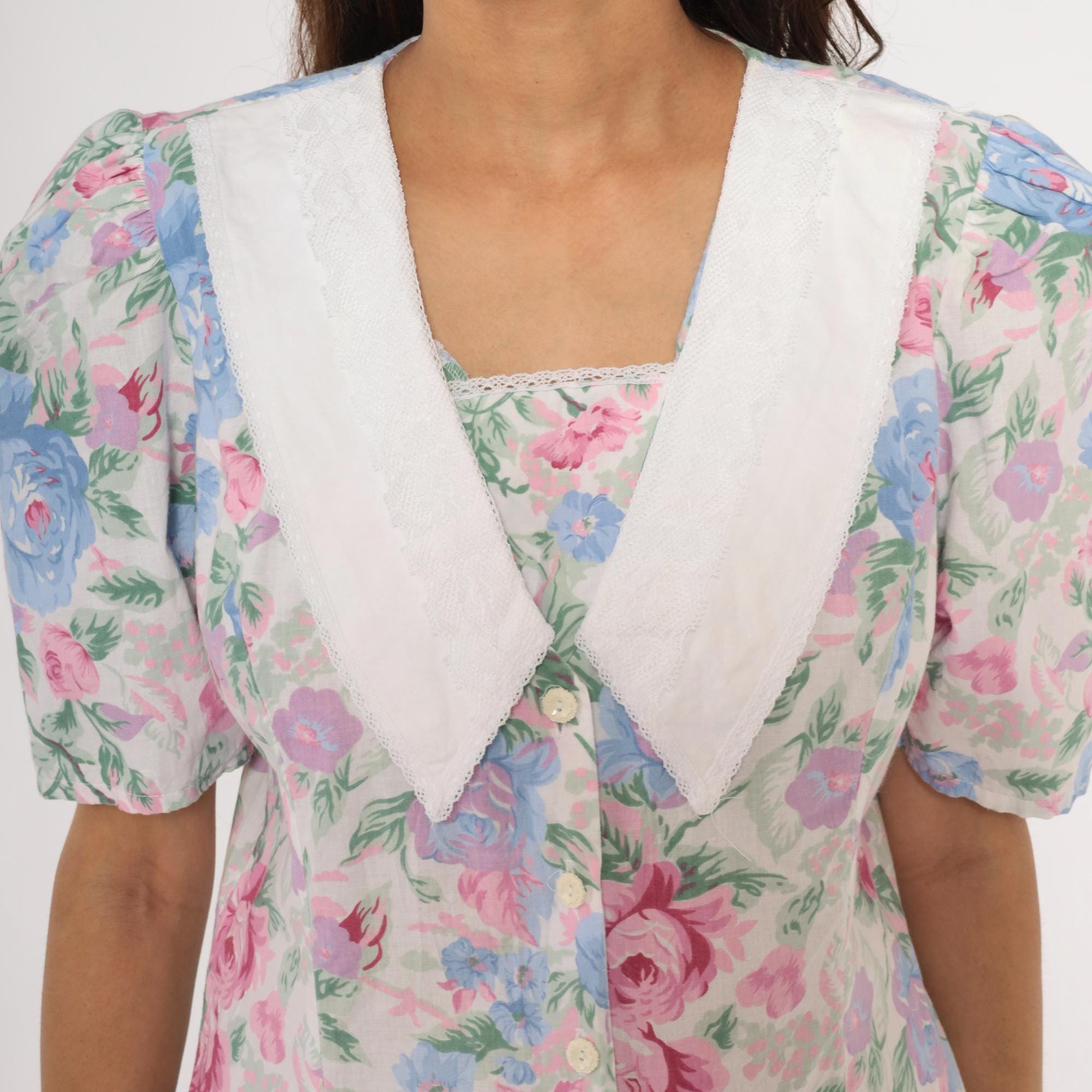 80s floral midi dress from Robin Gayle in pink, blue, and periwinkle roses with green foliage on a white ground. Large pointed white lace collar with a deep V shape, puff sleeves, and button front closure down the center.