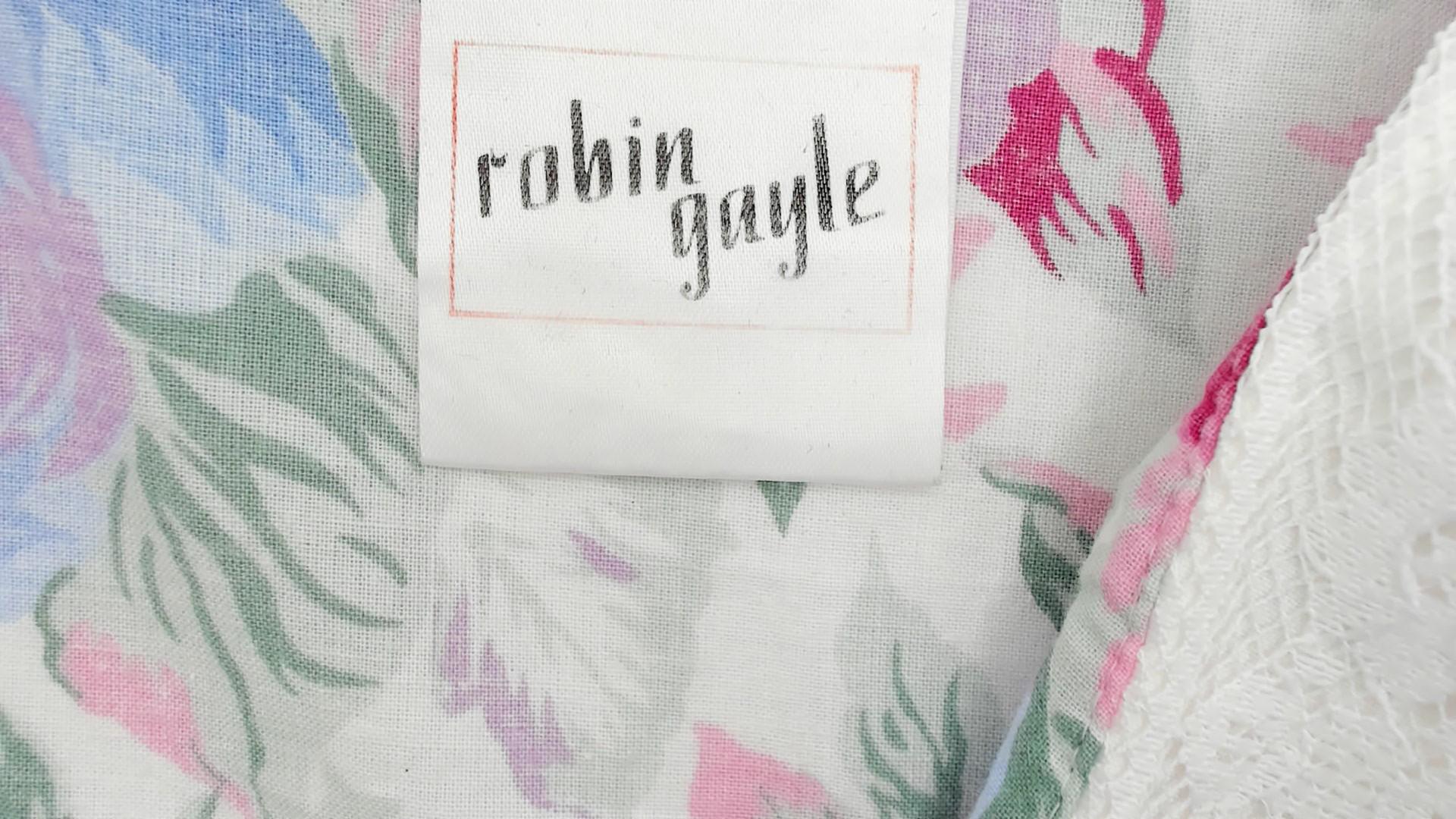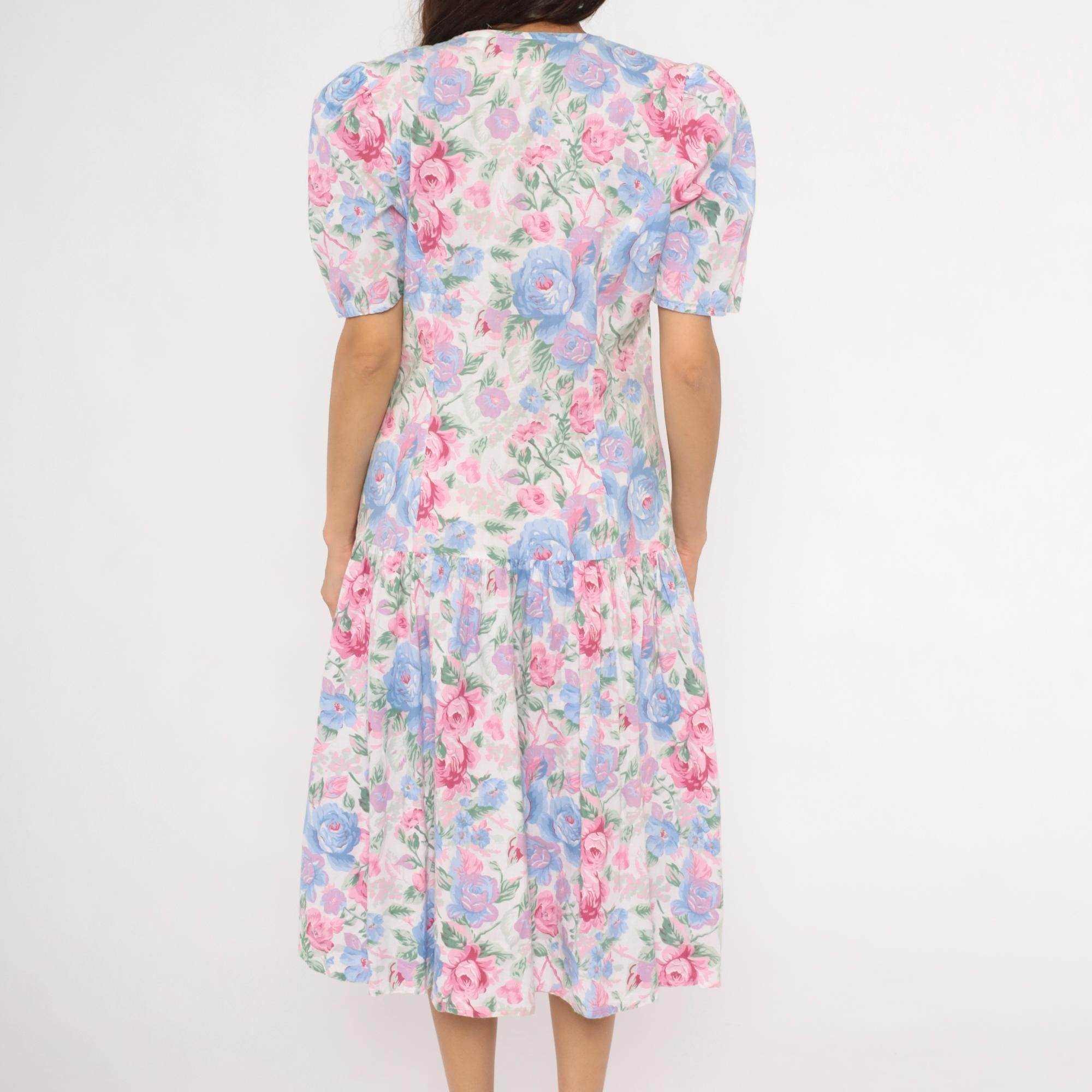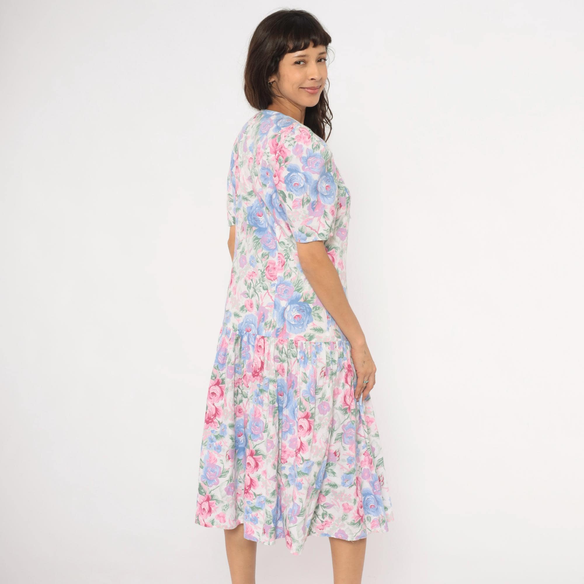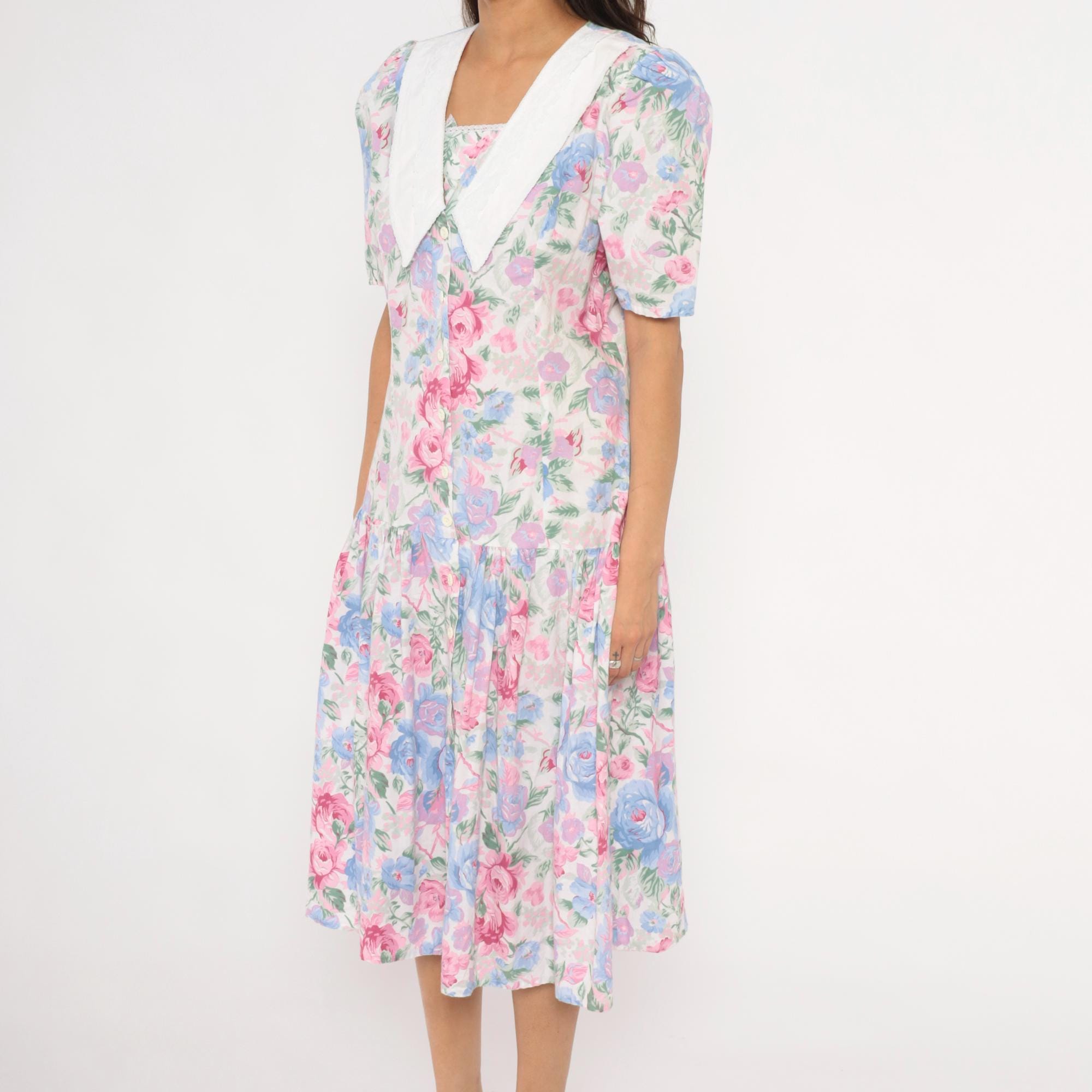 80s floral midi dress from Robin Gayle in pink, blue, and periwinkle roses with green foliage on a white ground. Large pointed white lace collar with a deep V shape, puff sleeves, and button front closure down the center.