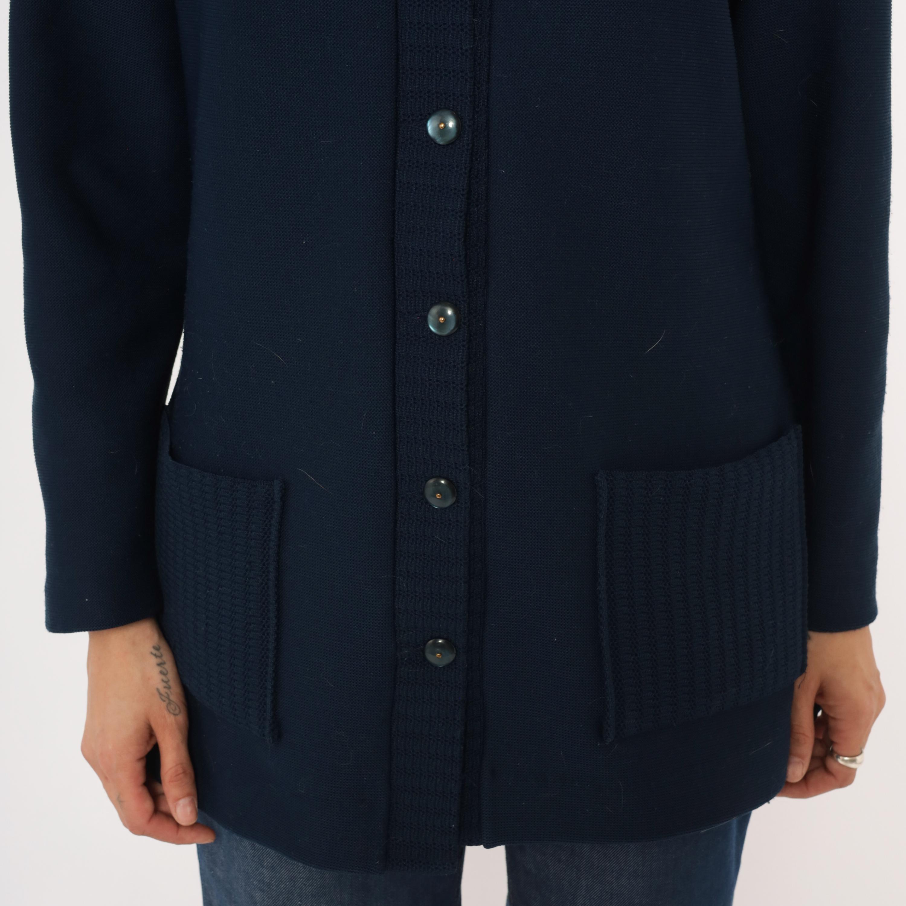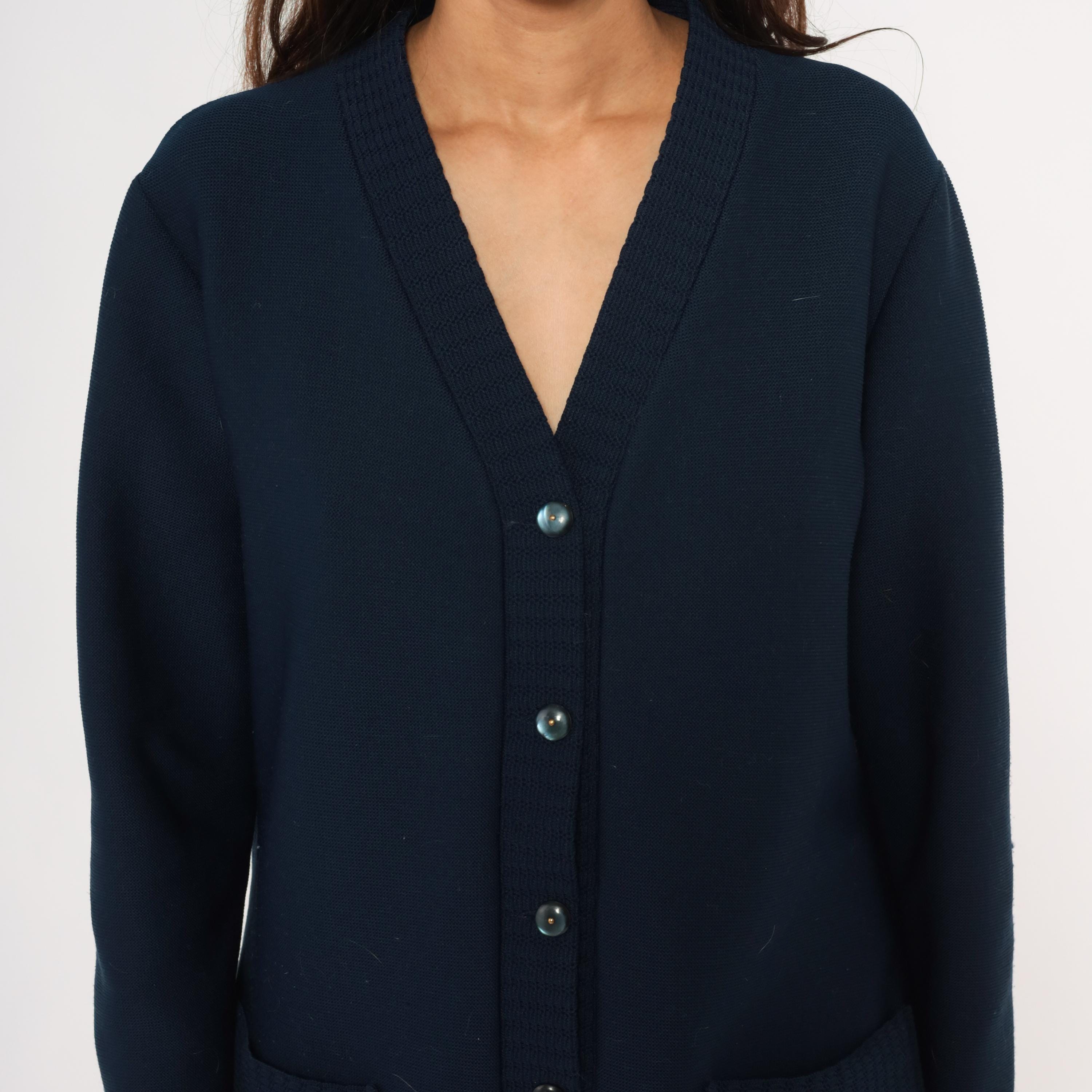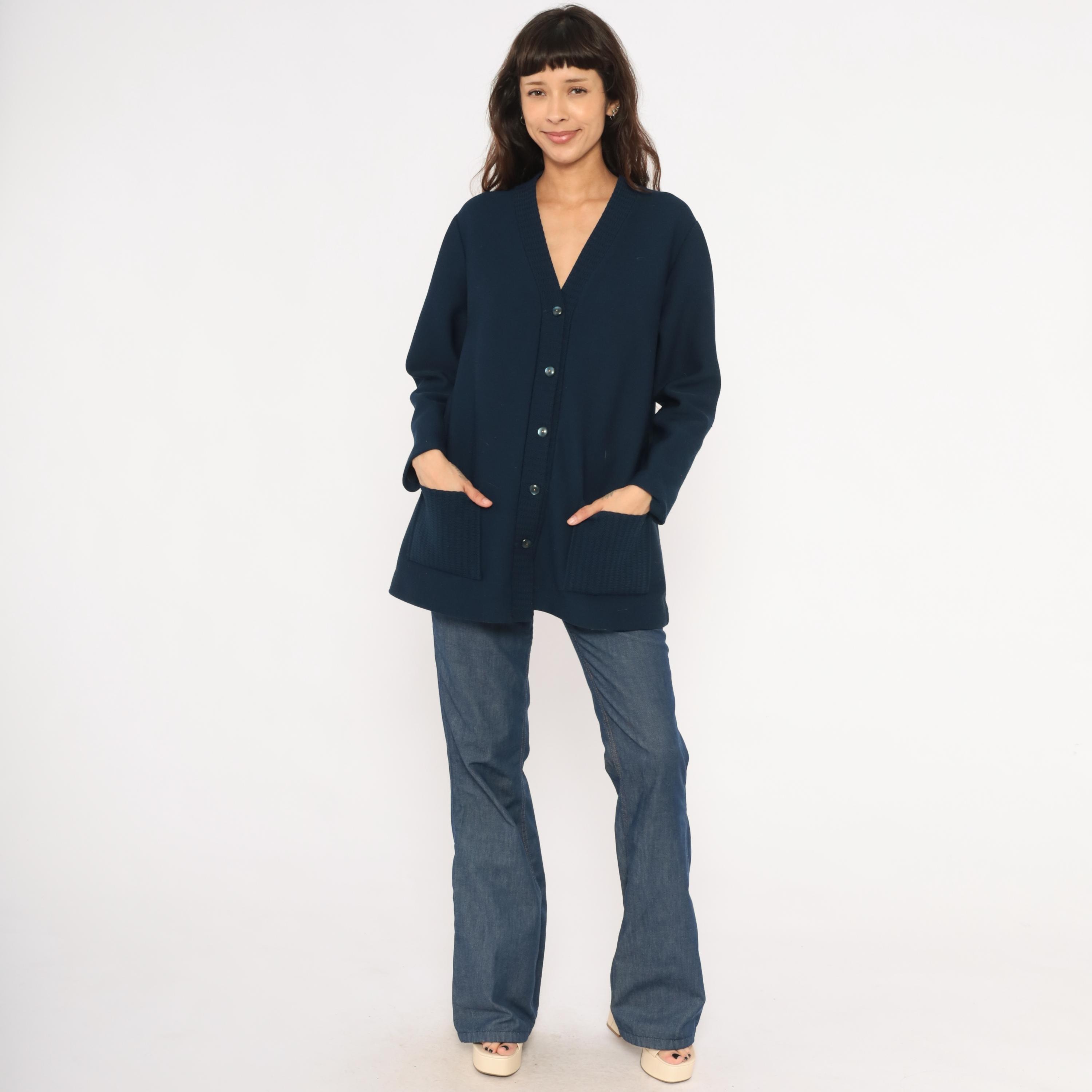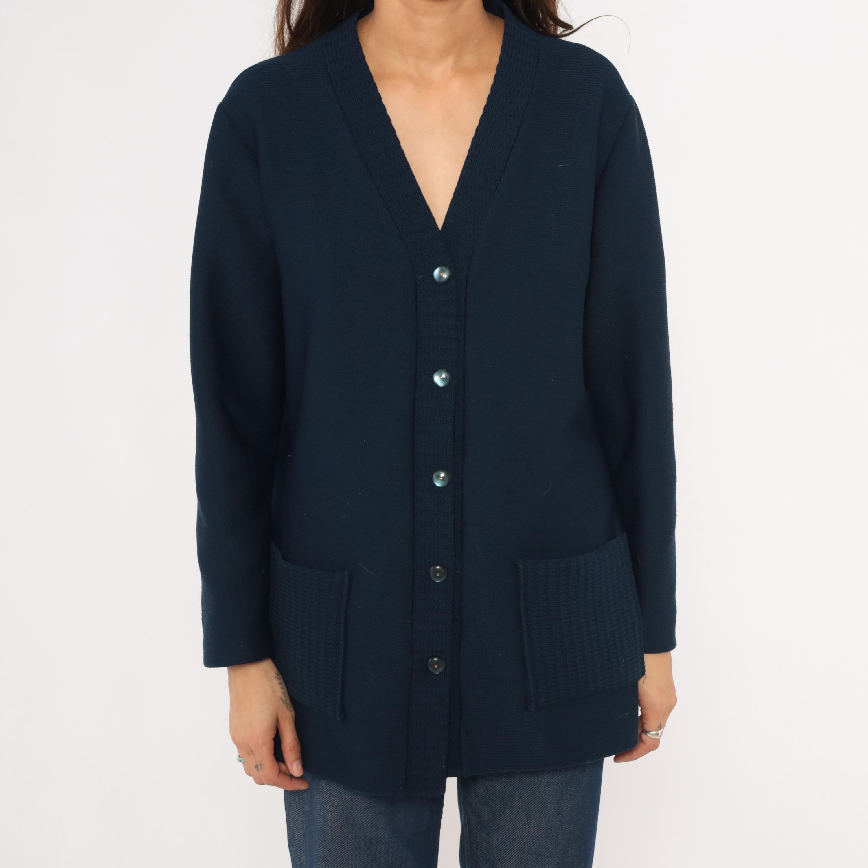 70s navy blue button front cardigan with a deep V neckline and ribbed collar trim. Five tonal buttons down the center placket, with two large patch pockets at the lower front in a textured ribbed knit. Long sleeves with straight cuffs, and a longer tunic-length body that falls below the hip.