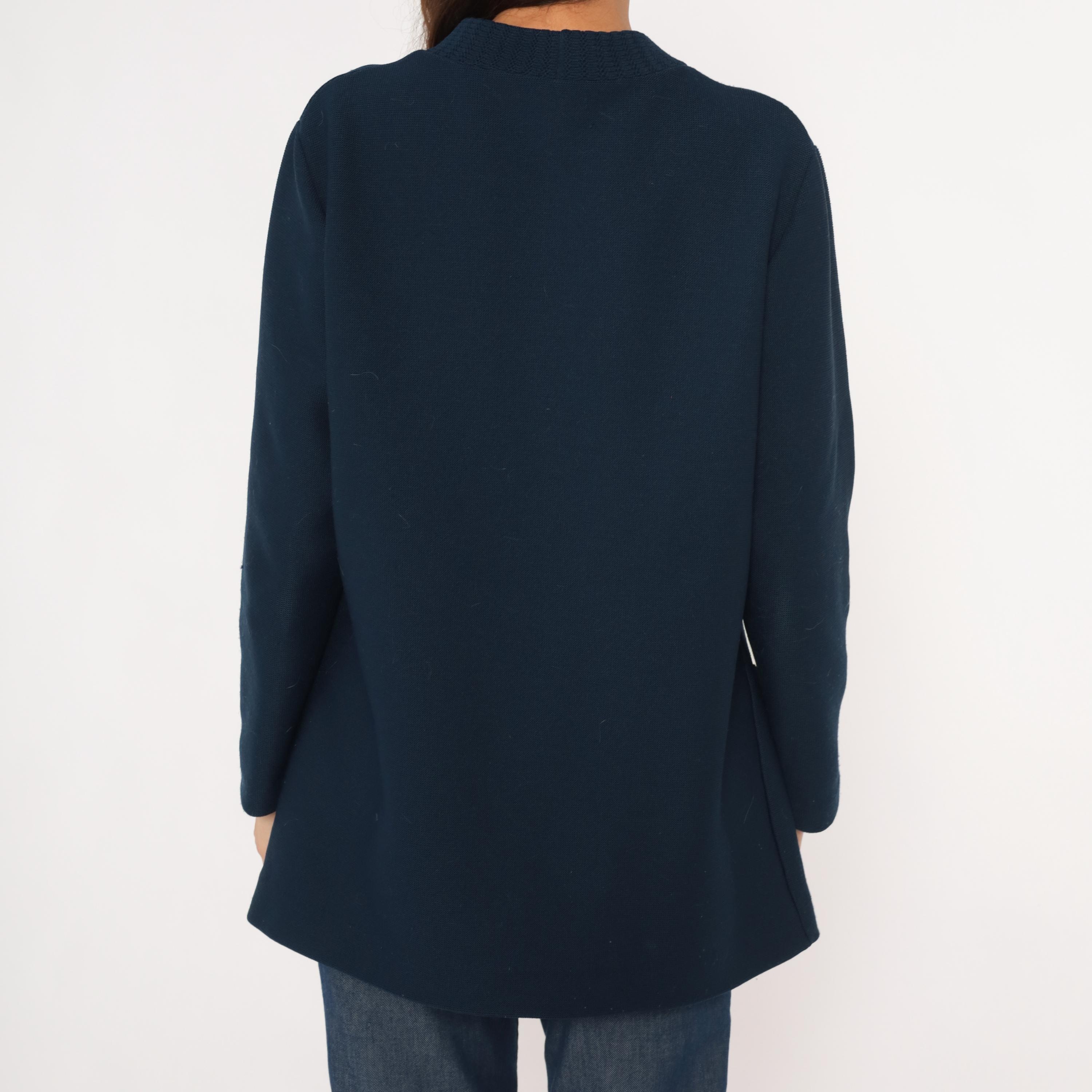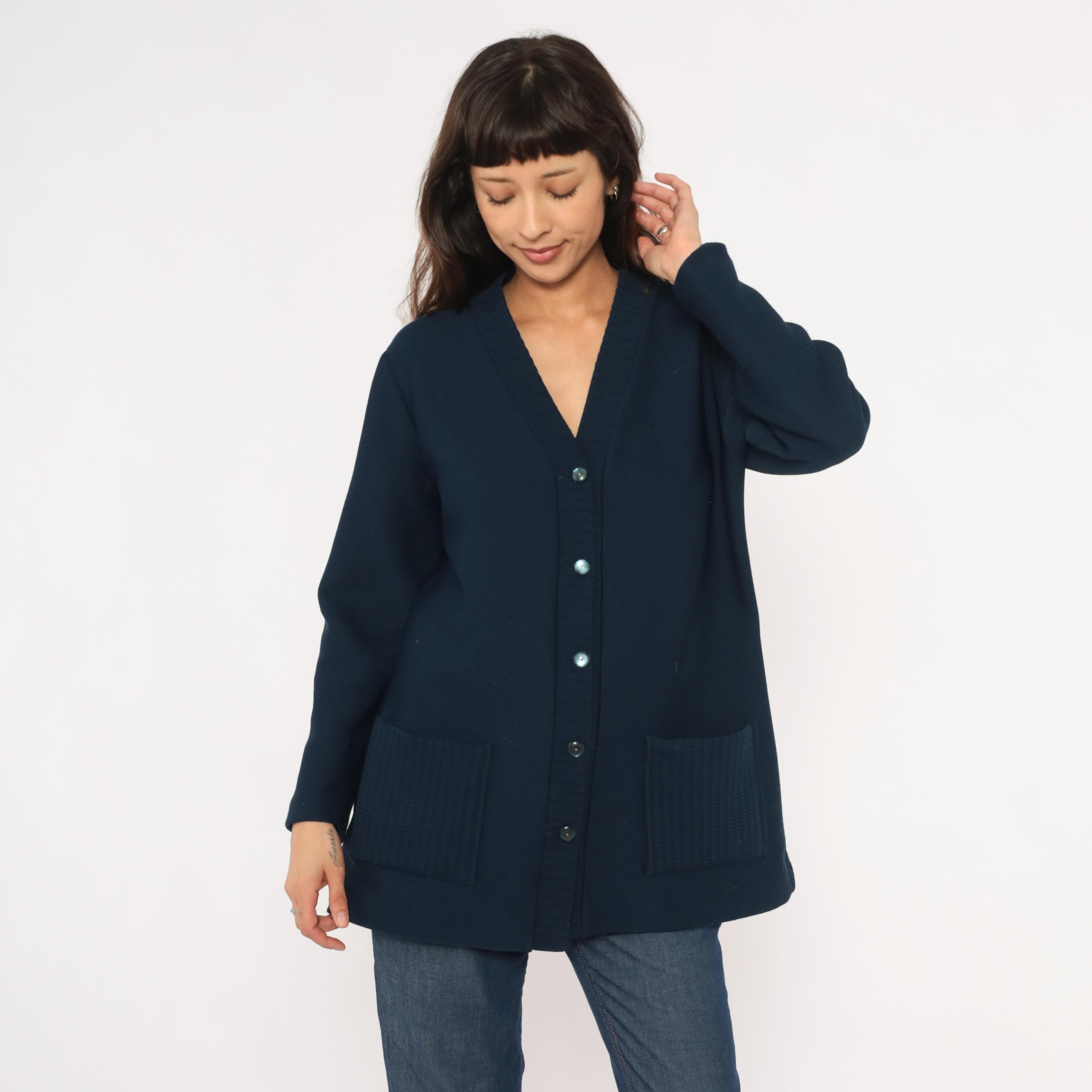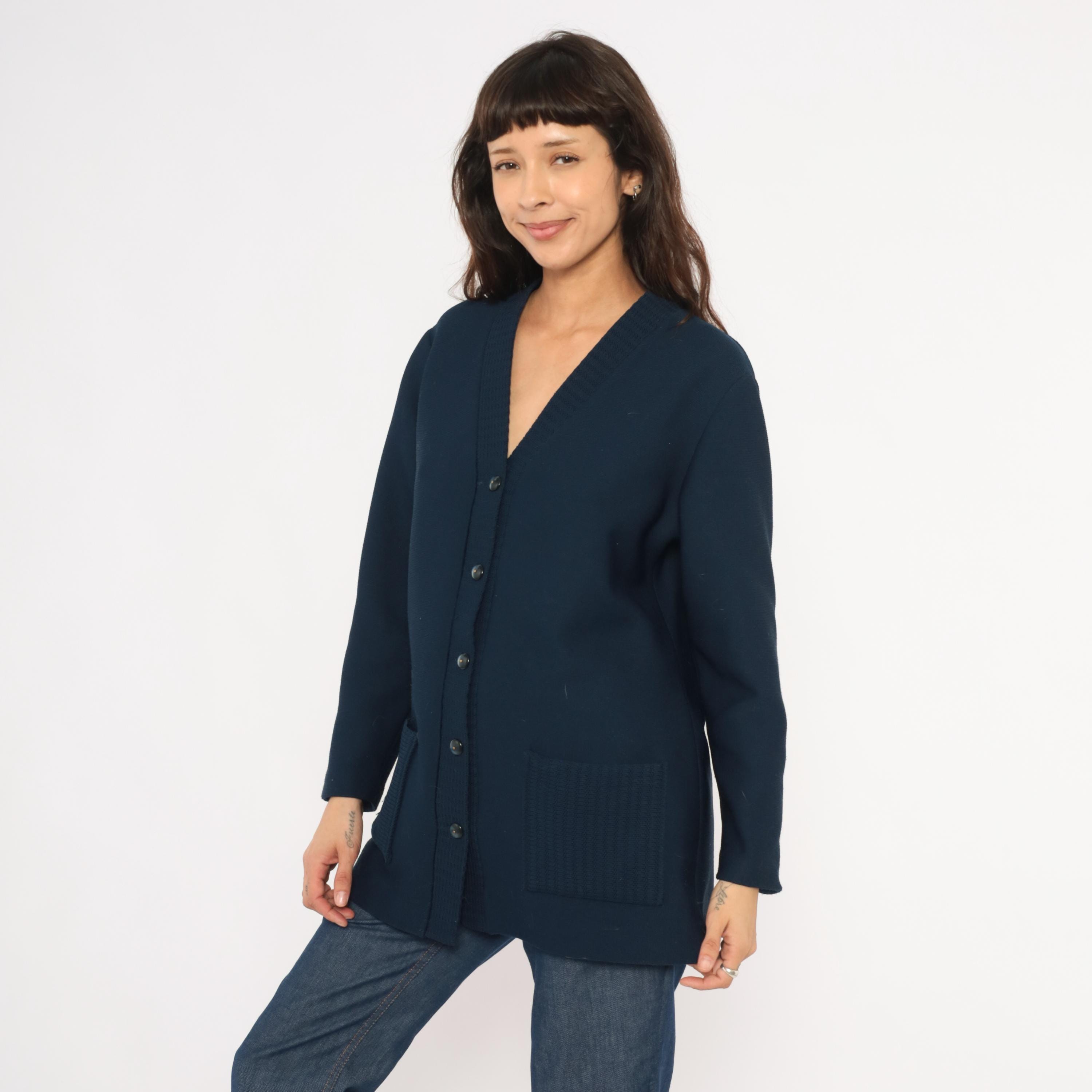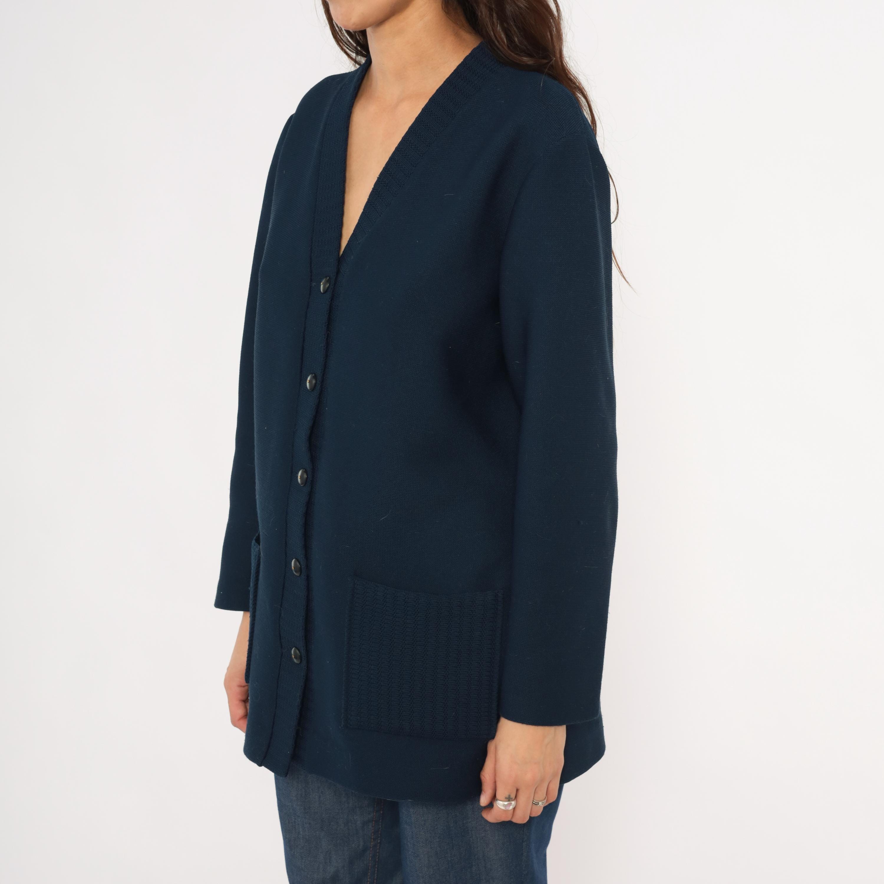 70s navy blue button front cardigan with a deep V neckline and ribbed collar trim. Five tonal buttons down the center placket, with two large patch pockets at the lower front in a textured ribbed knit. Long sleeves with straight cuffs, and a longer tunic-length body that falls below the hip.
