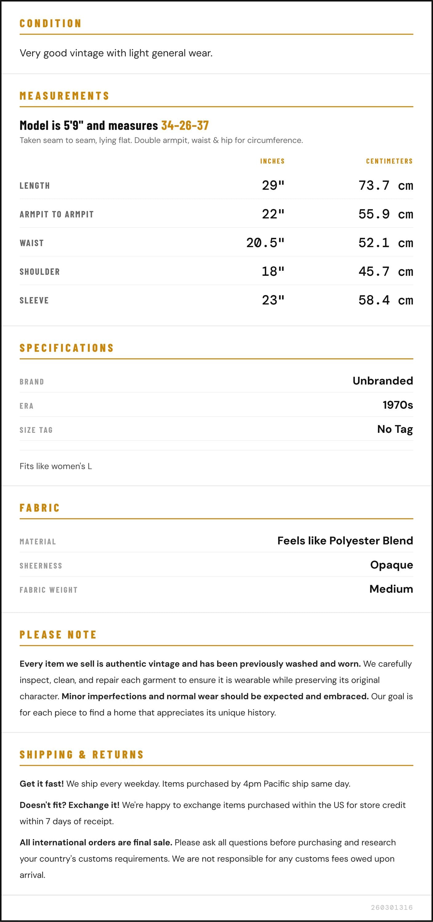 ✨ Please see measurements and condition below. Every garment we sell is authentic vintage and one-of-a-kind! You will receive the exact item photographed.