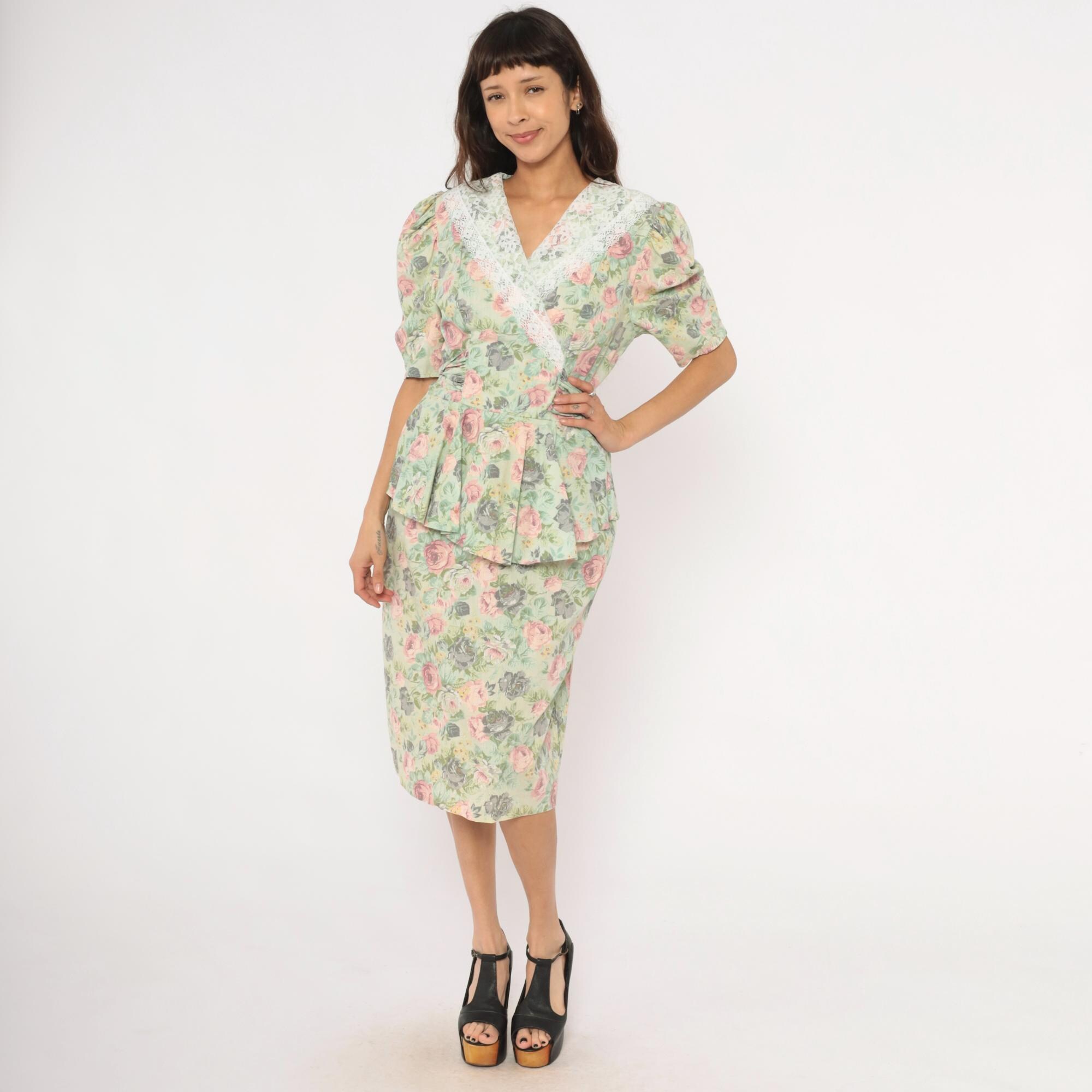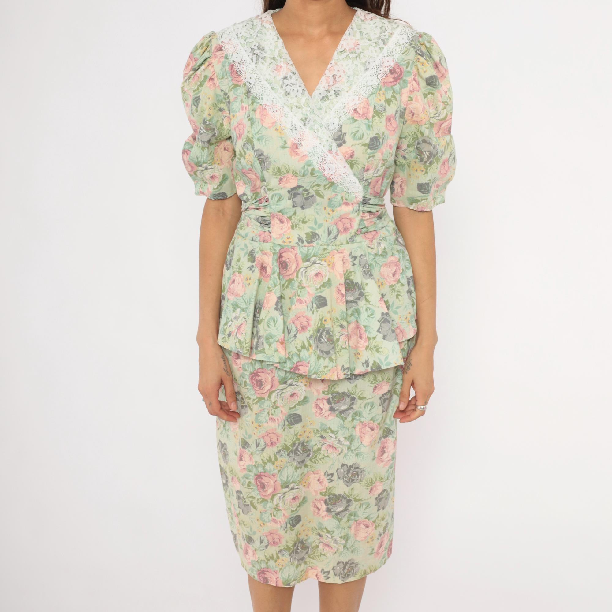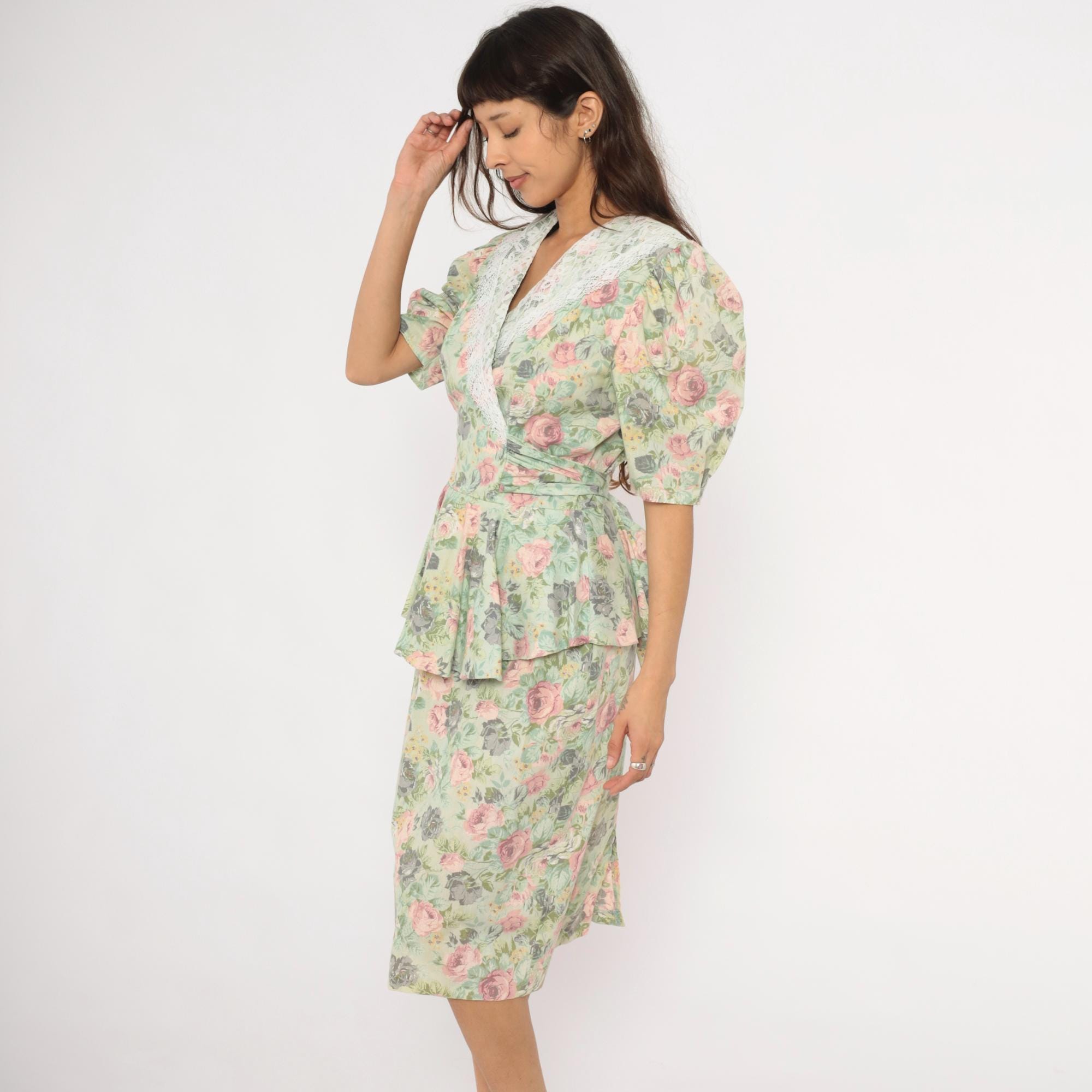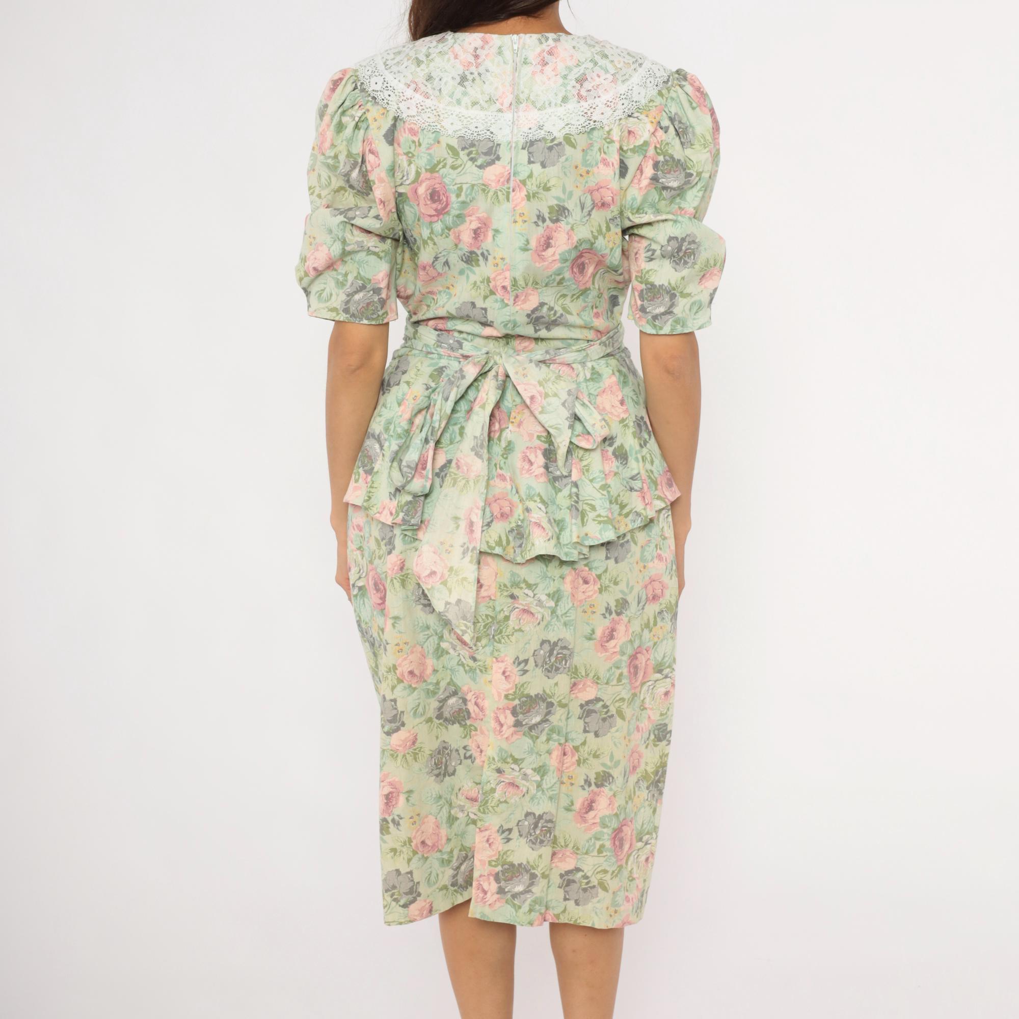 90s sage green peplum dress with an allover rose print in pink, mauve, and grey tones. Surplice wrap-style bodice with white lace trim along the V-neckline, gathered puff sleeves hitting at the elbow, and a fitted waist with pleated peplum. Straight pencil skirt below the peplum, back zipper closure, and a matching fabric tie at the back waist. Lace detail continues across the upper back neckline.