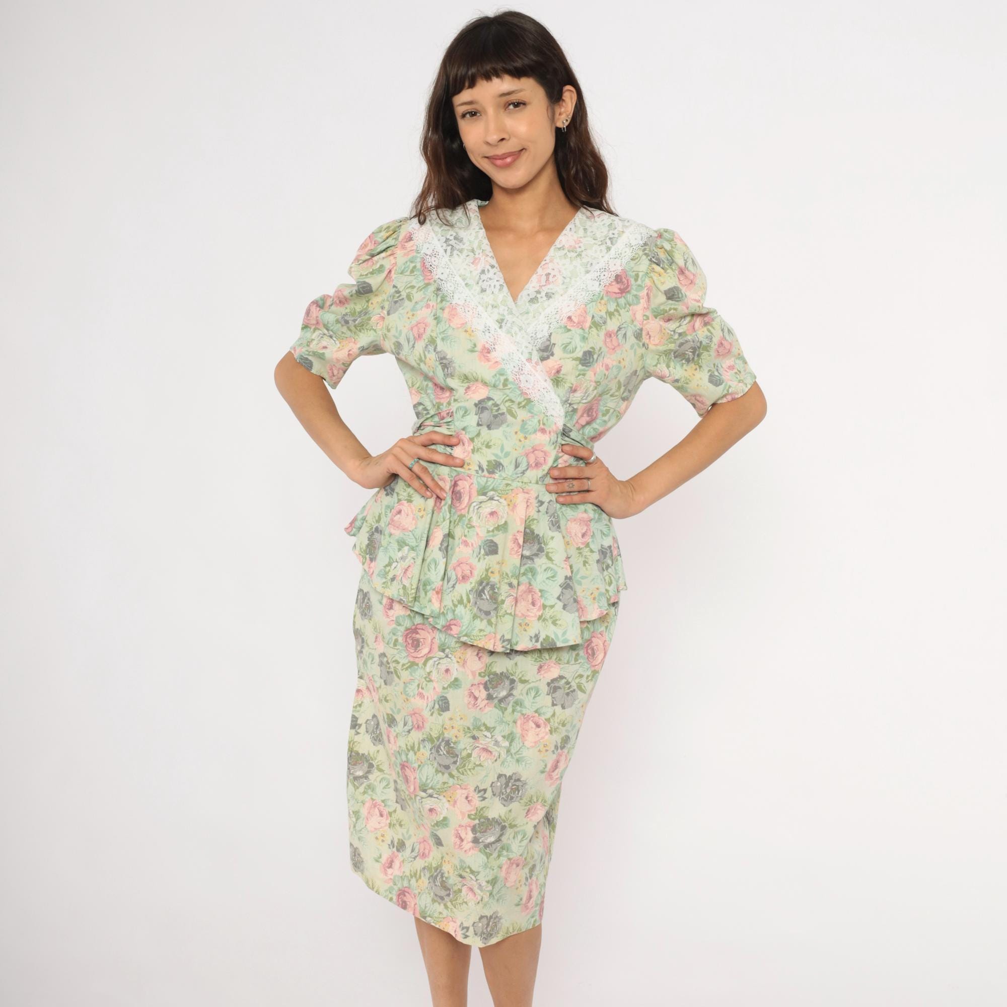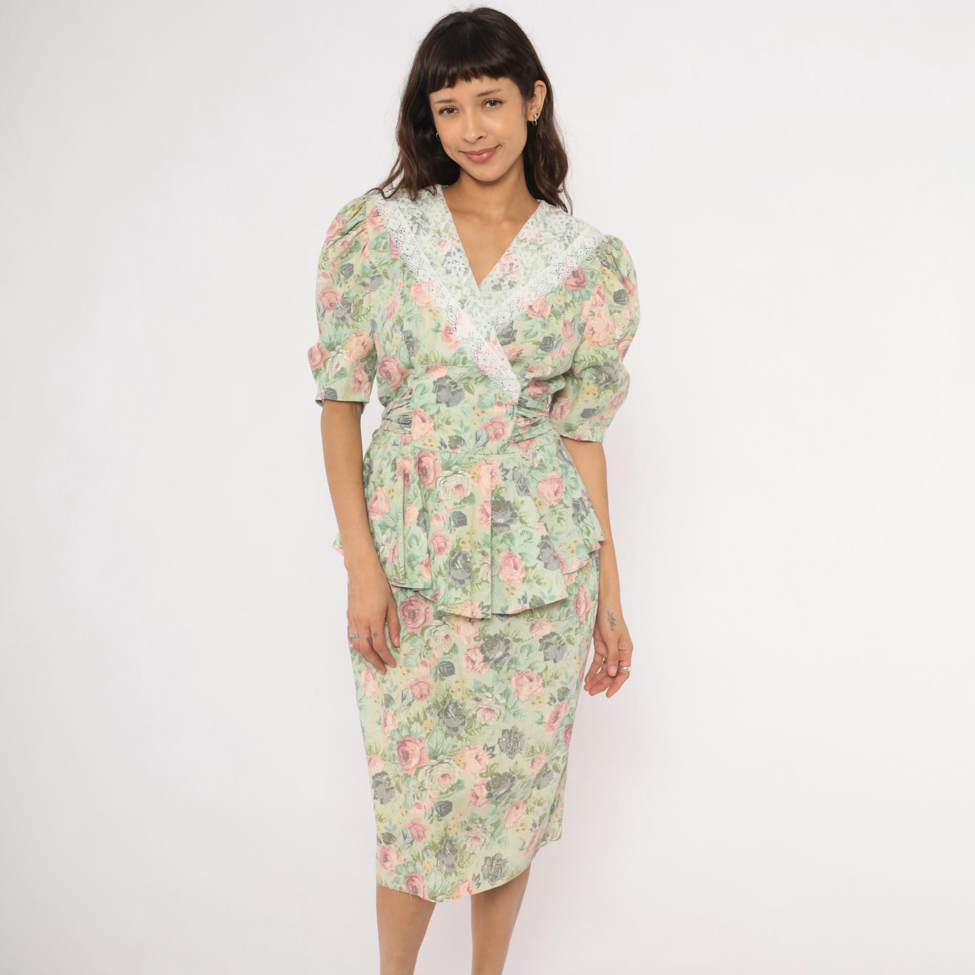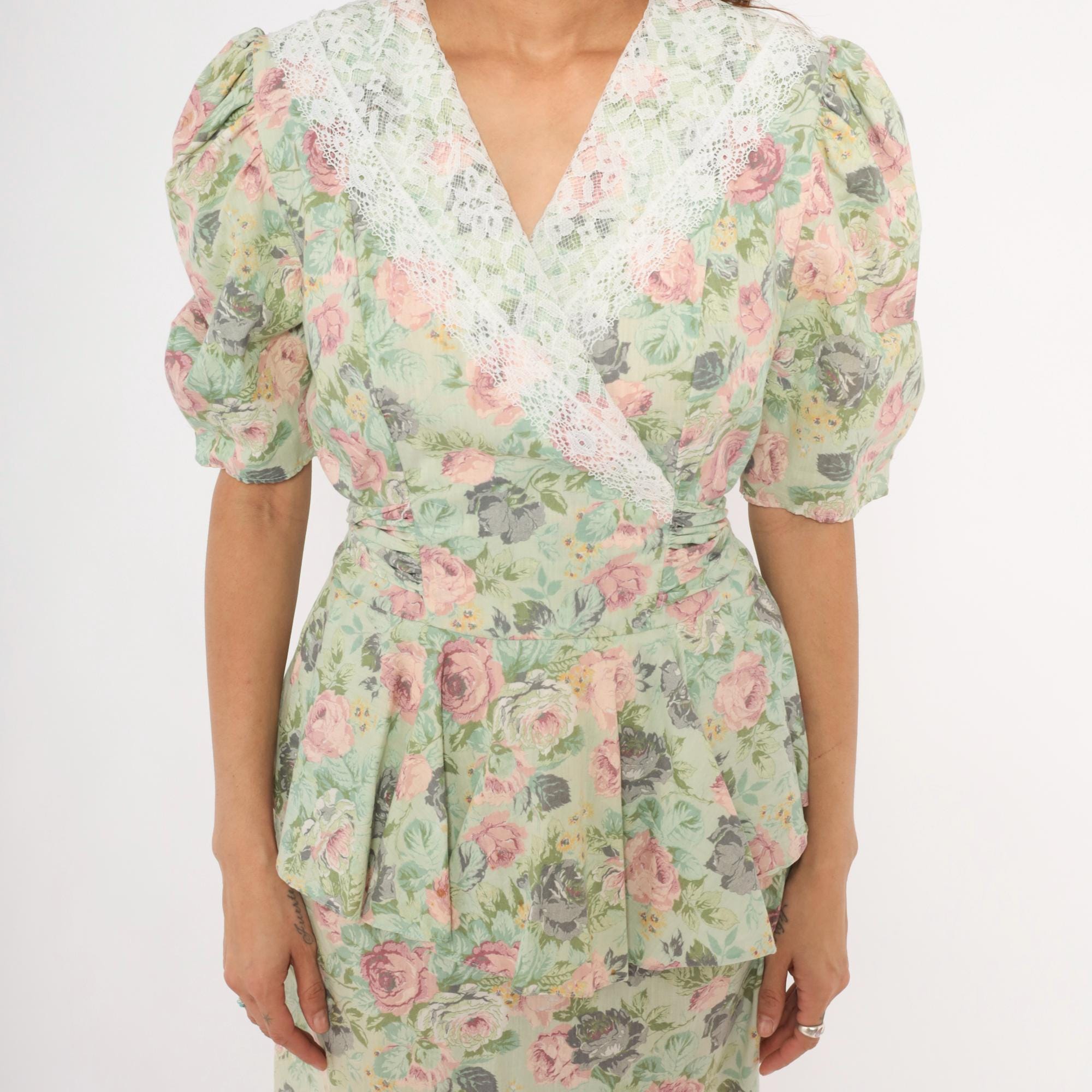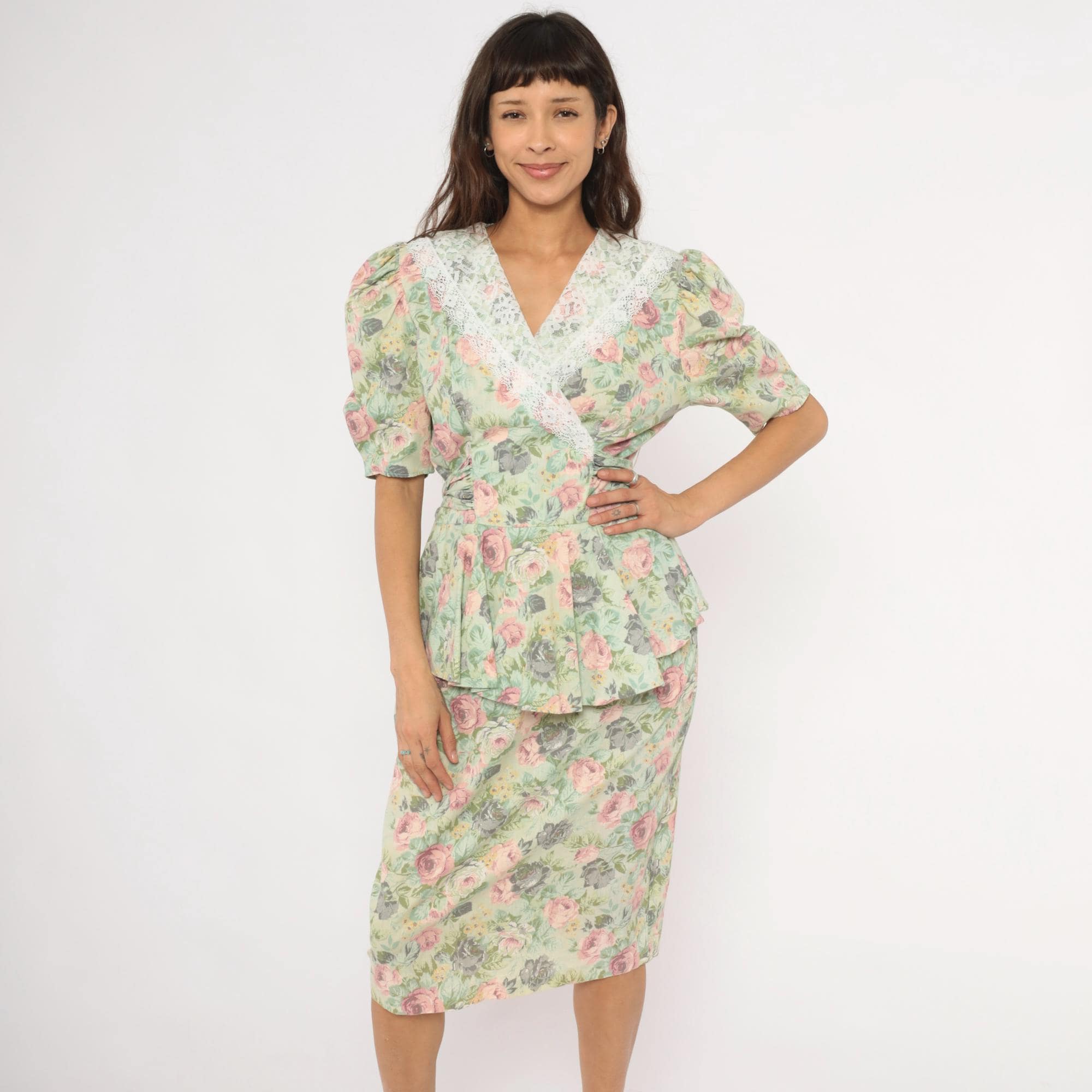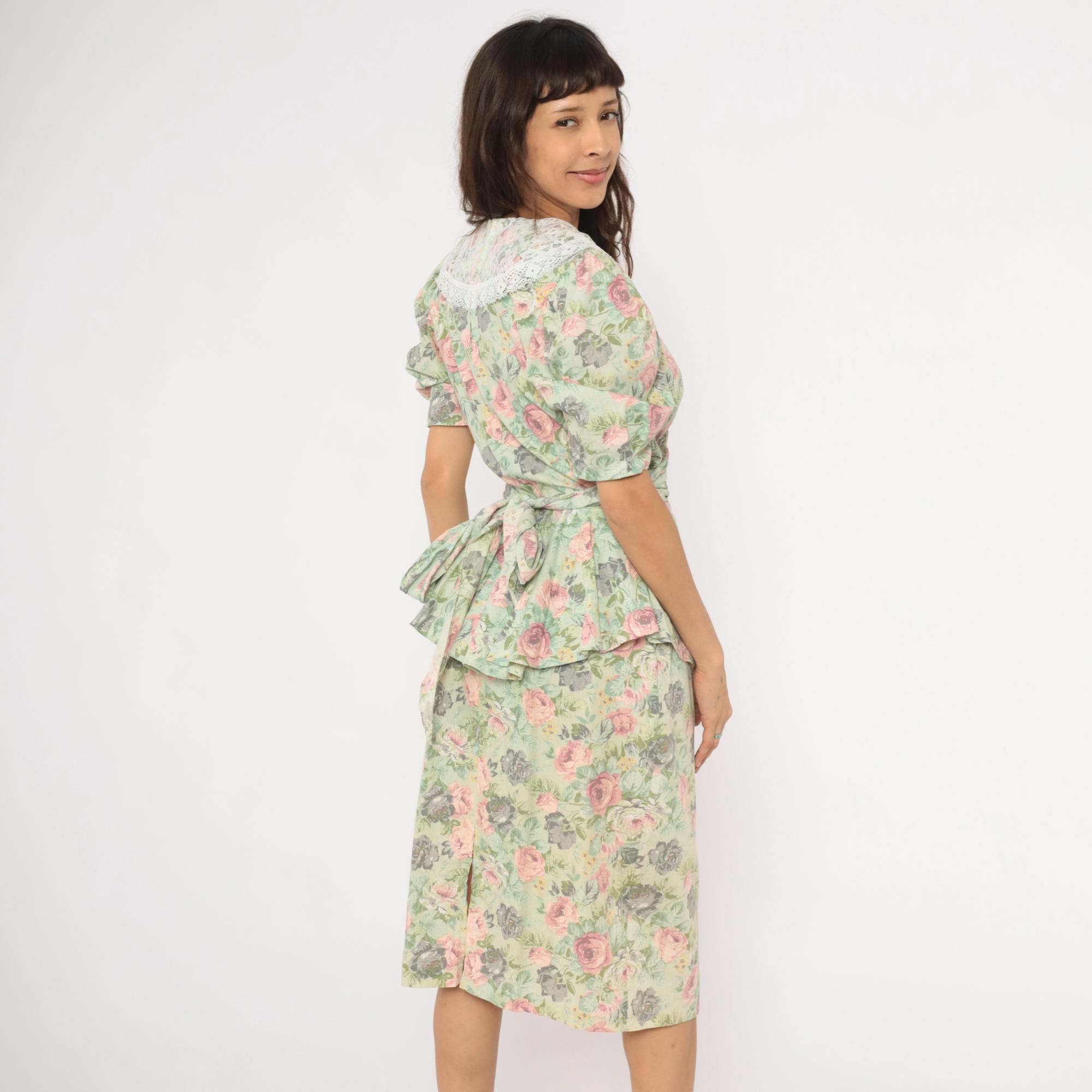 90s sage green peplum dress with an allover rose print in pink, mauve, and grey tones. Surplice wrap-style bodice with white lace trim along the V-neckline, gathered puff sleeves hitting at the elbow, and a fitted waist with pleated peplum. Straight pencil skirt below the peplum, back zipper closure, and a matching fabric tie at the back waist. Lace detail continues across the upper back neckline.