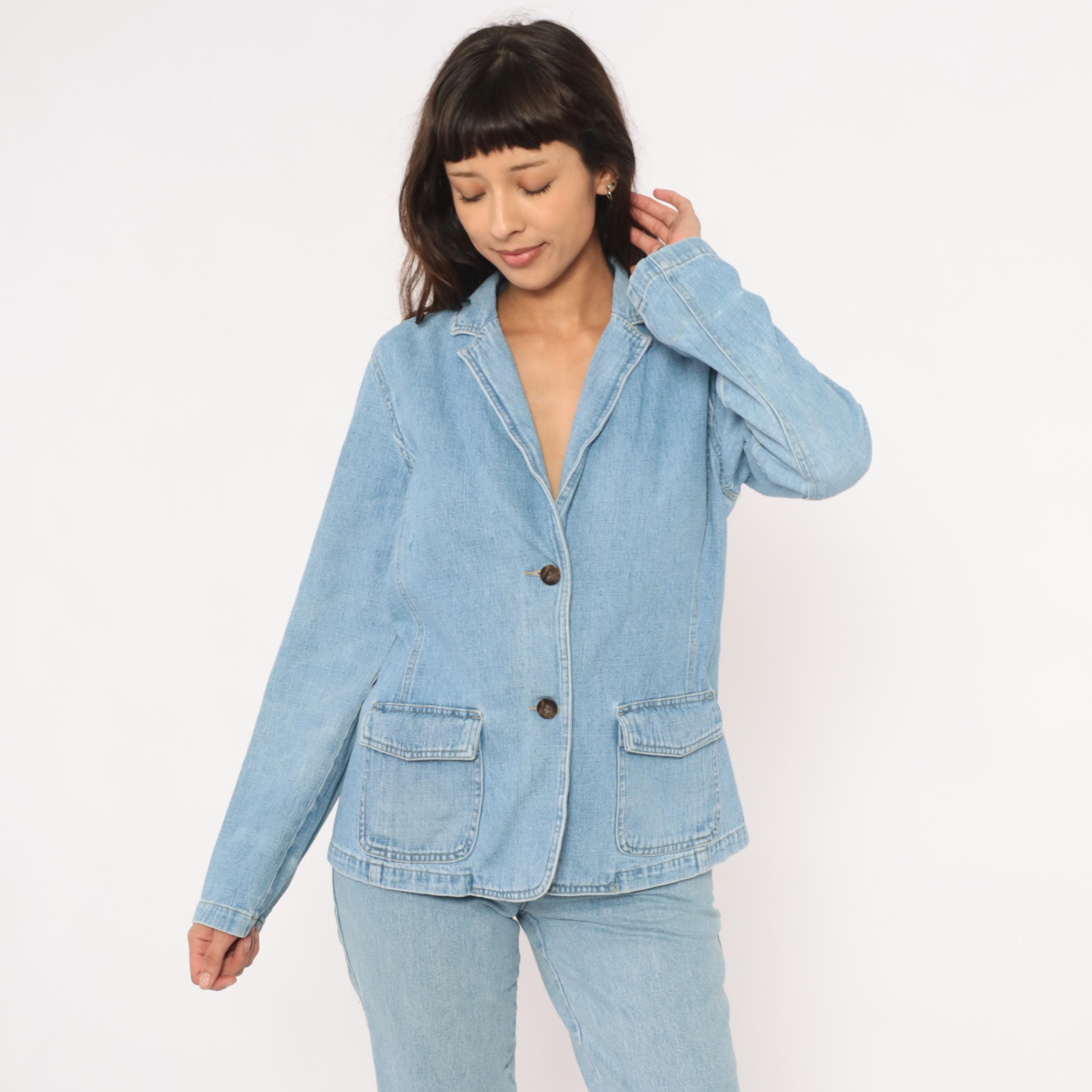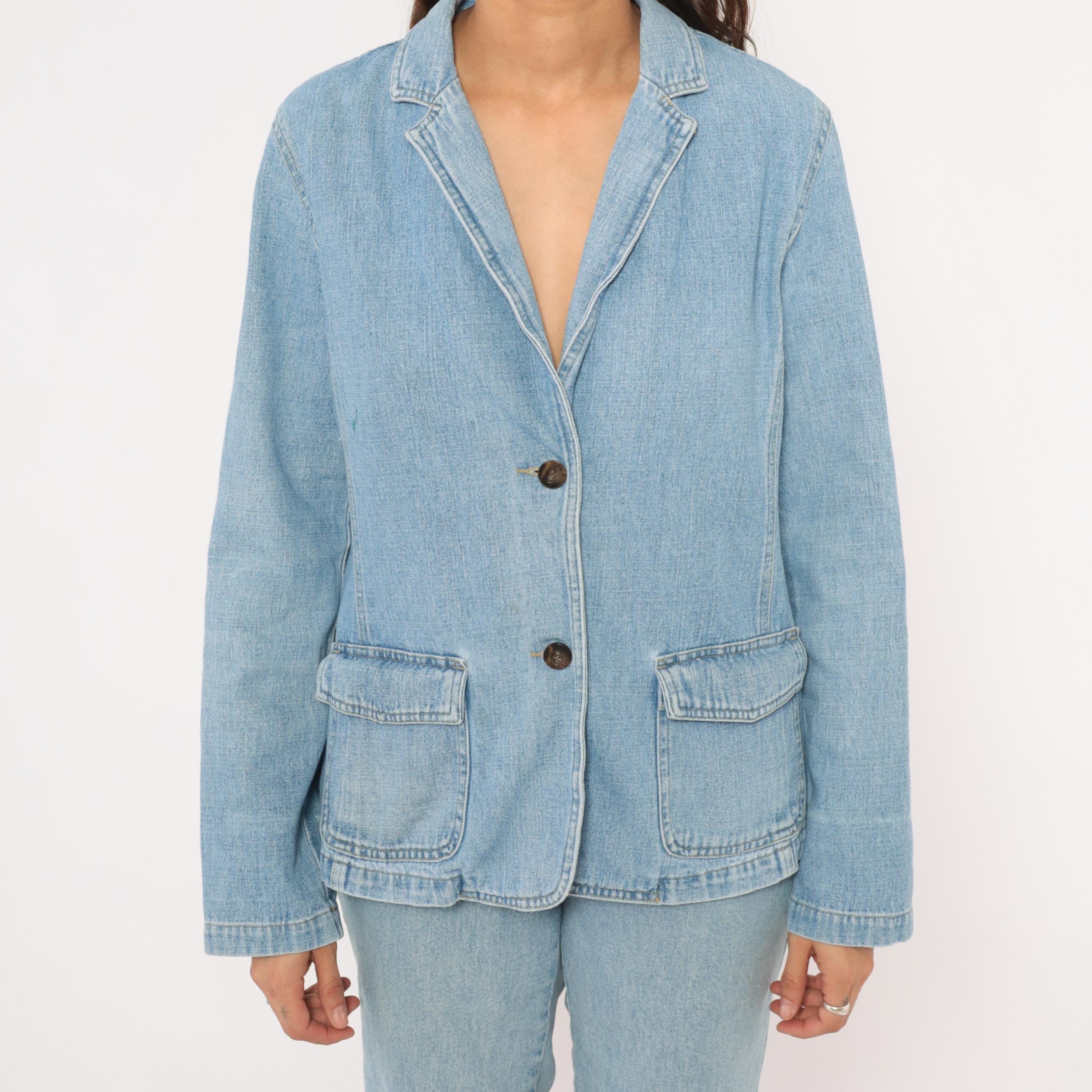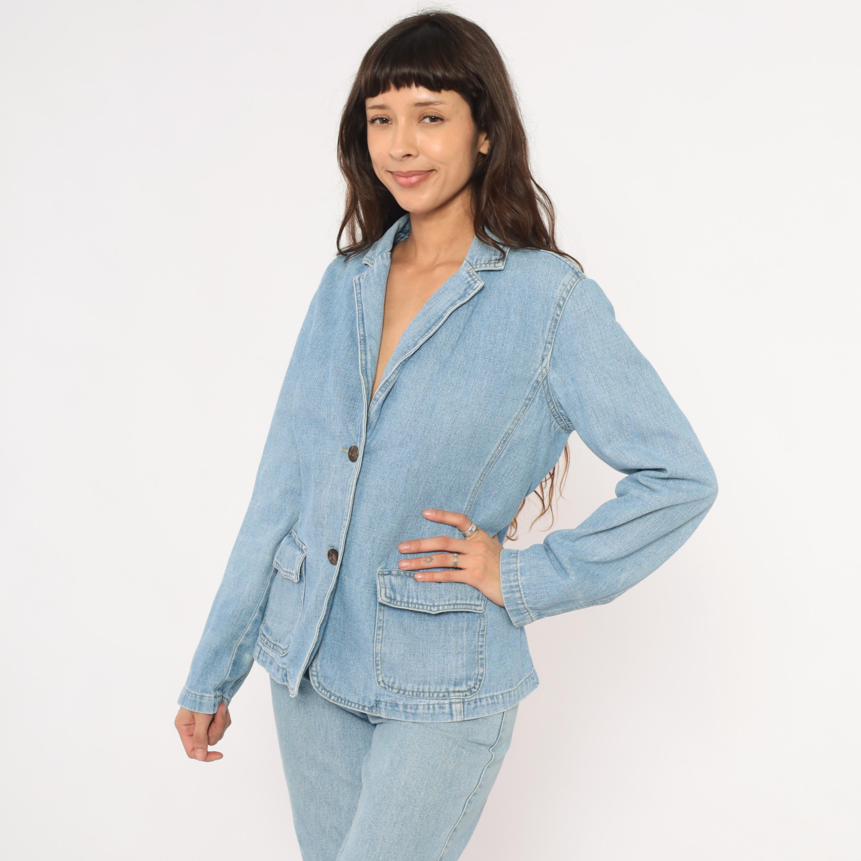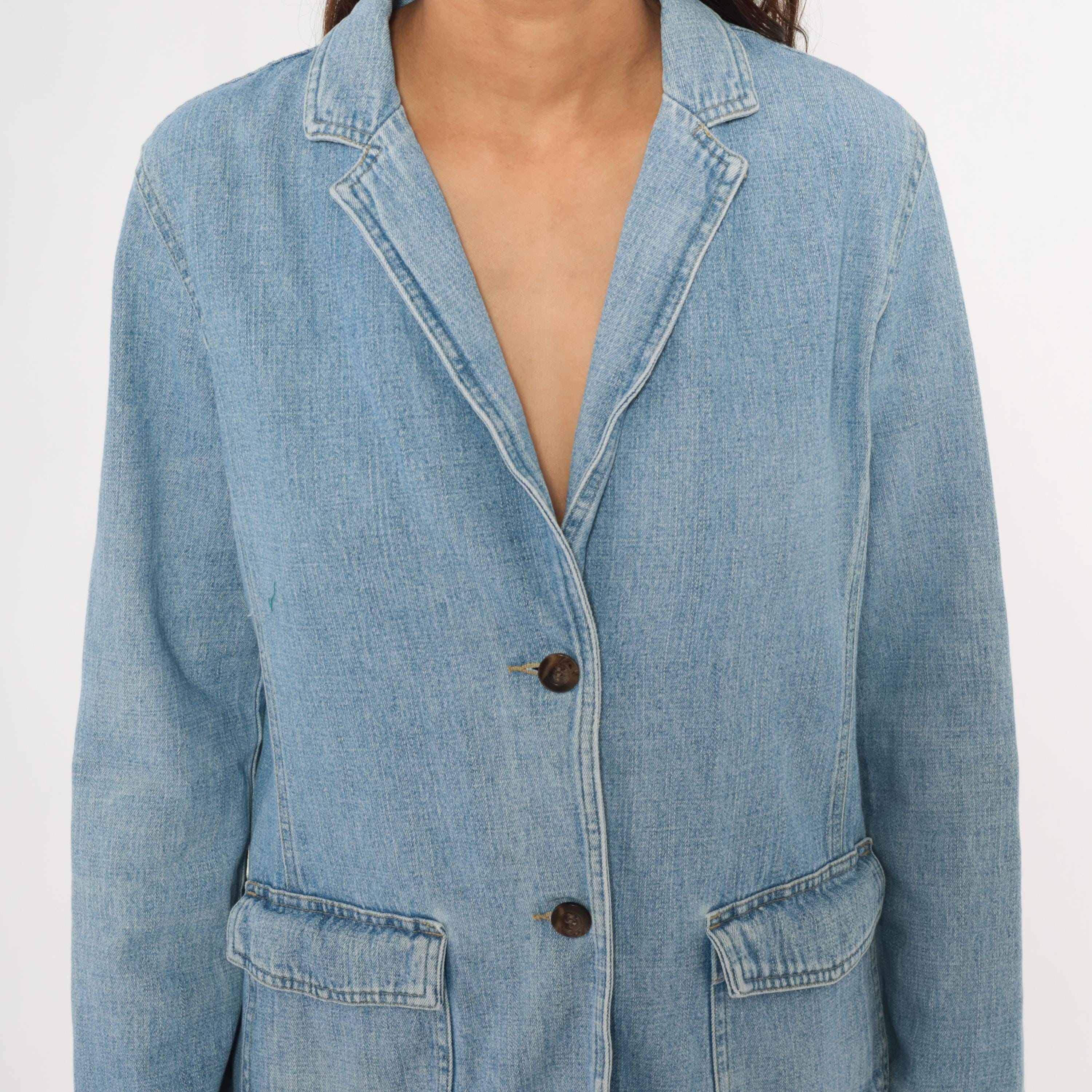 Light wash denim blazer from Crazy Horse with notched lapel collar and two-button front closure. Two large front patch pockets with flap detail sit at the hip. Back panel seaming runs from shoulder to hem, and the straight cut silhouette hits at the hip.
