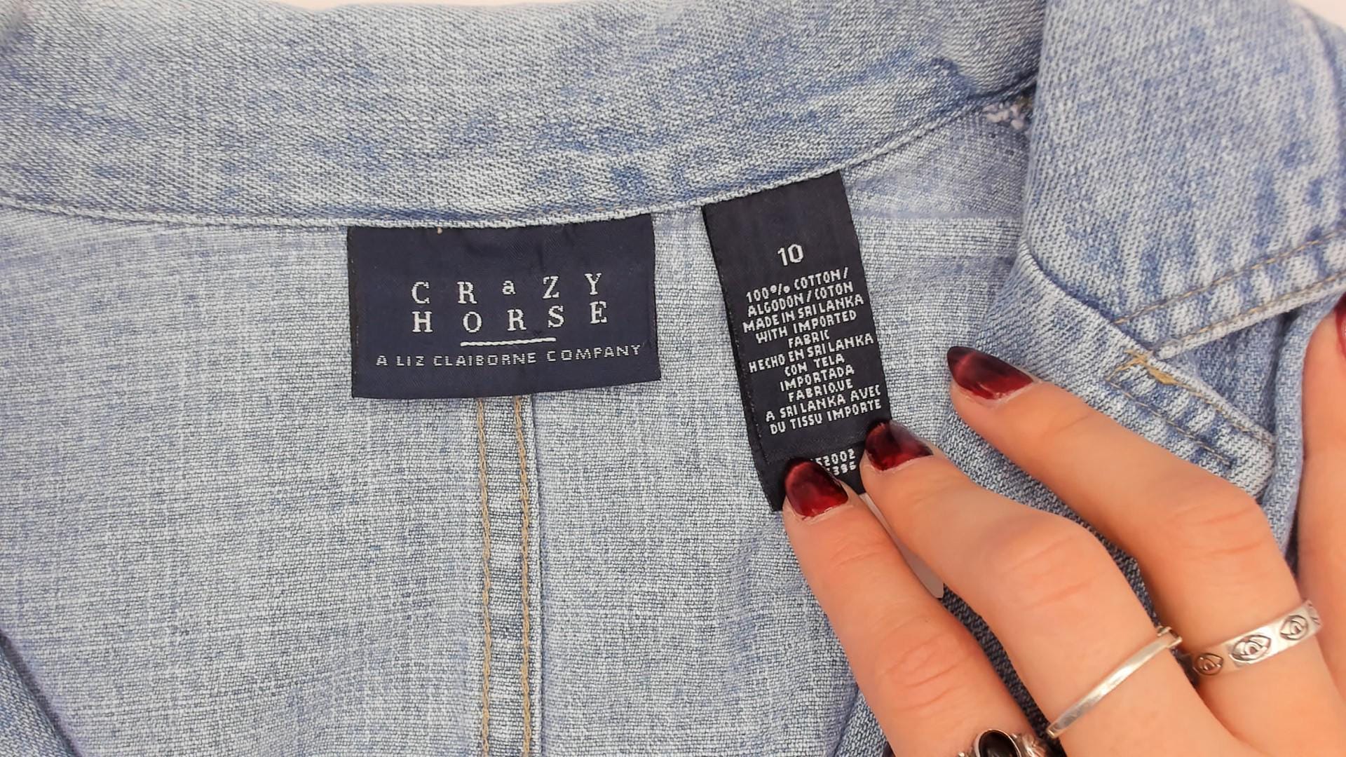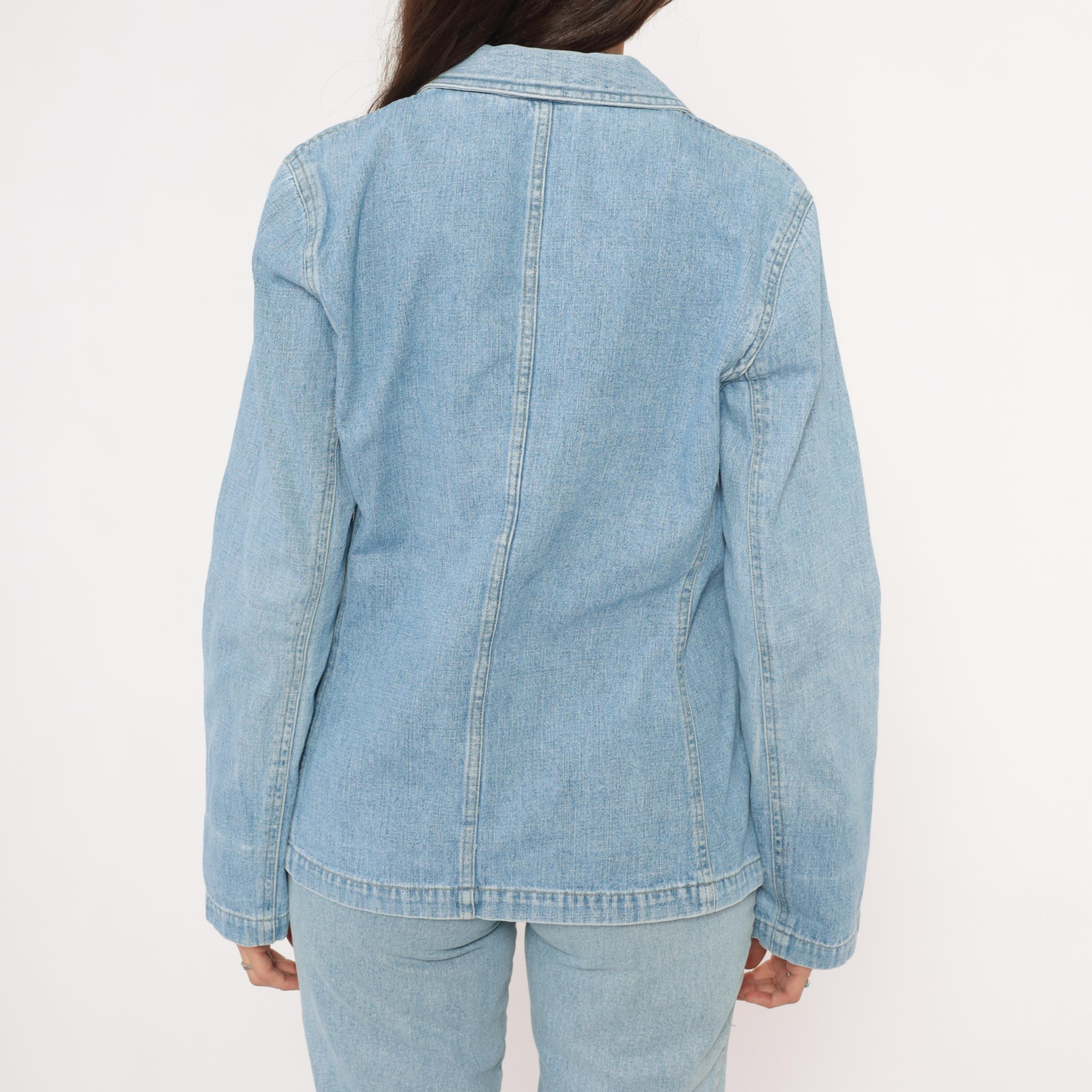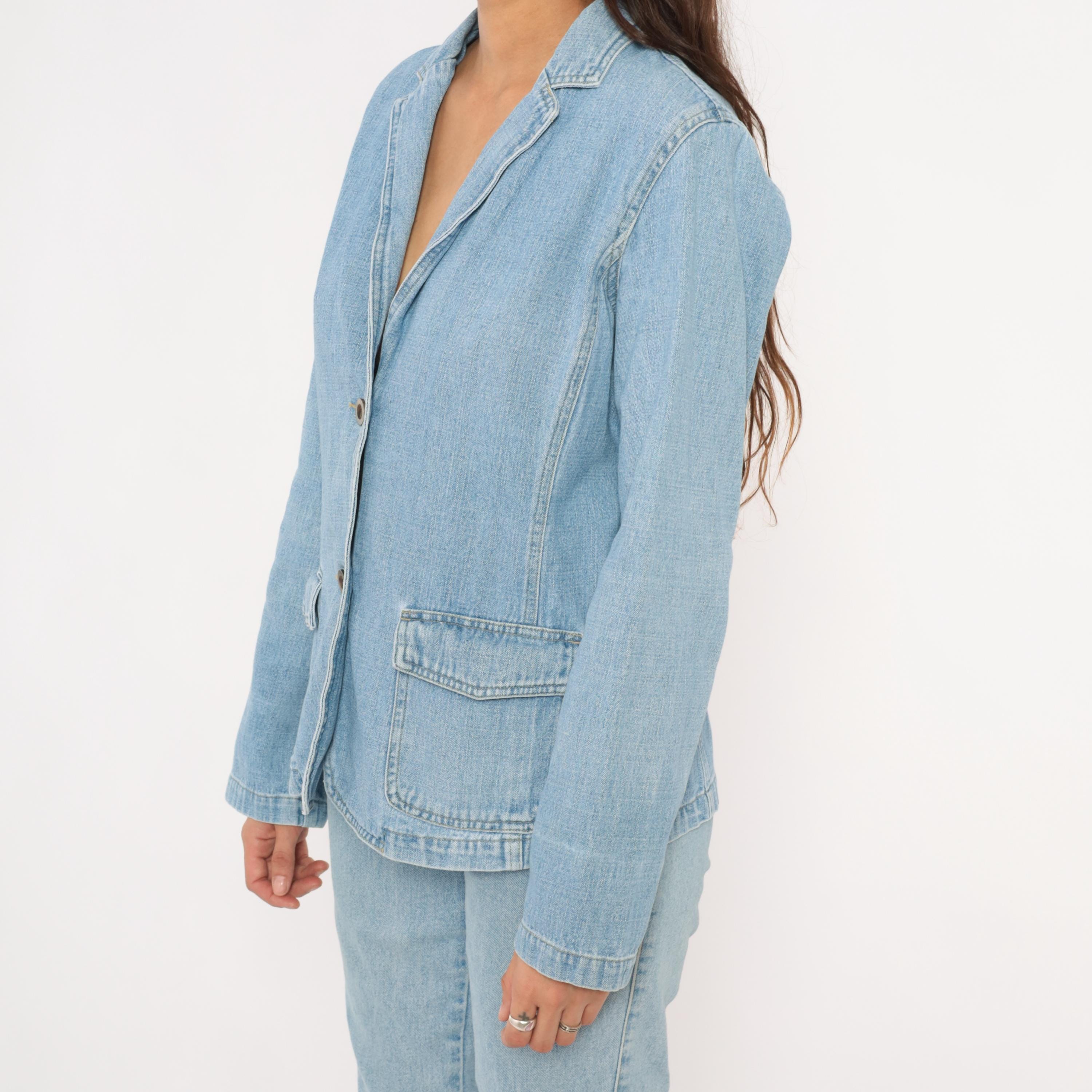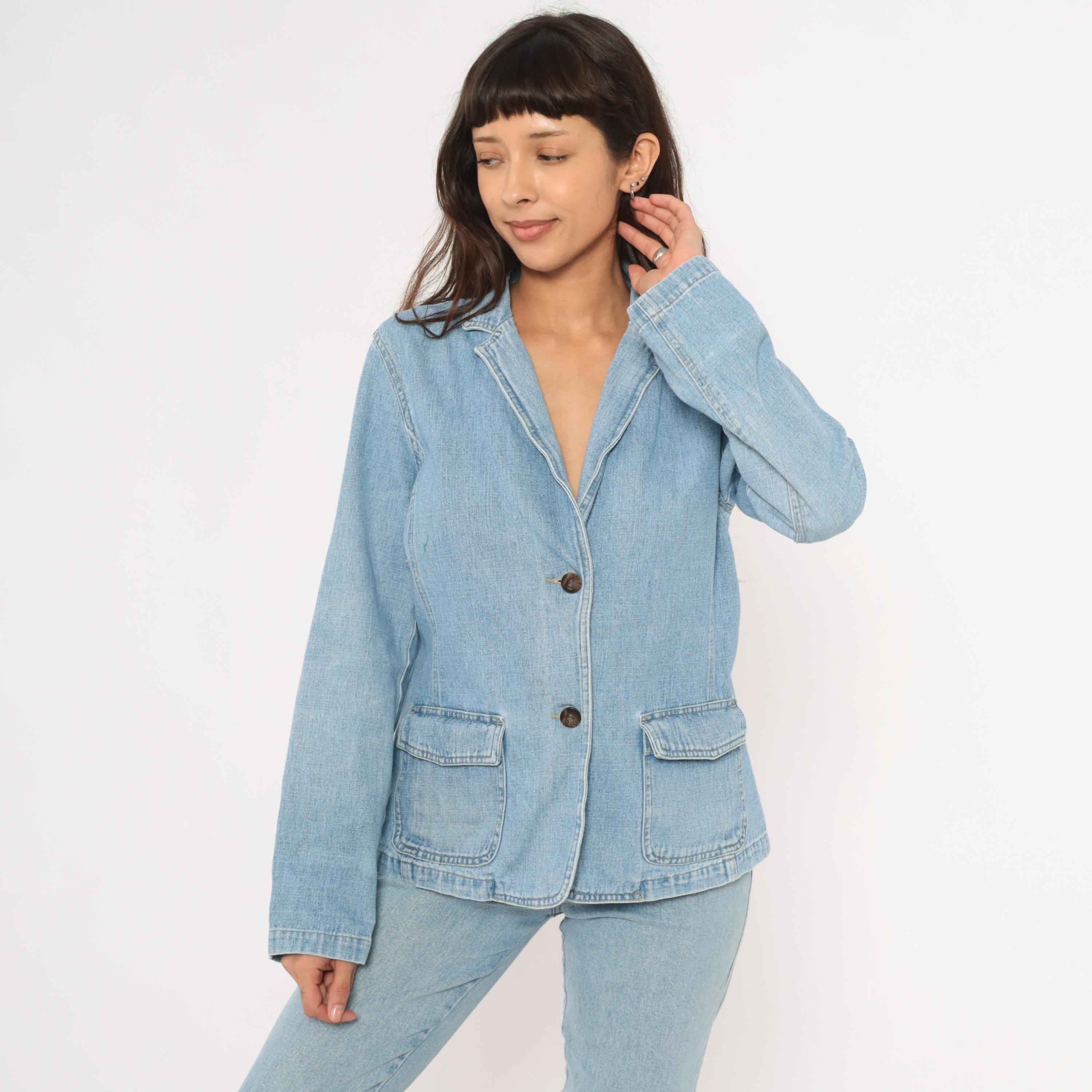 Light wash denim blazer from Crazy Horse with notched lapel collar and two-button front closure. Two large front patch pockets with flap detail sit at the hip. Back panel seaming runs from shoulder to hem, and the straight cut silhouette hits at the hip.