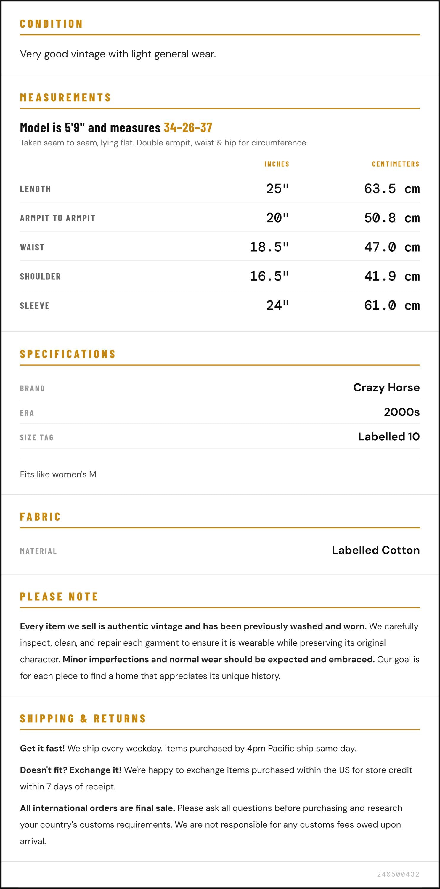 Vintage denim was usually made without any stretch, unlike modern jeans. Check the measurements to ensure proper fit, and remember to give yourself a little wiggle room in the waist and hips, depending on your preferred fit.