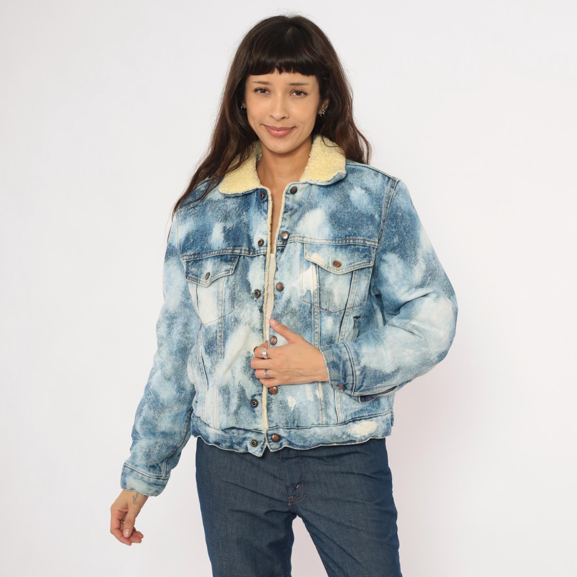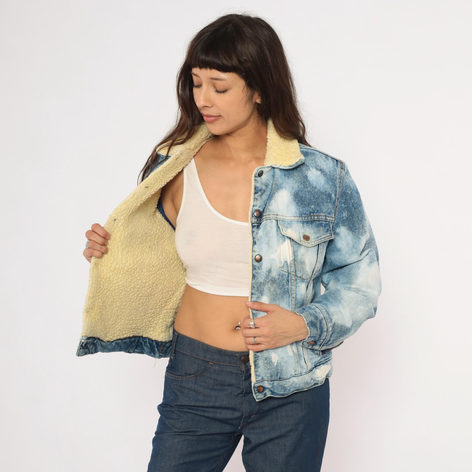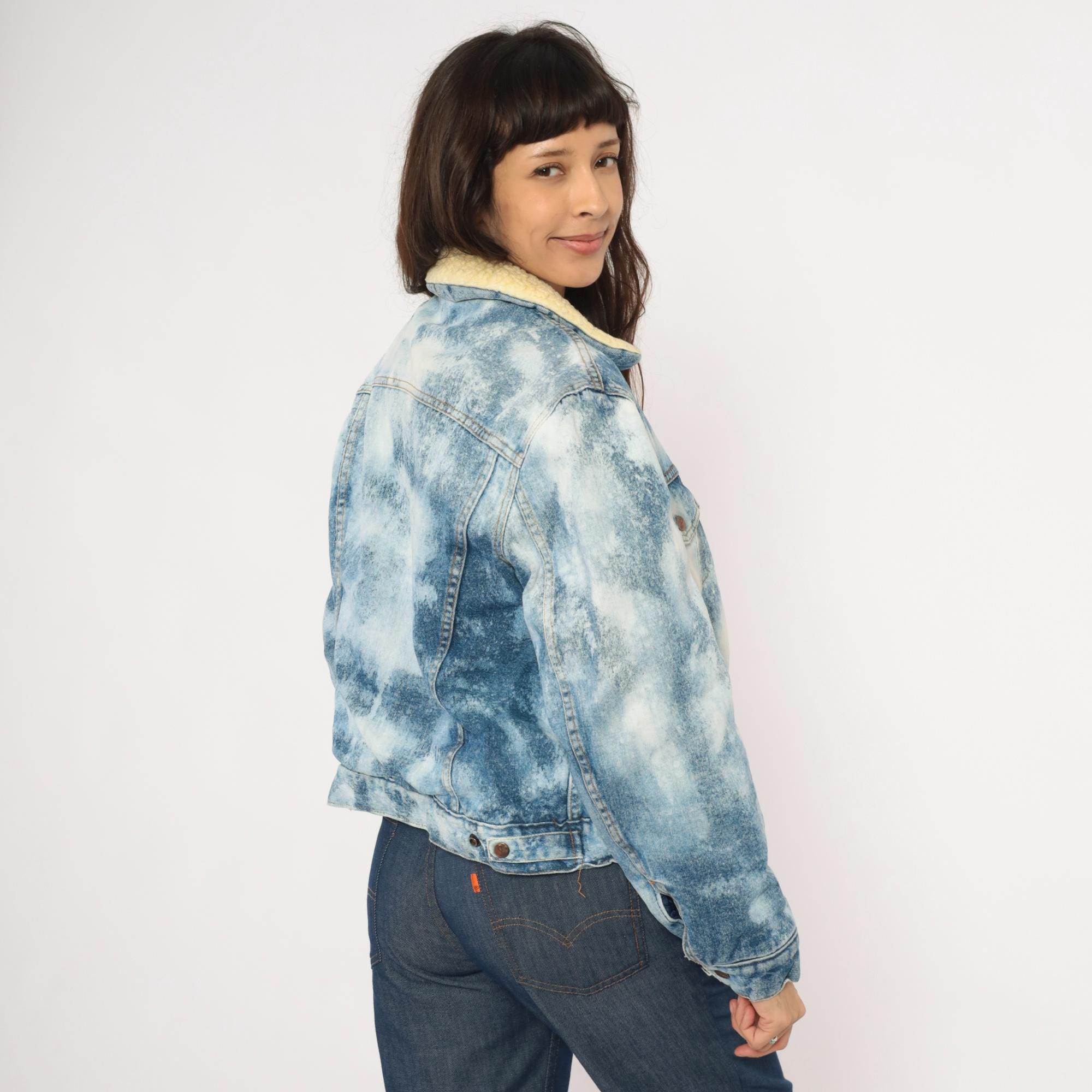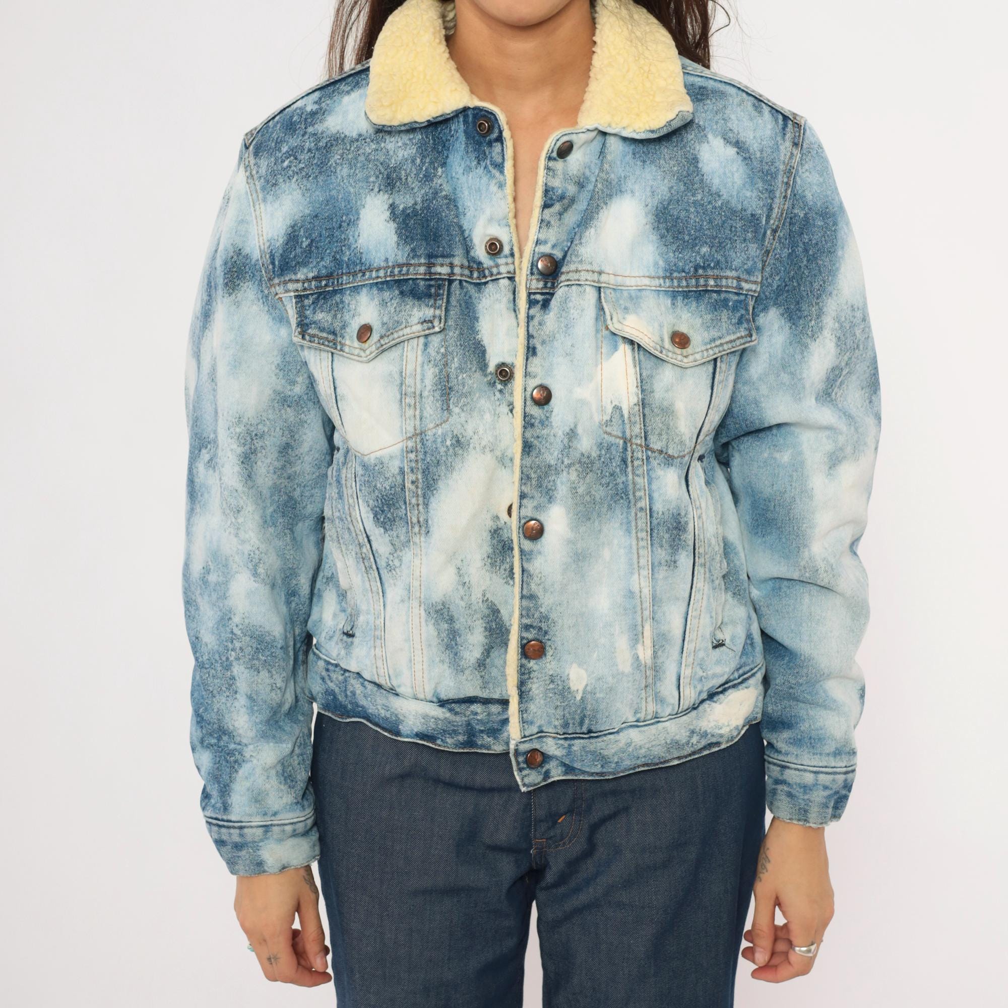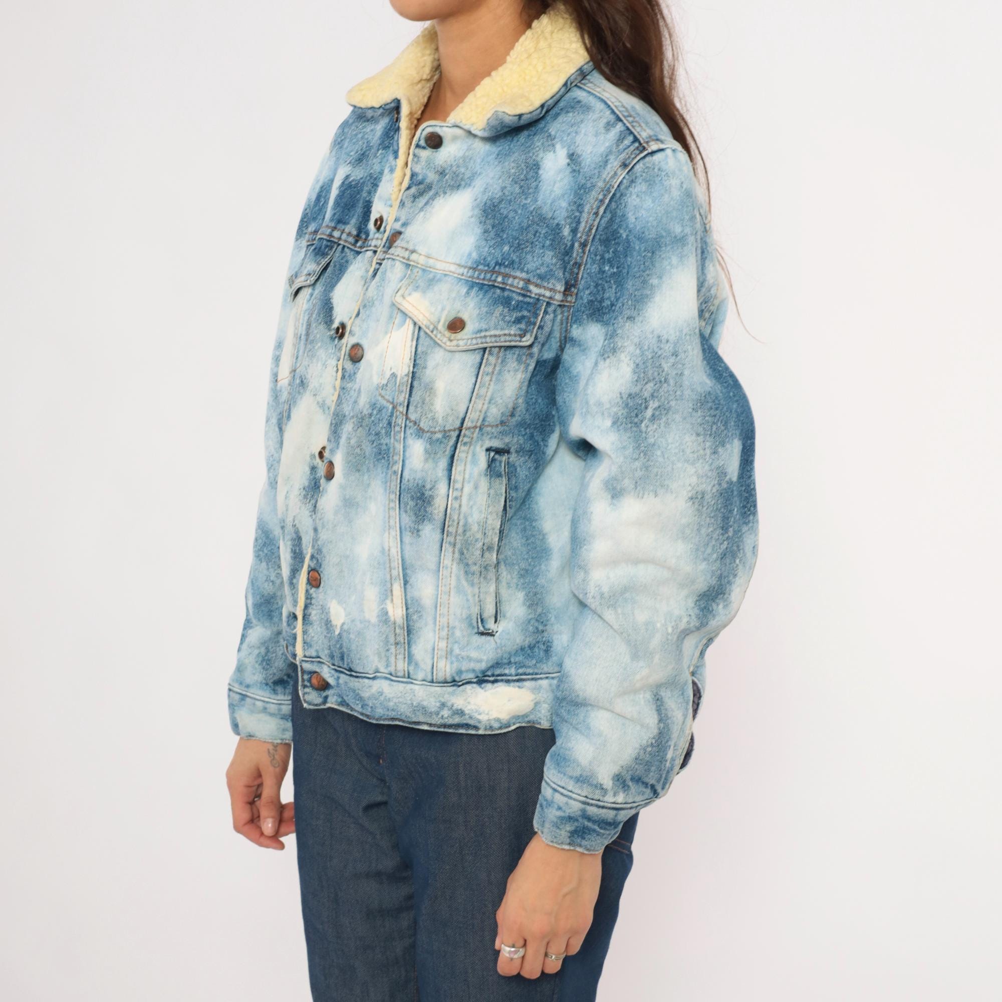 90s acid wash denim jacket from Silver Spur Western with cream sherpa fleece lining throughout the body and collar. Bleached blue and white cloudy wash across the cotton shell with snap button front closure and copper-tone hardware. Two front flap chest pockets, side seam pockets, and adjustable snap tabs at the waist hem.
