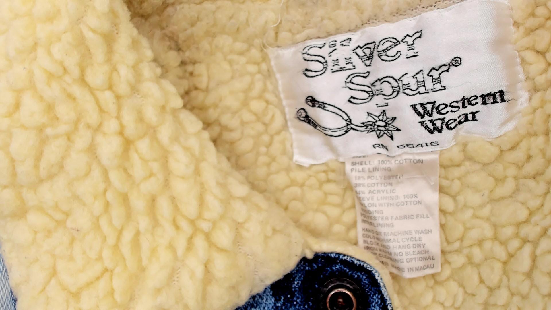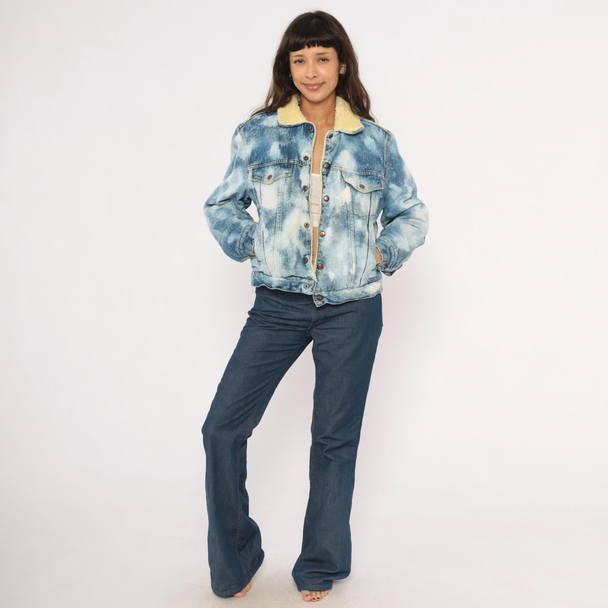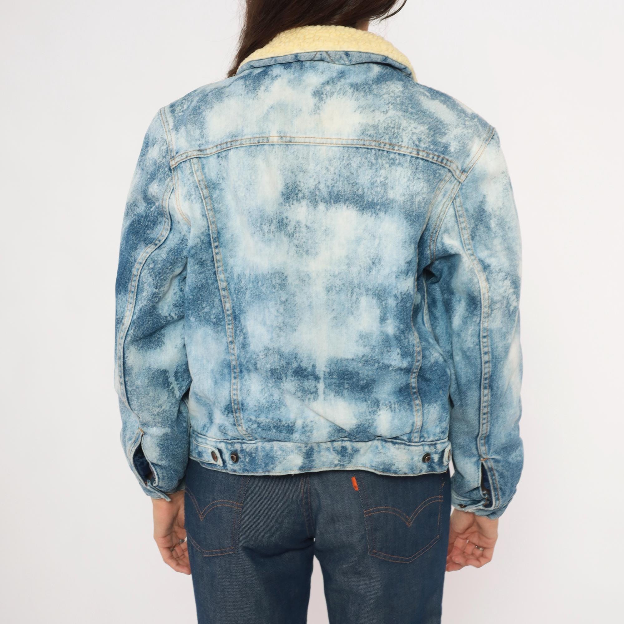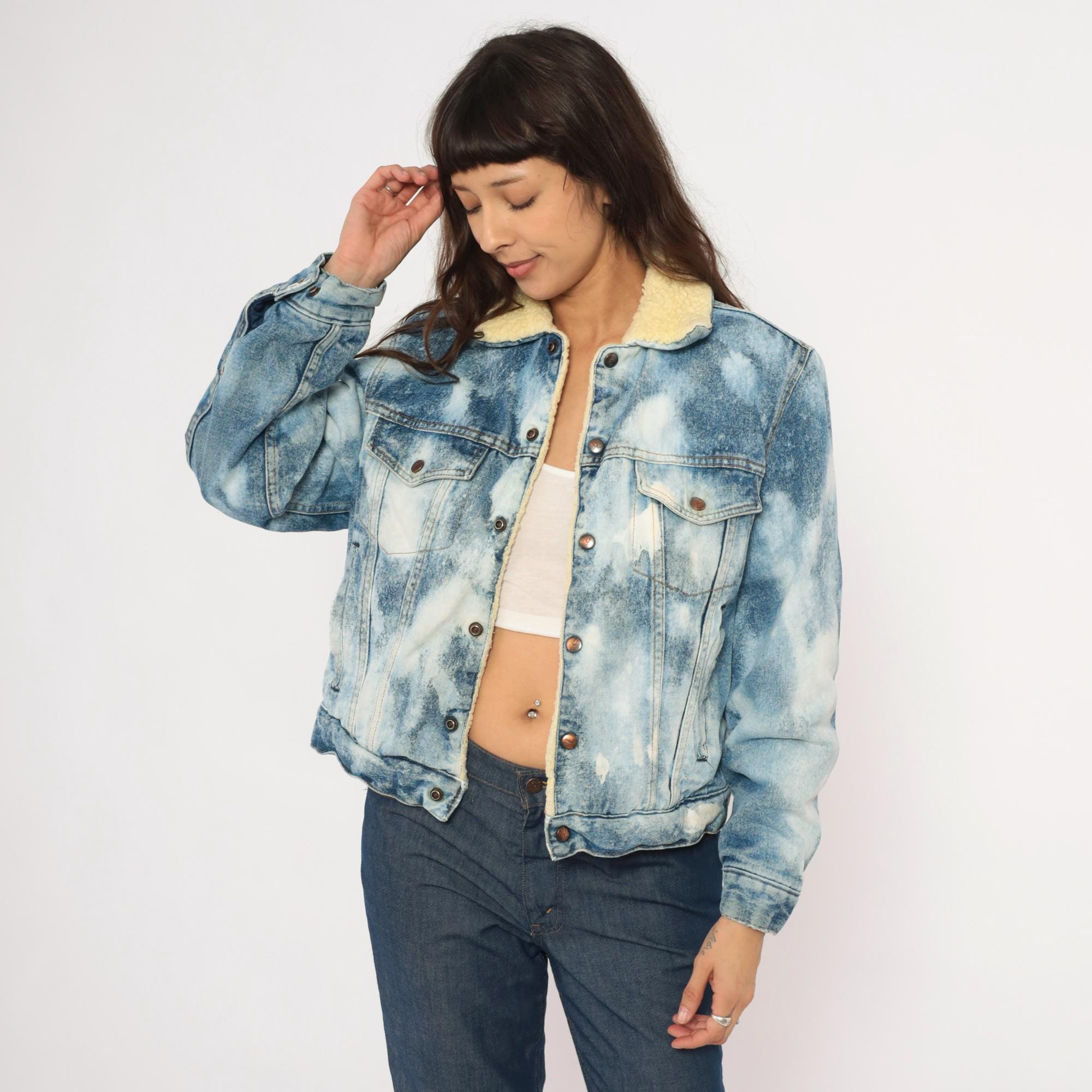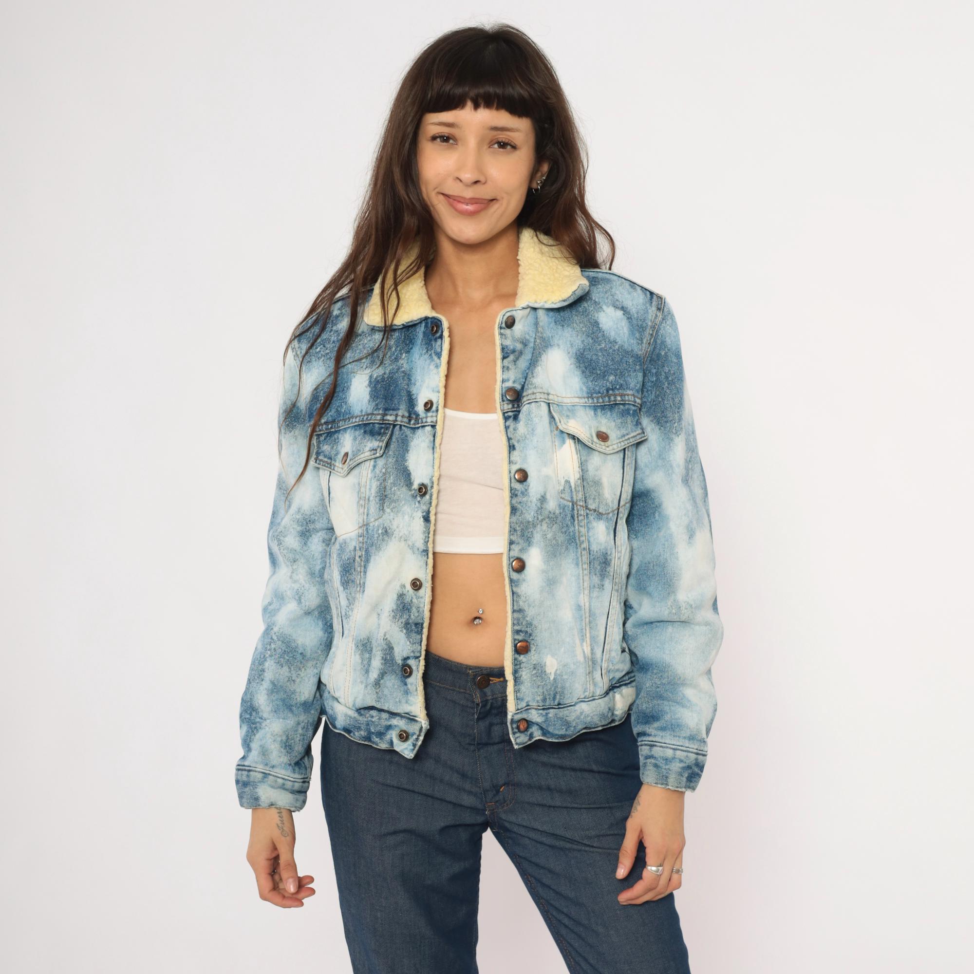 90s acid wash denim jacket from Silver Spur Western with cream sherpa fleece lining throughout the body and collar. Bleached blue and white cloudy wash across the cotton shell with snap button front closure and copper-tone hardware. Two front flap chest pockets, side seam pockets, and adjustable snap tabs at the waist hem.