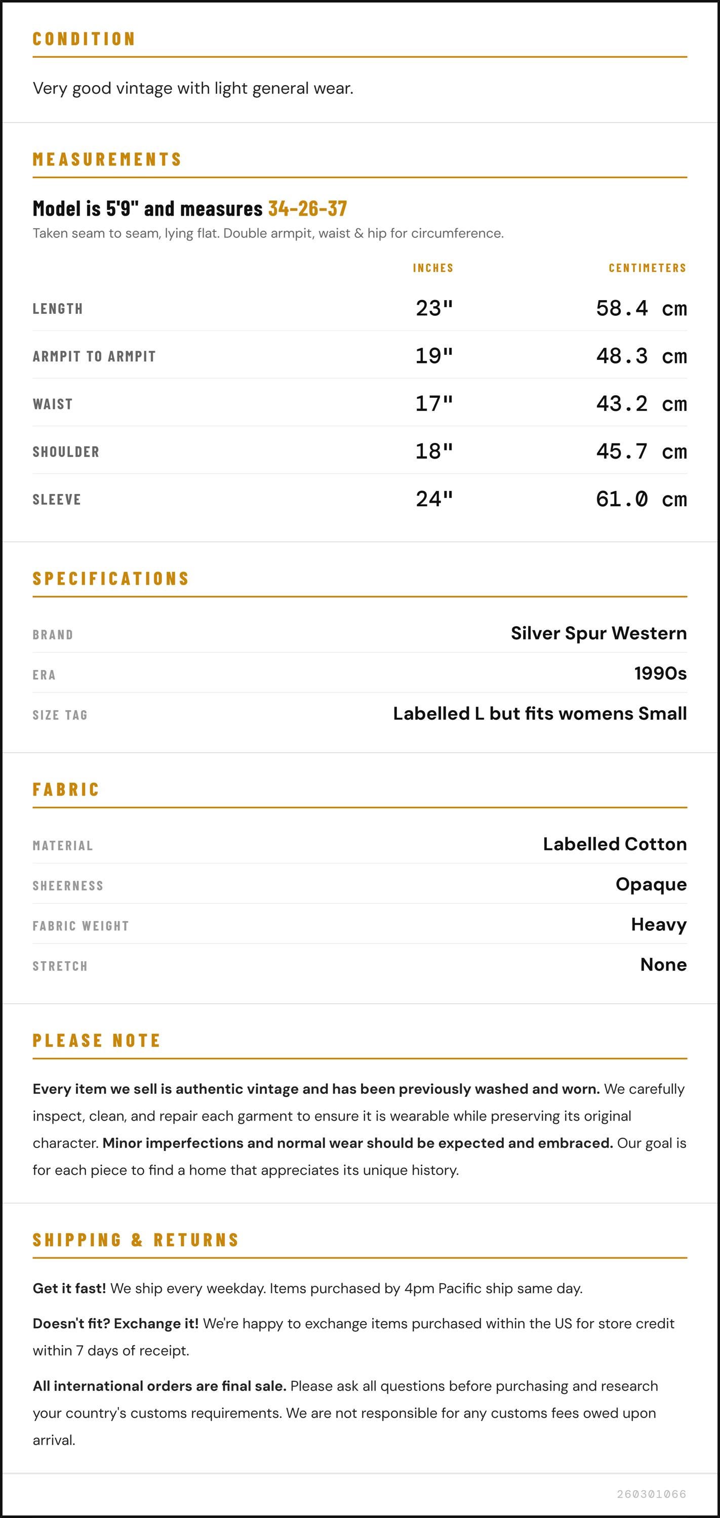 Vintage denim was usually made without any stretch, unlike modern jeans. Check the measurements to ensure proper fit, and remember to give yourself a little wiggle room in the waist and hips, depending on your preferred fit.