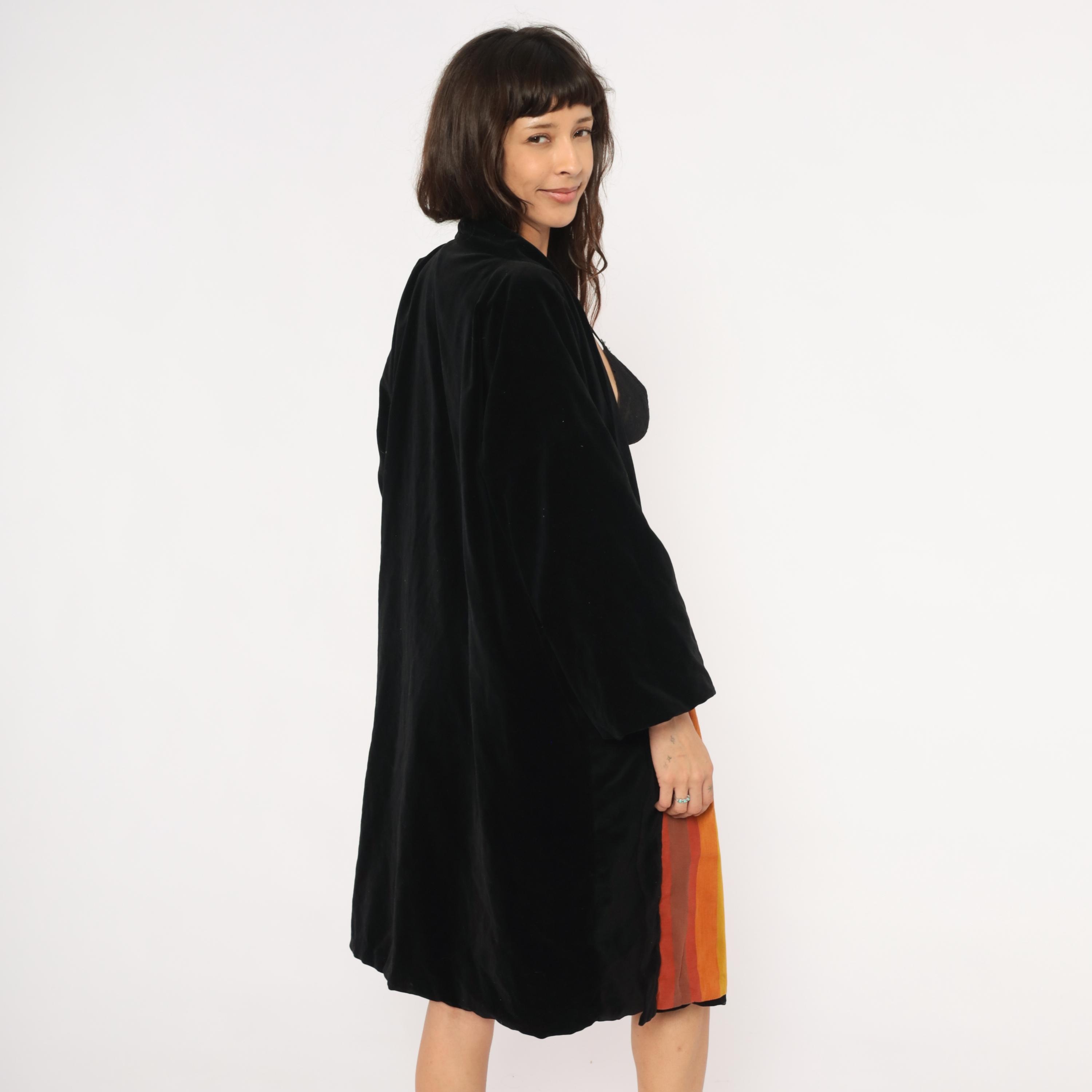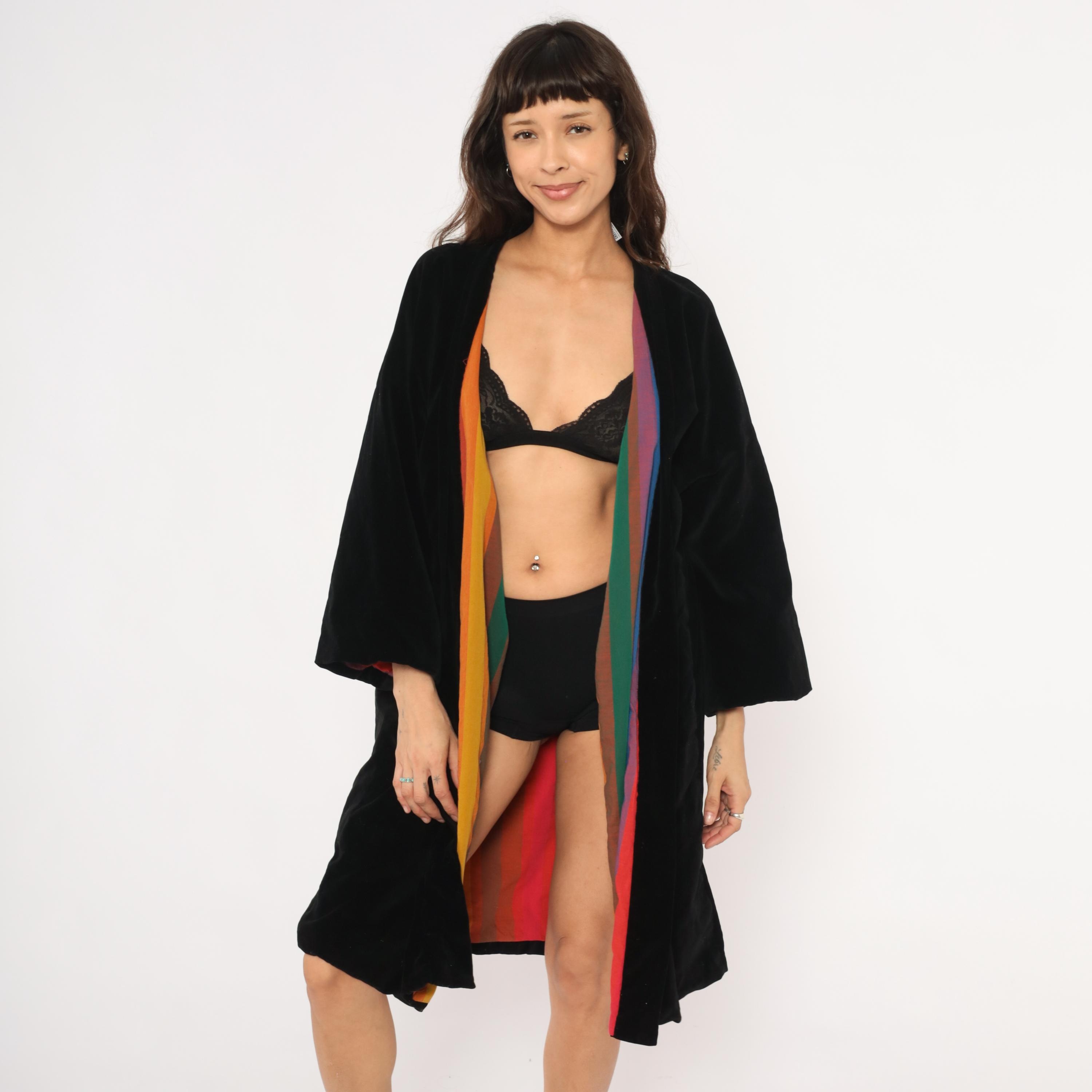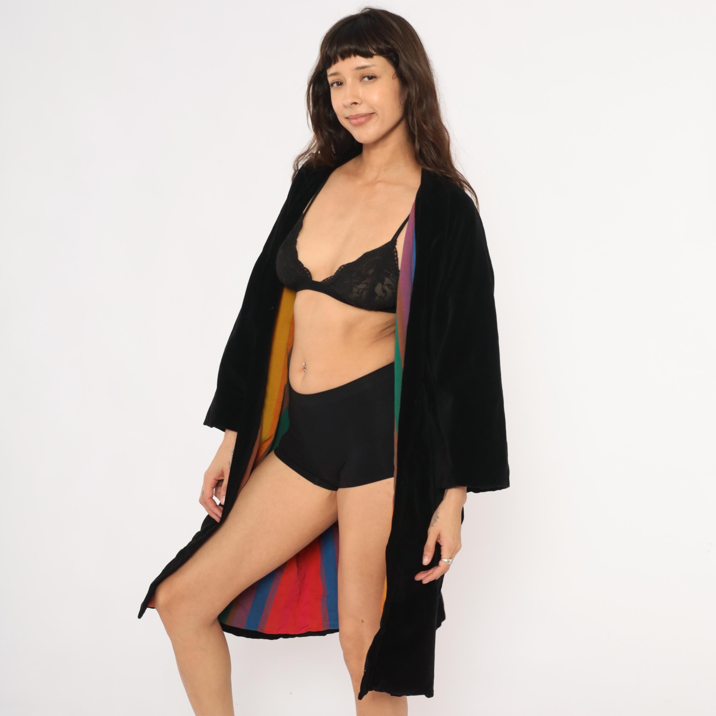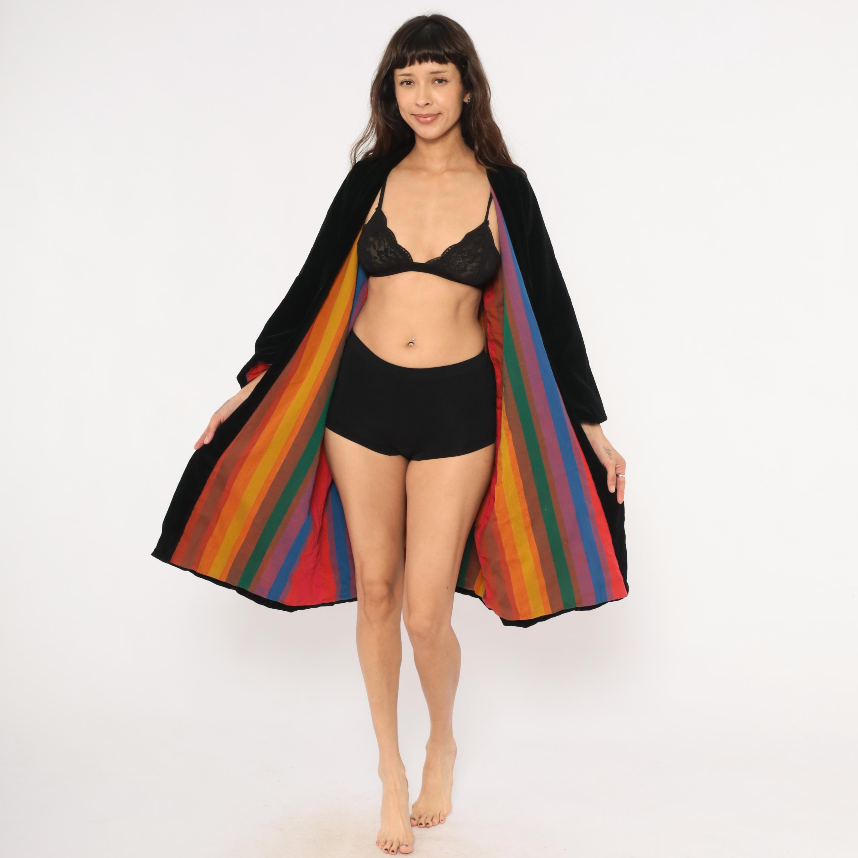 70s black velvet kimono-style robe with an open front, wide bell sleeves, and a knee-length cut. The interior is fully lined with a rainbow-striped fabric in red, orange, yellow, green, blue, and purple vertical stripes.