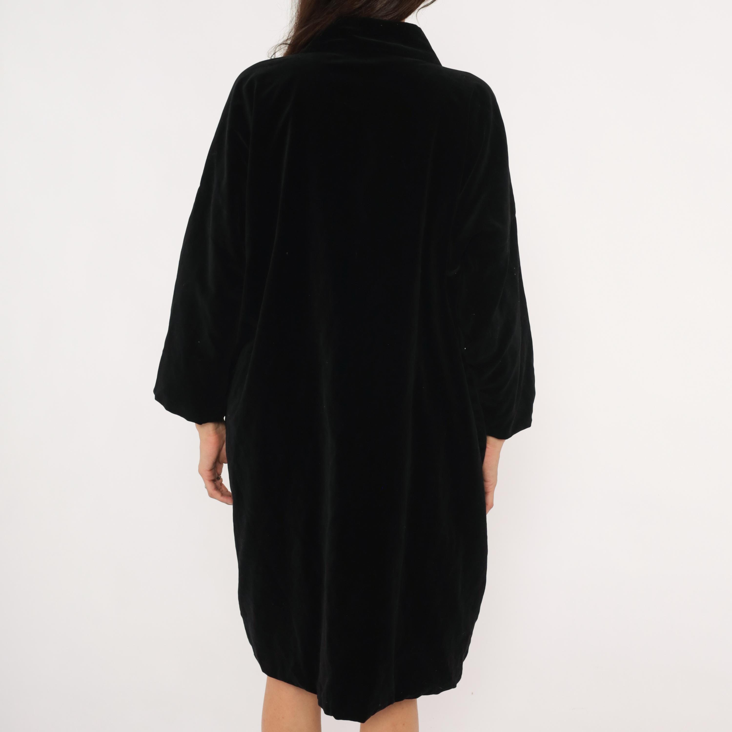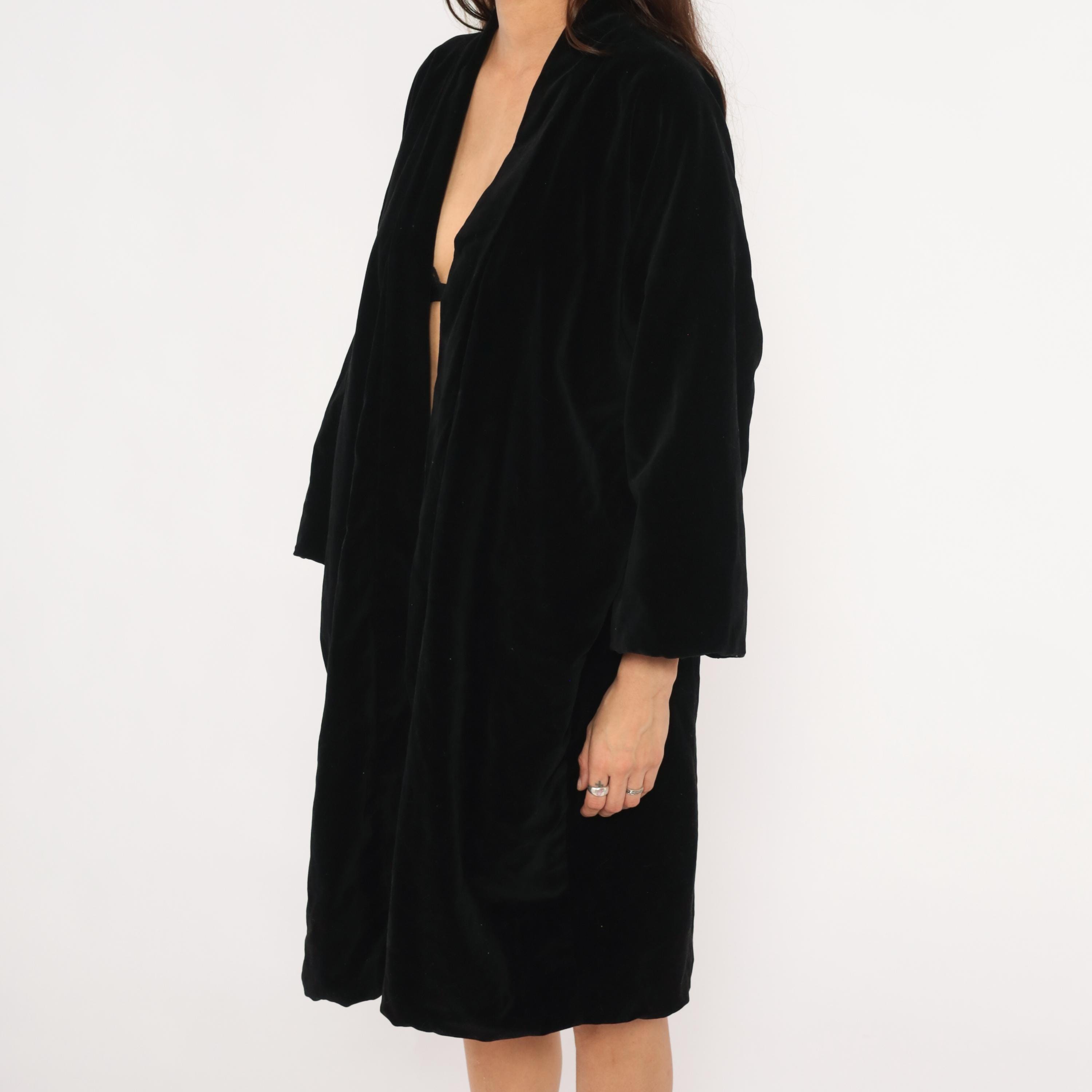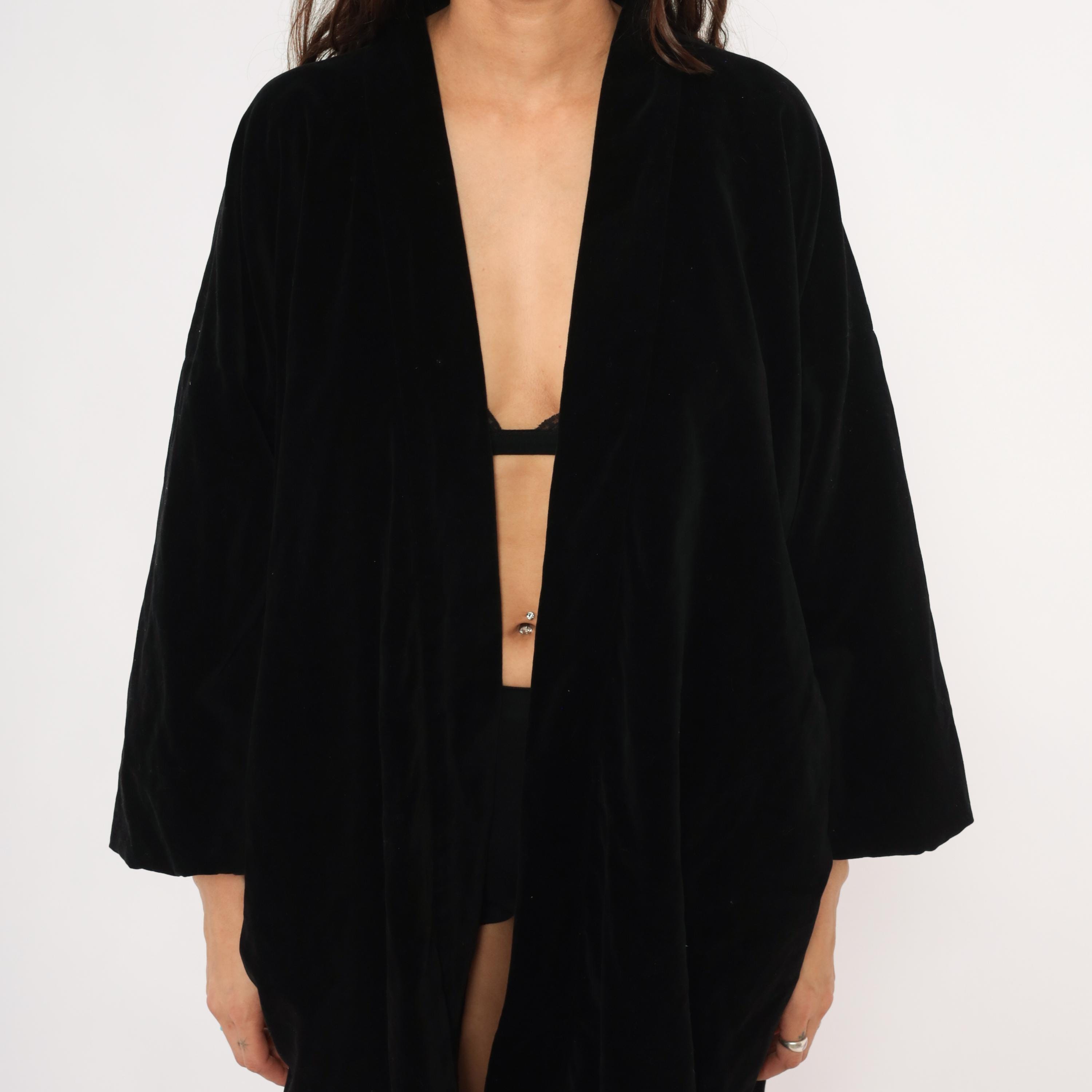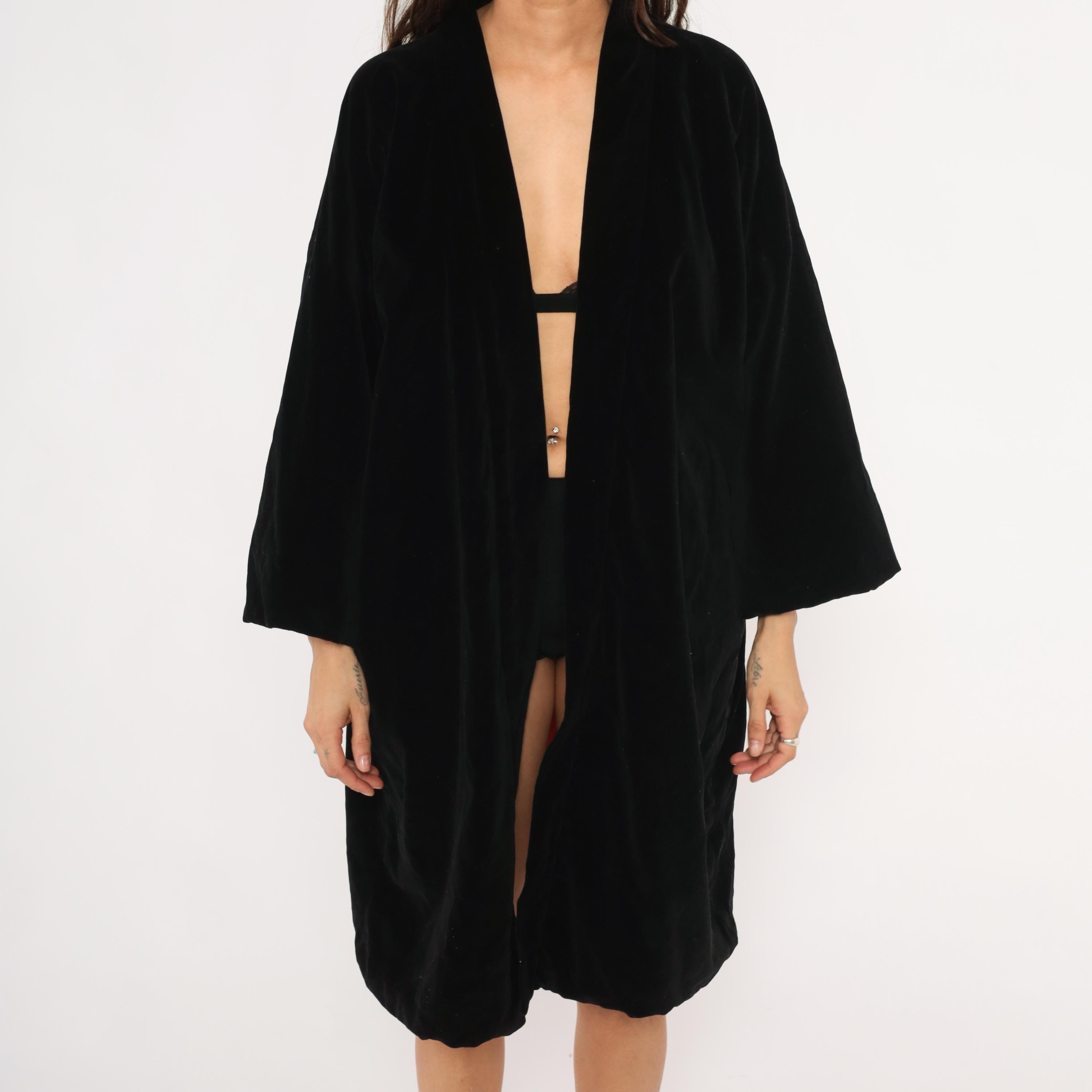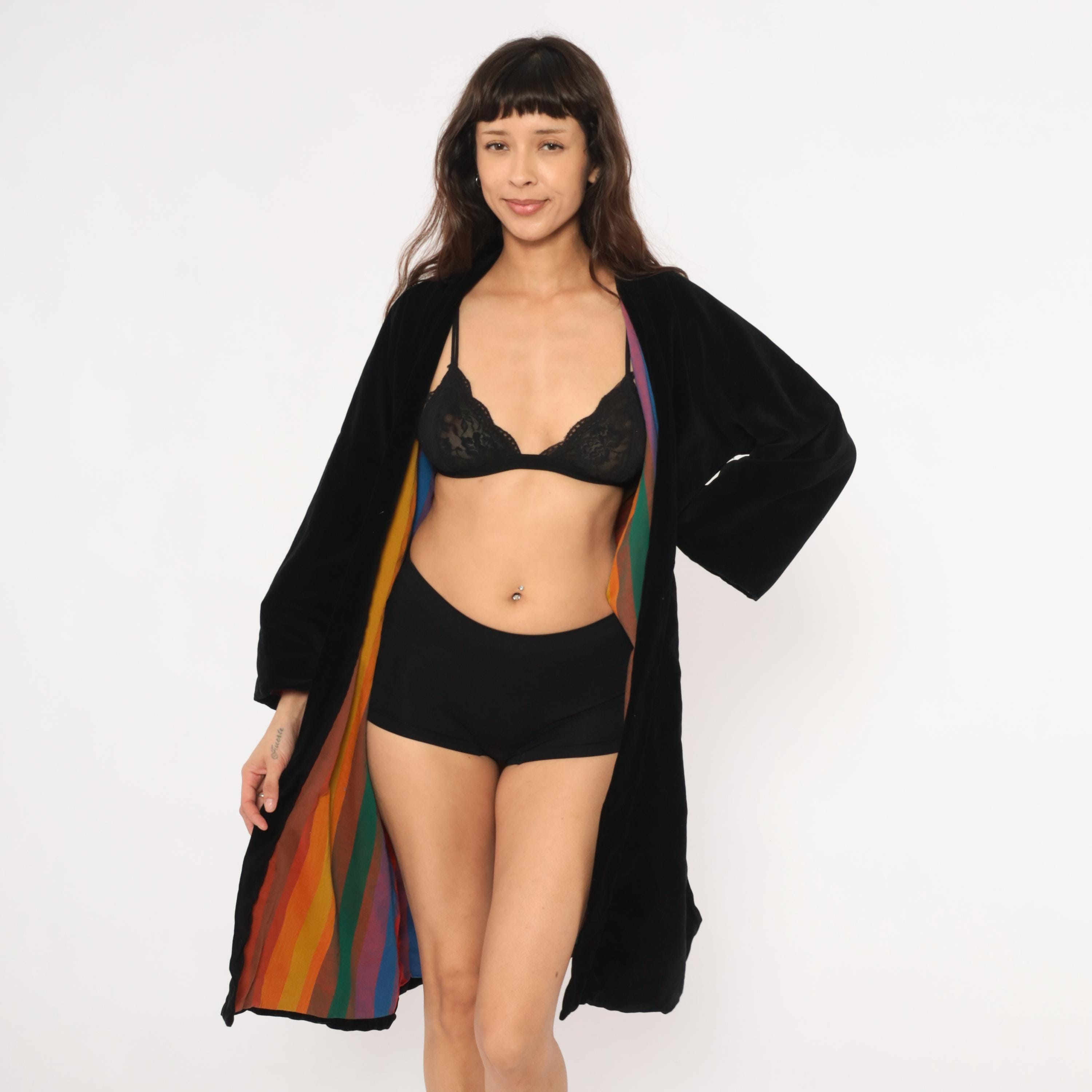 70s black velvet kimono-style robe with an open front, wide bell sleeves, and a knee-length cut. The interior is fully lined with a rainbow-striped fabric in red, orange, yellow, green, blue, and purple vertical stripes.