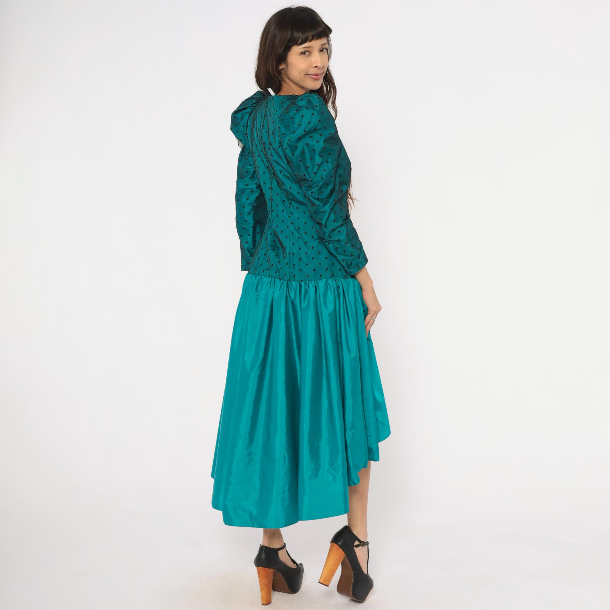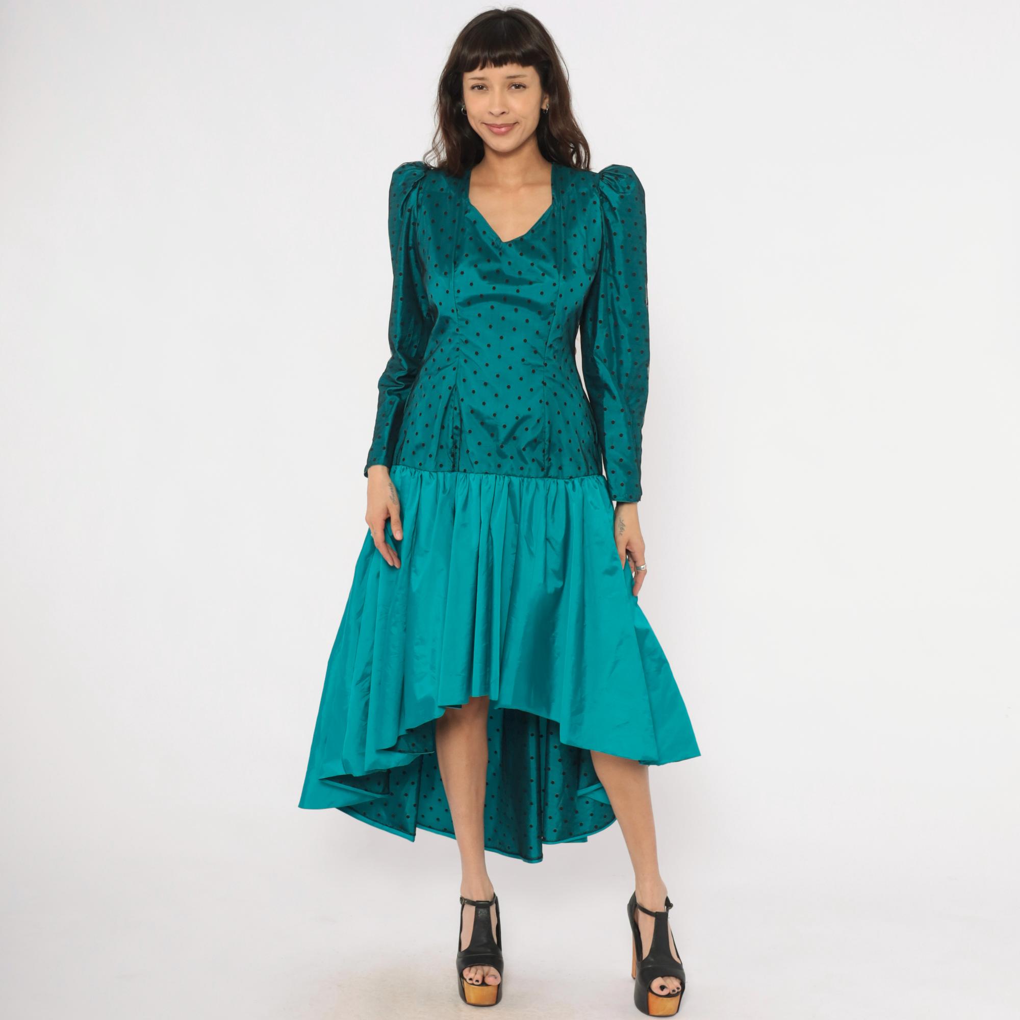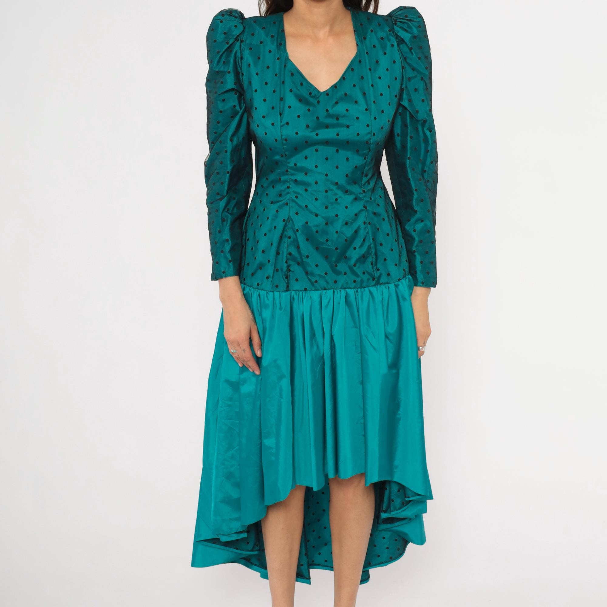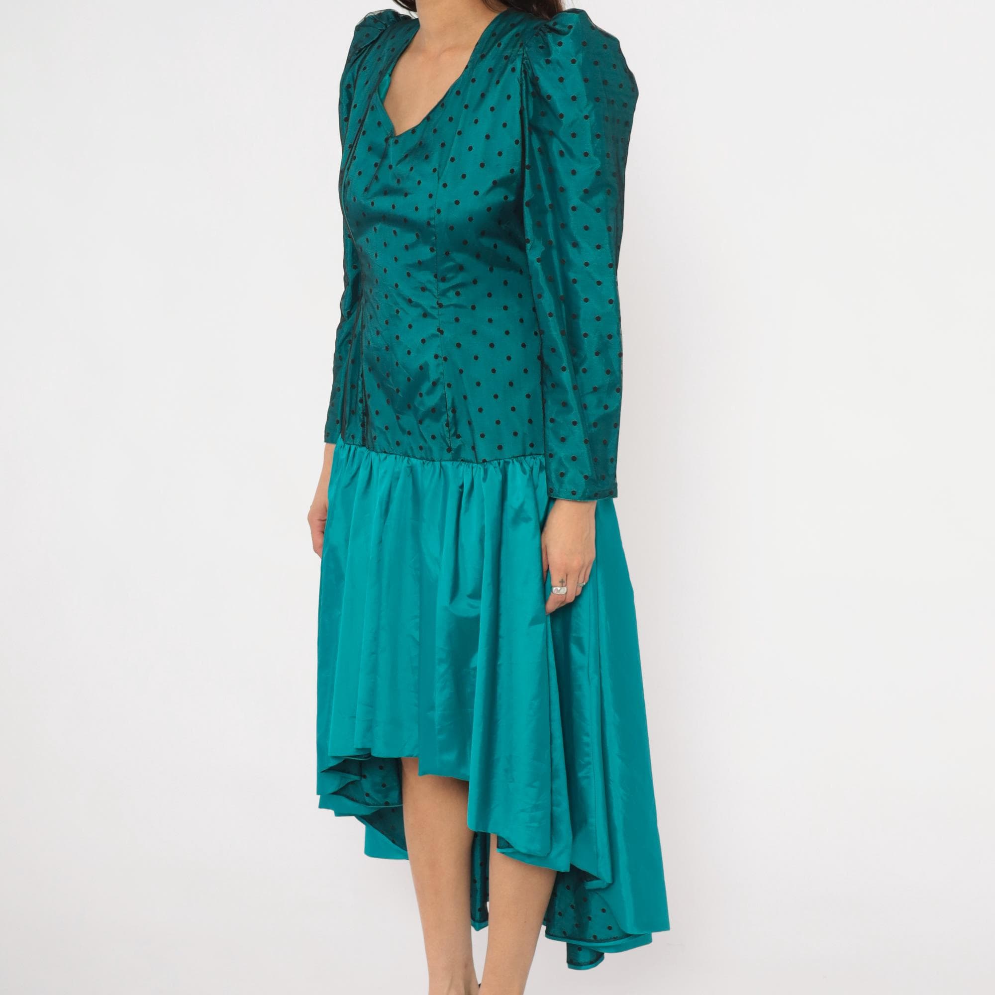 80s teal polka dot gown from Milt Russell Original with a fitted, V-neck bodice and pronounced puff shoulders tapering to long sleeves. The dropped waist meets a gathered, solid-color high-low skirt with a shorter front hemline and longer back sweep. Black polka dots cover the bodice and an underlayer visible beneath the skirt hem, while the outer skirt layer is plain teal.