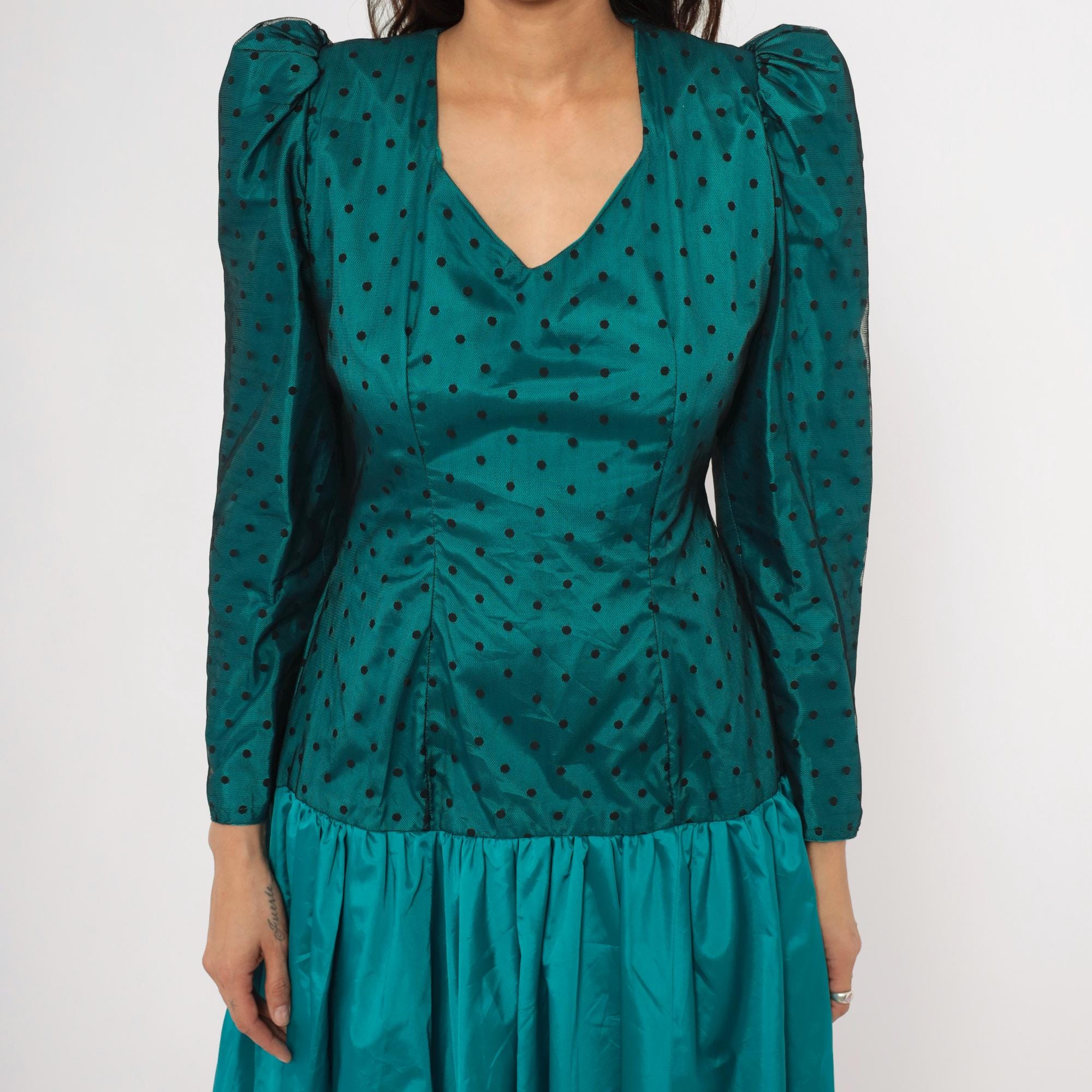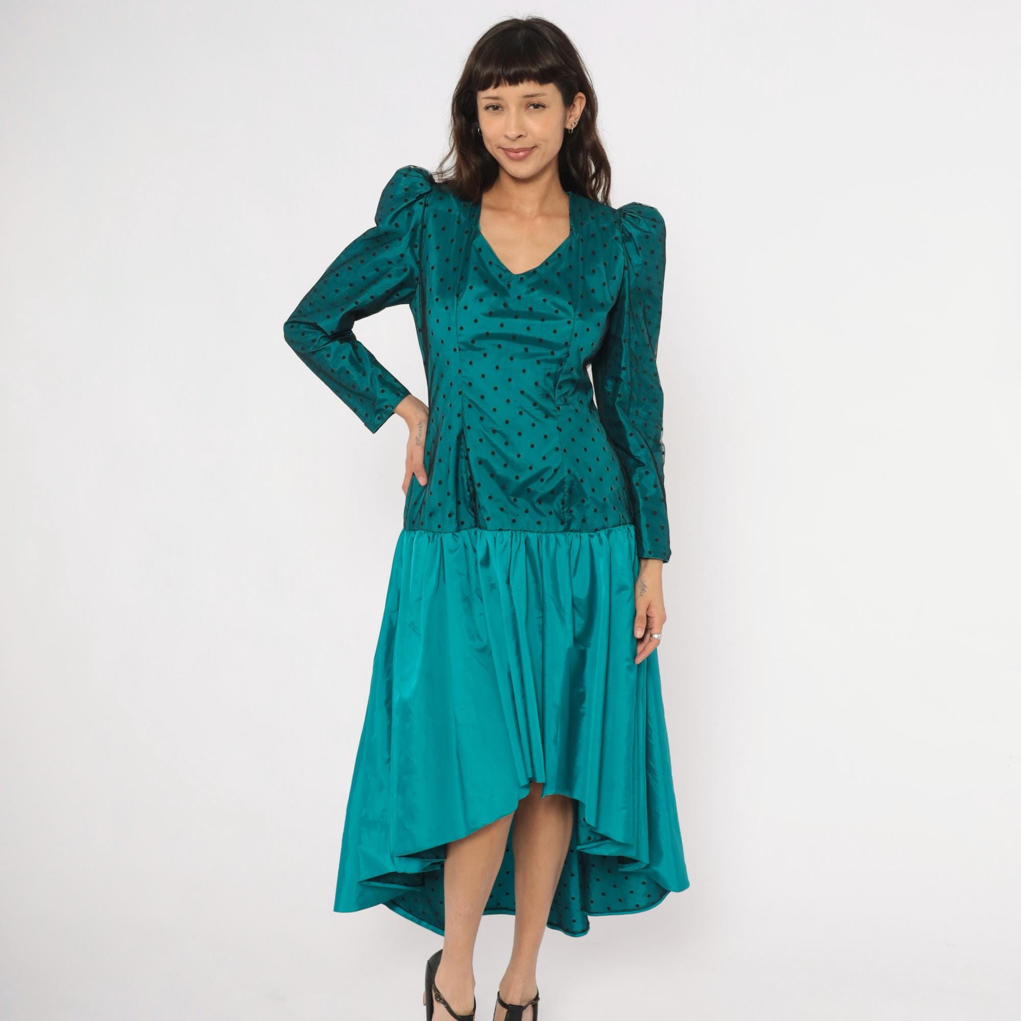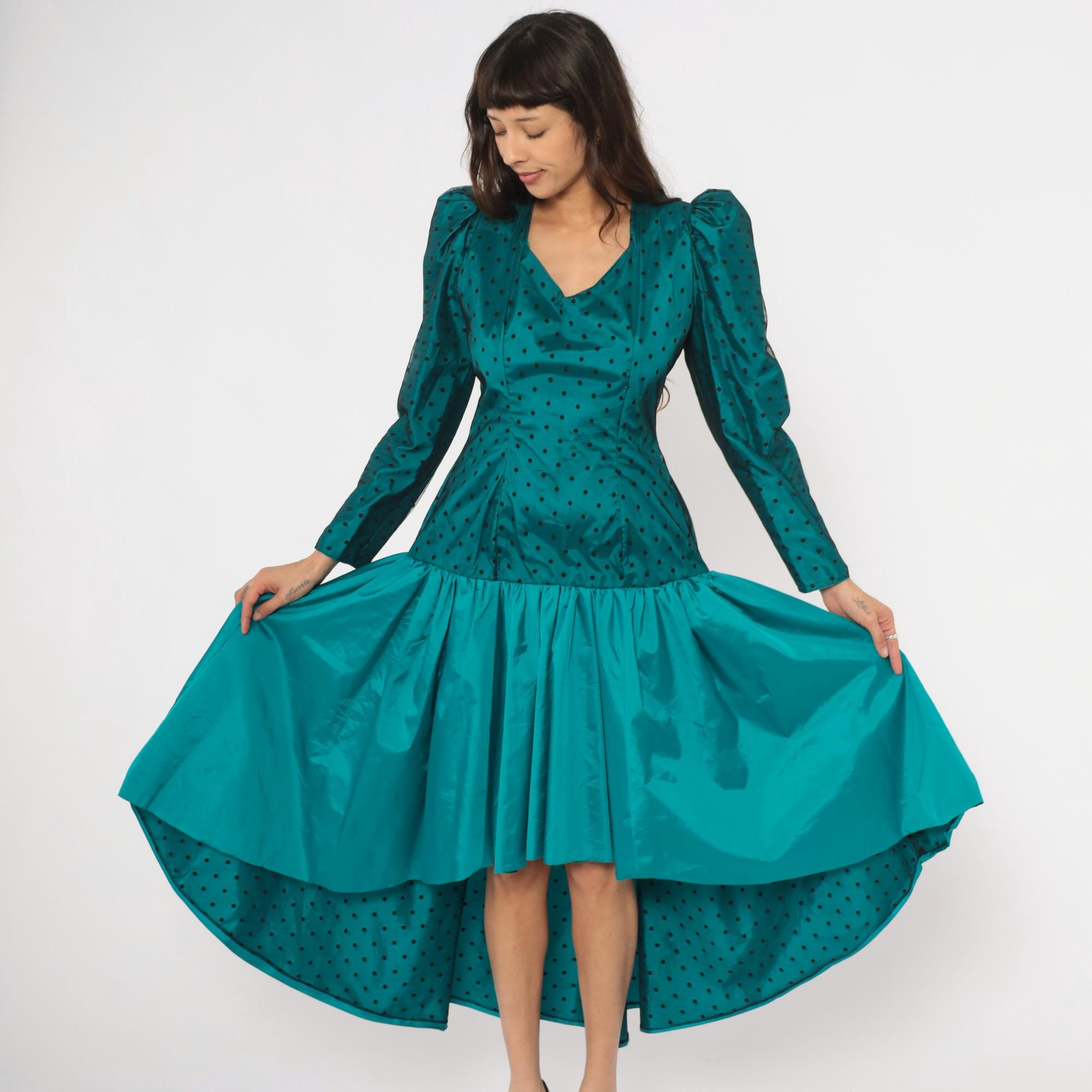 80s teal polka dot gown from Milt Russell Original with a fitted, V-neck bodice and pronounced puff shoulders tapering to long sleeves. The dropped waist meets a gathered, solid-color high-low skirt with a shorter front hemline and longer back sweep. Black polka dots cover the bodice and an underlayer visible beneath the skirt hem, while the outer skirt layer is plain teal.