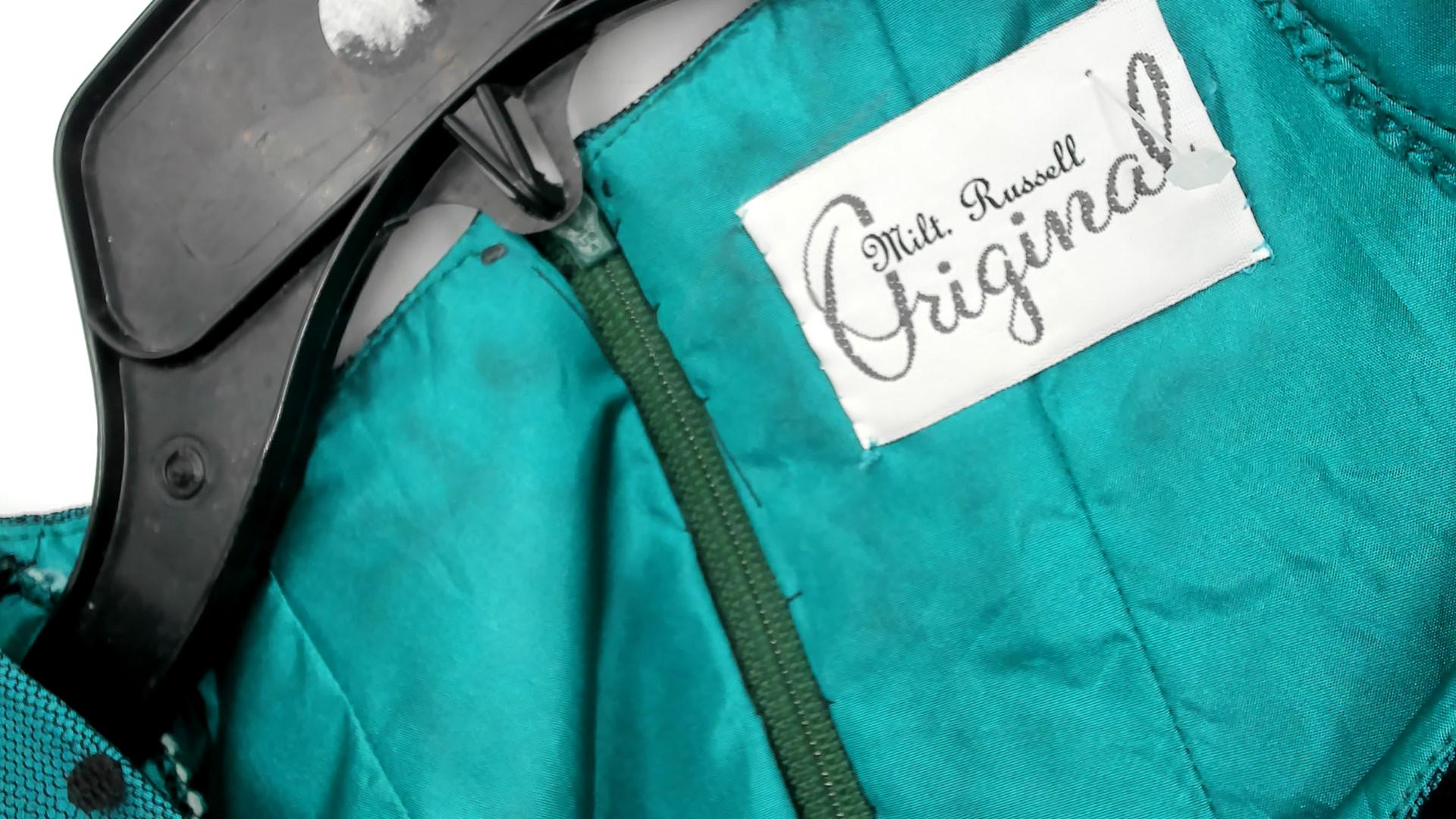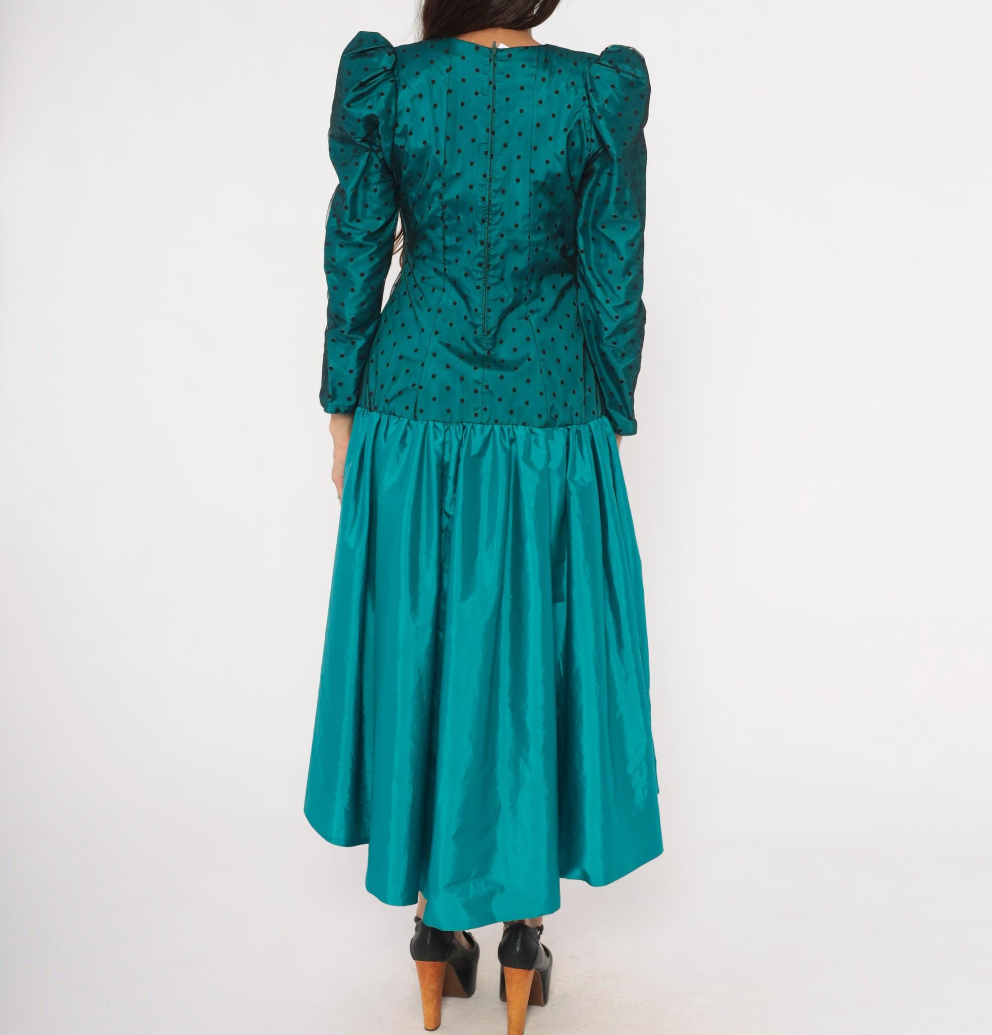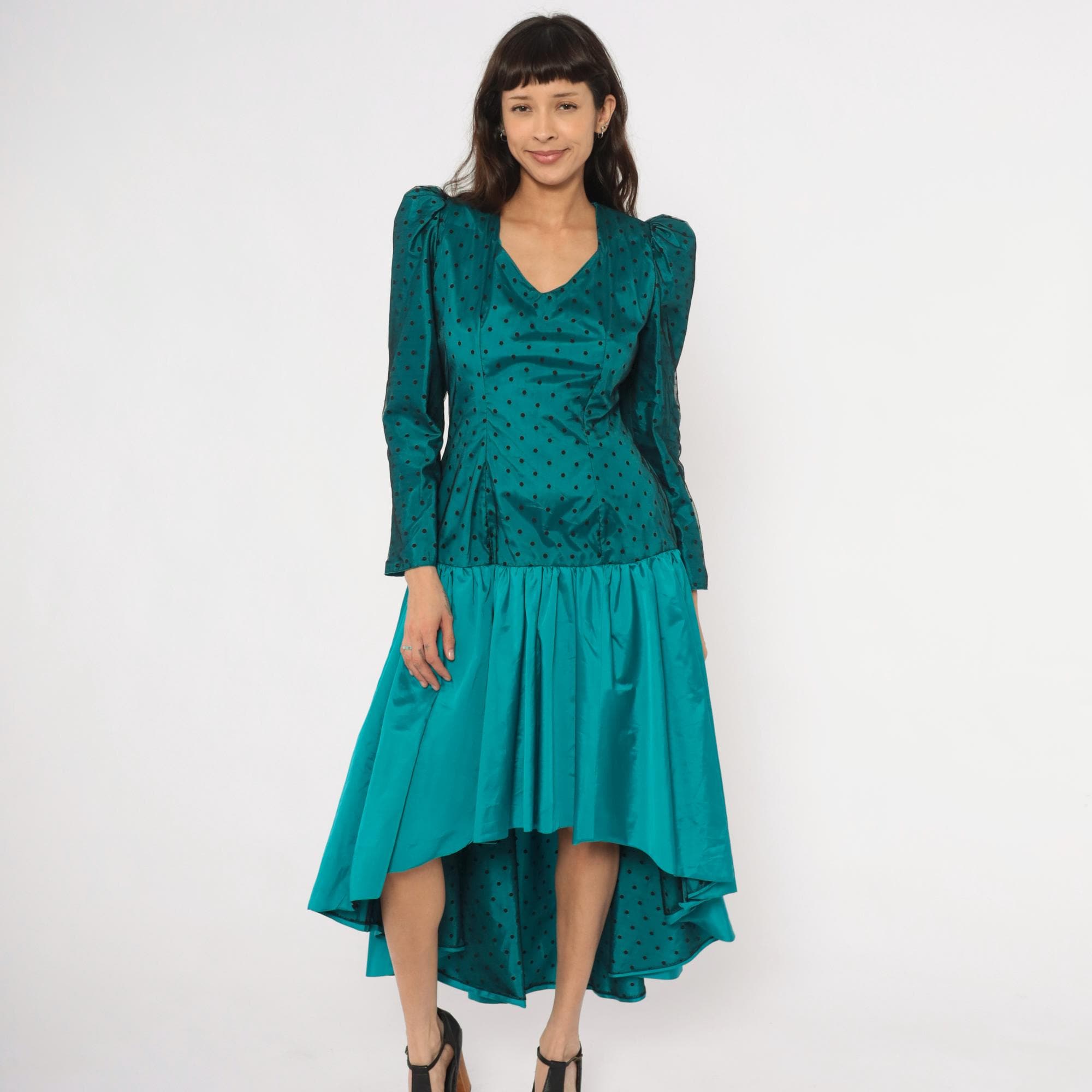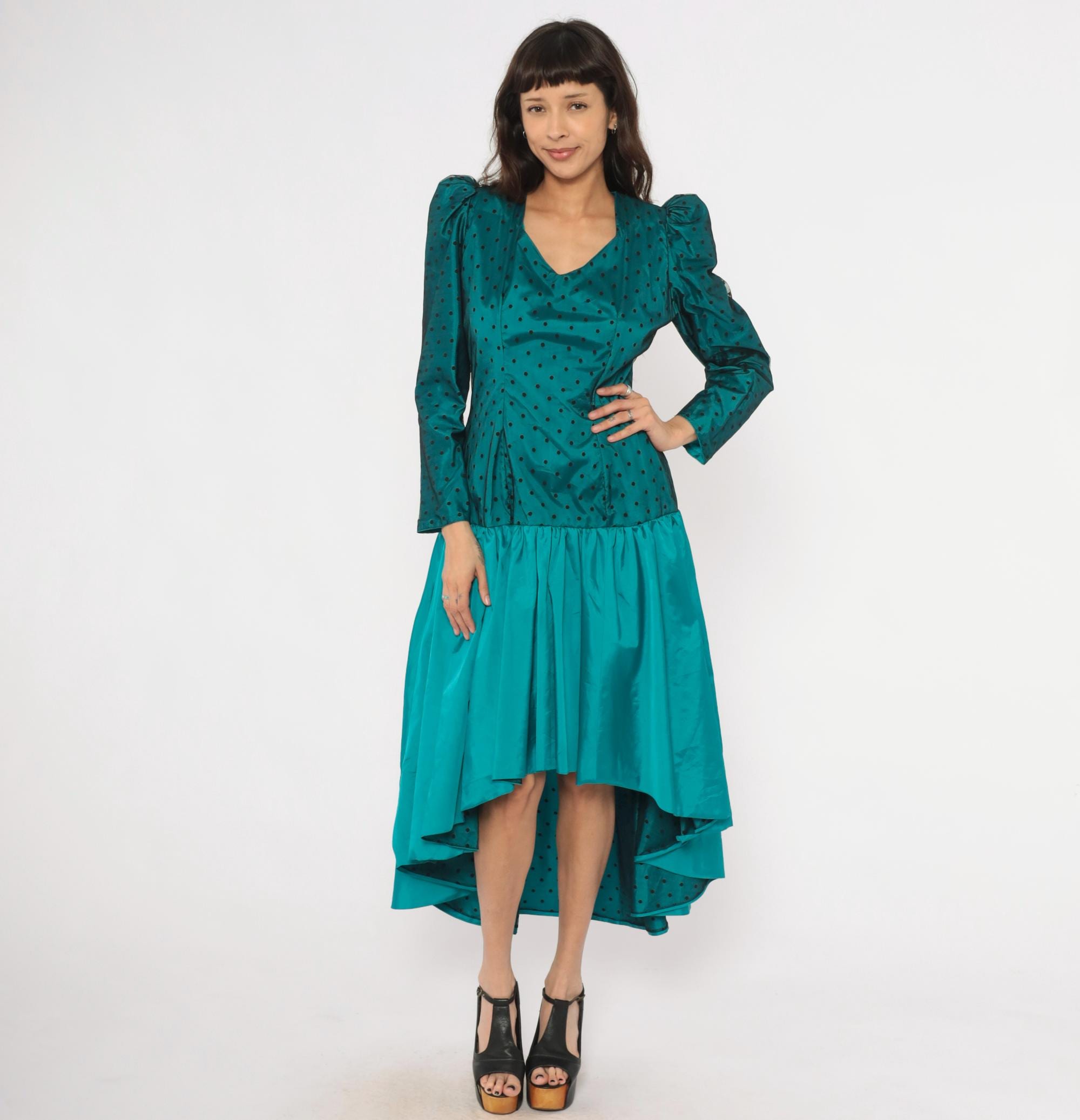 80s teal polka dot gown from Milt Russell Original with a fitted, V-neck bodice and pronounced puff shoulders tapering to long sleeves. The dropped waist meets a gathered, solid-color high-low skirt with a shorter front hemline and longer back sweep. Black polka dots cover the bodice and an underlayer visible beneath the skirt hem, while the outer skirt layer is plain teal.