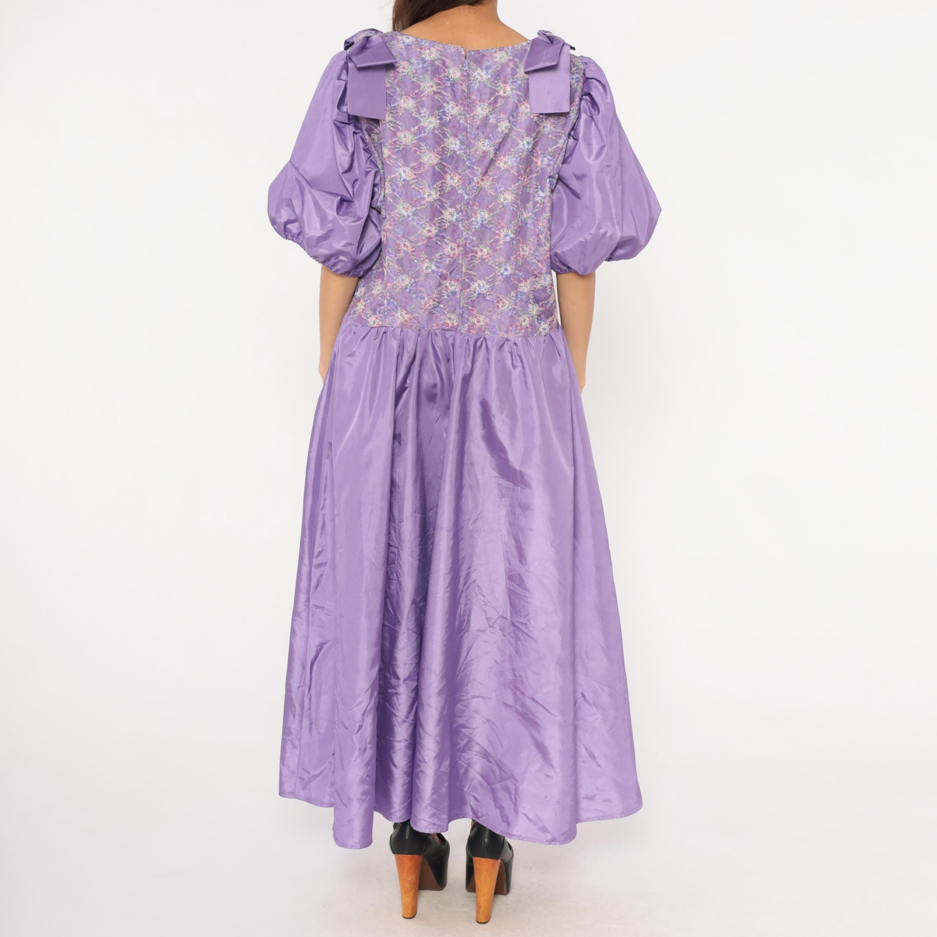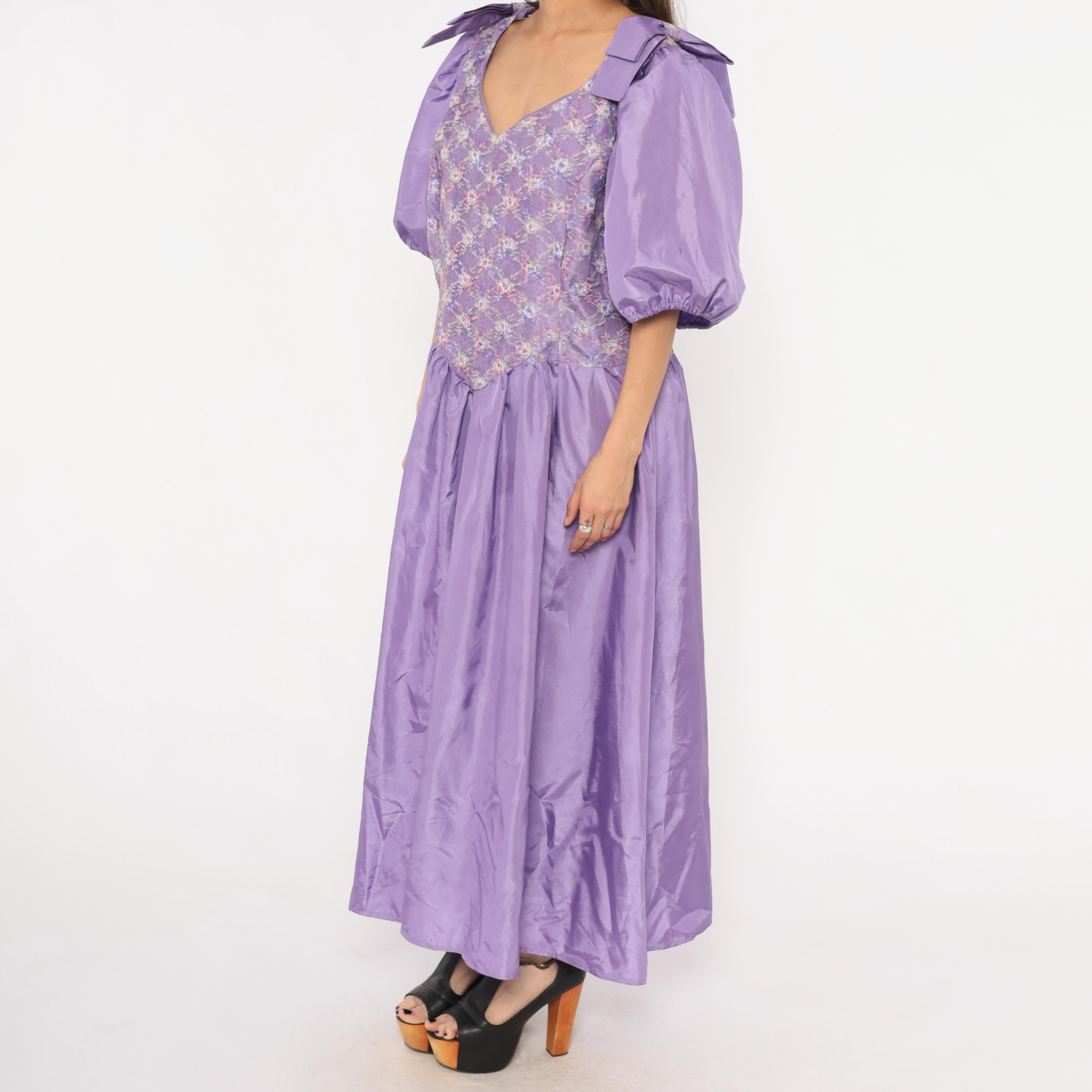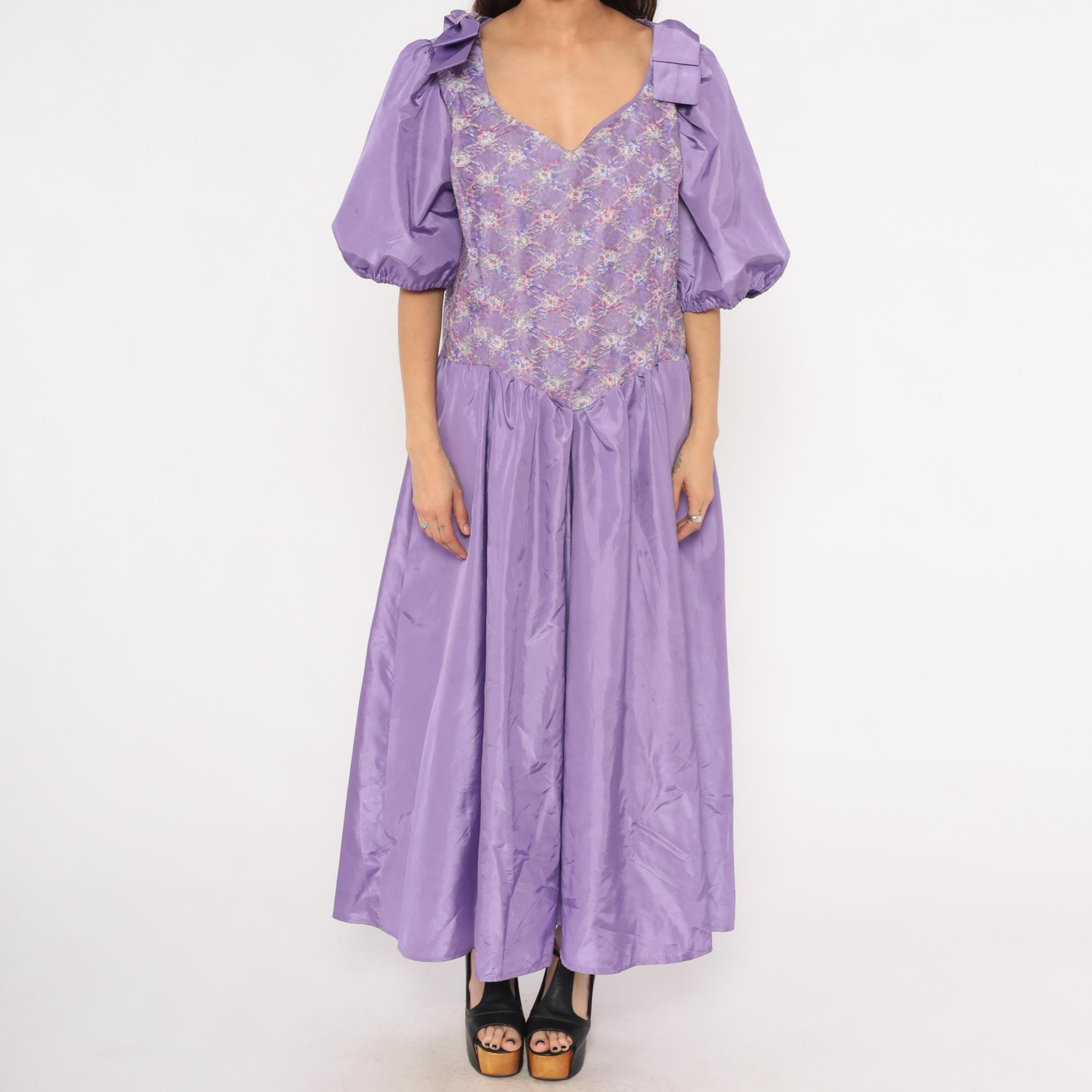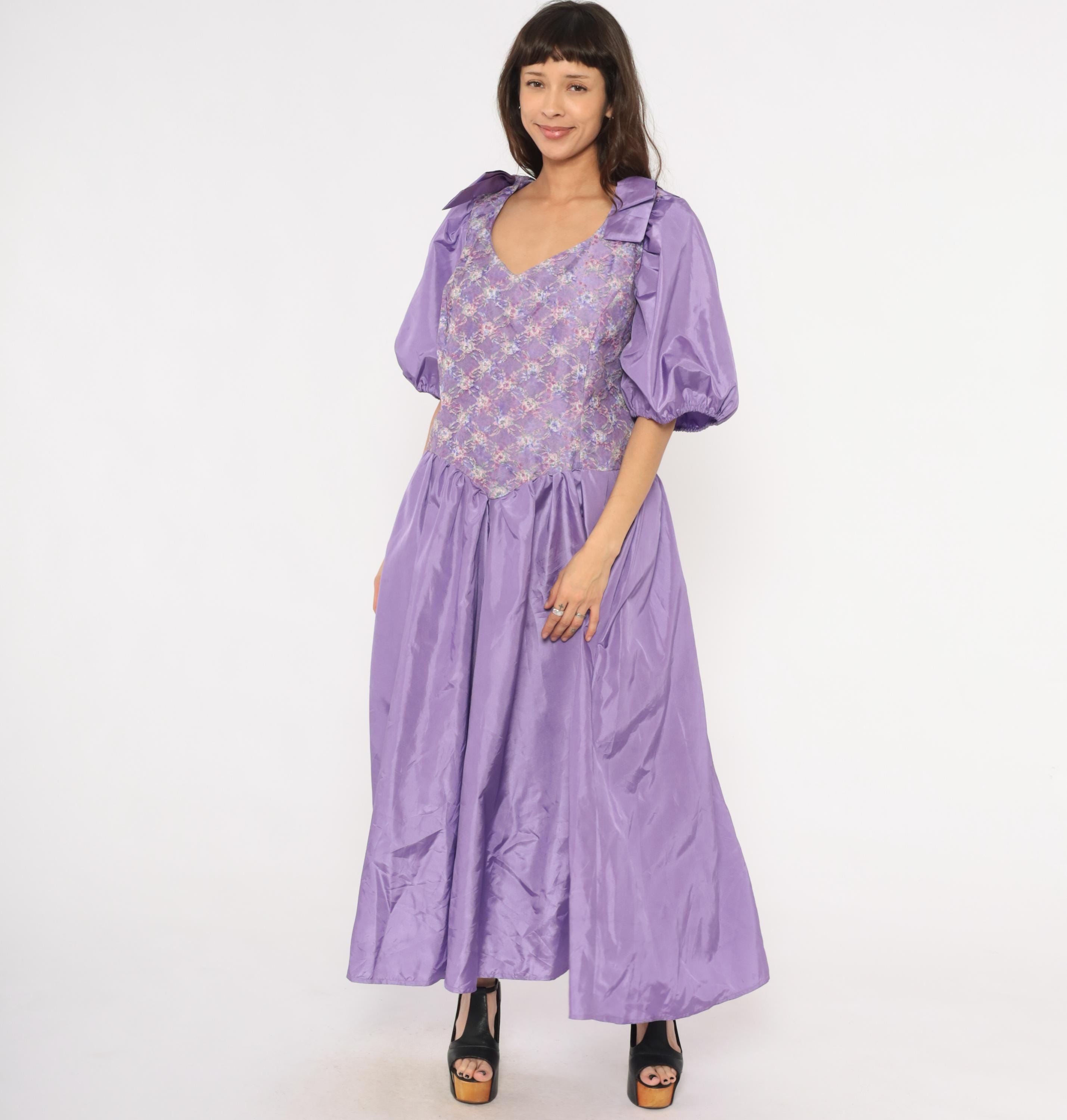80s lavender gown with a floral lace bodice in a diamond lattice pattern of pink, blue, and cream over a purple ground, paired with a gathered full-length taffeta skirt. V-neckline at front and back, voluminous balloon sleeves with elasticized cuffs, and decorative bow details at both shoulders.