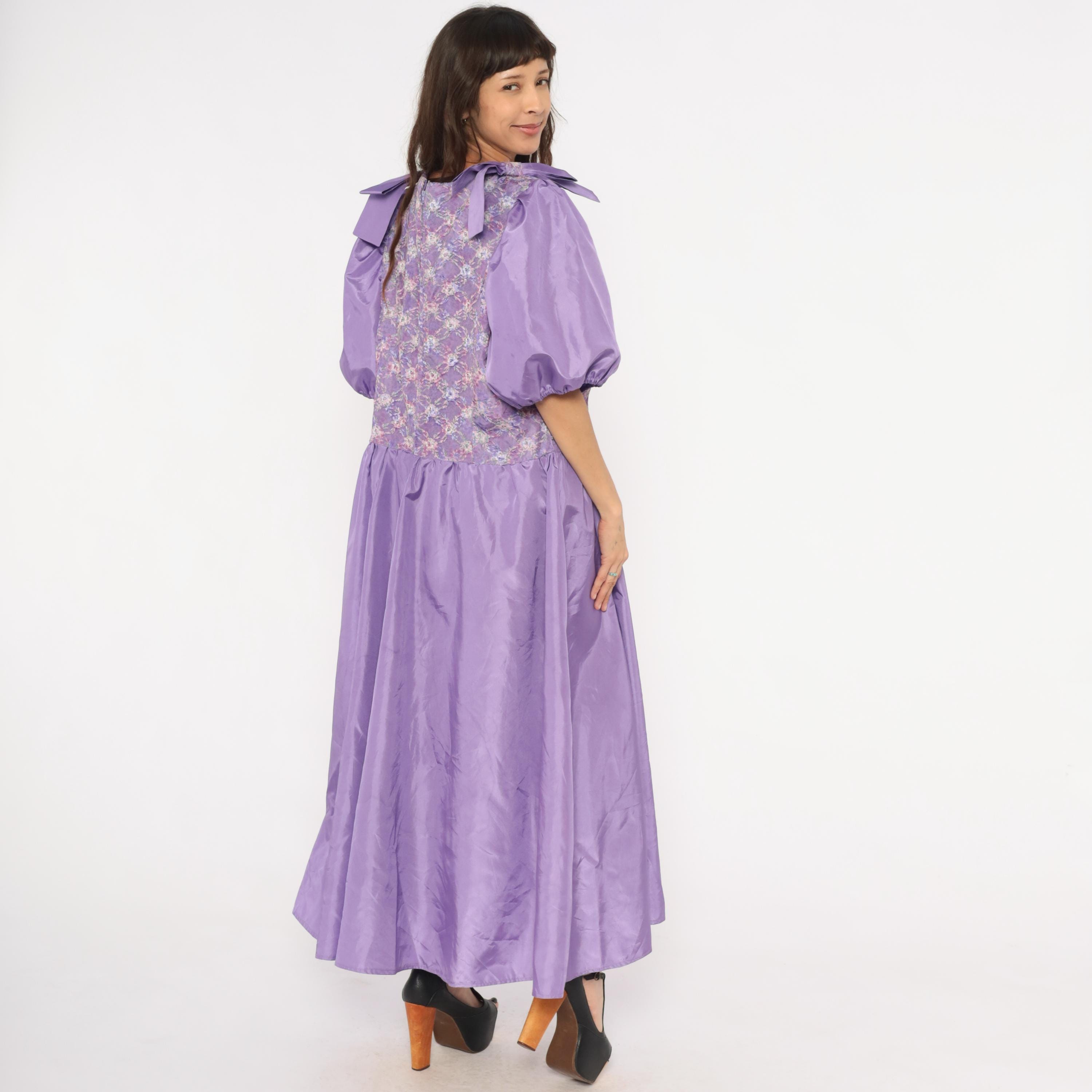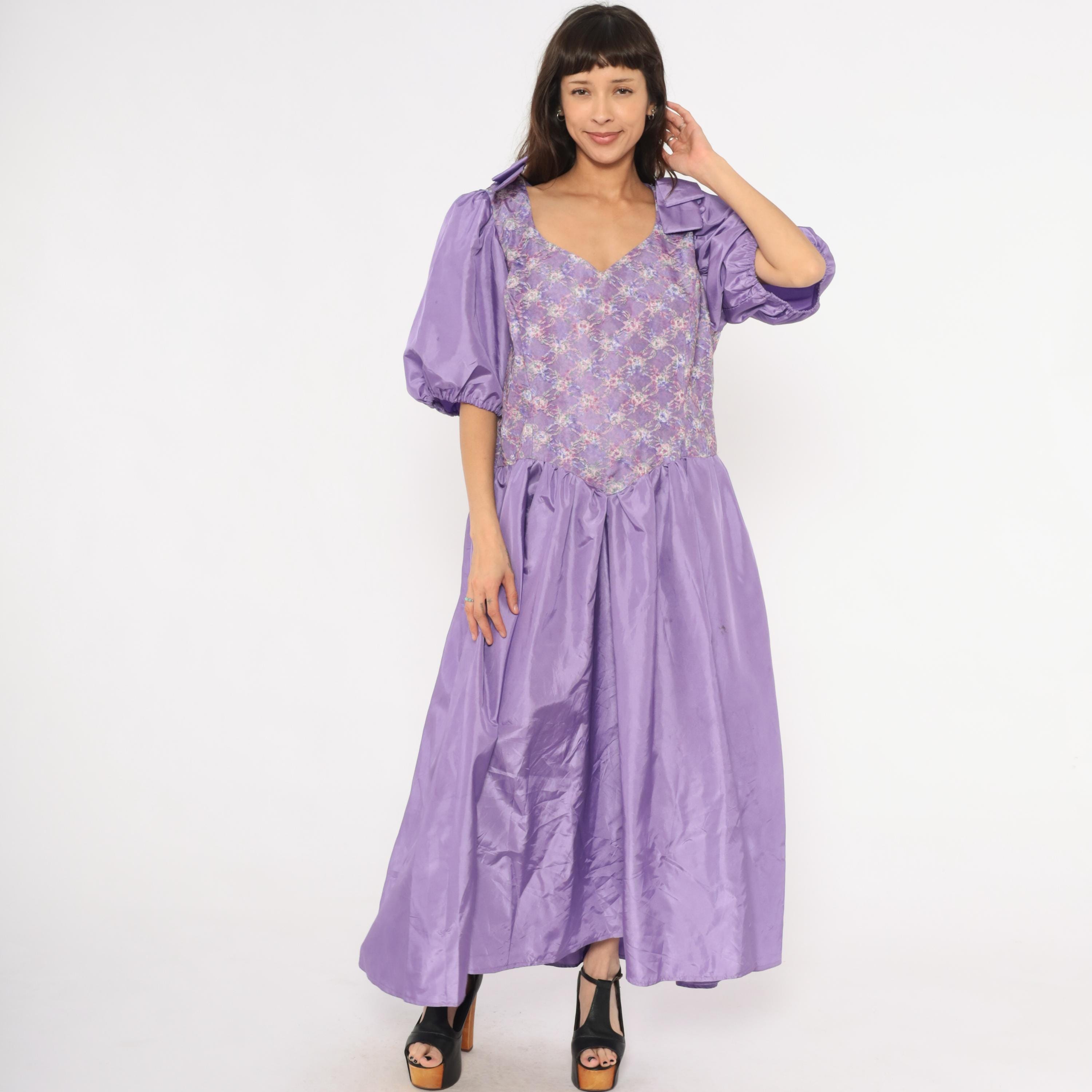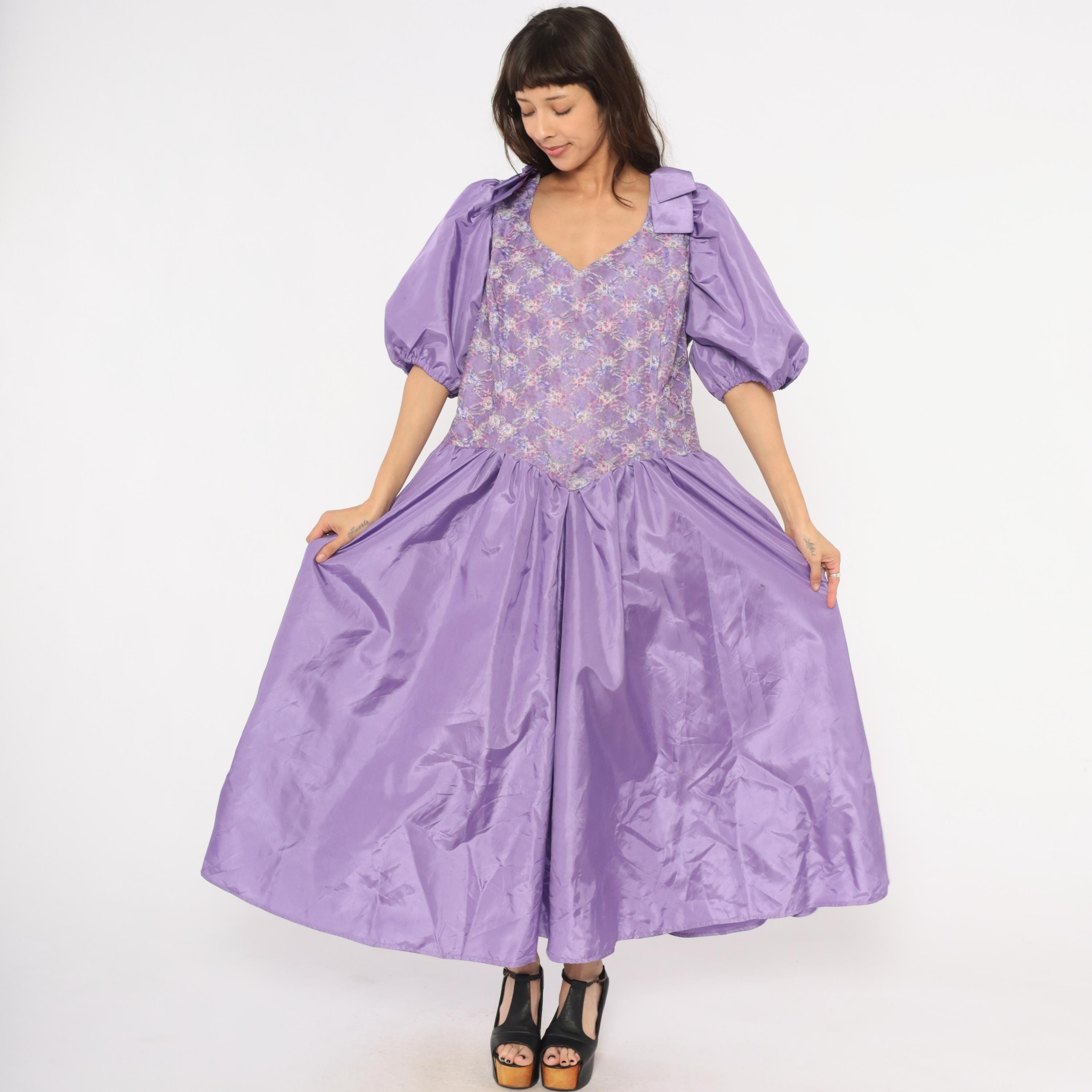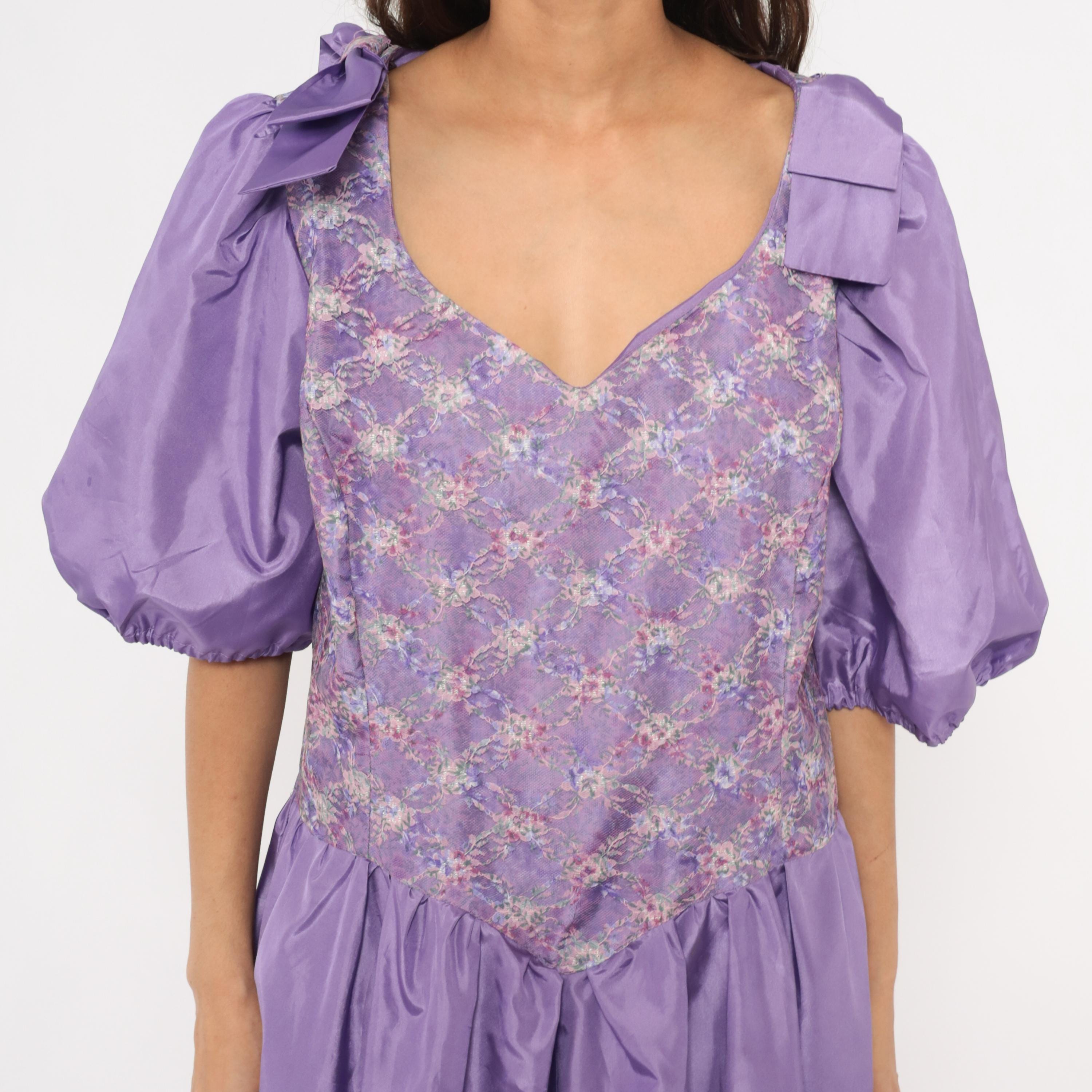 80s lavender gown with a floral lace bodice in a diamond lattice pattern of pink, blue, and cream over a purple ground, paired with a gathered full-length taffeta skirt. V-neckline at front and back, voluminous balloon sleeves with elasticized cuffs, and decorative bow details at both shoulders.