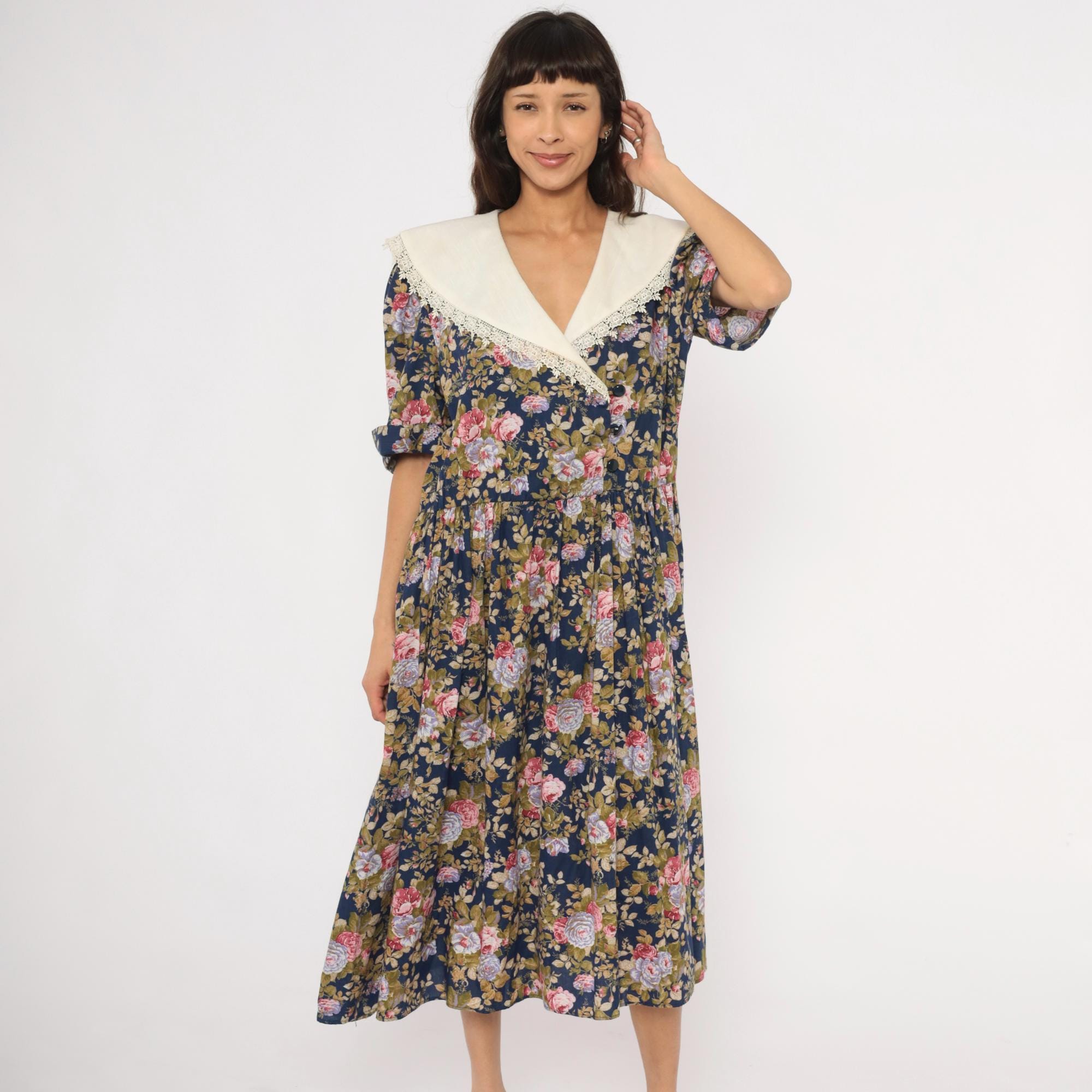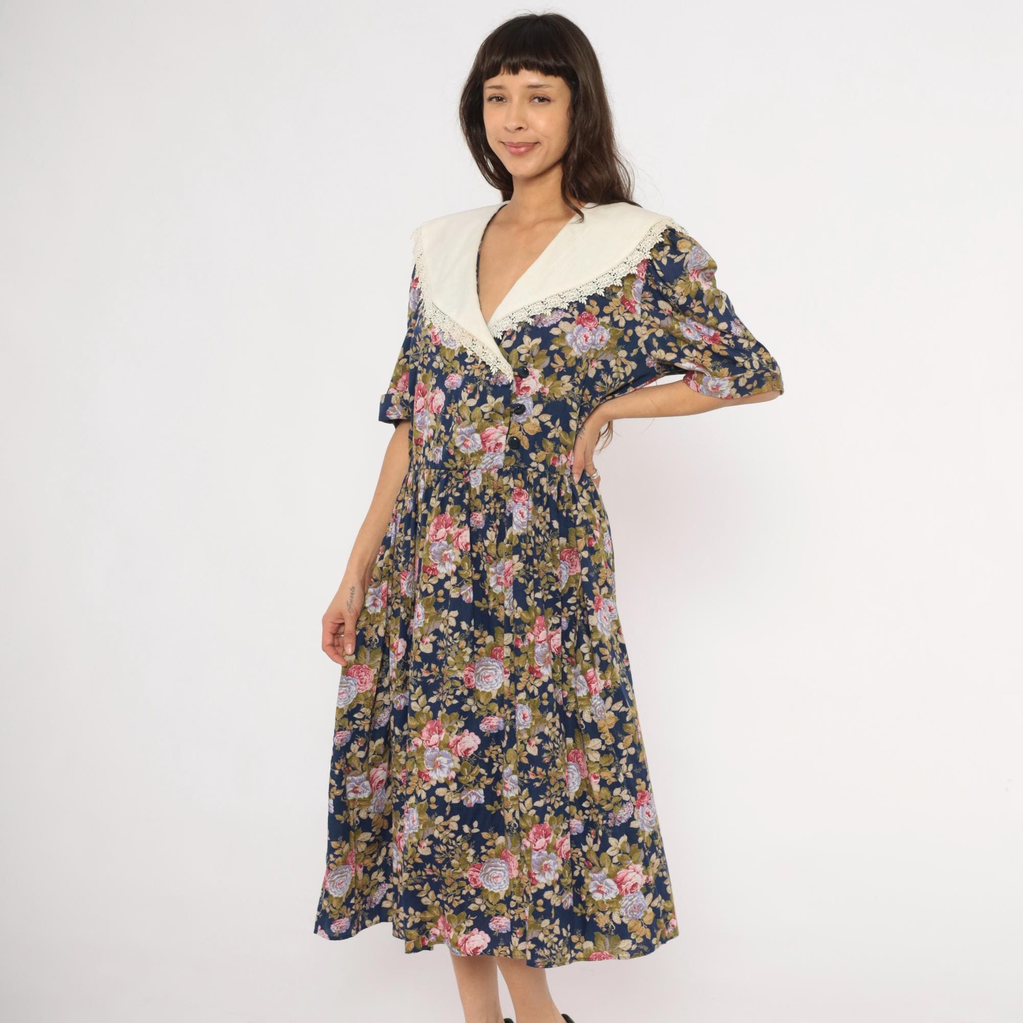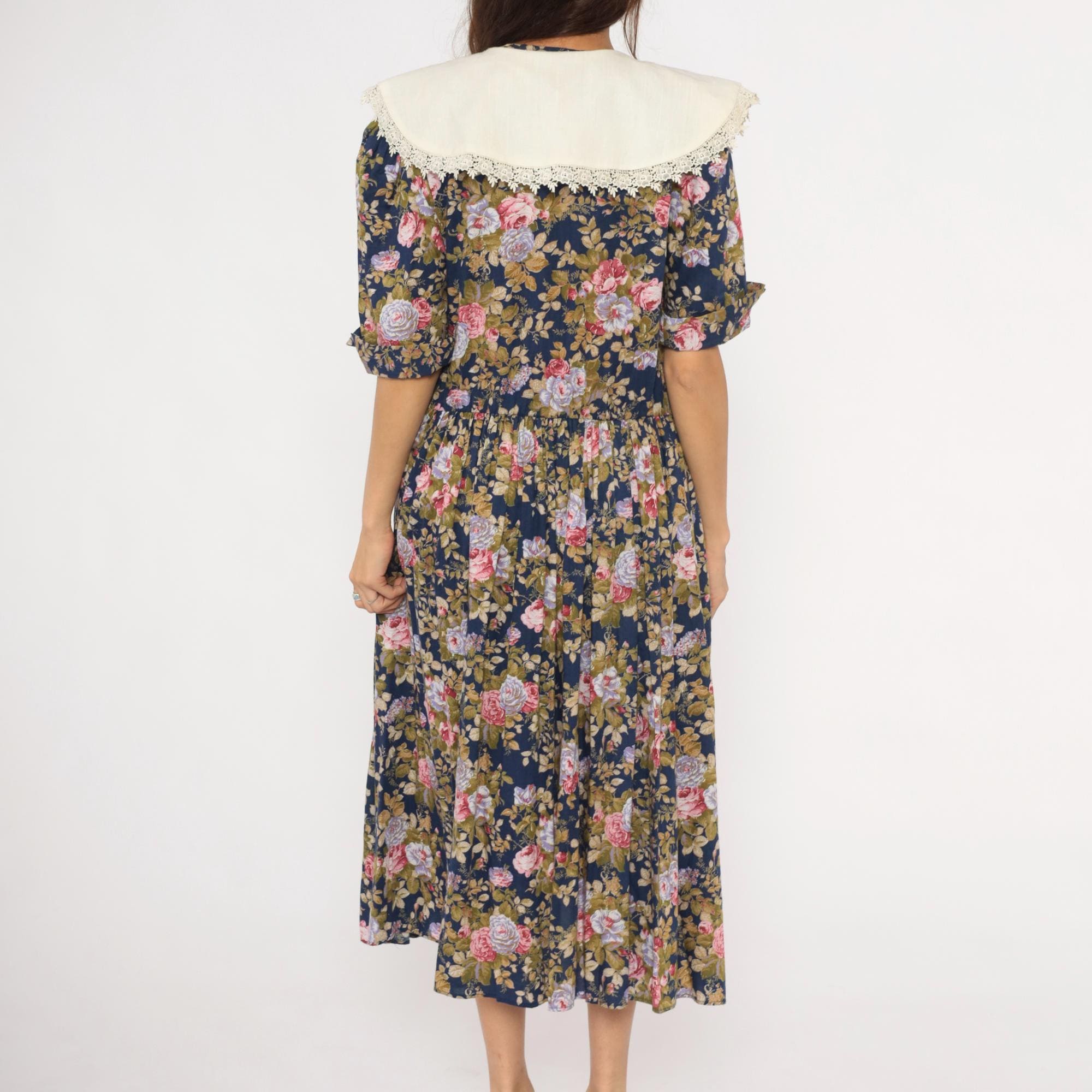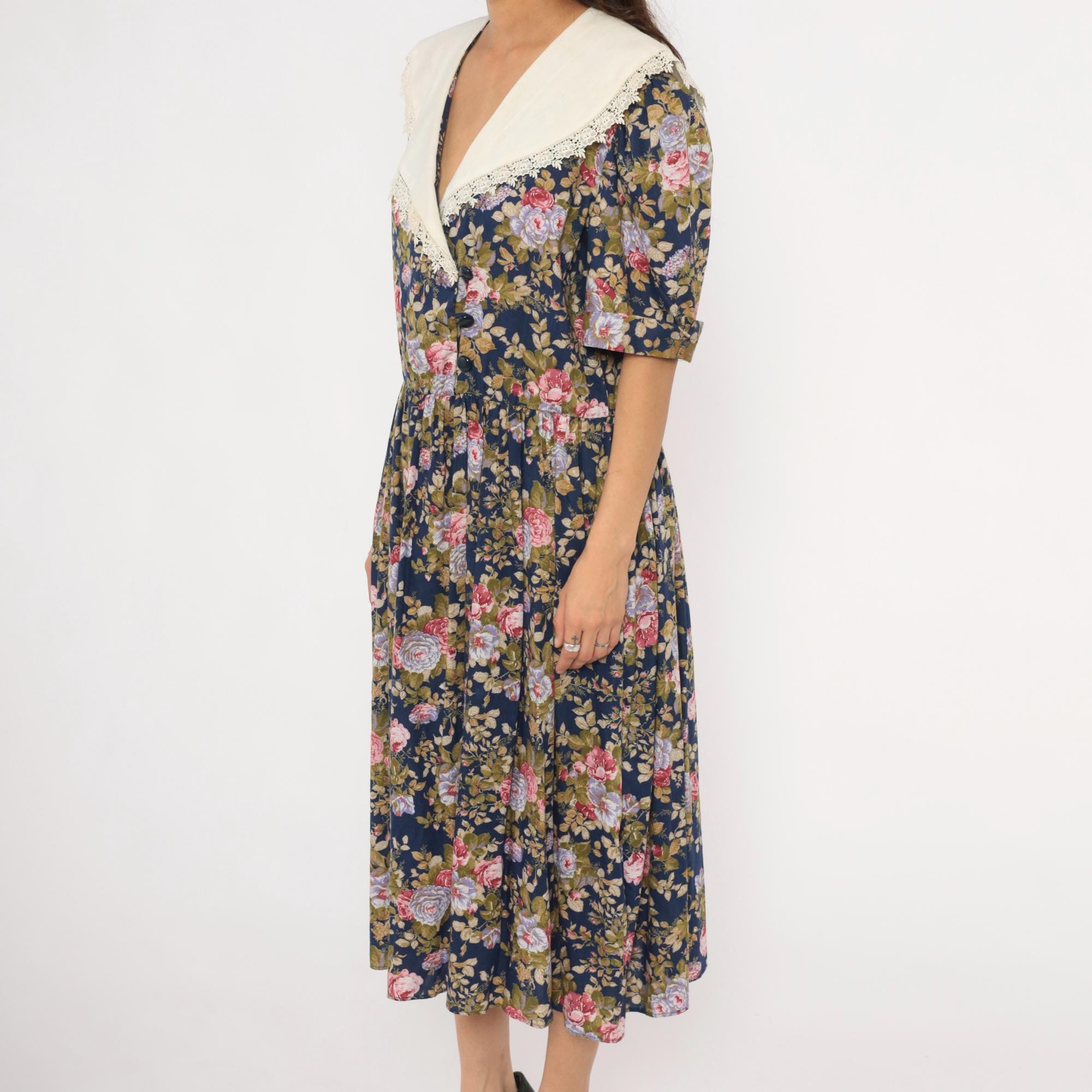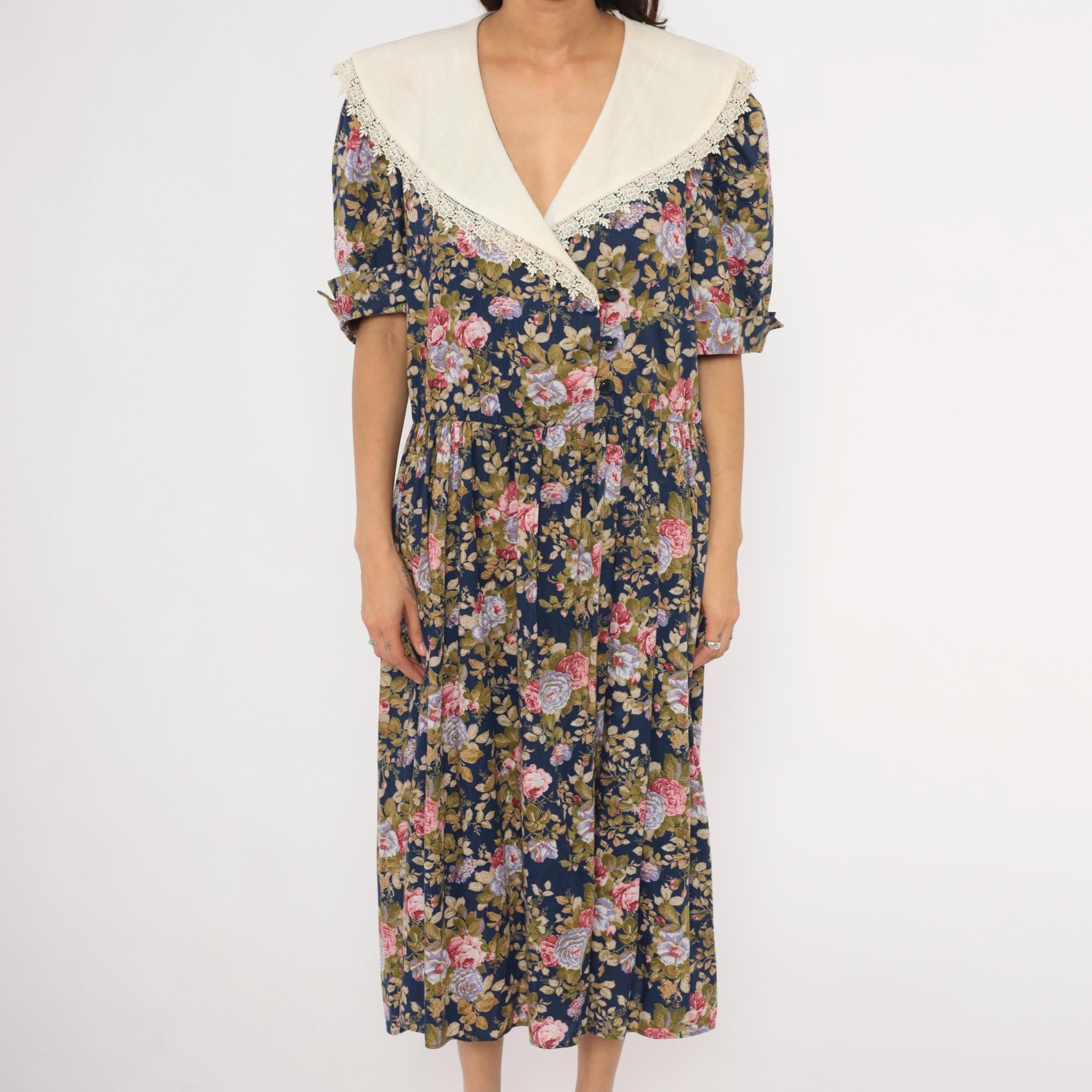 80s navy floral midi dress from Tina Barri with pink, lavender, and olive rose print across the entire garment. Wide cream-colored V-neckline collar with lace trim edging that extends across the back. Button front closure down the bodice, gathered waist, and short sleeves with turned cuffs.