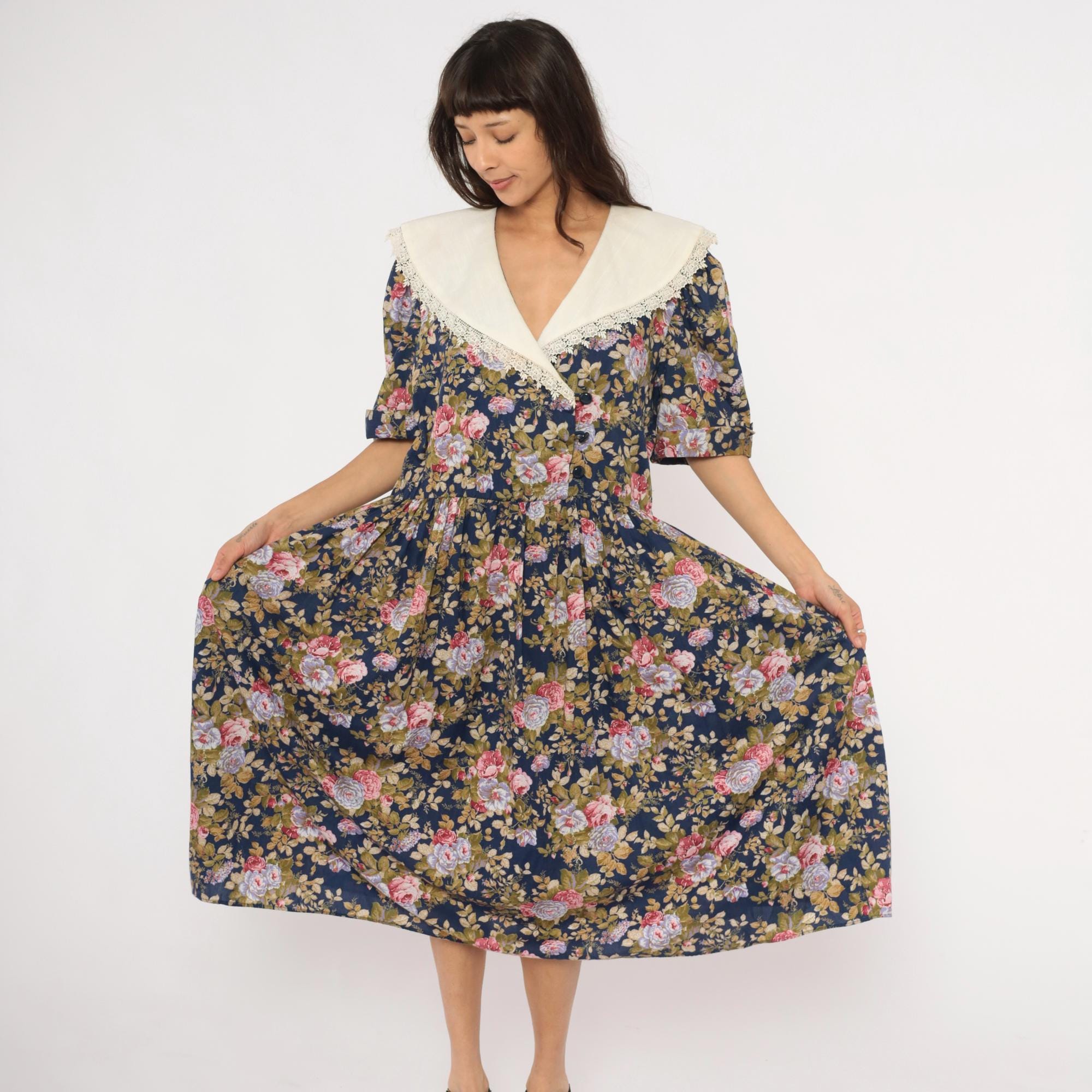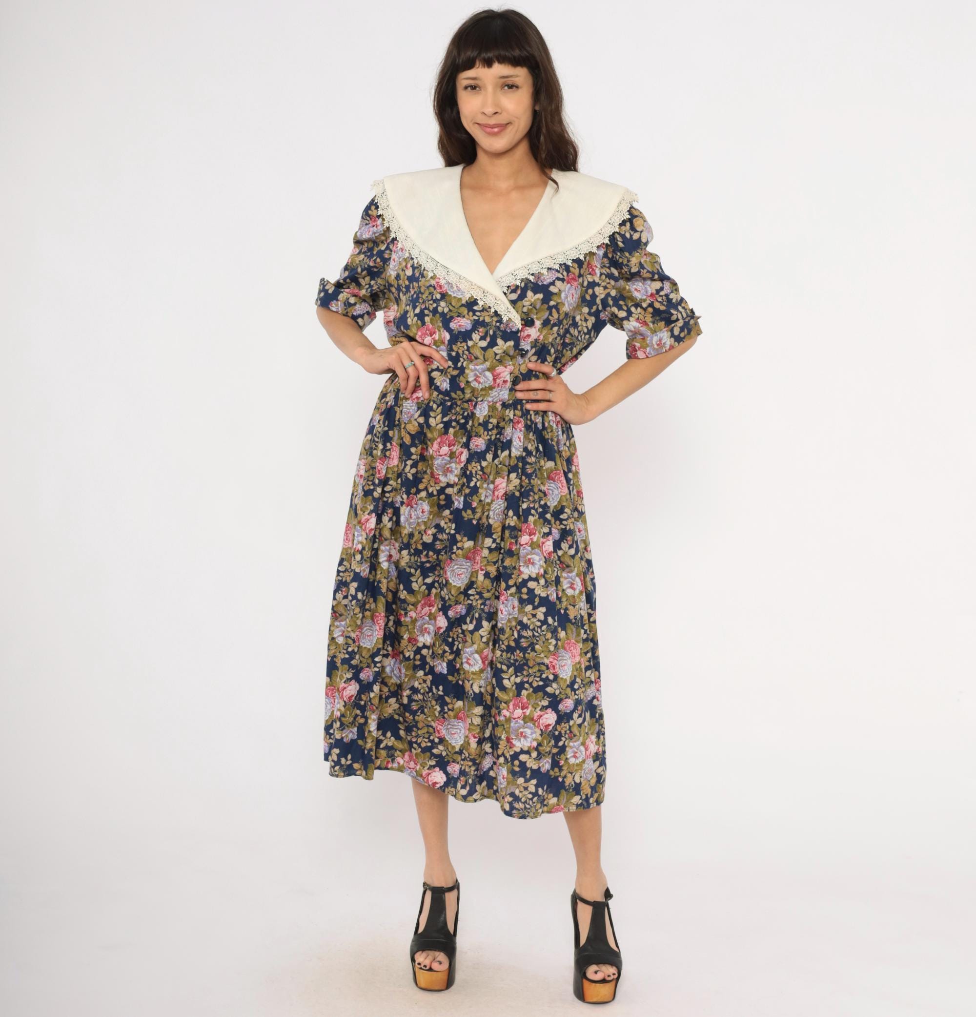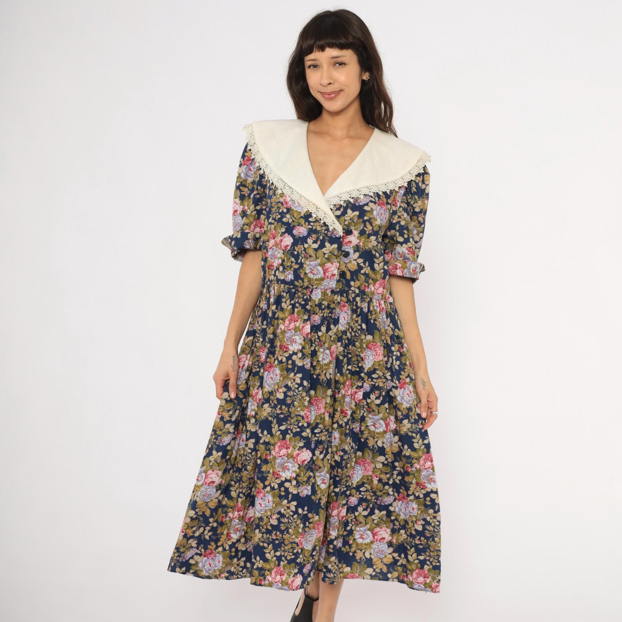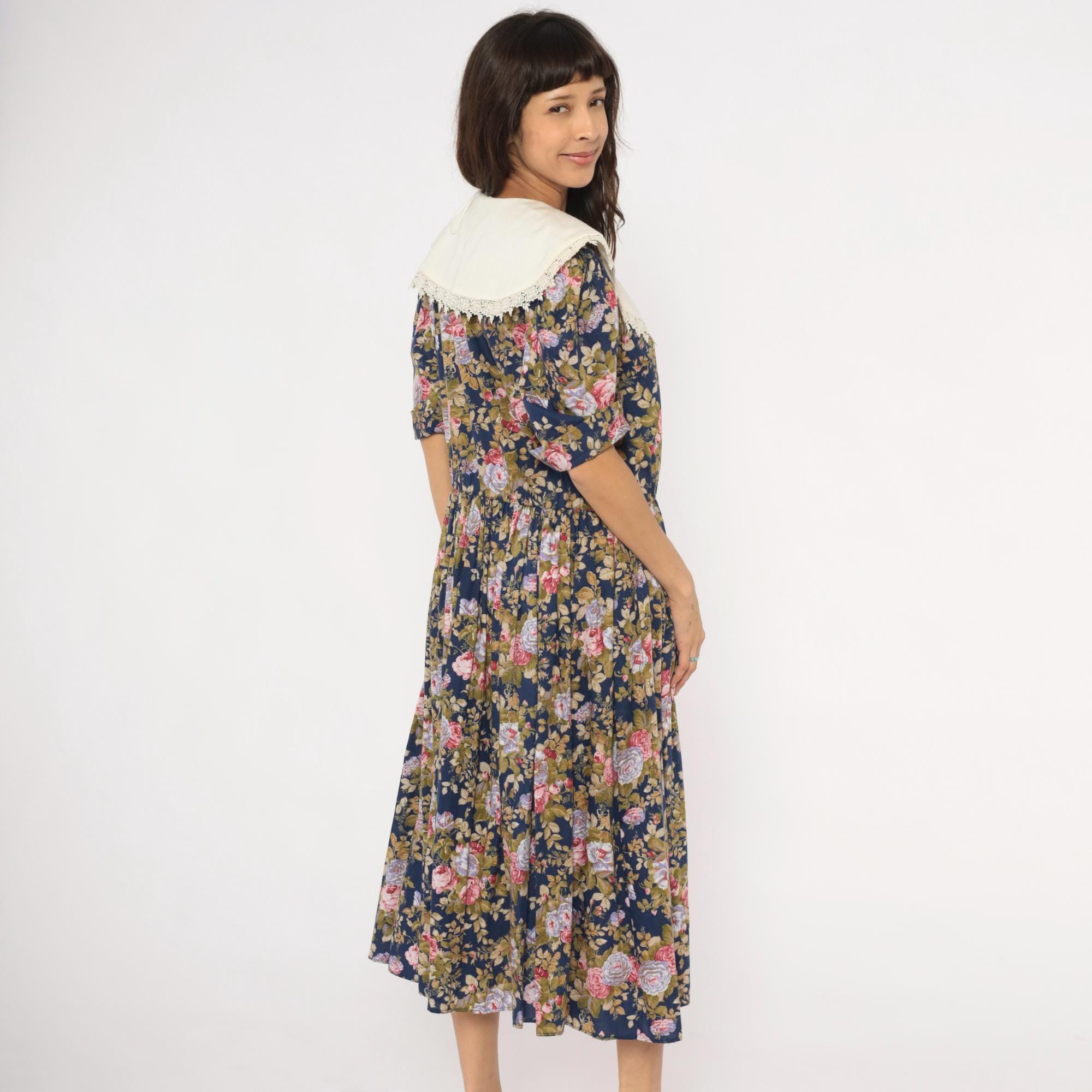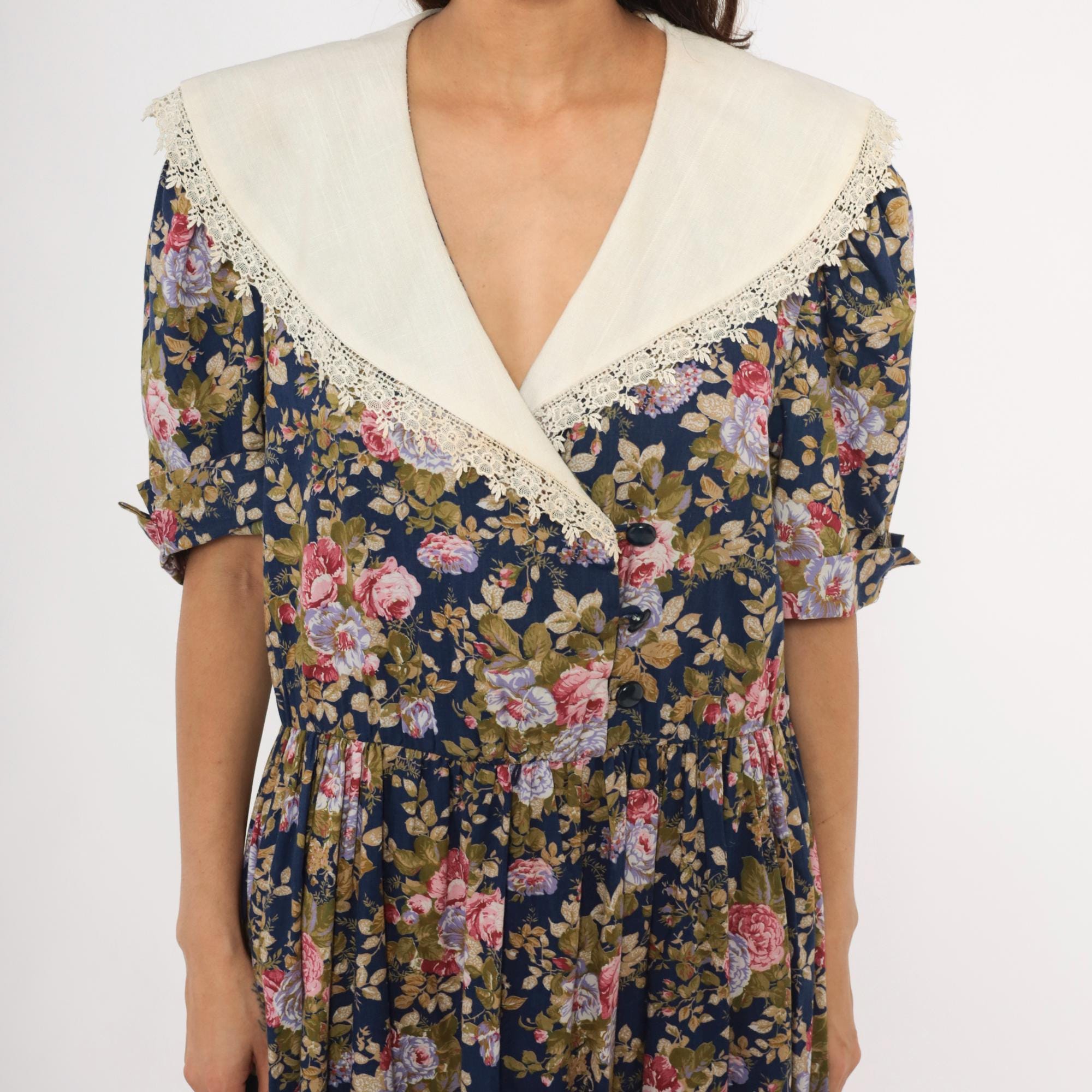 80s navy floral midi dress from Tina Barri with pink, lavender, and olive rose print across the entire garment. Wide cream-colored V-neckline collar with lace trim edging that extends across the back. Button front closure down the bodice, gathered waist, and short sleeves with turned cuffs.