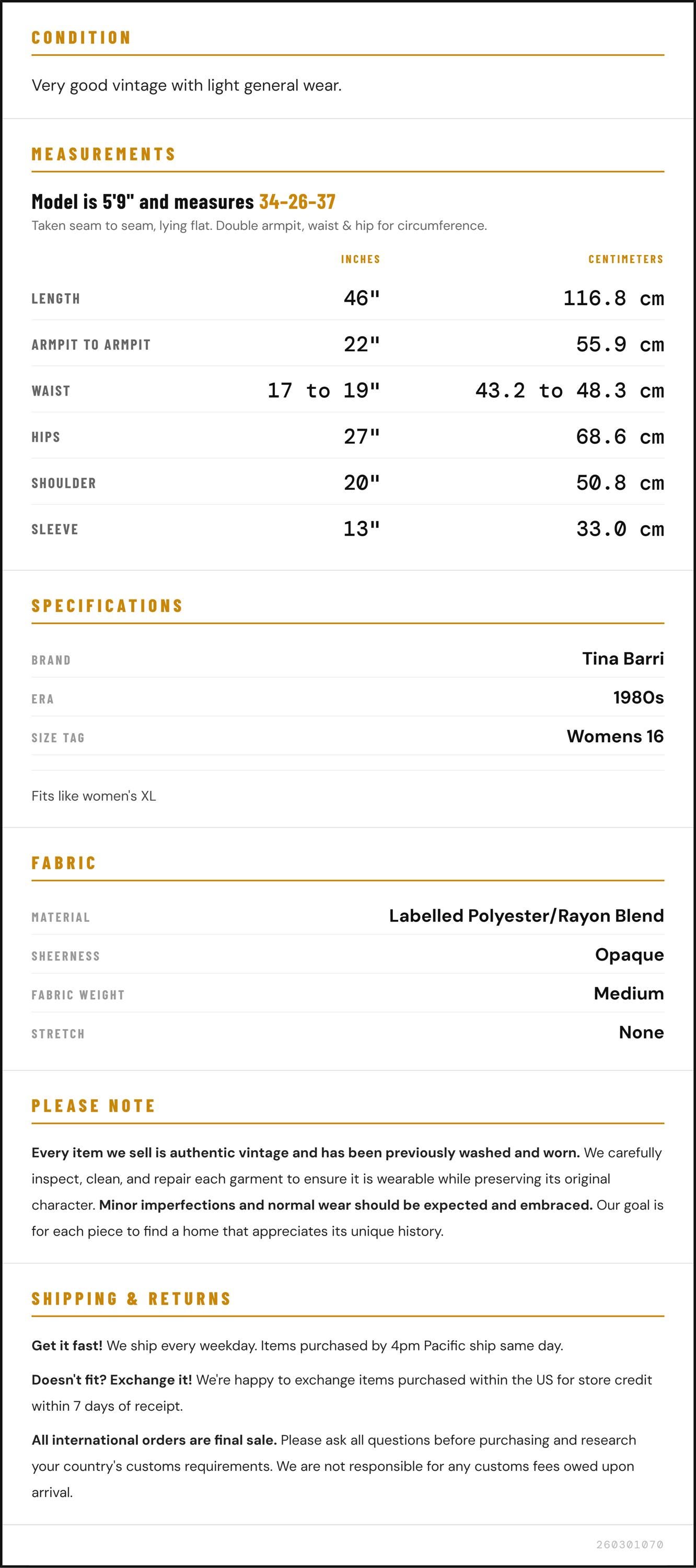 Measurements are taken laying flat and should be doubled where applicable. The "best fits" size is just an estimate, and vintage sizing can vary from modern sizing. Please use measurements to ensure proper fit. The best thing to do is measure a similar item of your own, and compare. When an item has stretch, we will list the unstretched dimensions with the stretched measurement afterwards.