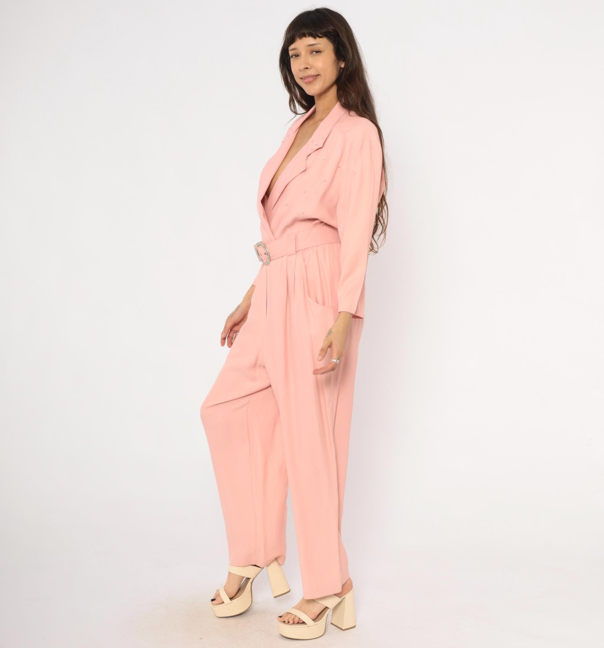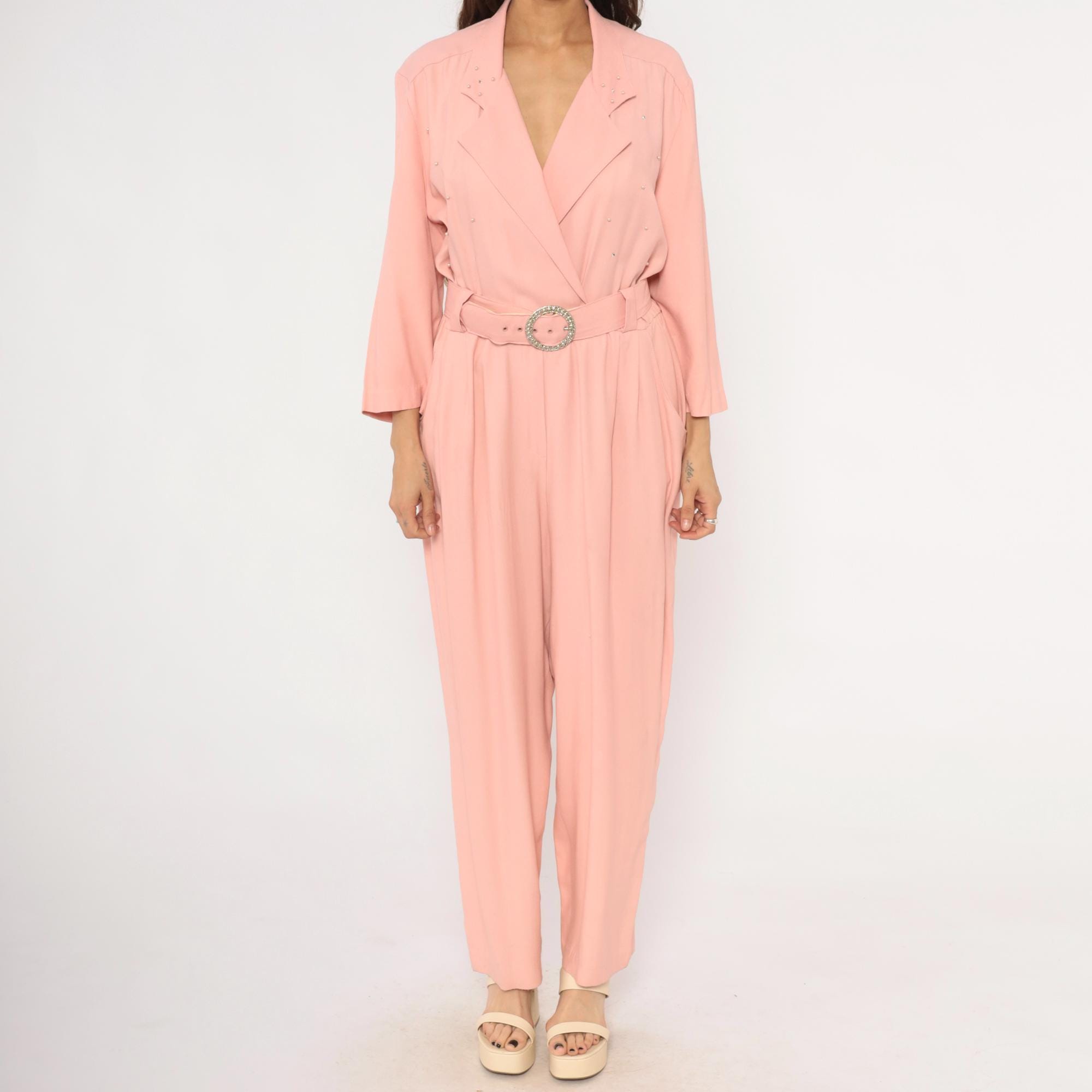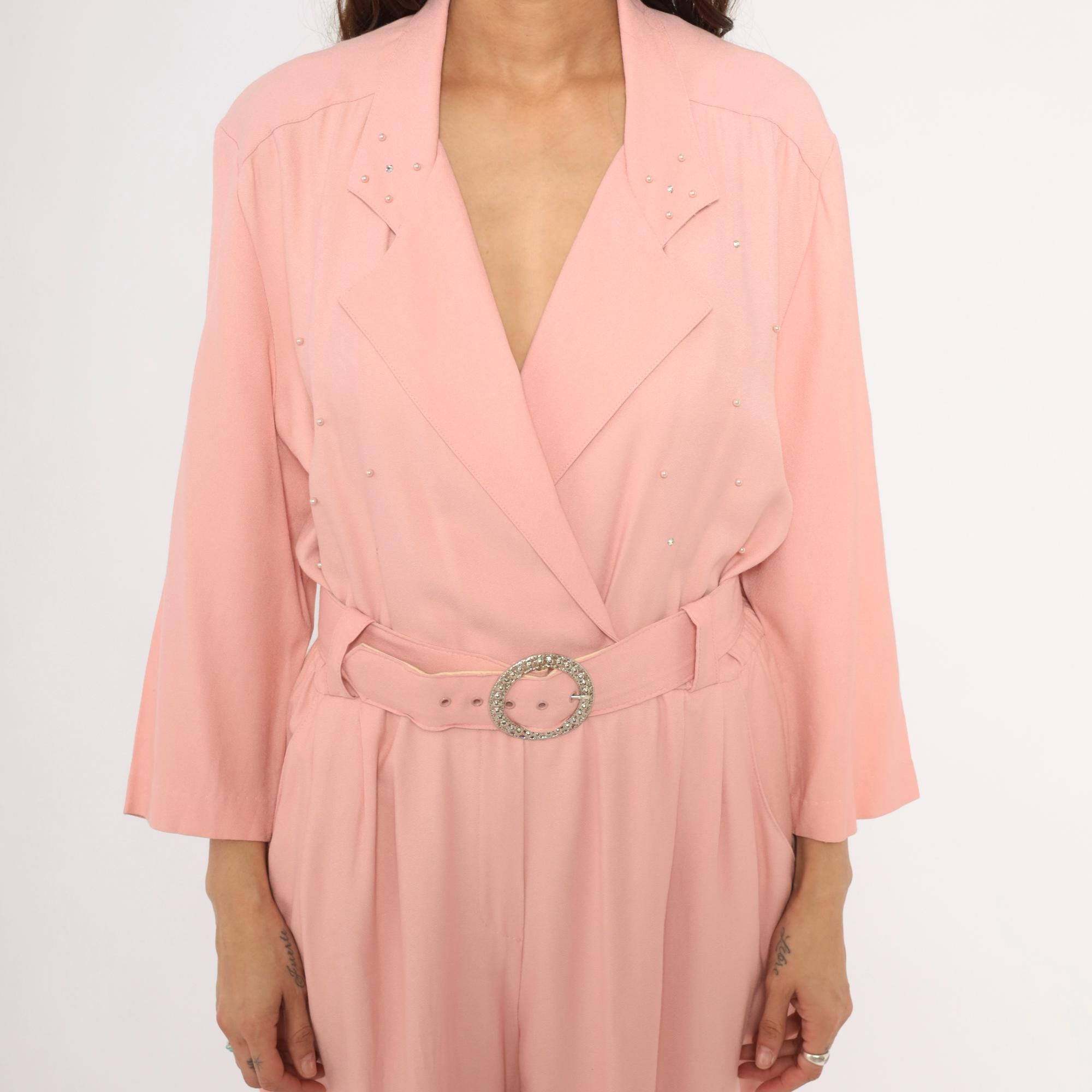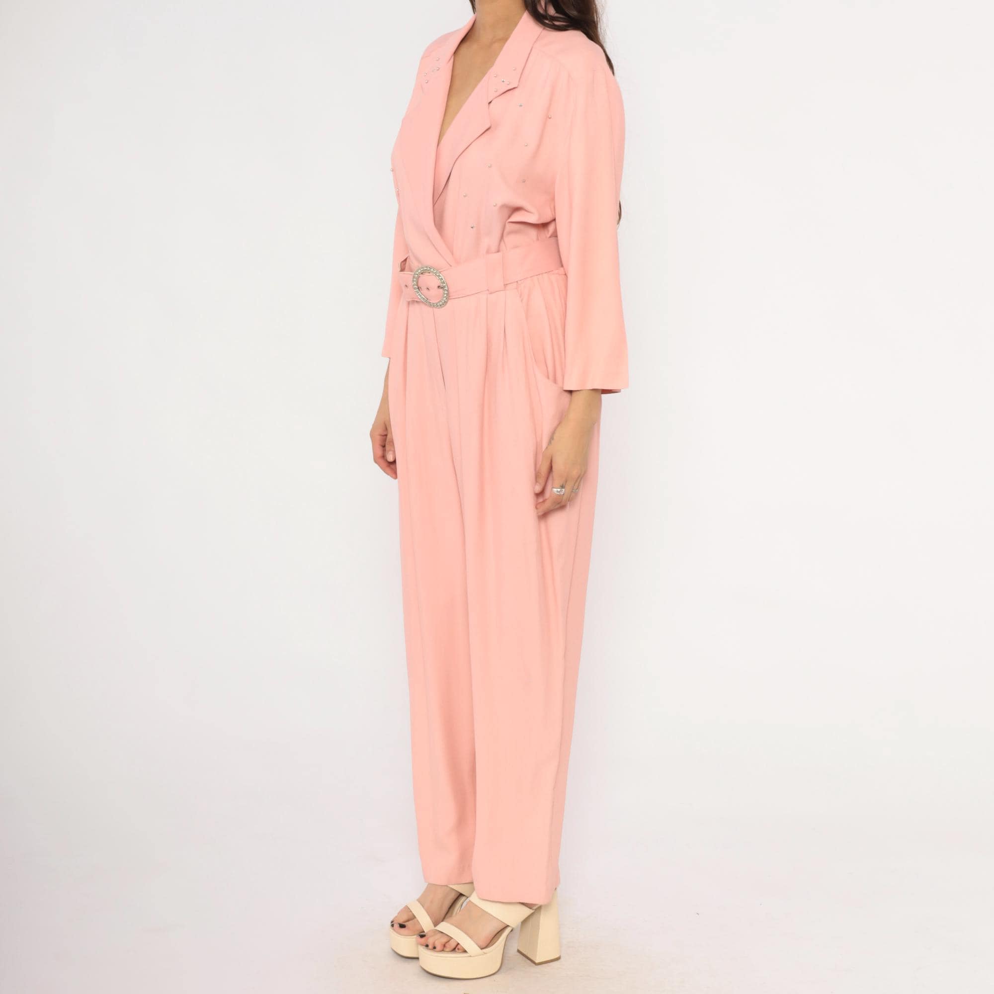 80s blush pink jumpsuit from SL Fashions with a wrap front bodice, notched lapel collar, and scattered rhinestone studs across the chest and shoulders. A matching belt with a round crystal buckle cinches at the waist, and the pleated wide leg trousers taper slightly toward the ankle. Three-quarter length sleeves, side seam pockets, and an elasticized back waistband.