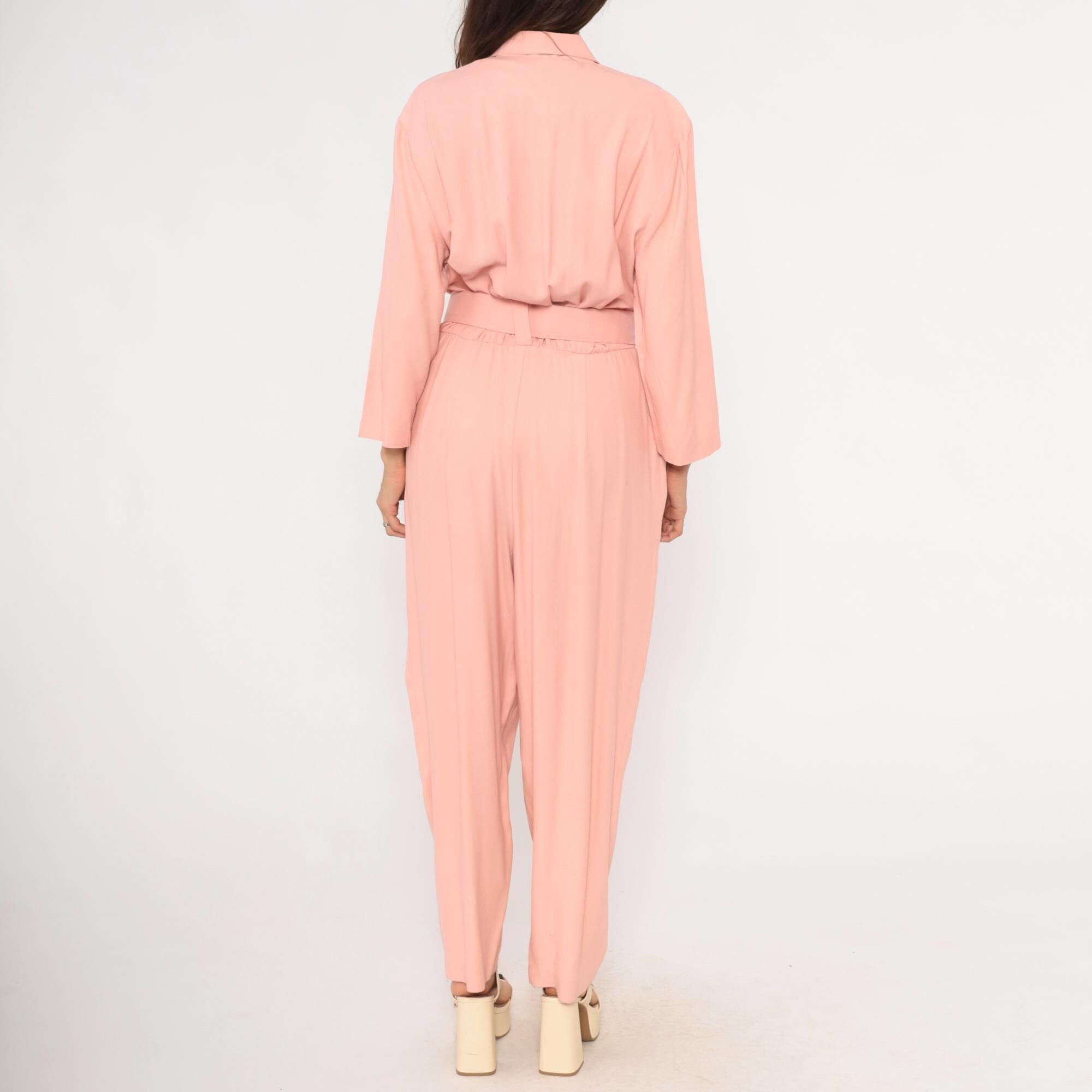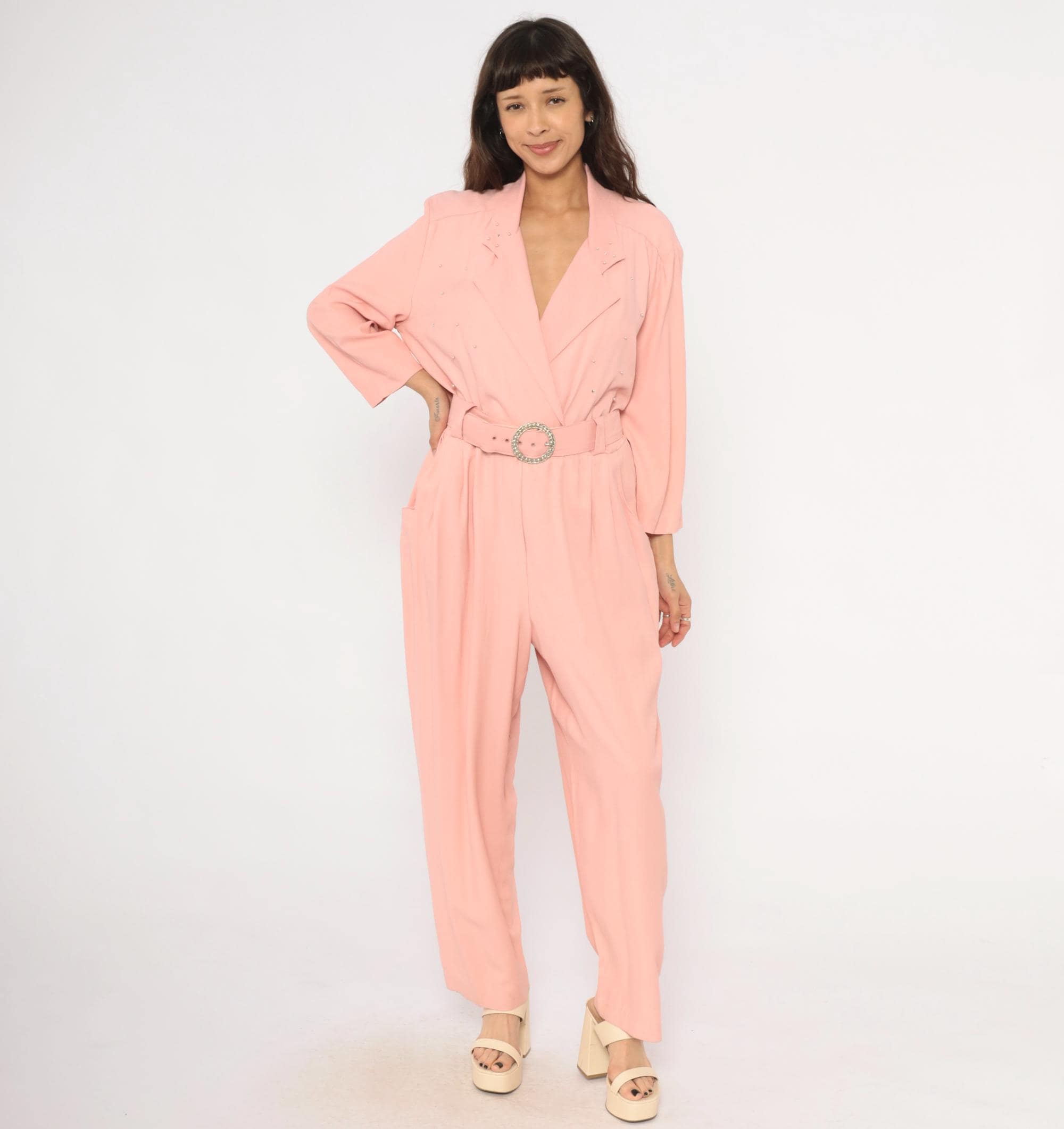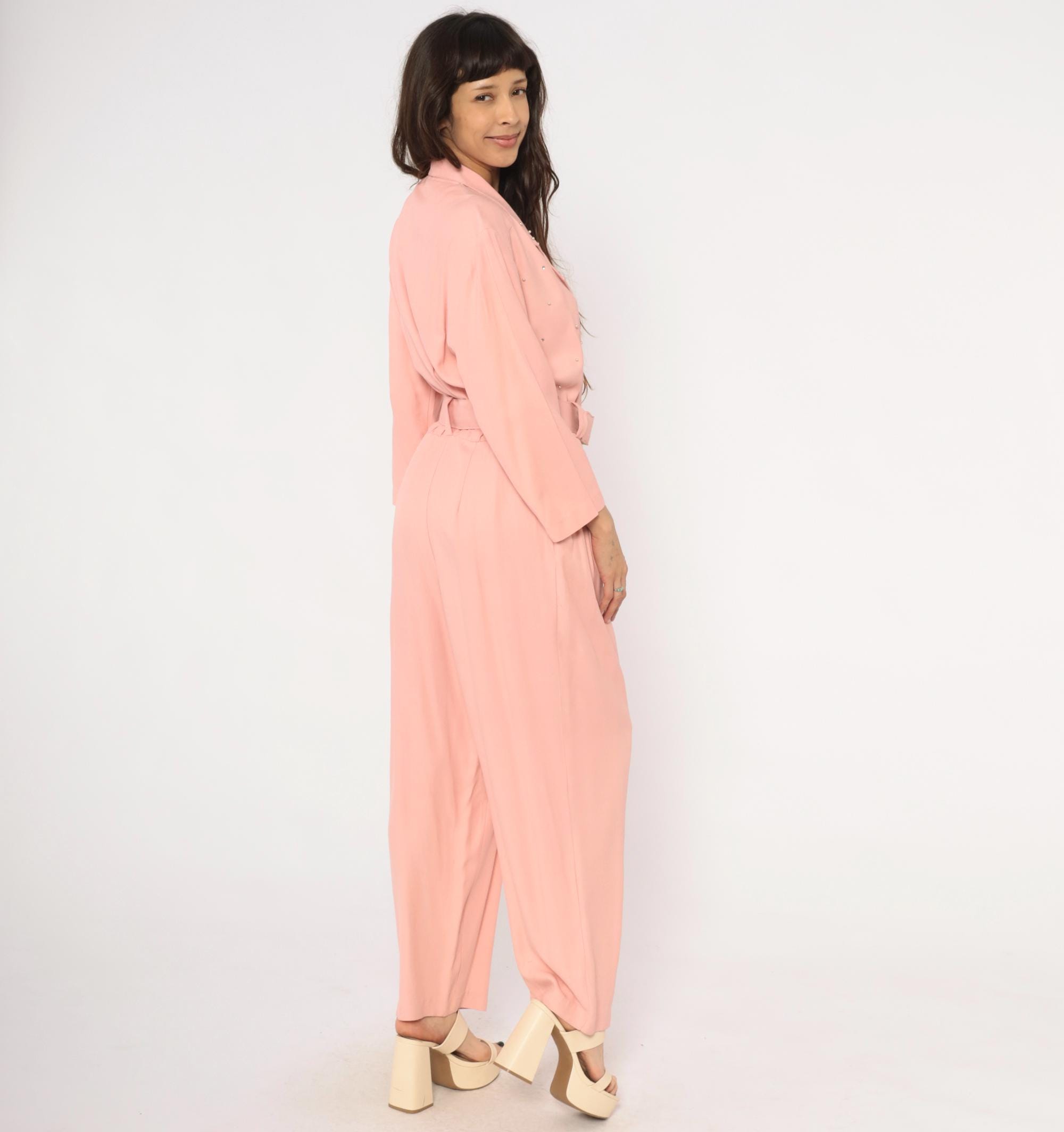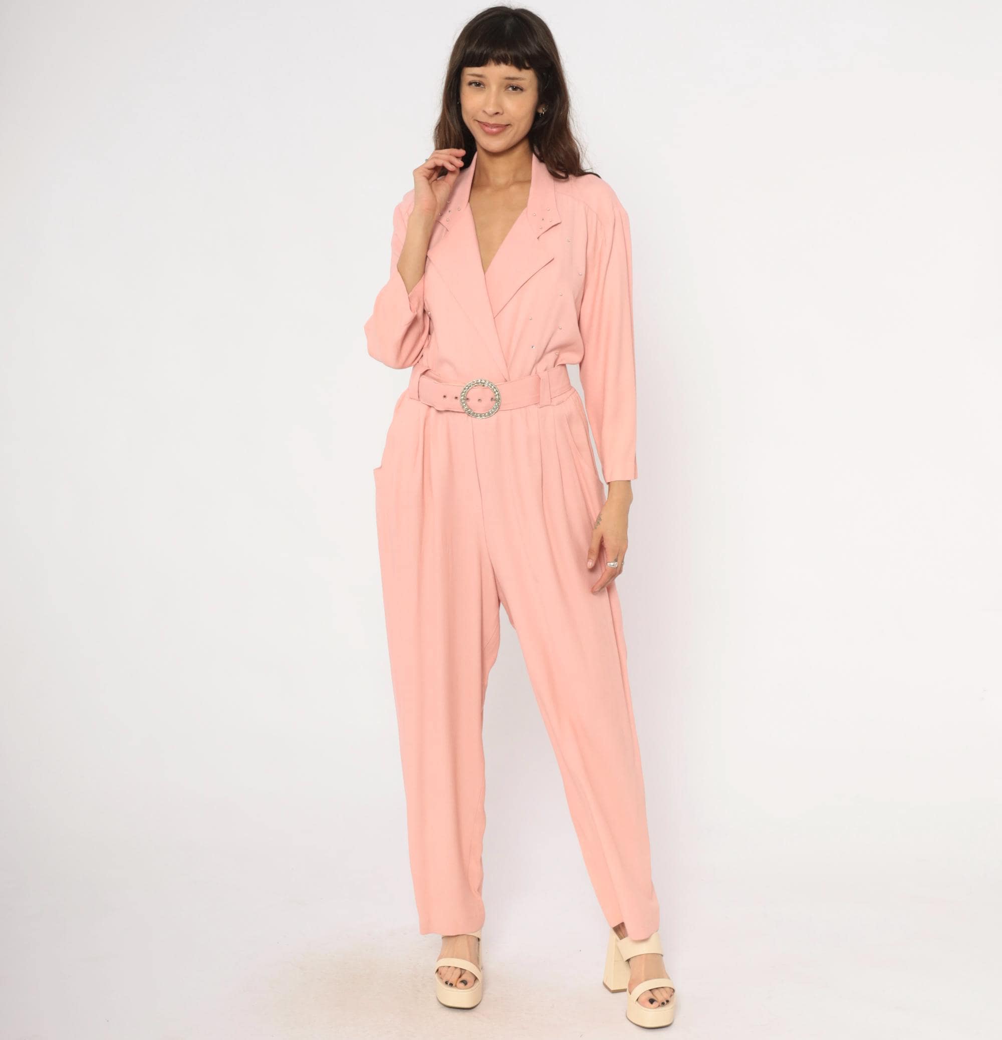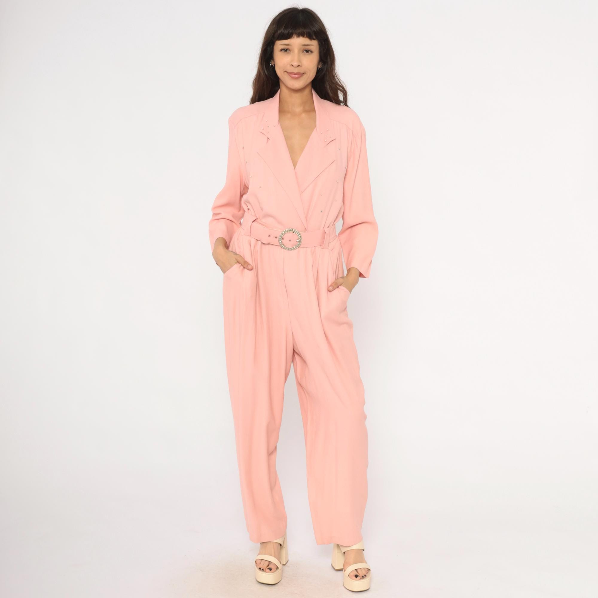80s blush pink jumpsuit from SL Fashions with a wrap front bodice, notched lapel collar, and scattered rhinestone studs across the chest and shoulders. A matching belt with a round crystal buckle cinches at the waist, and the pleated wide leg trousers taper slightly toward the ankle. Three-quarter length sleeves, side seam pockets, and an elasticized back waistband.