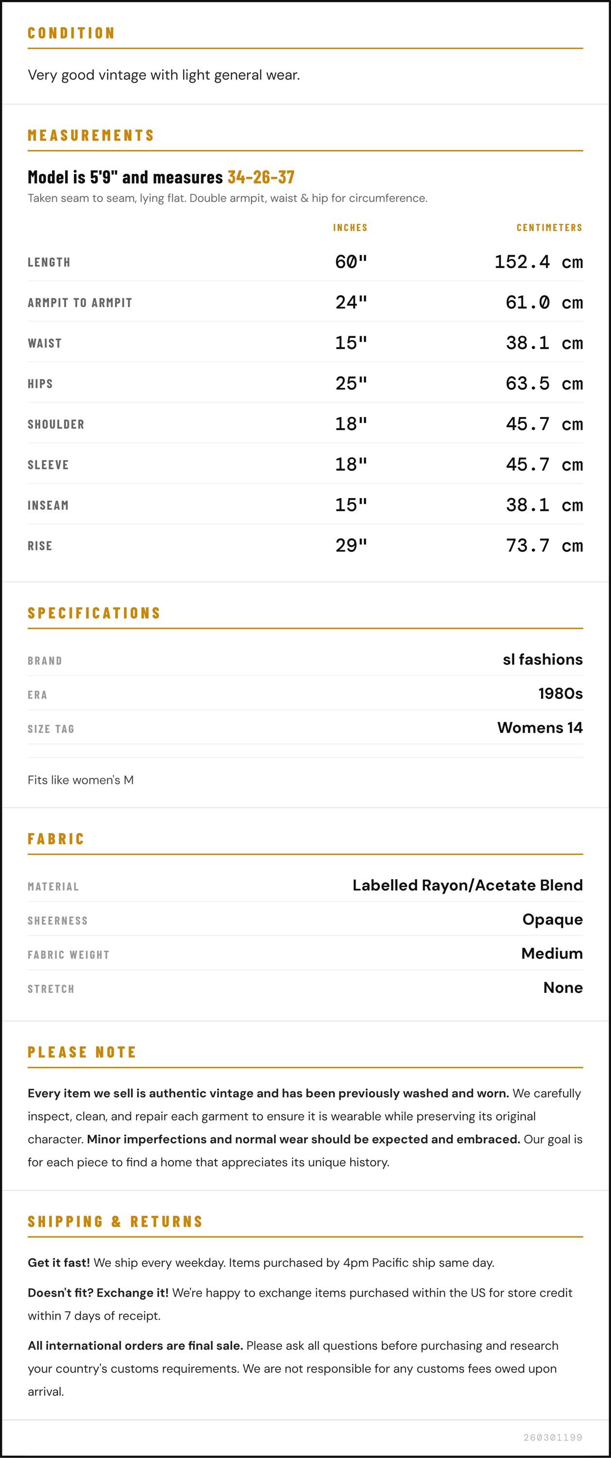 Vintage denim was usually made without any stretch, unlike modern jeans. Check the measurements to ensure proper fit, and remember to give yourself a little wiggle room in the waist and hips, depending on your preferred fit.