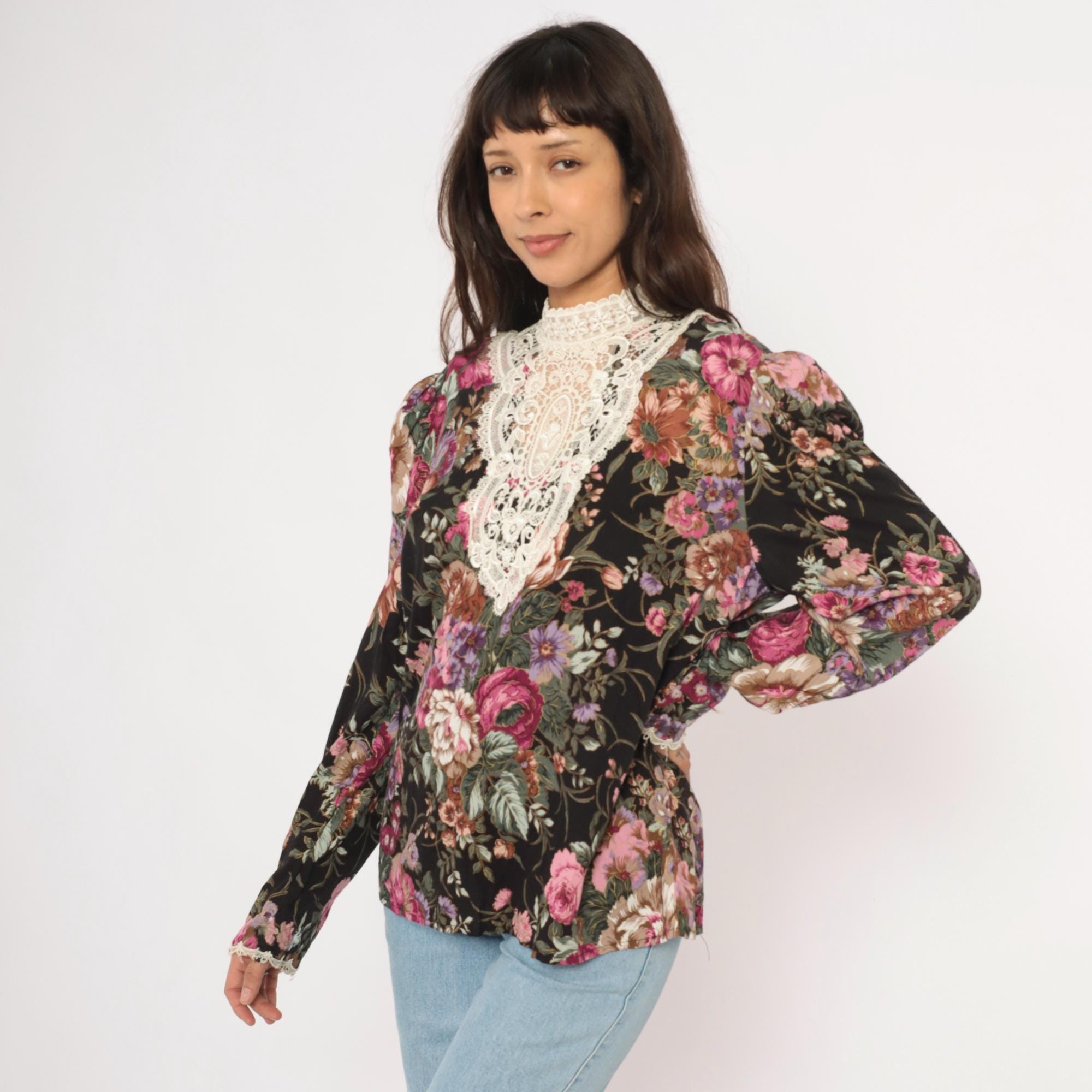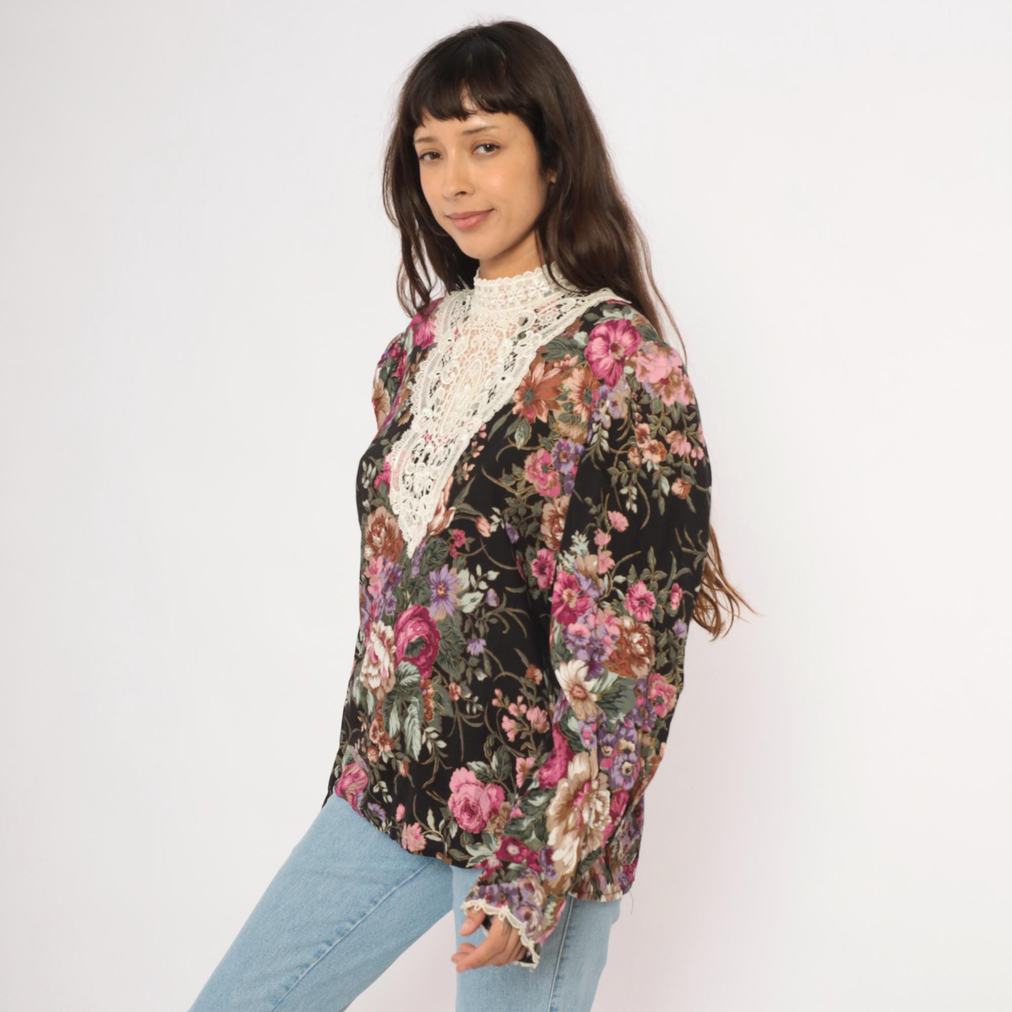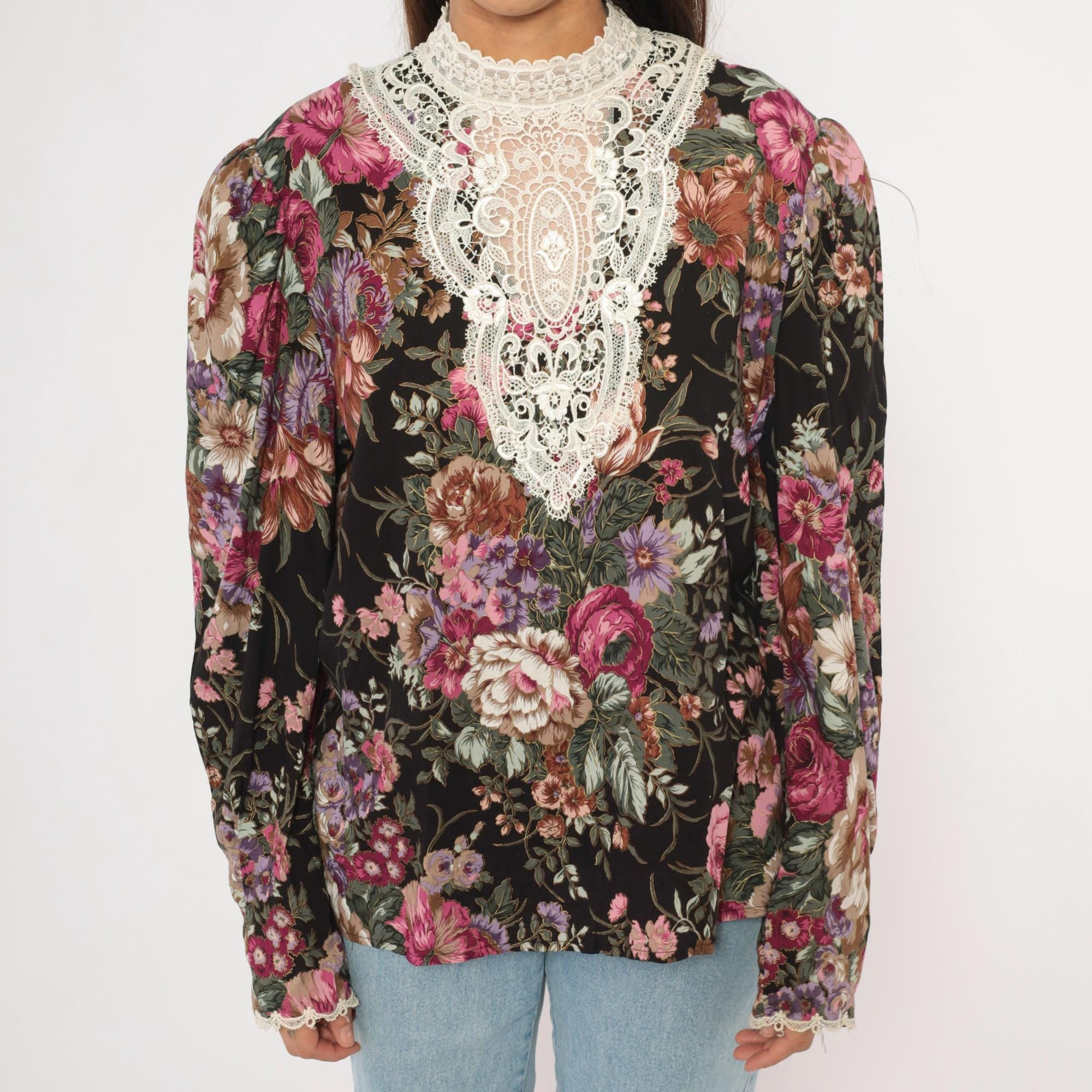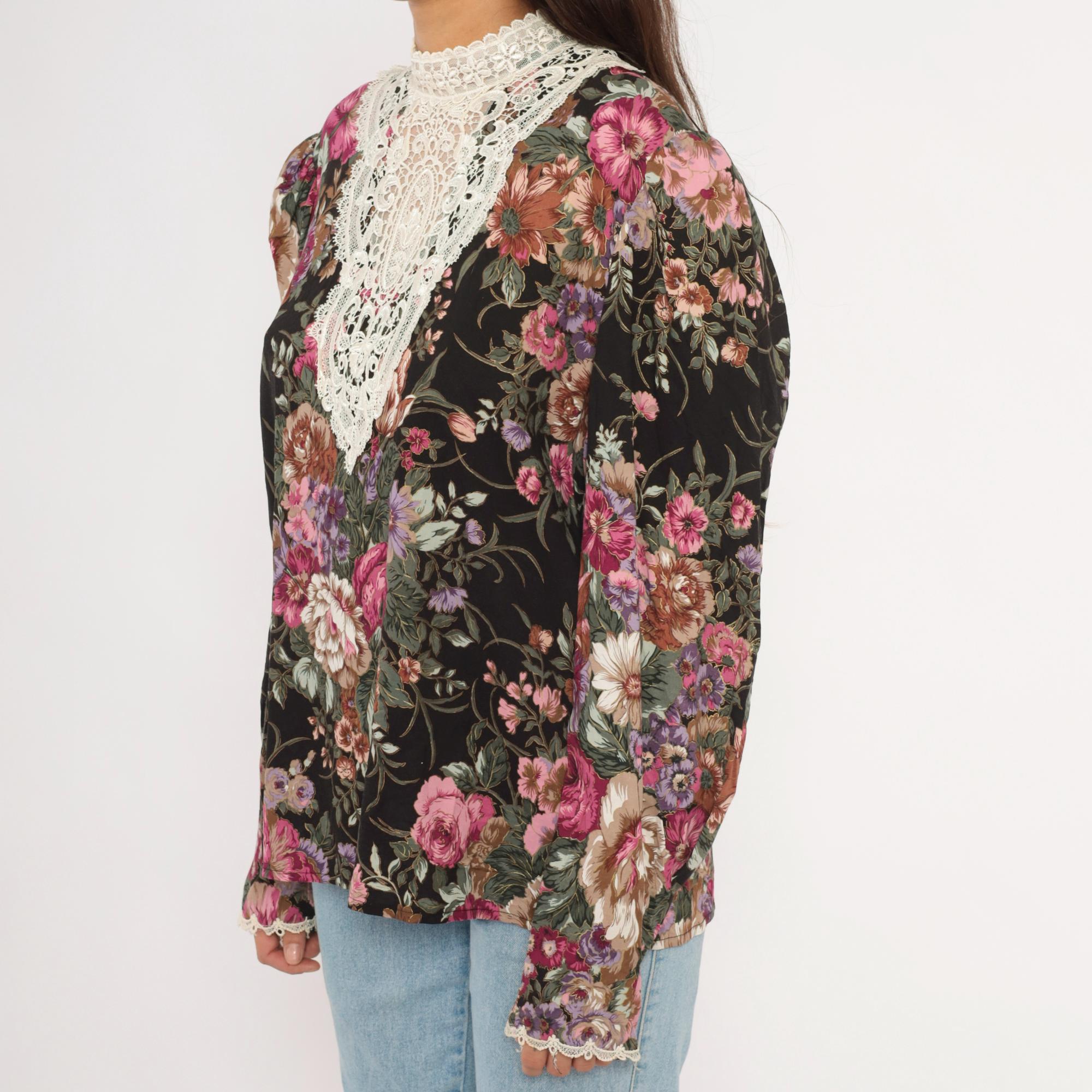 90s black floral blouse from Scott McClintock with a large white lace bib panel at the high neckline, extending down the chest in an ornate medallion pattern. Pink, mauve, purple, and sage green roses and flowers cover the black ground. Puff sleeves taper to fitted cuffs with lace trim, and the back closes with buttons down the center seam.