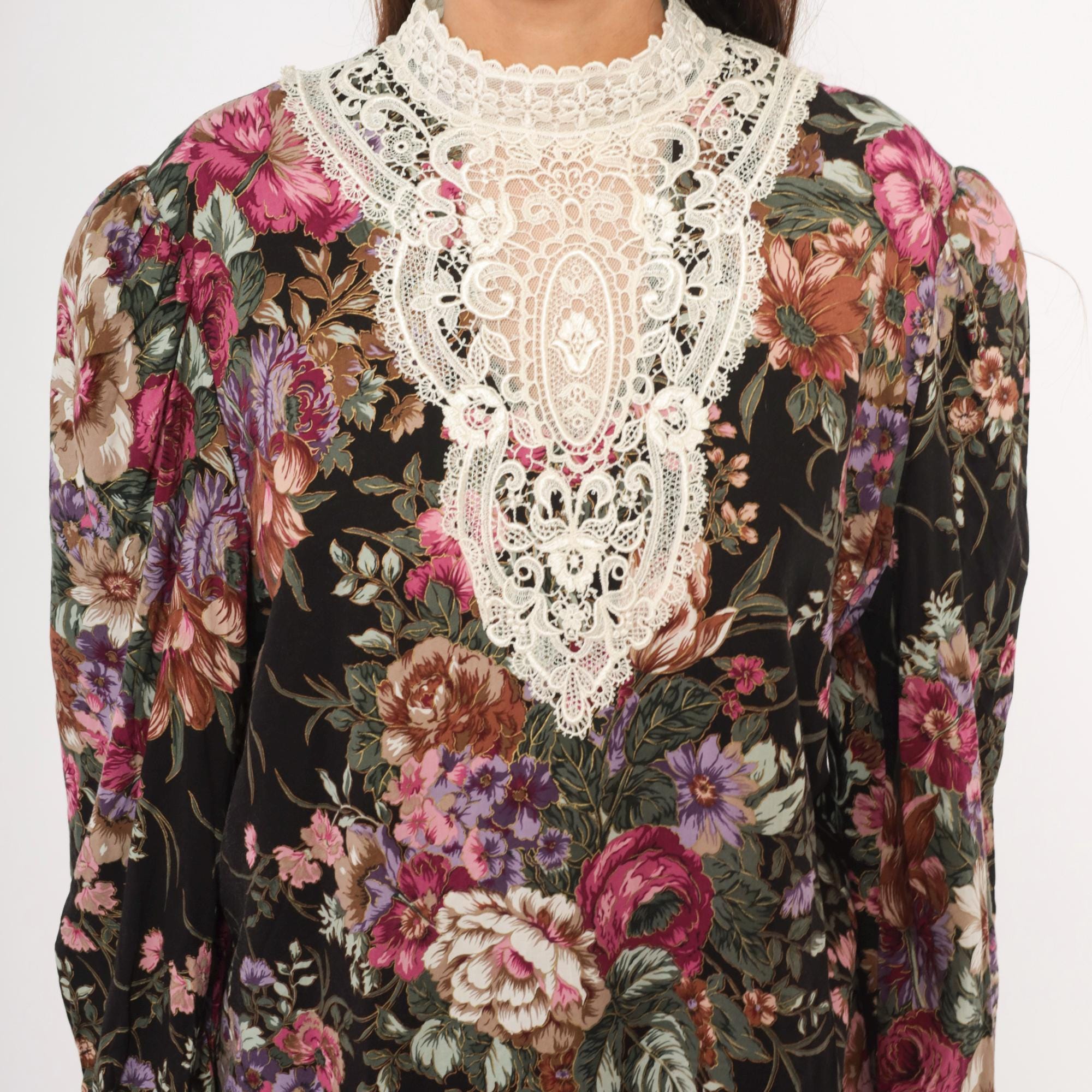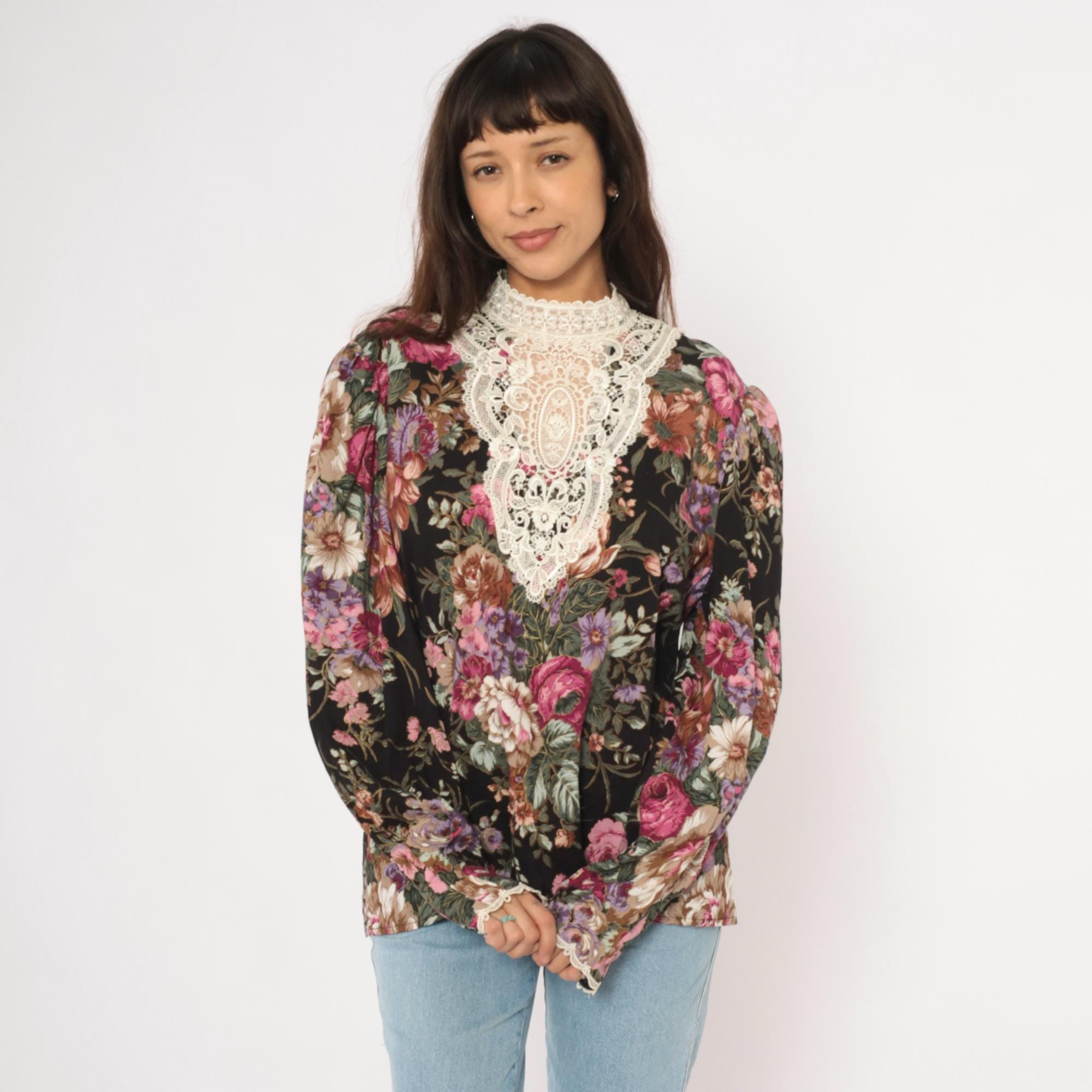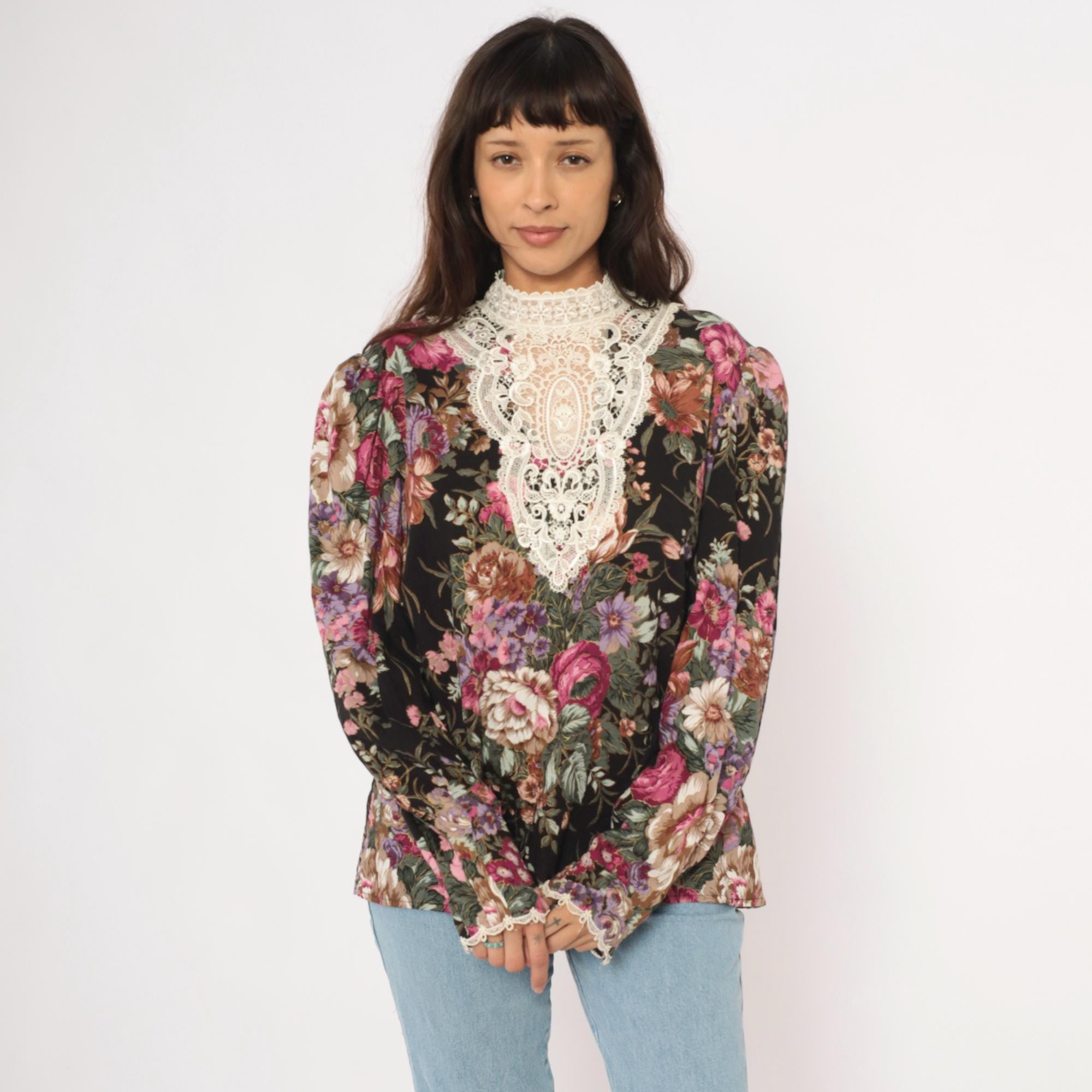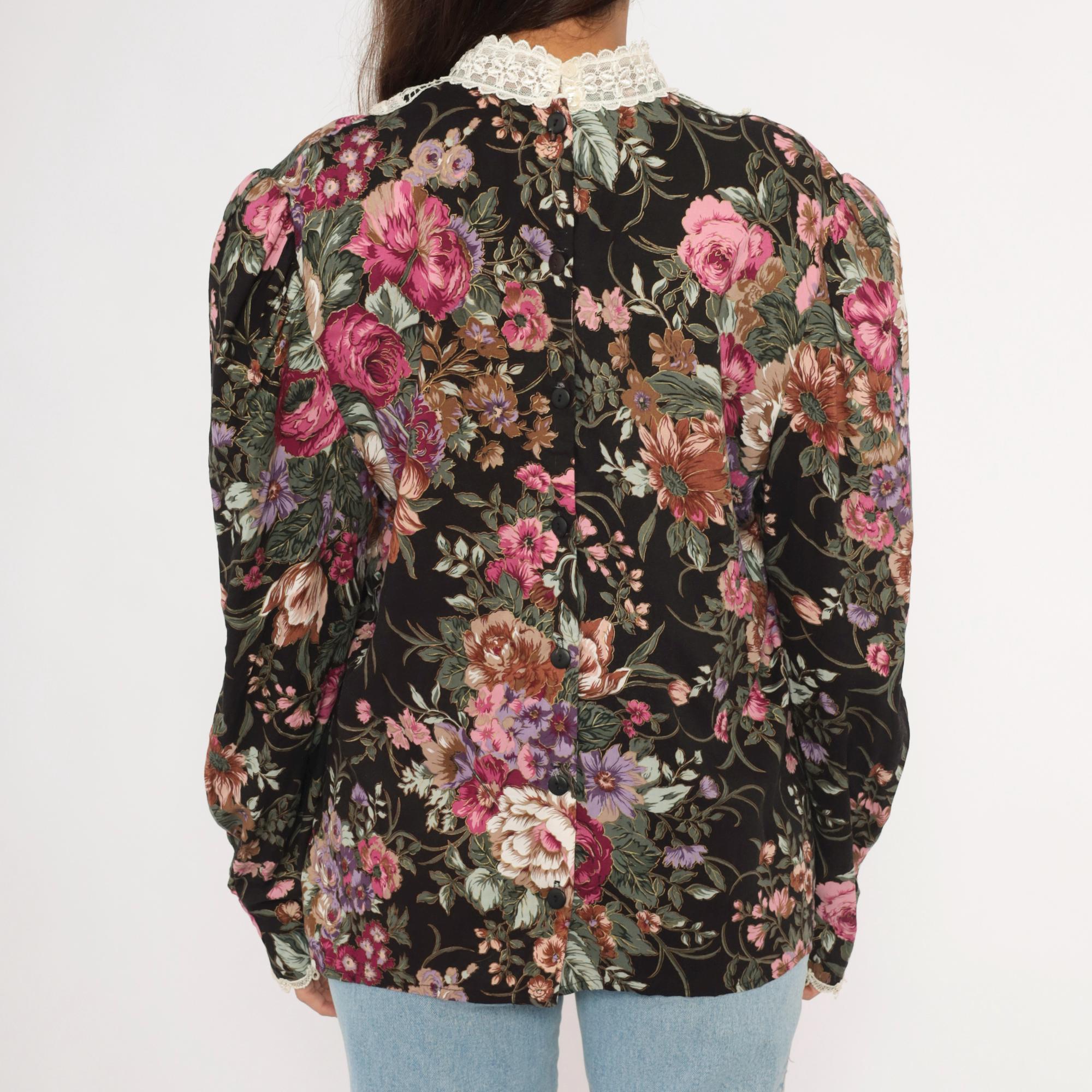 90s black floral blouse from Scott McClintock with a large white lace bib panel at the high neckline, extending down the chest in an ornate medallion pattern. Pink, mauve, purple, and sage green roses and flowers cover the black ground. Puff sleeves taper to fitted cuffs with lace trim, and the back closes with buttons down the center seam.