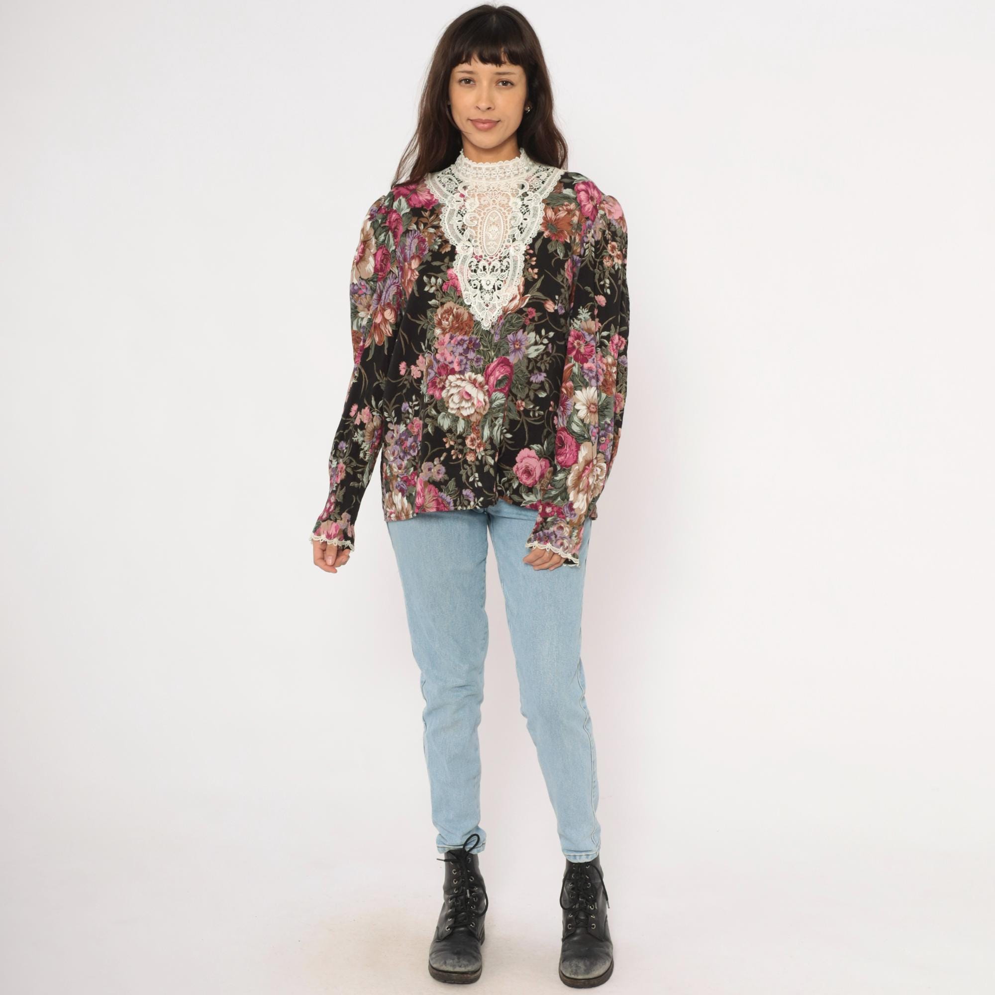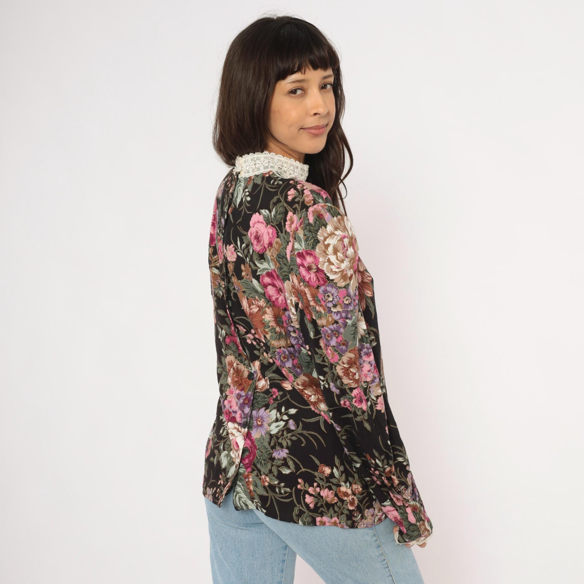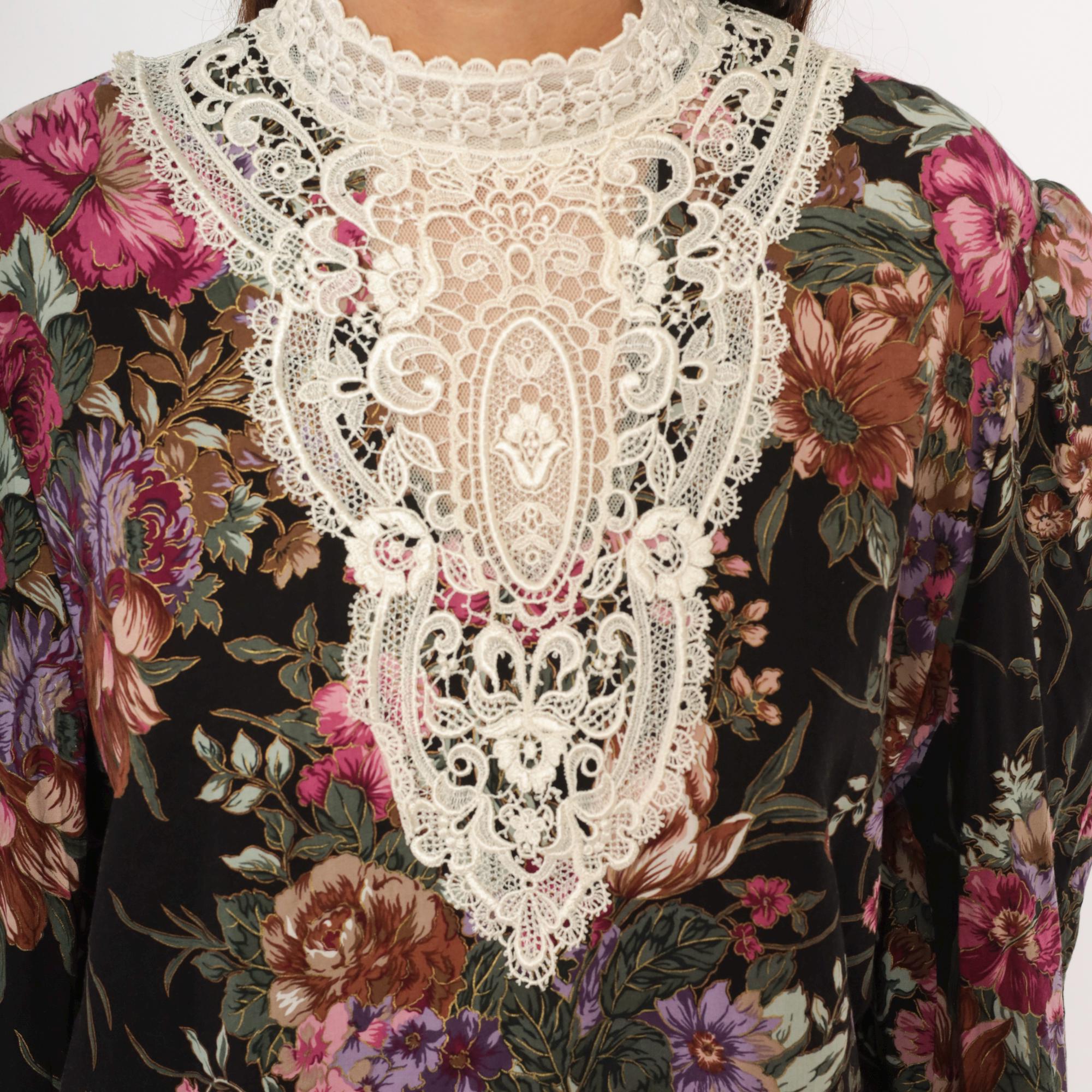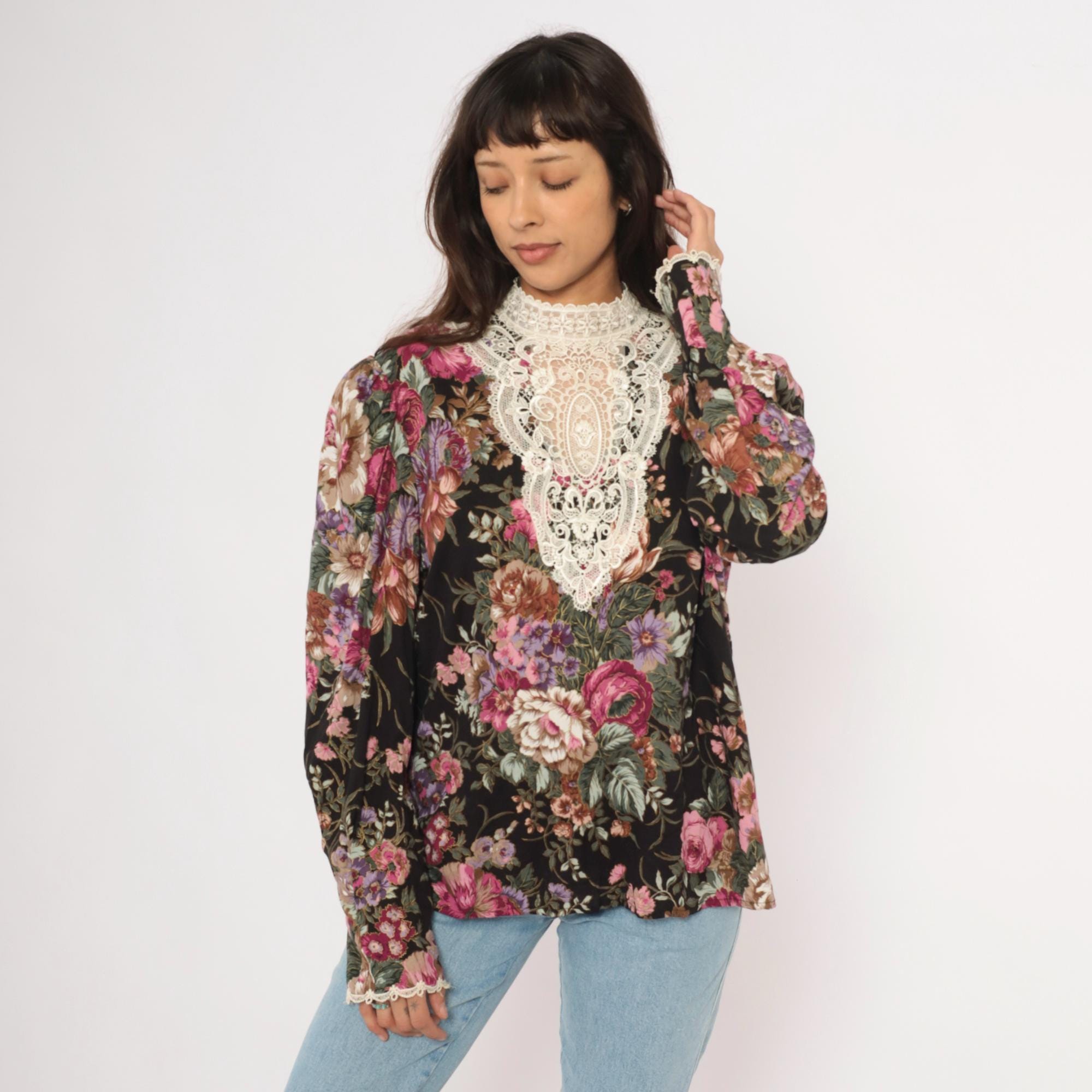 90s black floral blouse from Scott McClintock with a large white lace bib panel at the high neckline, extending down the chest in an ornate medallion pattern. Pink, mauve, purple, and sage green roses and flowers cover the black ground. Puff sleeves taper to fitted cuffs with lace trim, and the back closes with buttons down the center seam.