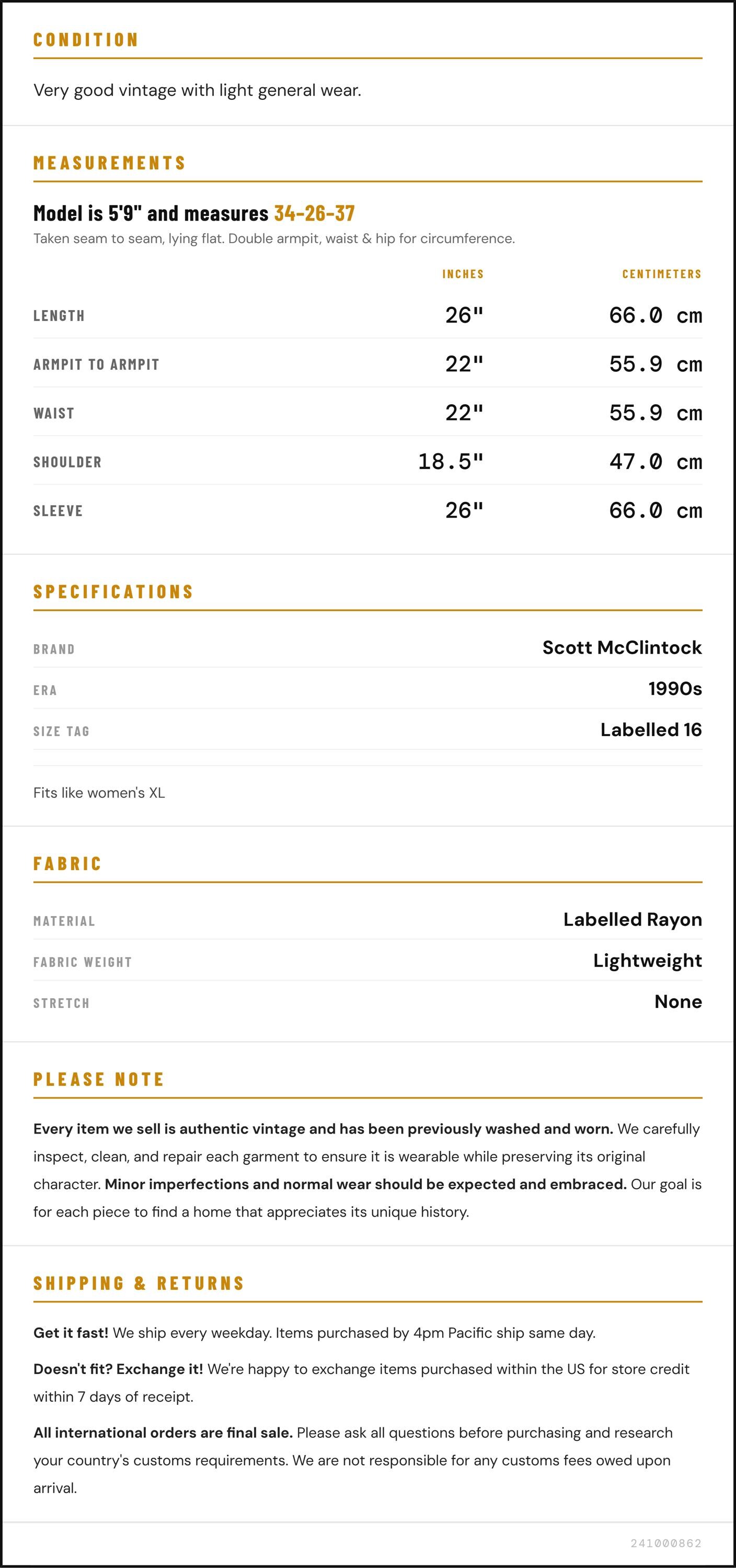 Measurements are taken laying flat and should be doubled where applicable. The "best fits" size is just an estimate, and vintage sizing can vary from modern sizing. Please use measurements to ensure proper fit. The best thing to do is measure a similar item of your own, and compare. When an item has stretch, we will list the unstretched dimensions with the stretched measurement afterwards.