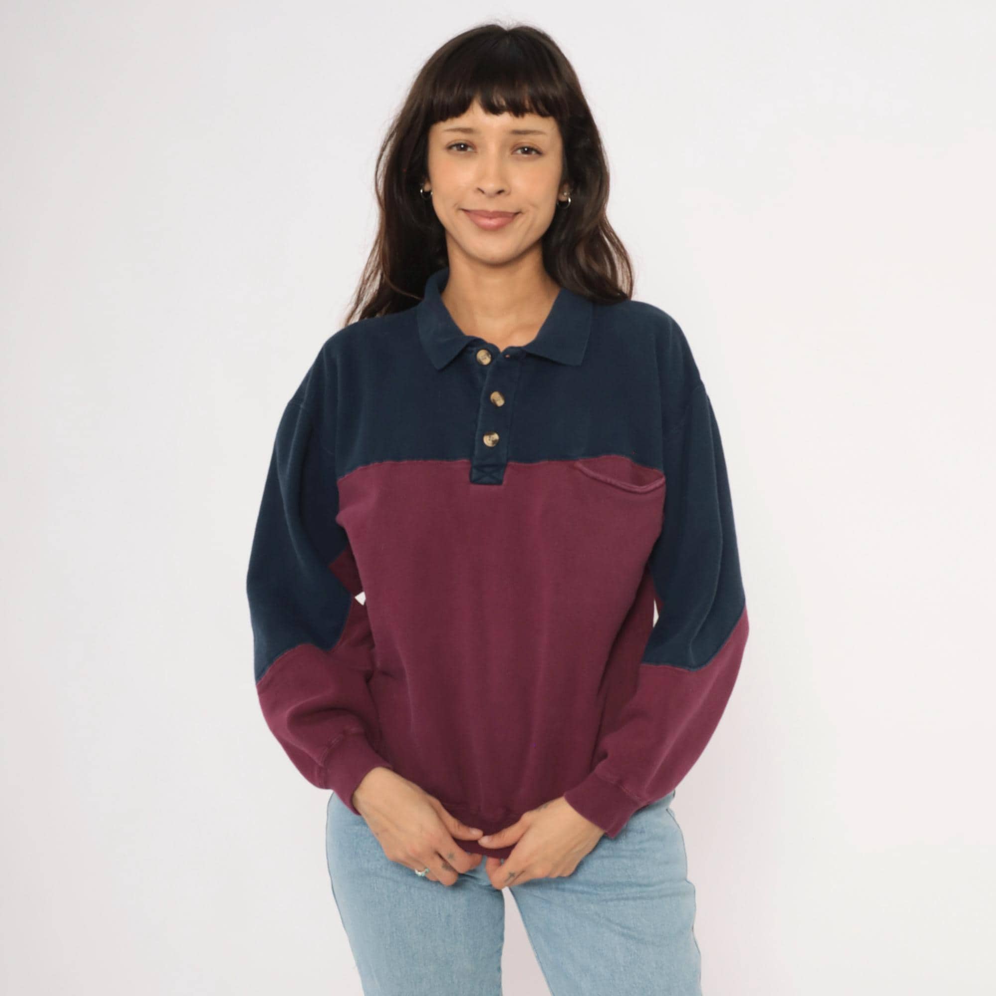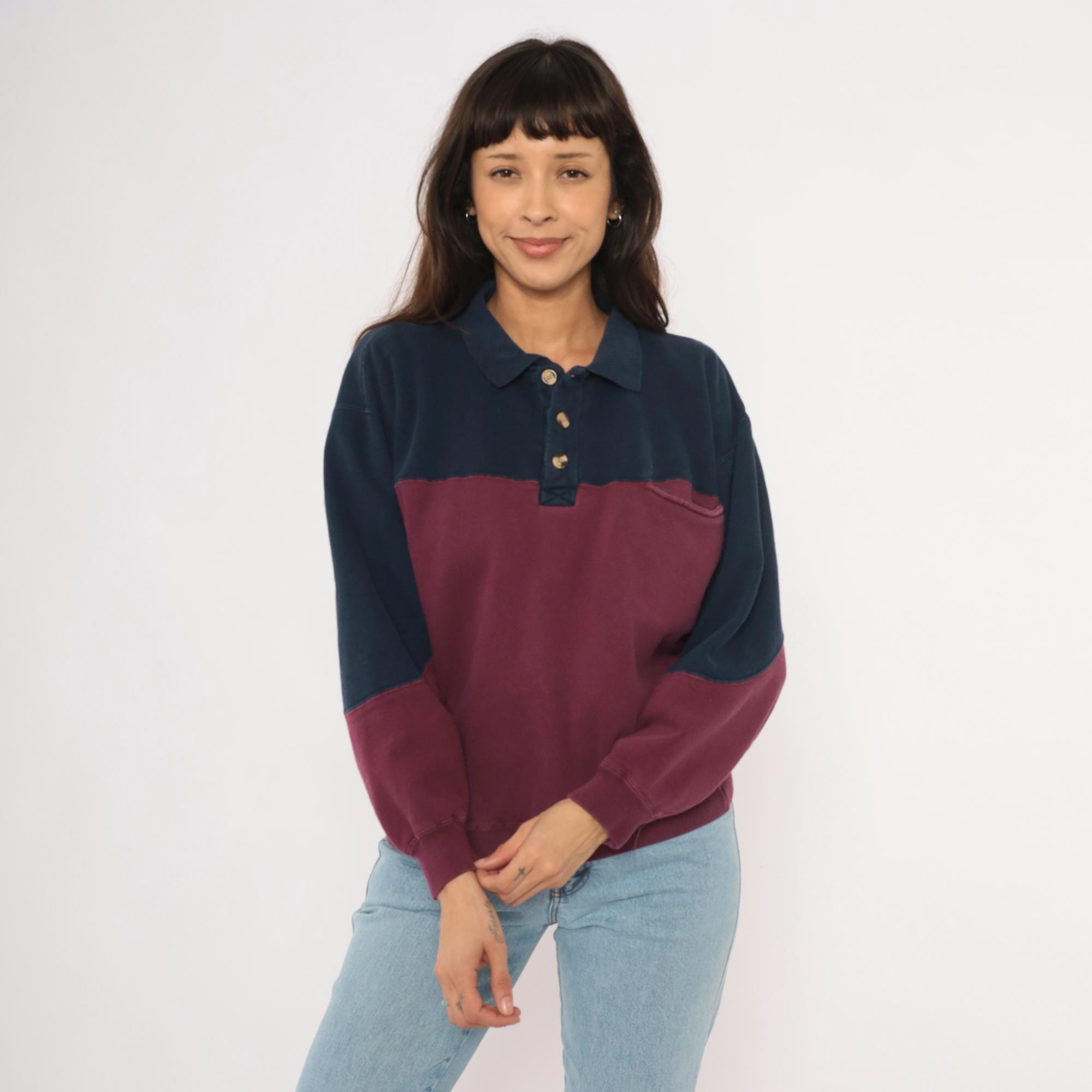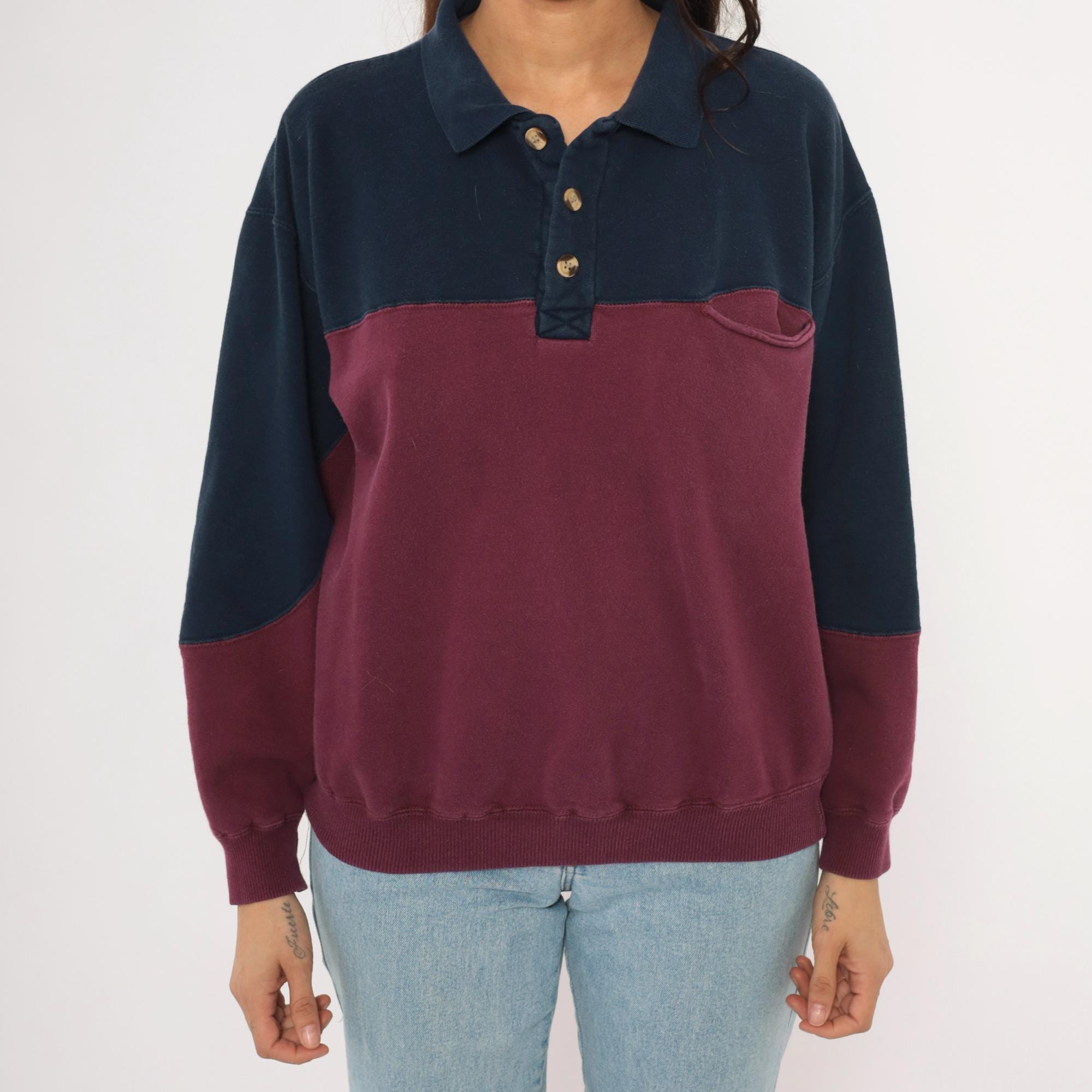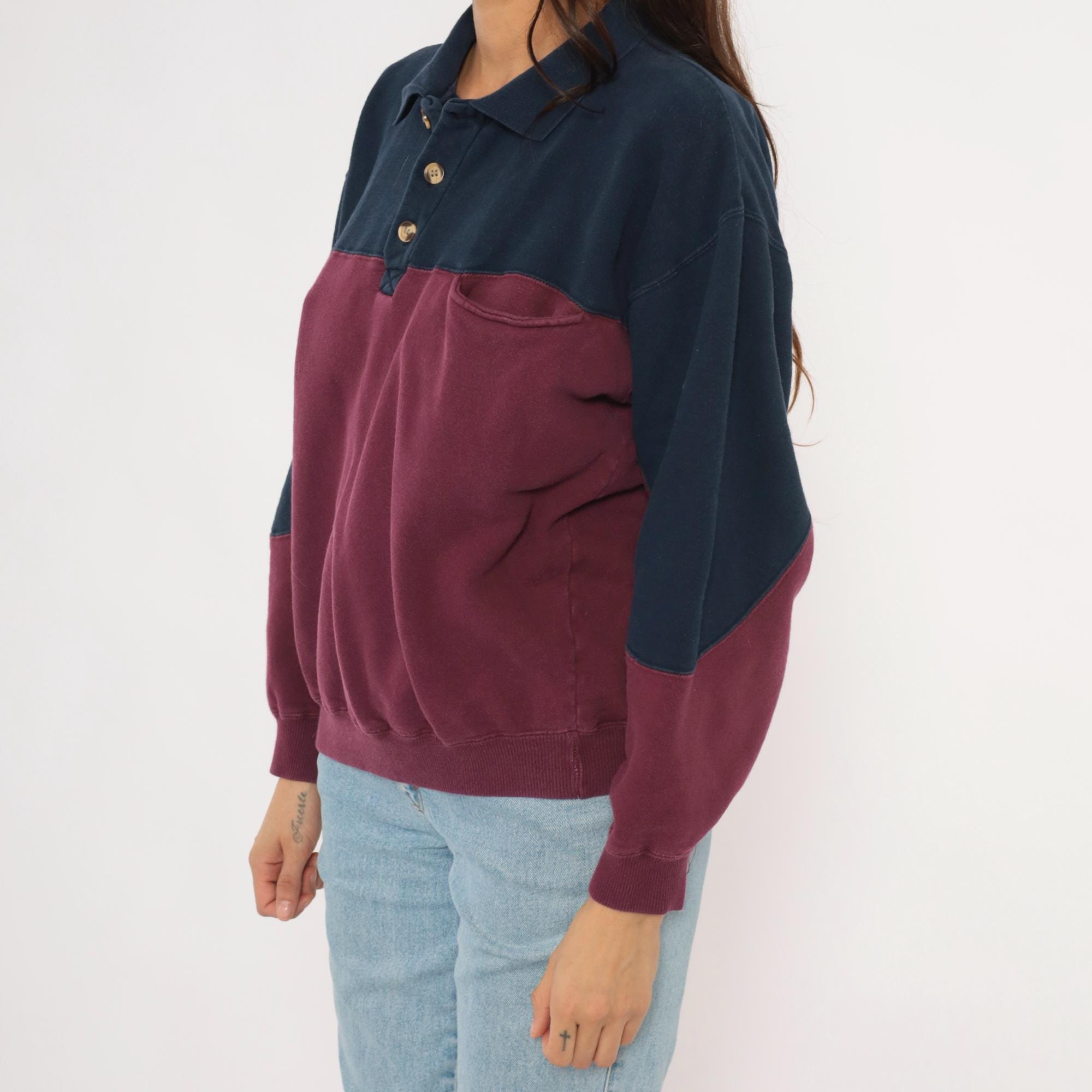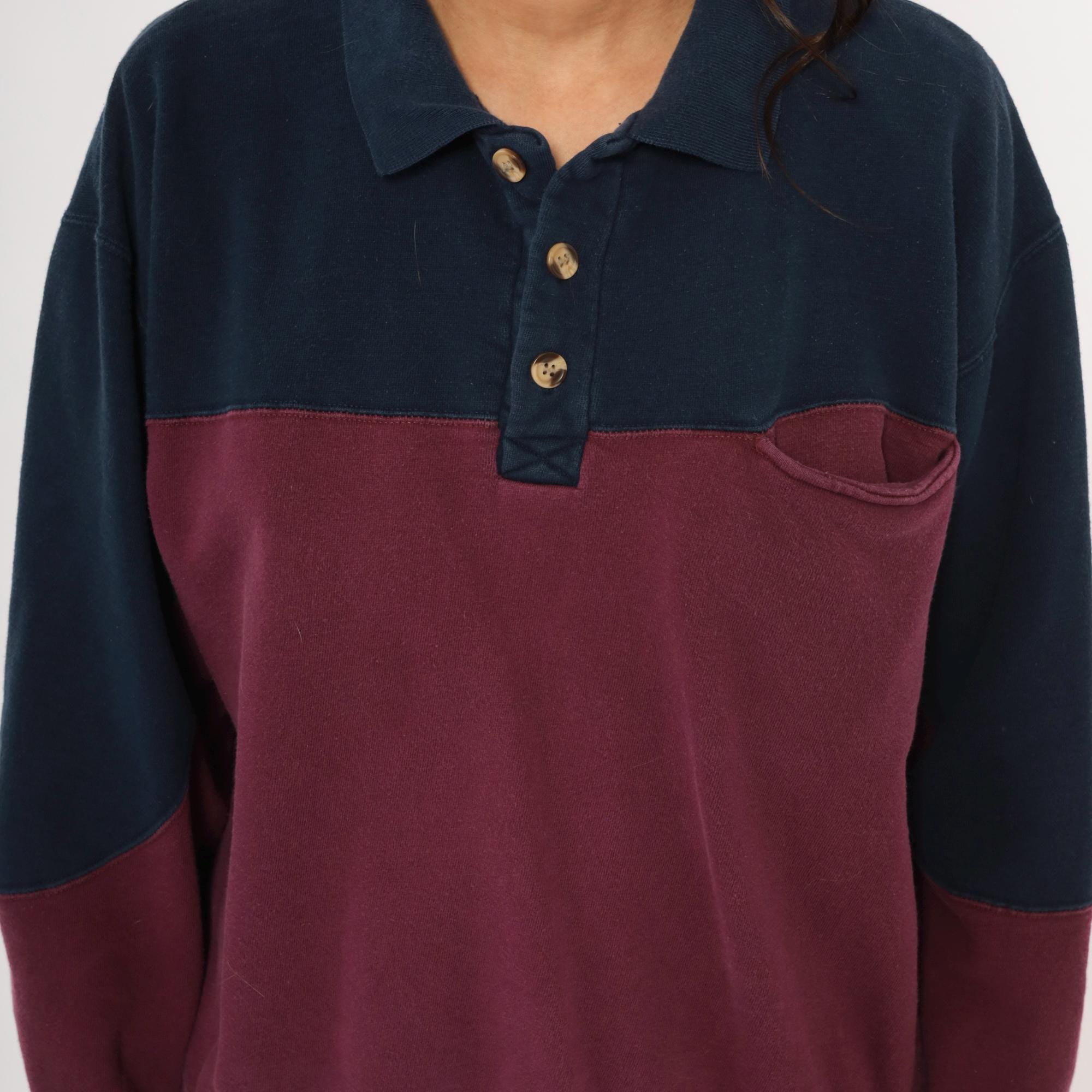 90s navy and burgundy color block polo sweatshirt from Werguard with a flat collar and three-button henley placket. Two-tone construction with a navy upper chest, collar, and sleeves transitioning to a wine-colored body and cuffs. Front patch pocket on the left chest, drop shoulders, and ribbed waistband and cuffs.