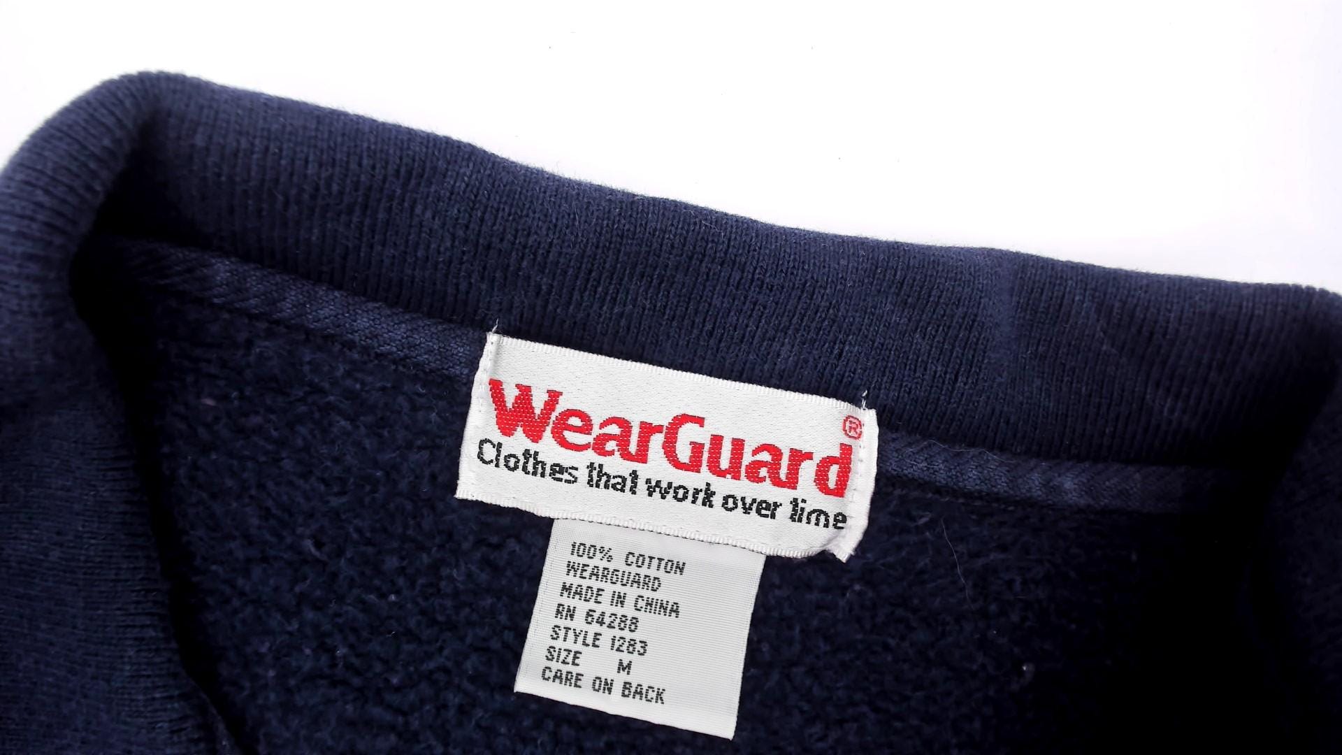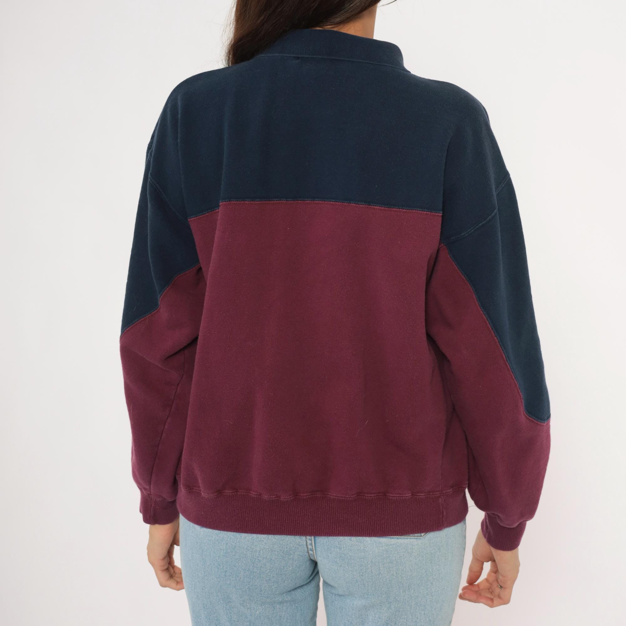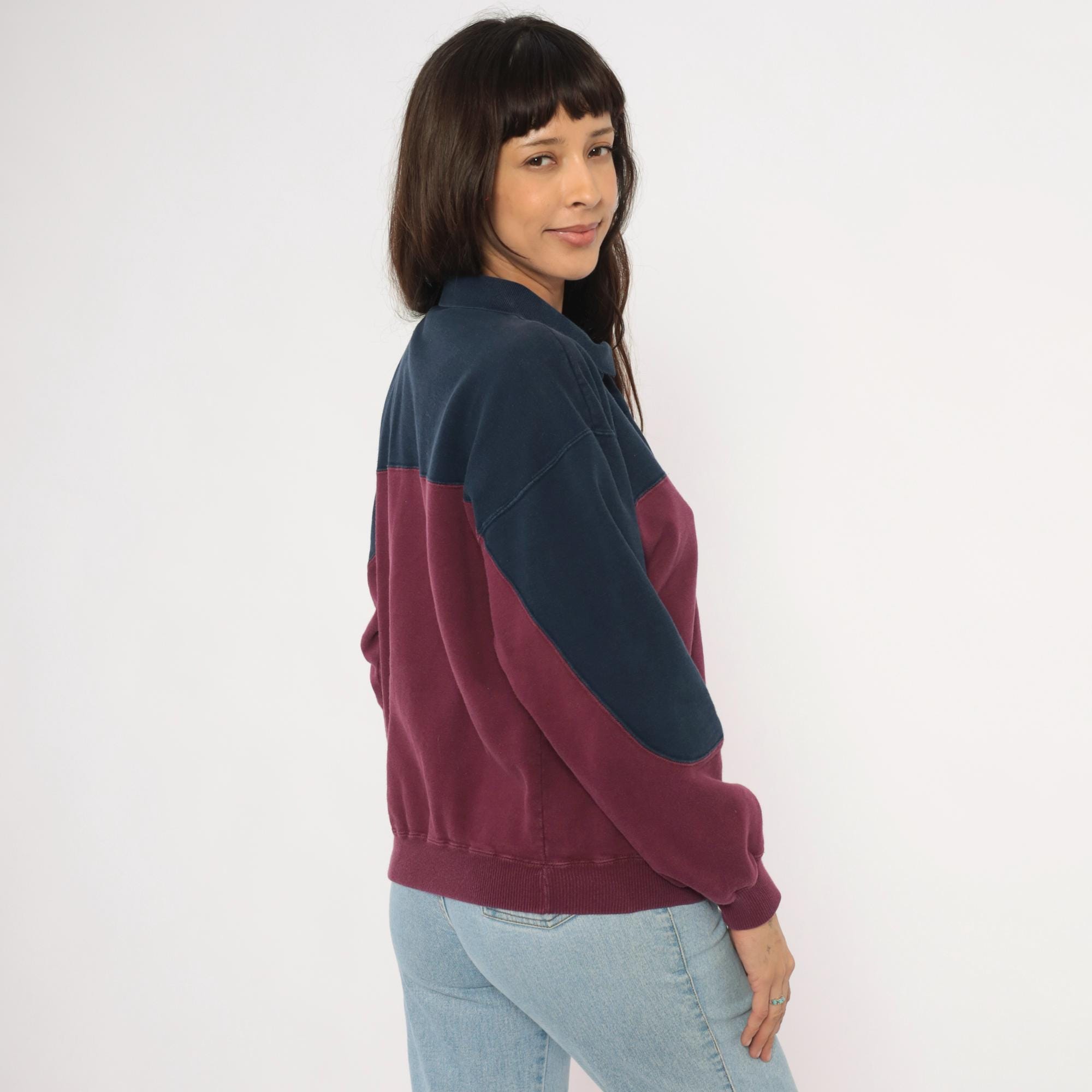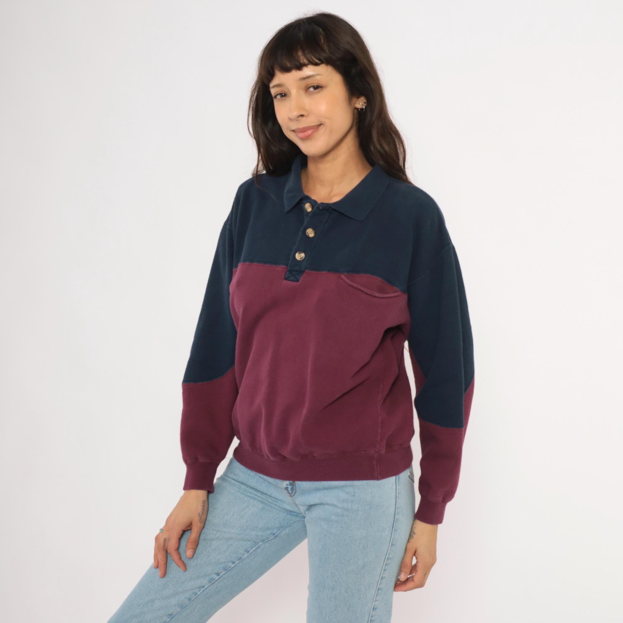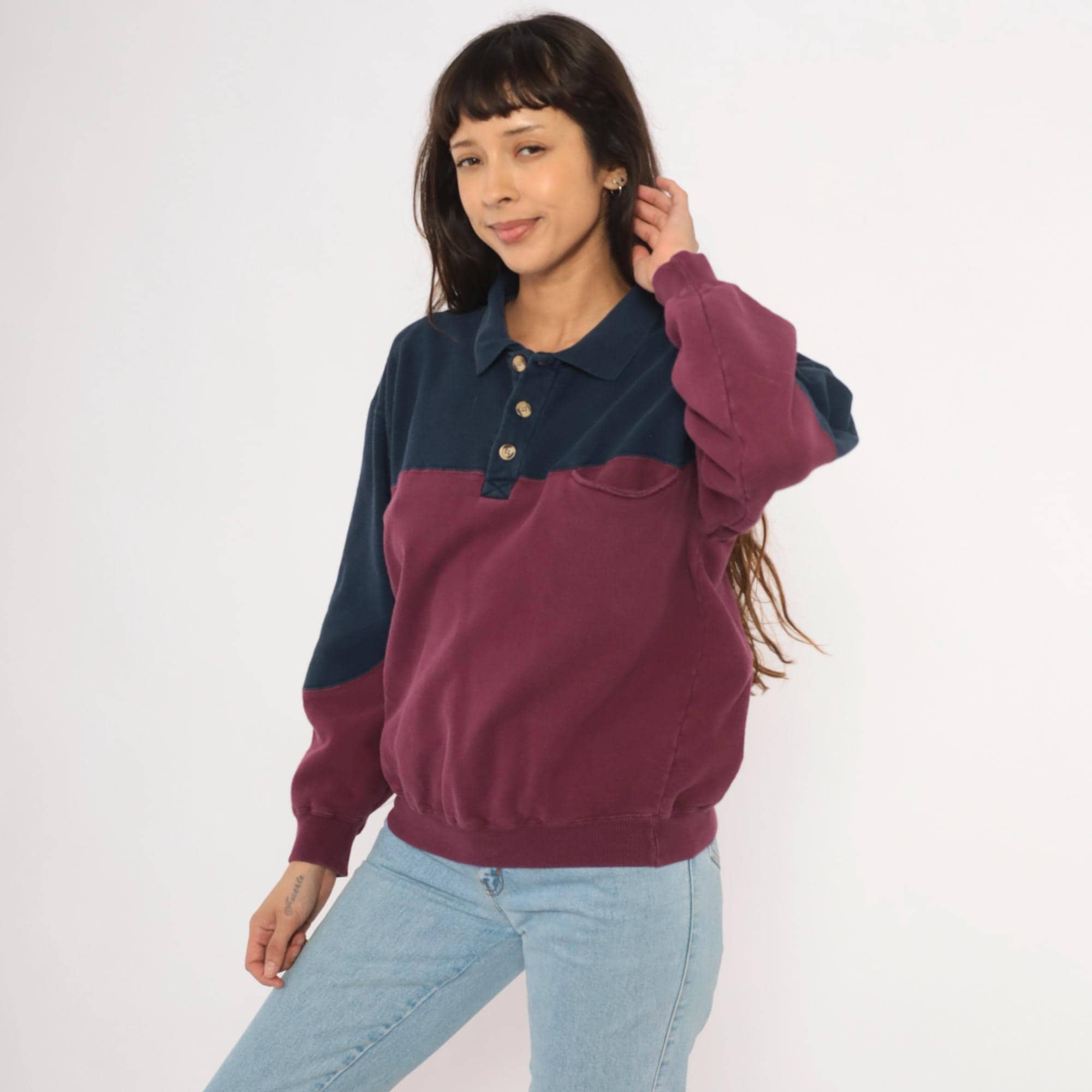 90s navy and burgundy color block polo sweatshirt from Werguard with a flat collar and three-button henley placket. Two-tone construction with a navy upper chest, collar, and sleeves transitioning to a wine-colored body and cuffs. Front patch pocket on the left chest, drop shoulders, and ribbed waistband and cuffs.