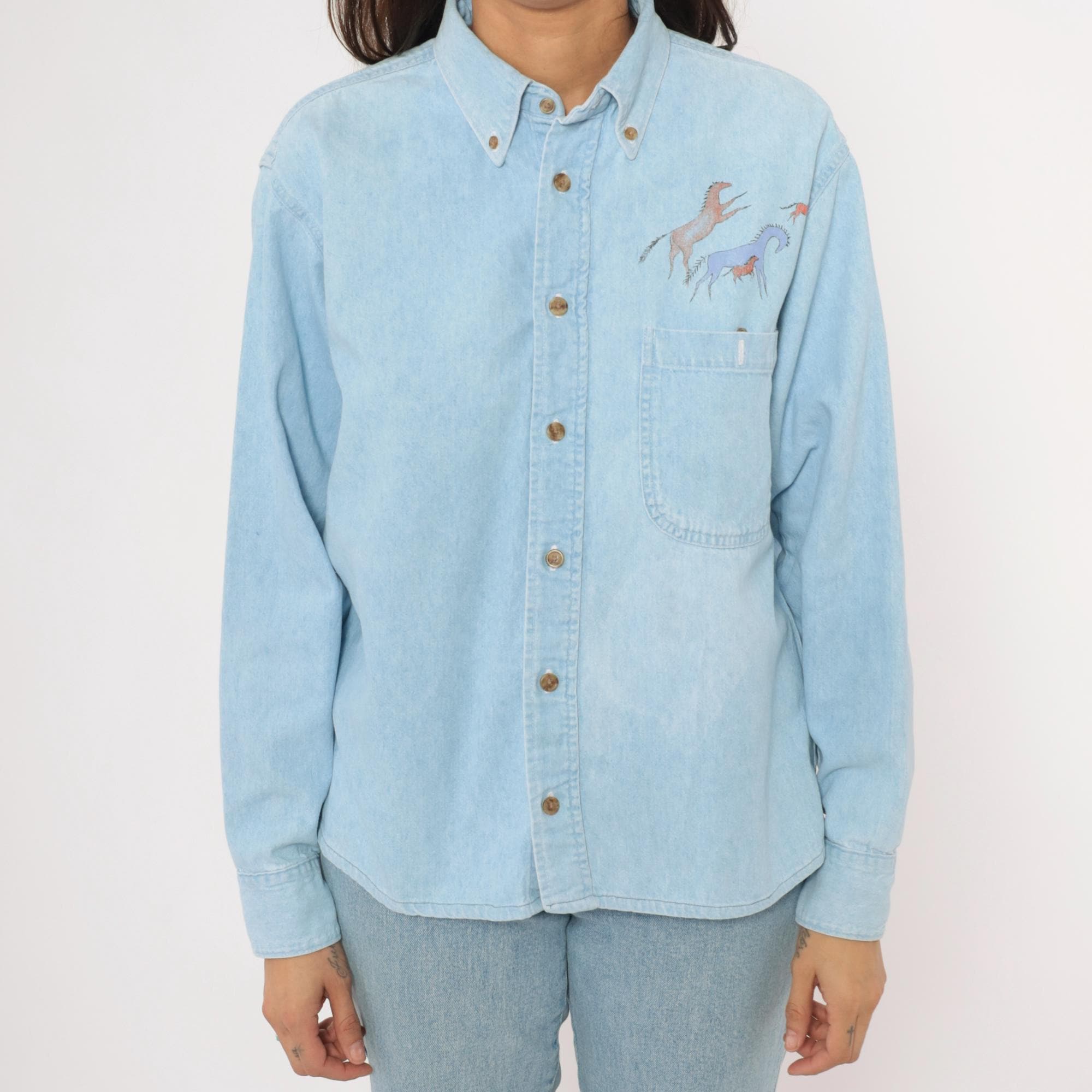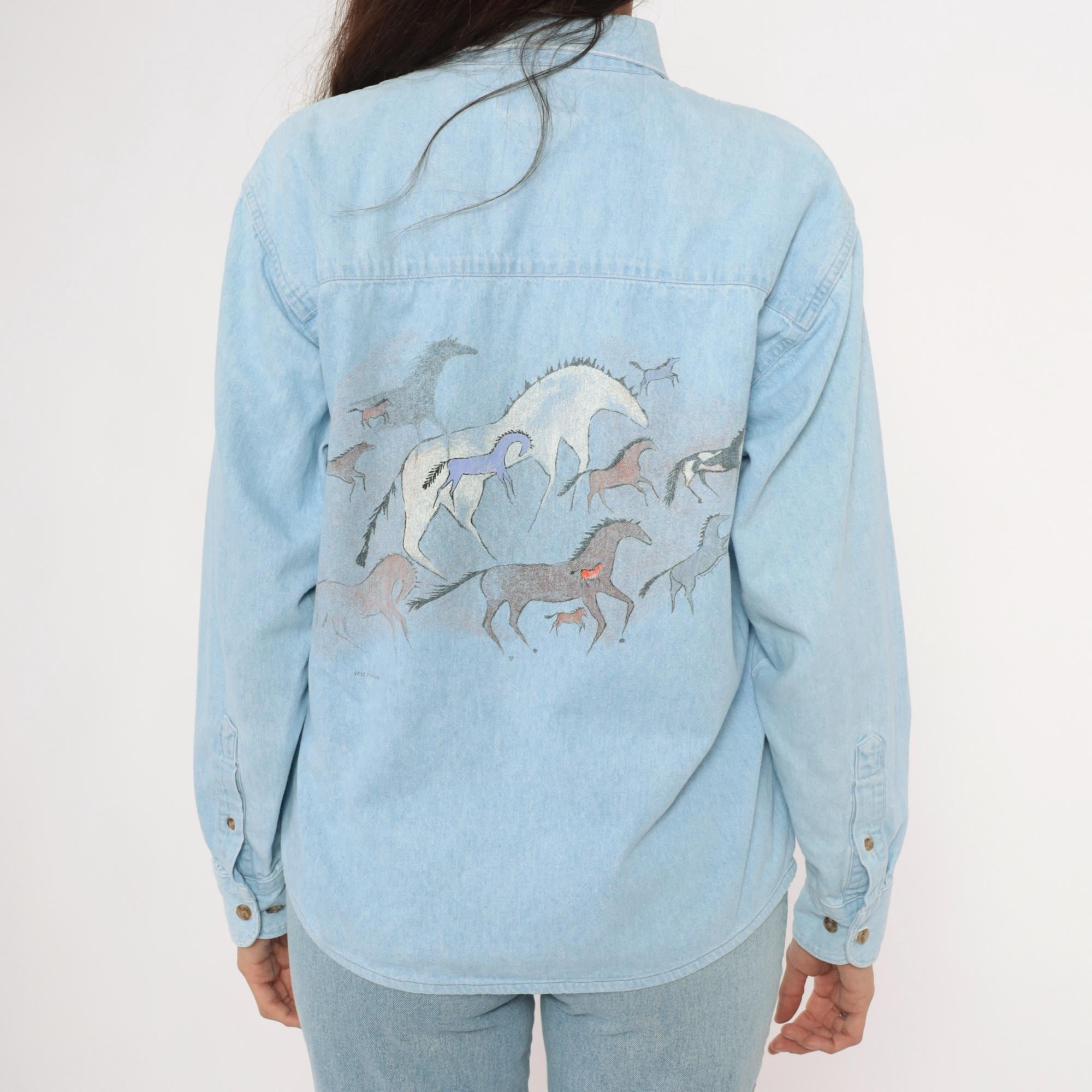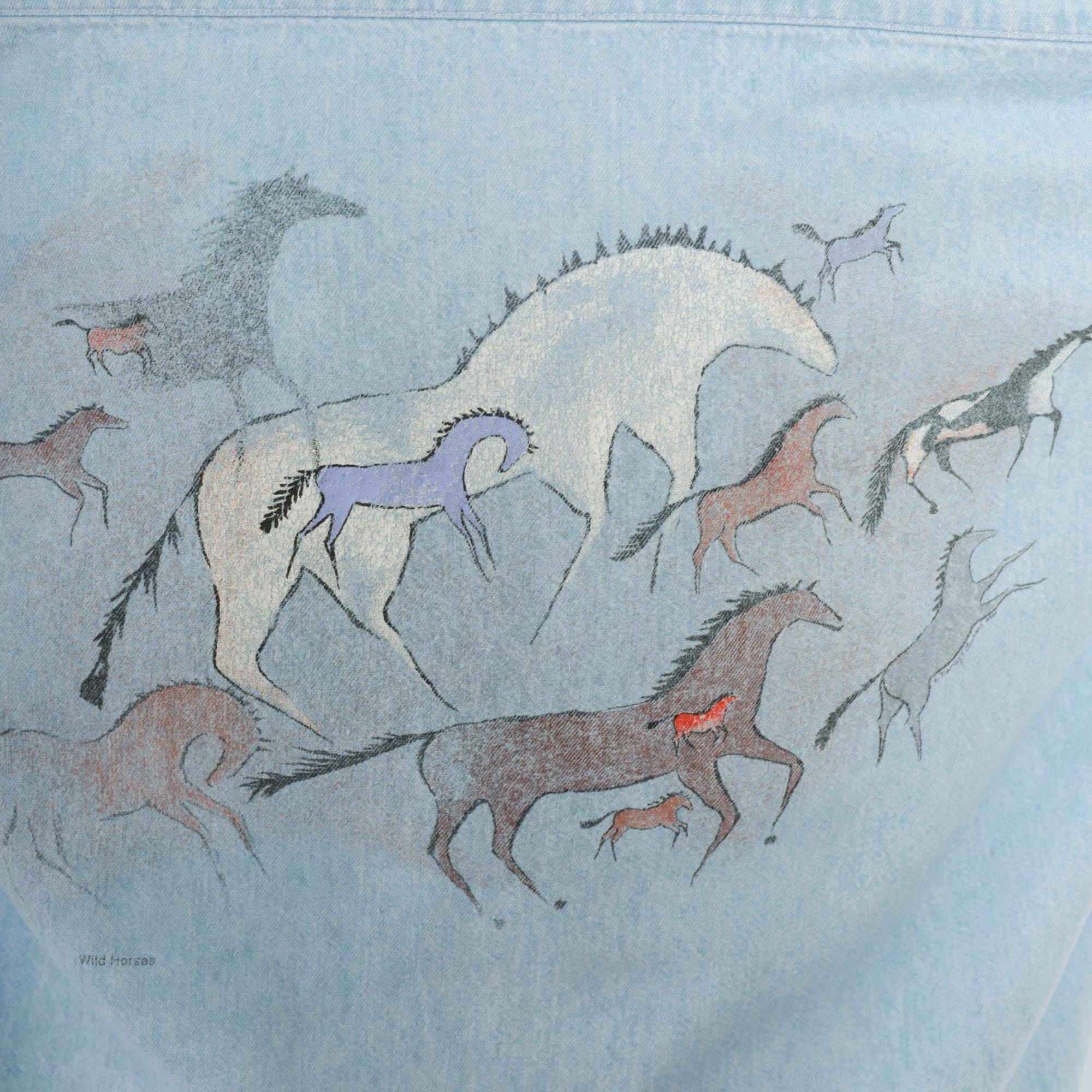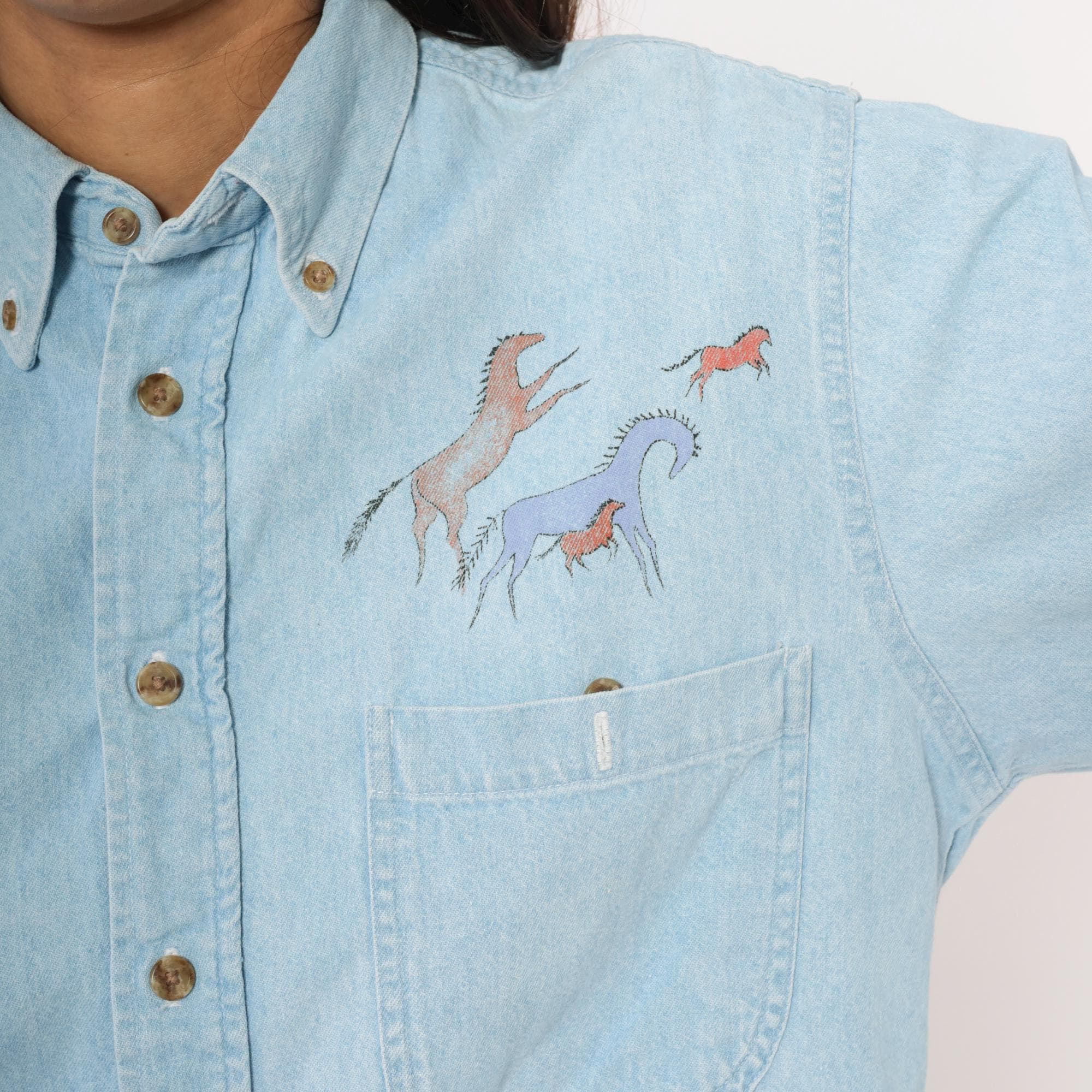 90s light wash denim button-down shirt from Three Rivers with printed and painted horse motifs on the left chest and a large herd scene across the back. Button-down collar, front patch pocket, and copper-tone button closures down the front and at the cuffs. Stylized horses in muted pink, lavender, brown, and white.
