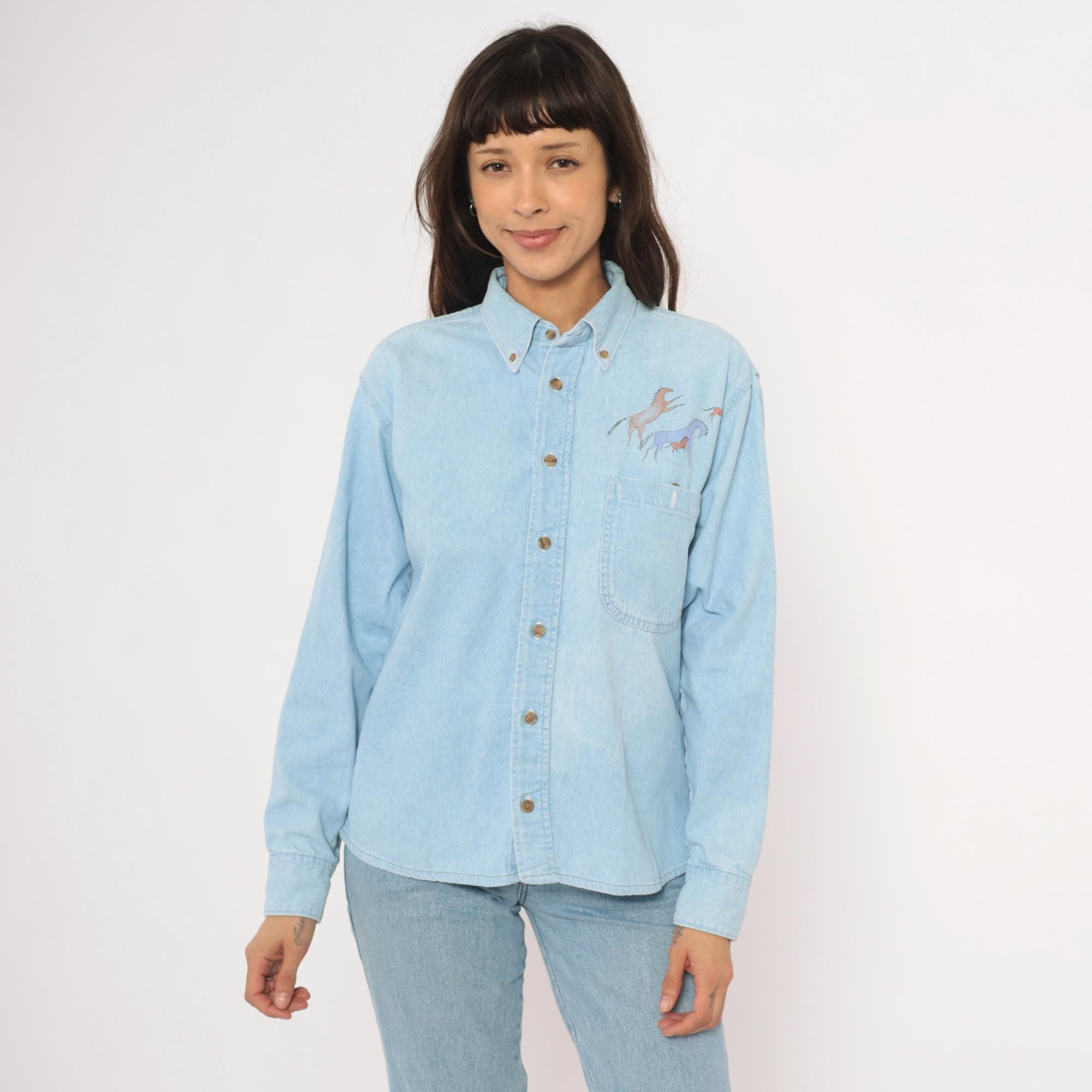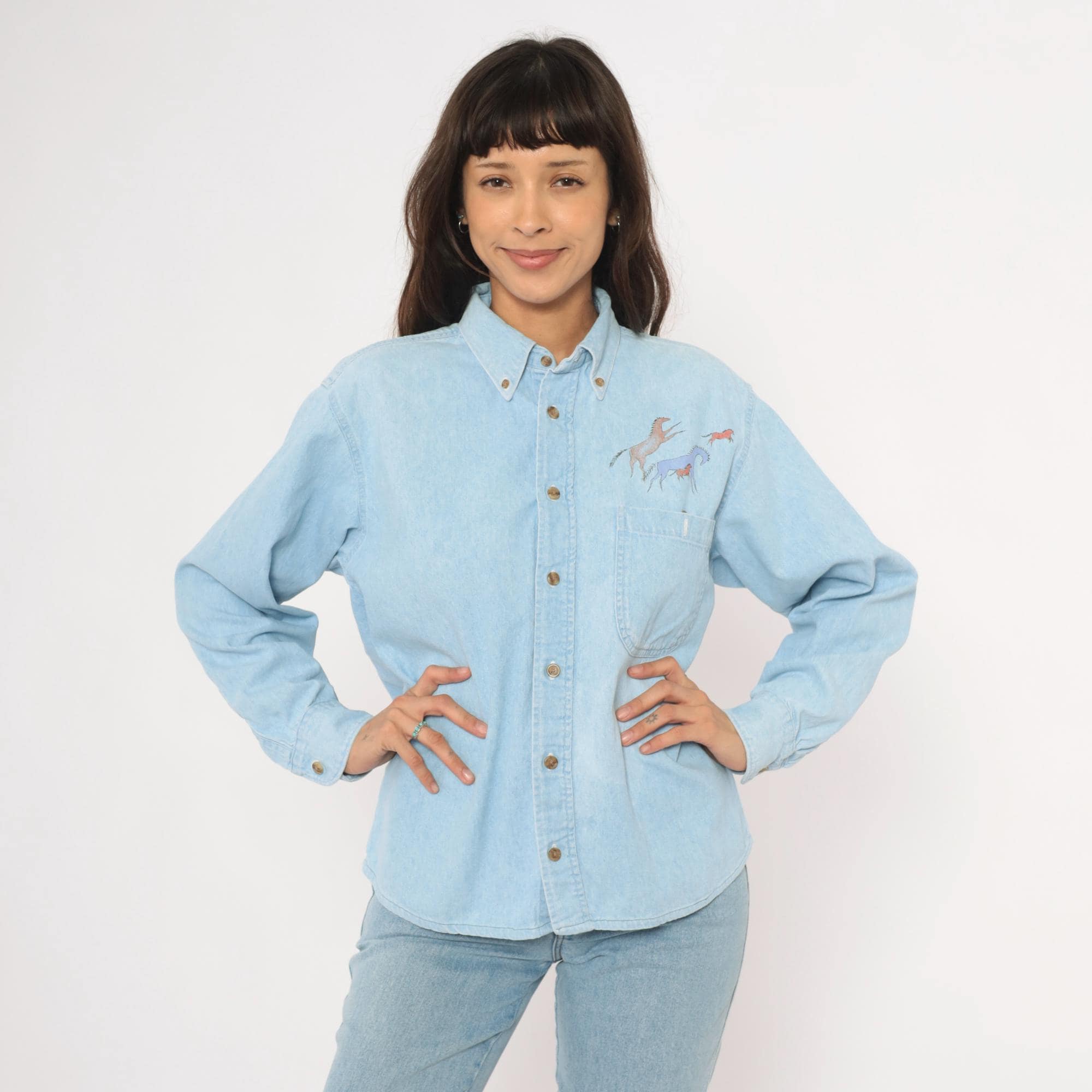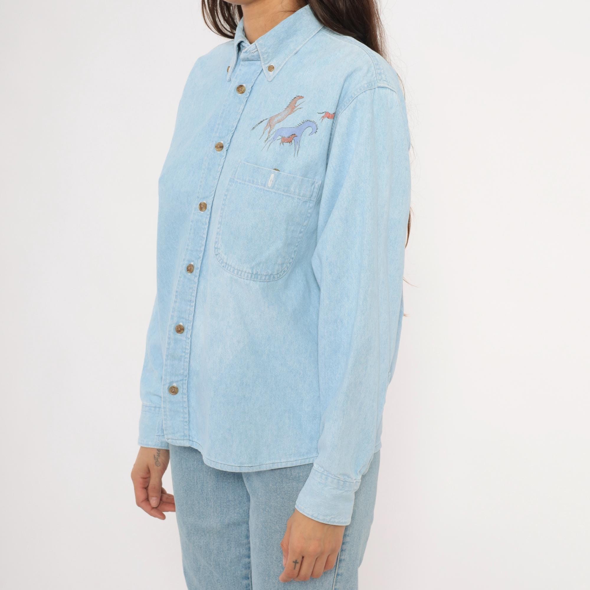90s light wash denim button-down shirt from Three Rivers with printed and painted horse motifs on the left chest and a large herd scene across the back. Button-down collar, front patch pocket, and copper-tone button closures down the front and at the cuffs. Stylized horses in muted pink, lavender, brown, and white.