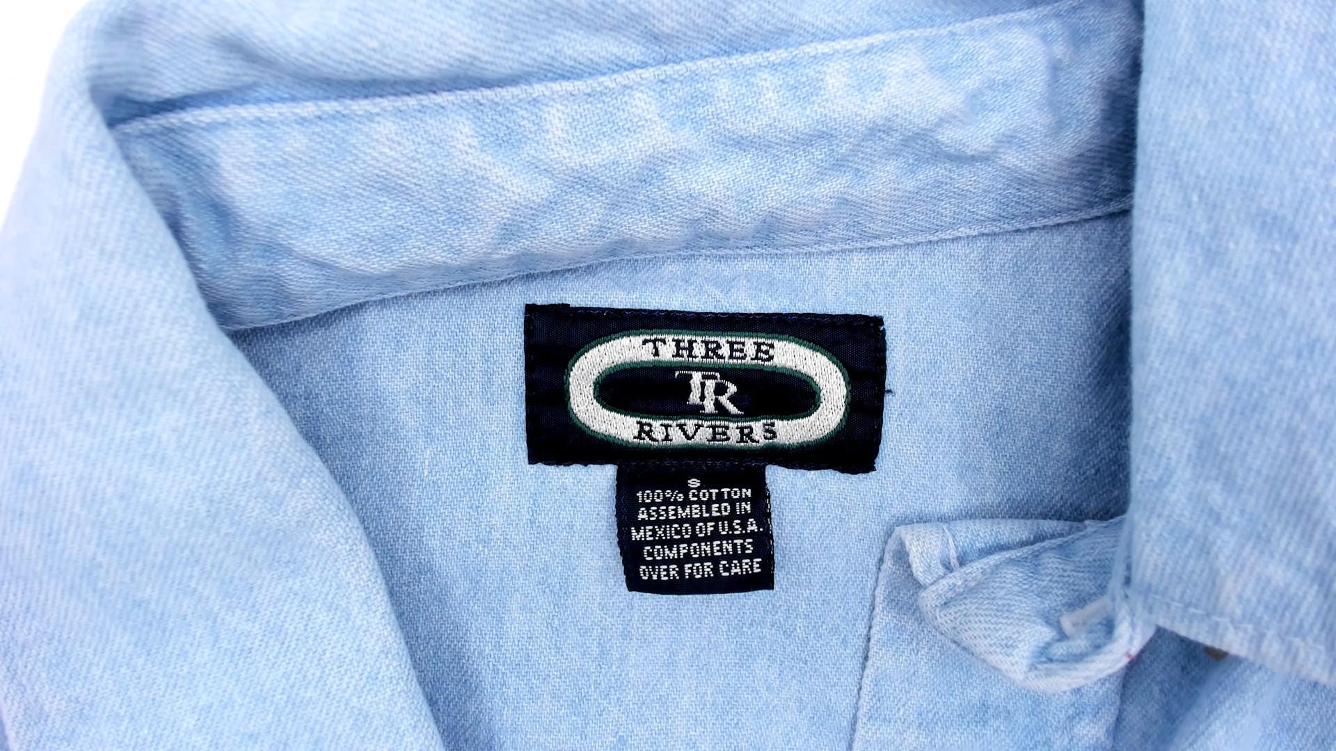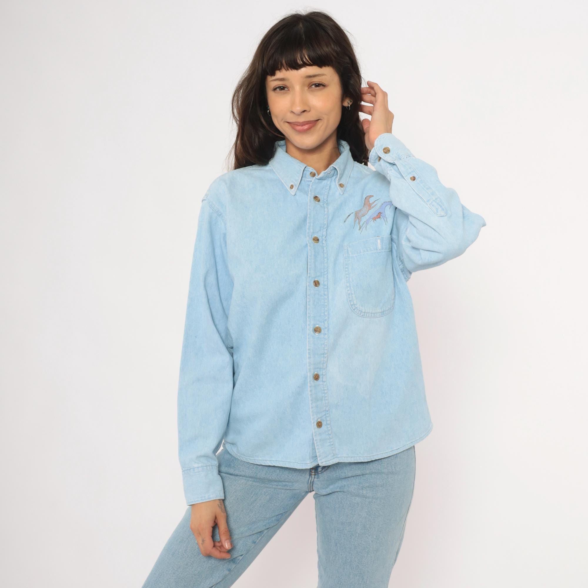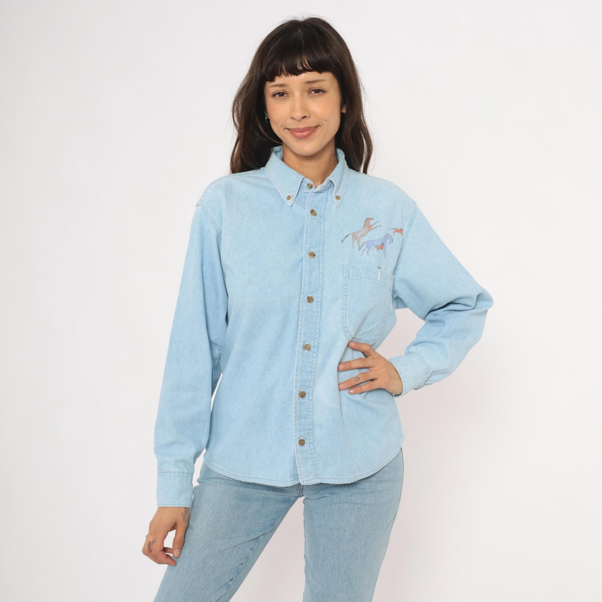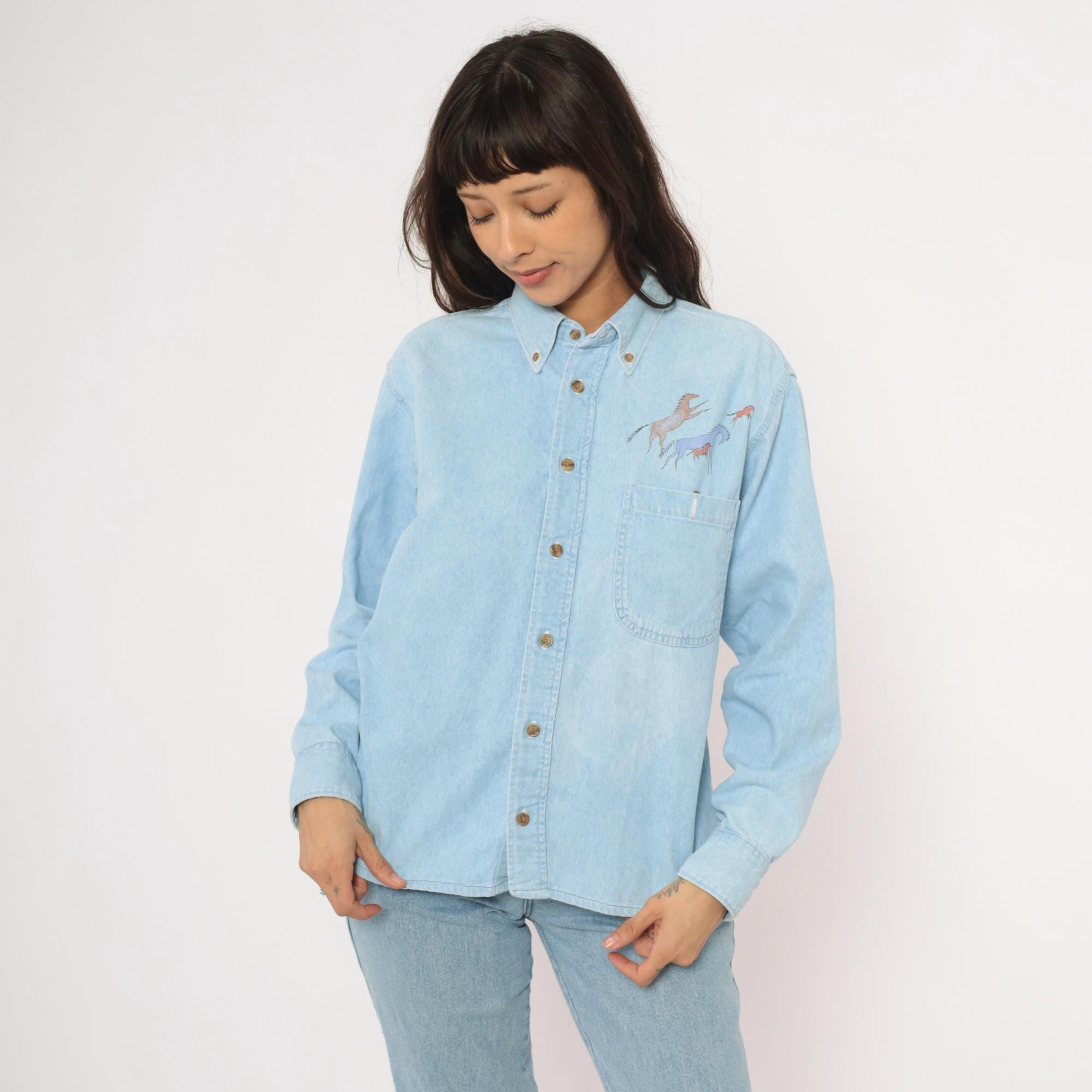 90s light wash denim button-down shirt from Three Rivers with printed and painted horse motifs on the left chest and a large herd scene across the back. Button-down collar, front patch pocket, and copper-tone button closures down the front and at the cuffs. Stylized horses in muted pink, lavender, brown, and white.