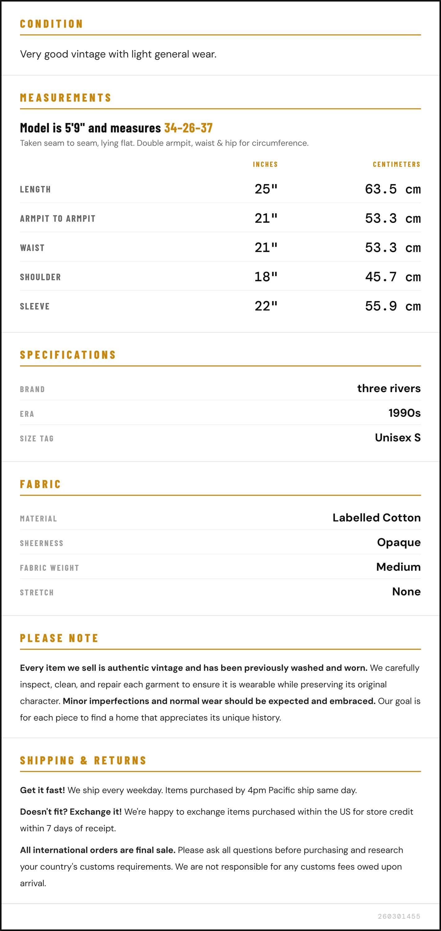 Vintage denim was usually made without any stretch, unlike modern jeans. Check the measurements to ensure proper fit, and remember to give yourself a little wiggle room in the waist and hips, depending on your preferred fit.