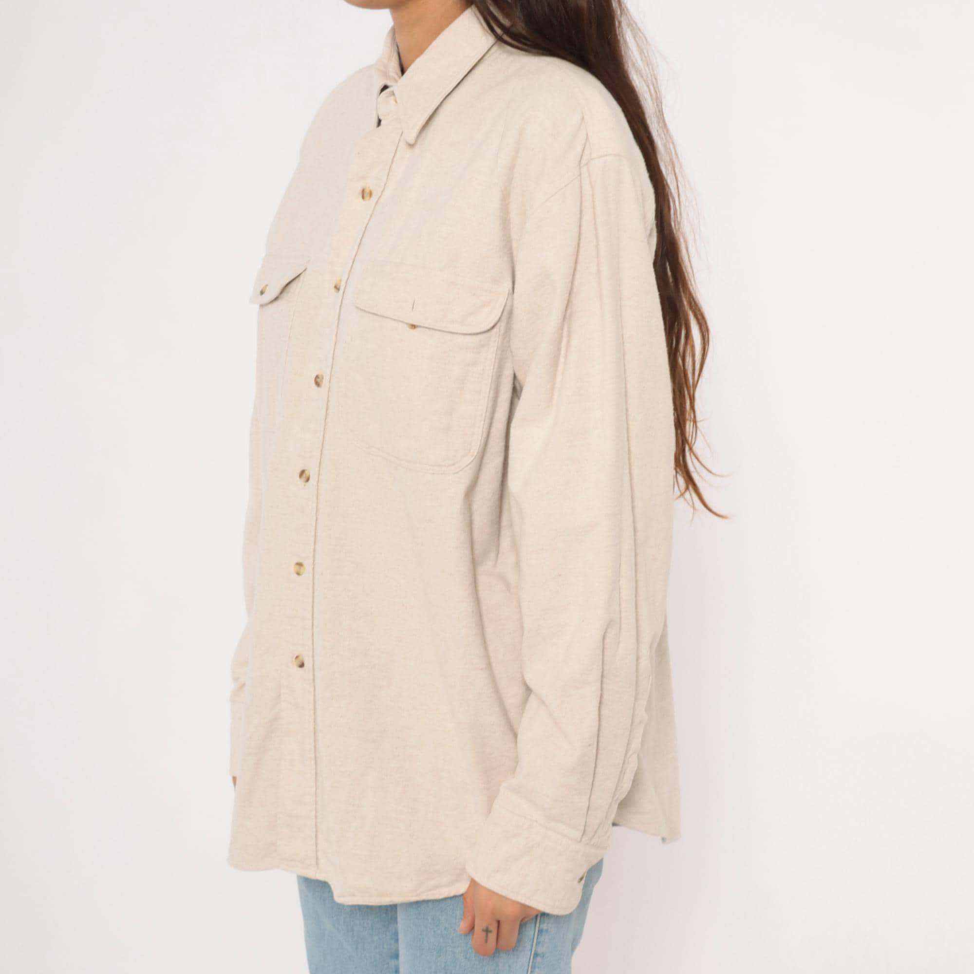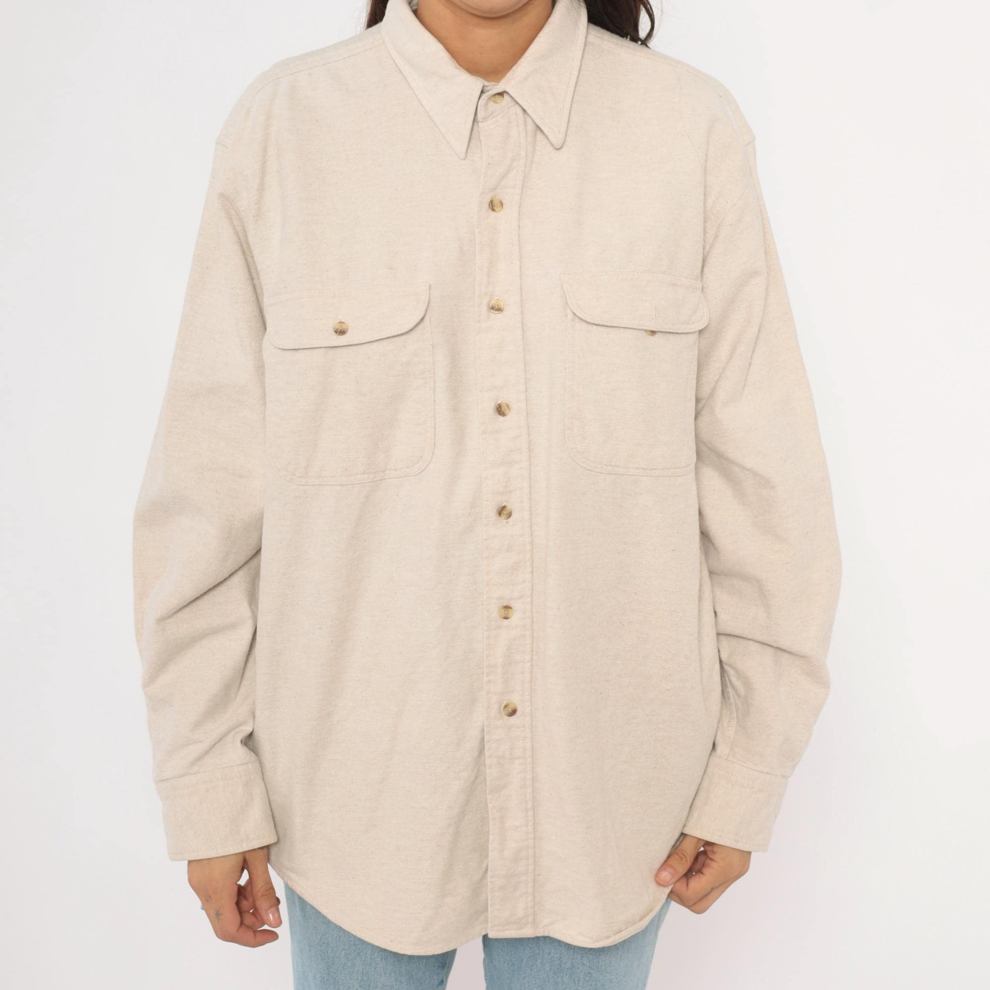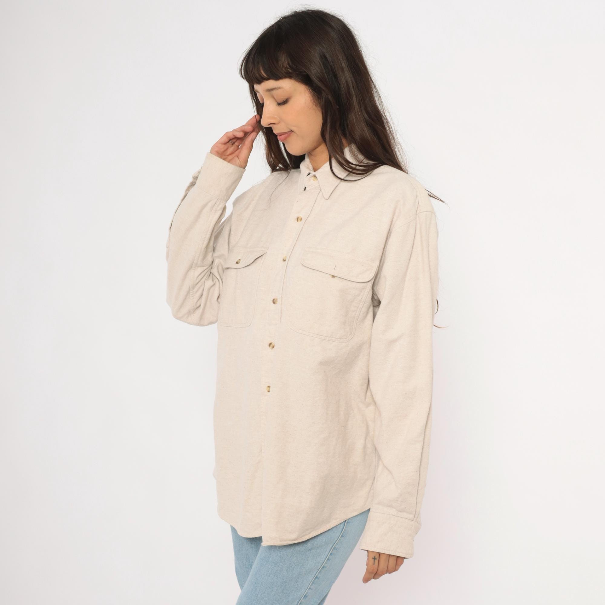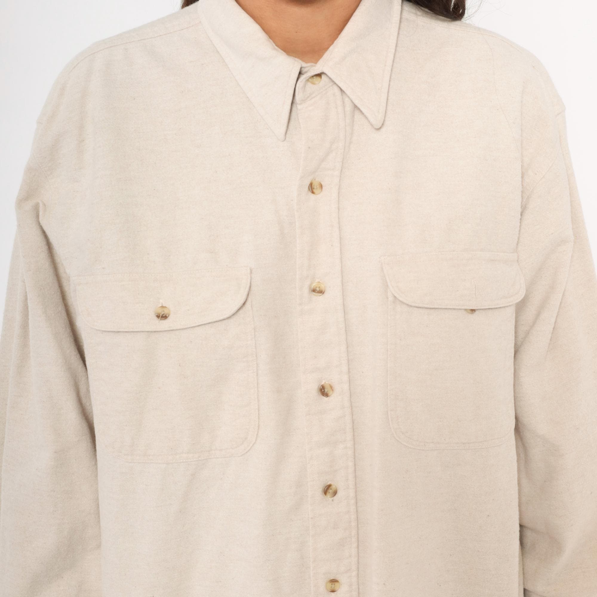 90s cream flannel shirt from Appalachian Trail with a pointed collar and full button front closure. Two chest patch pockets with buttoned flaps and long sleeves with buttoned cuffs. Solid oatmeal tone throughout with a relaxed, straight cut and curved hem.