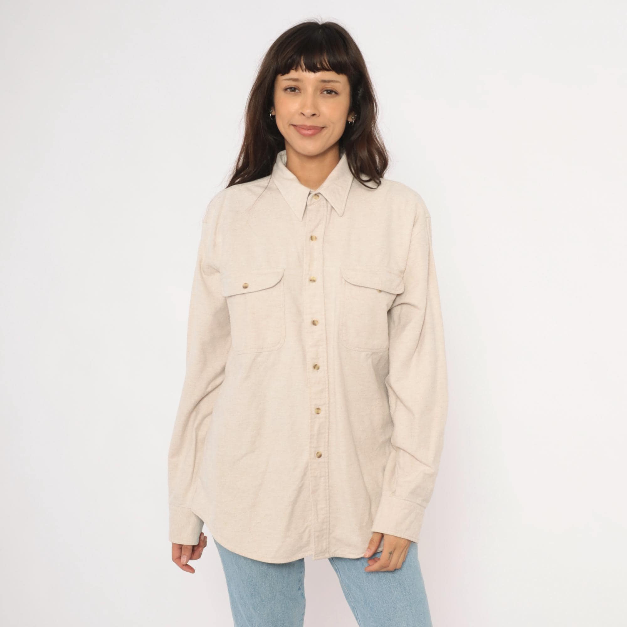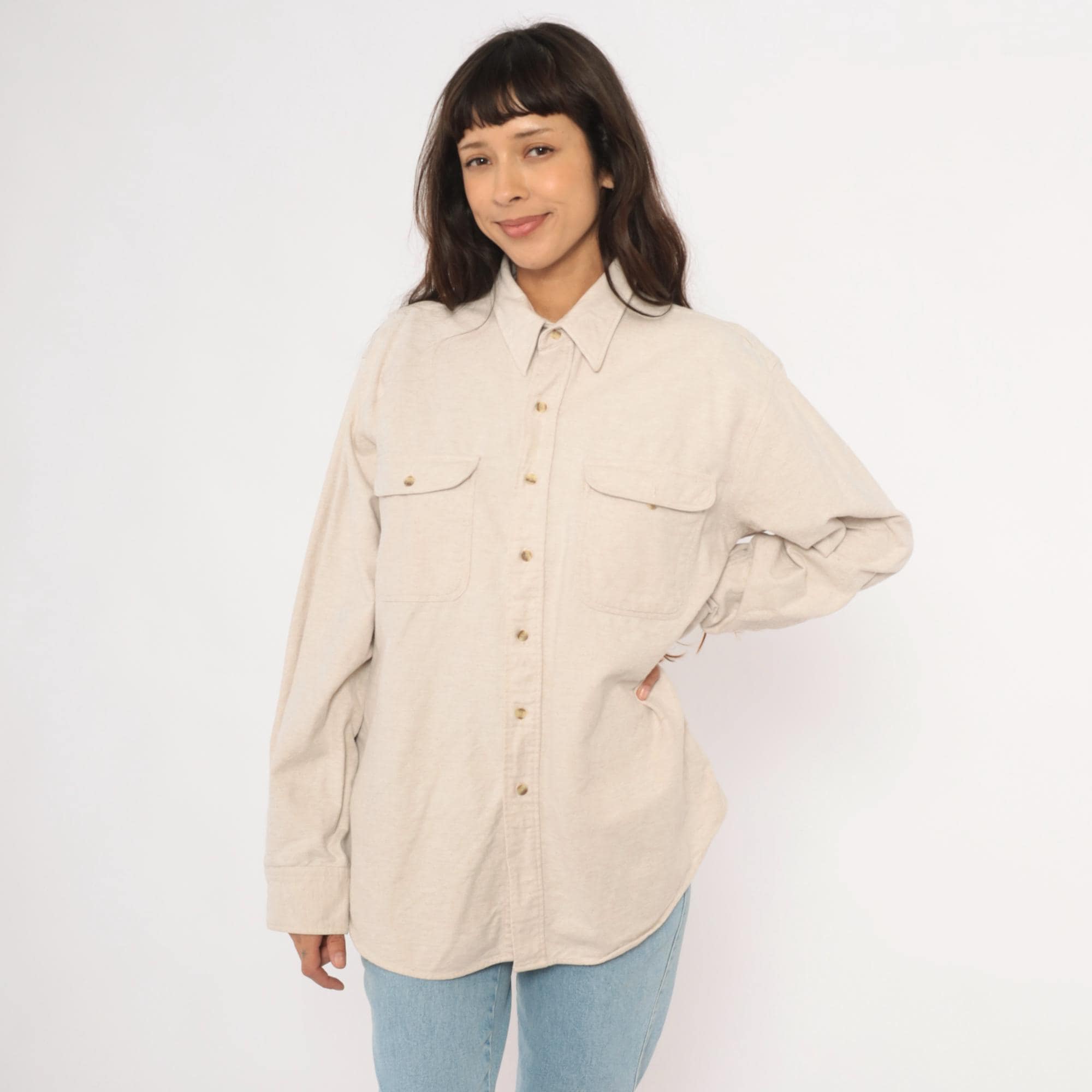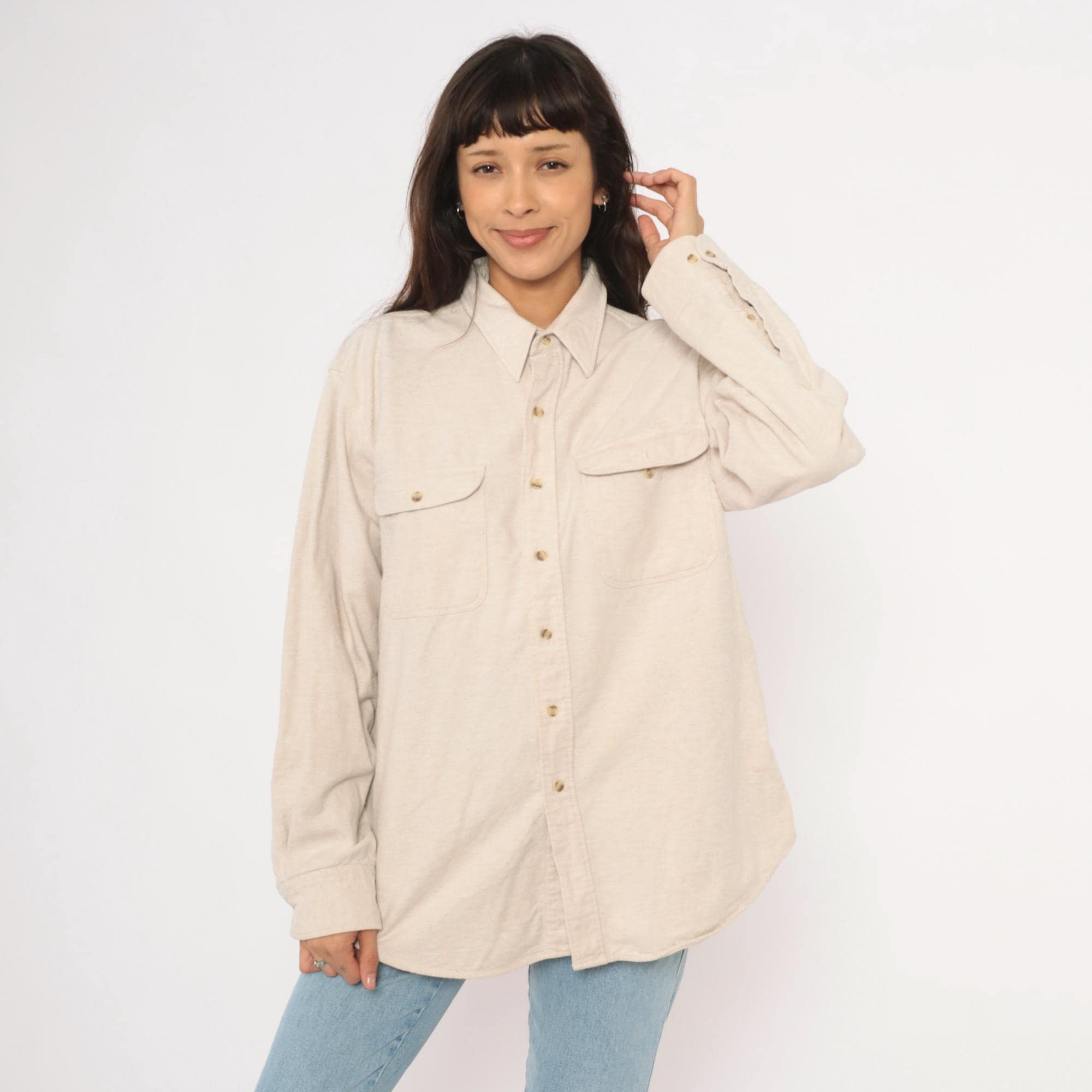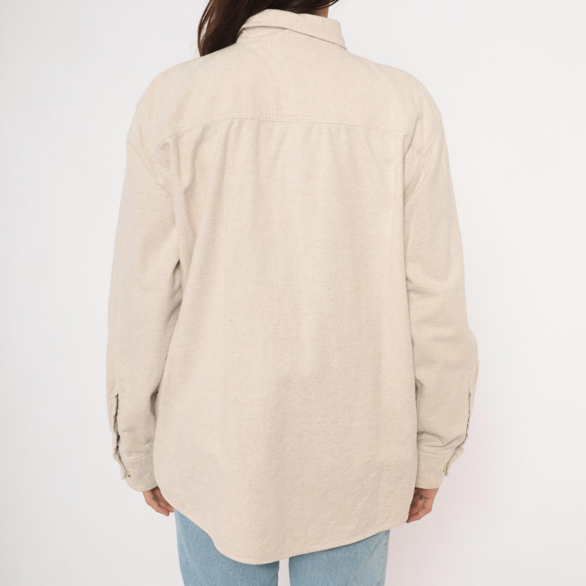 90s cream flannel shirt from Appalachian Trail with a pointed collar and full button front closure. Two chest patch pockets with buttoned flaps and long sleeves with buttoned cuffs. Solid oatmeal tone throughout with a relaxed, straight cut and curved hem.