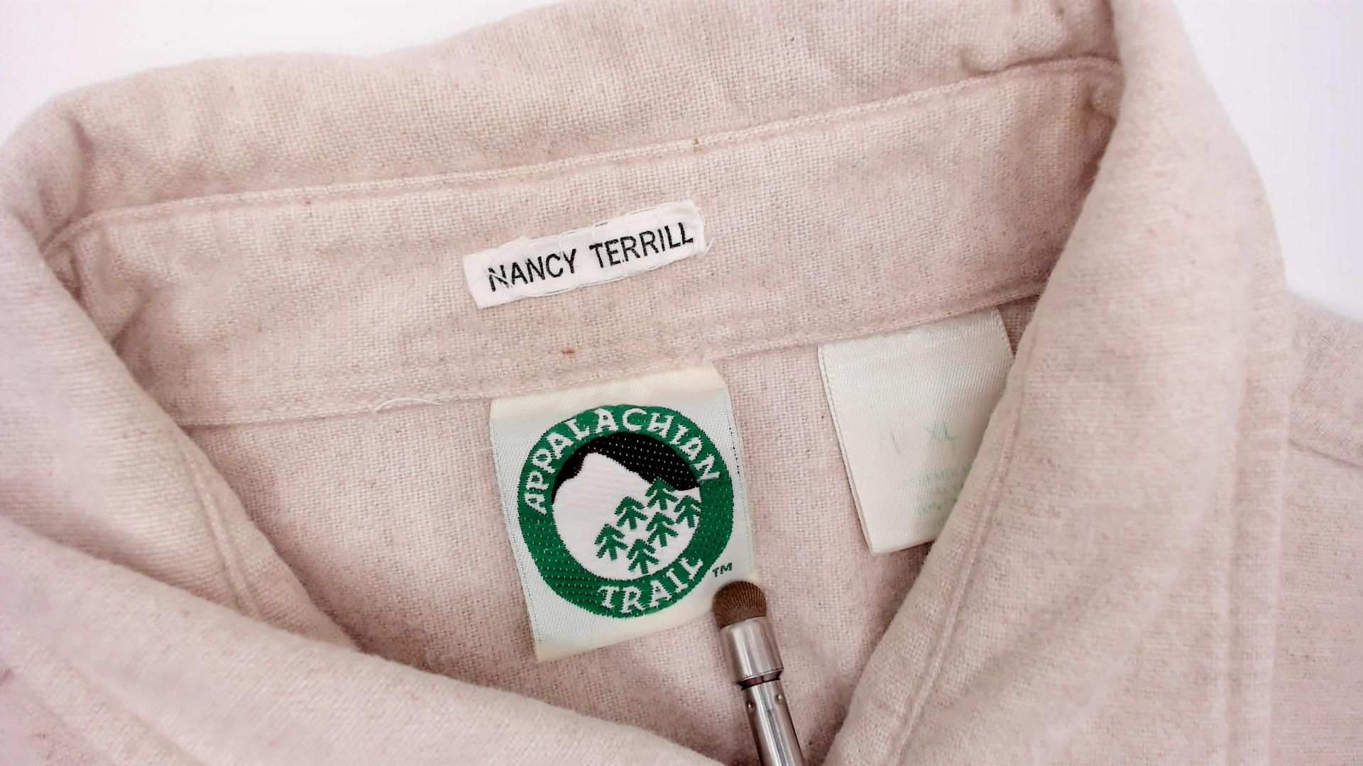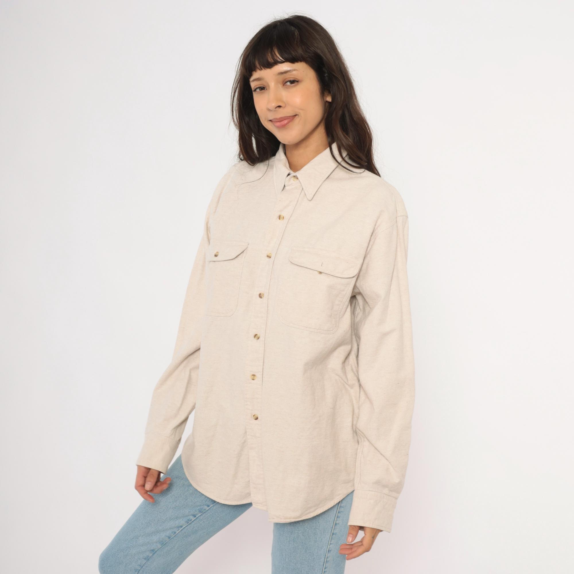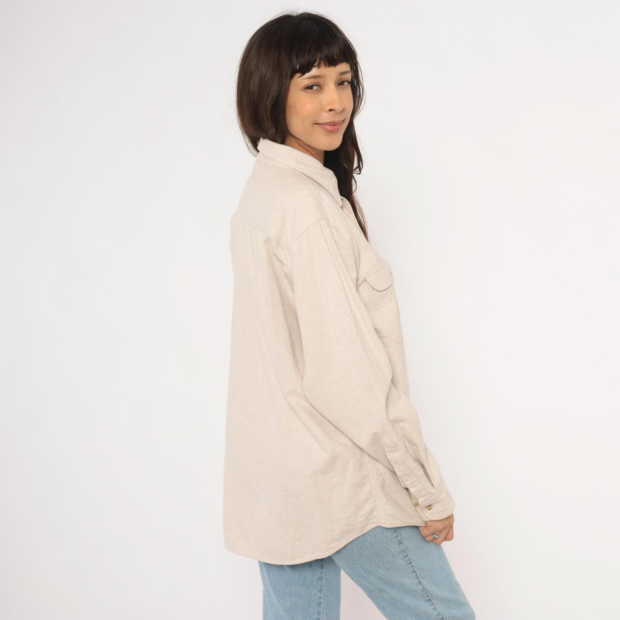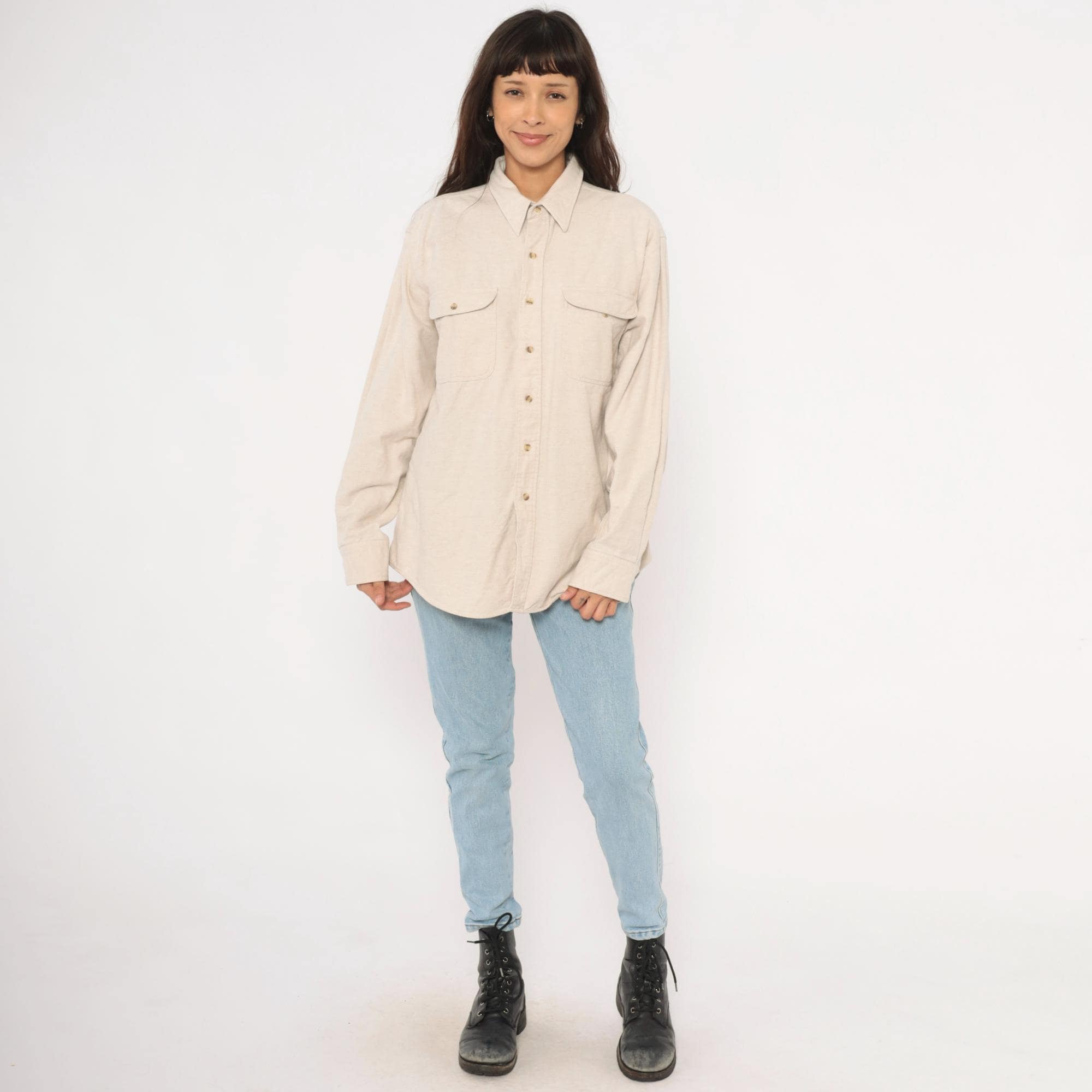 90s cream flannel shirt from Appalachian Trail with a pointed collar and full button front closure. Two chest patch pockets with buttoned flaps and long sleeves with buttoned cuffs. Solid oatmeal tone throughout with a relaxed, straight cut and curved hem.
