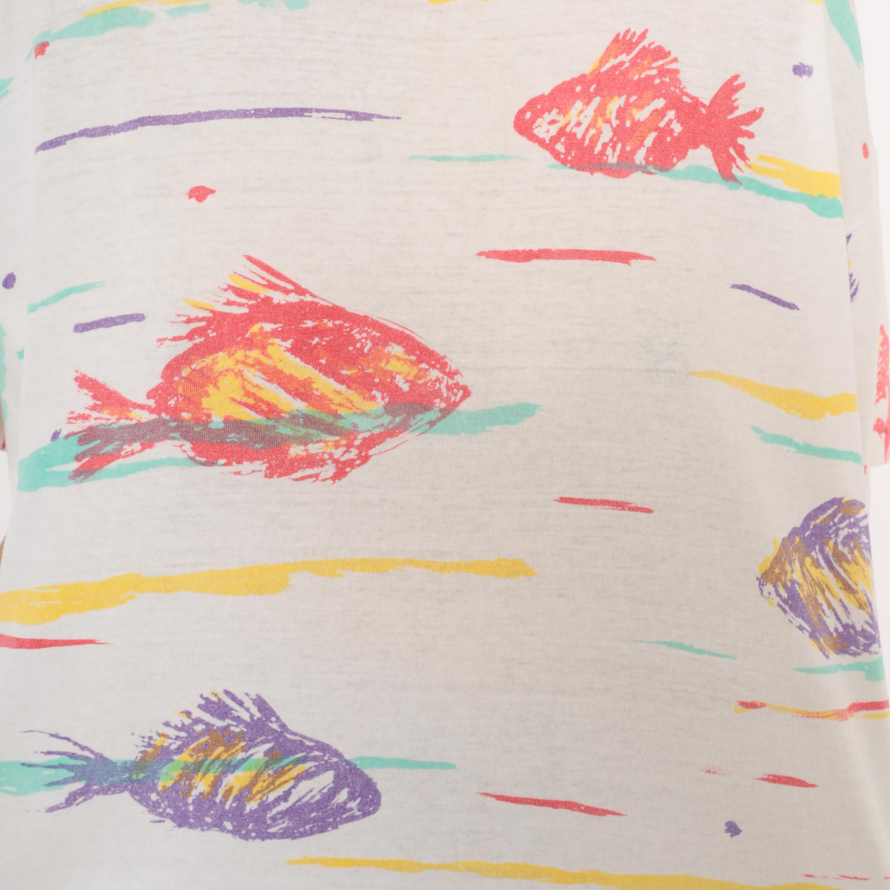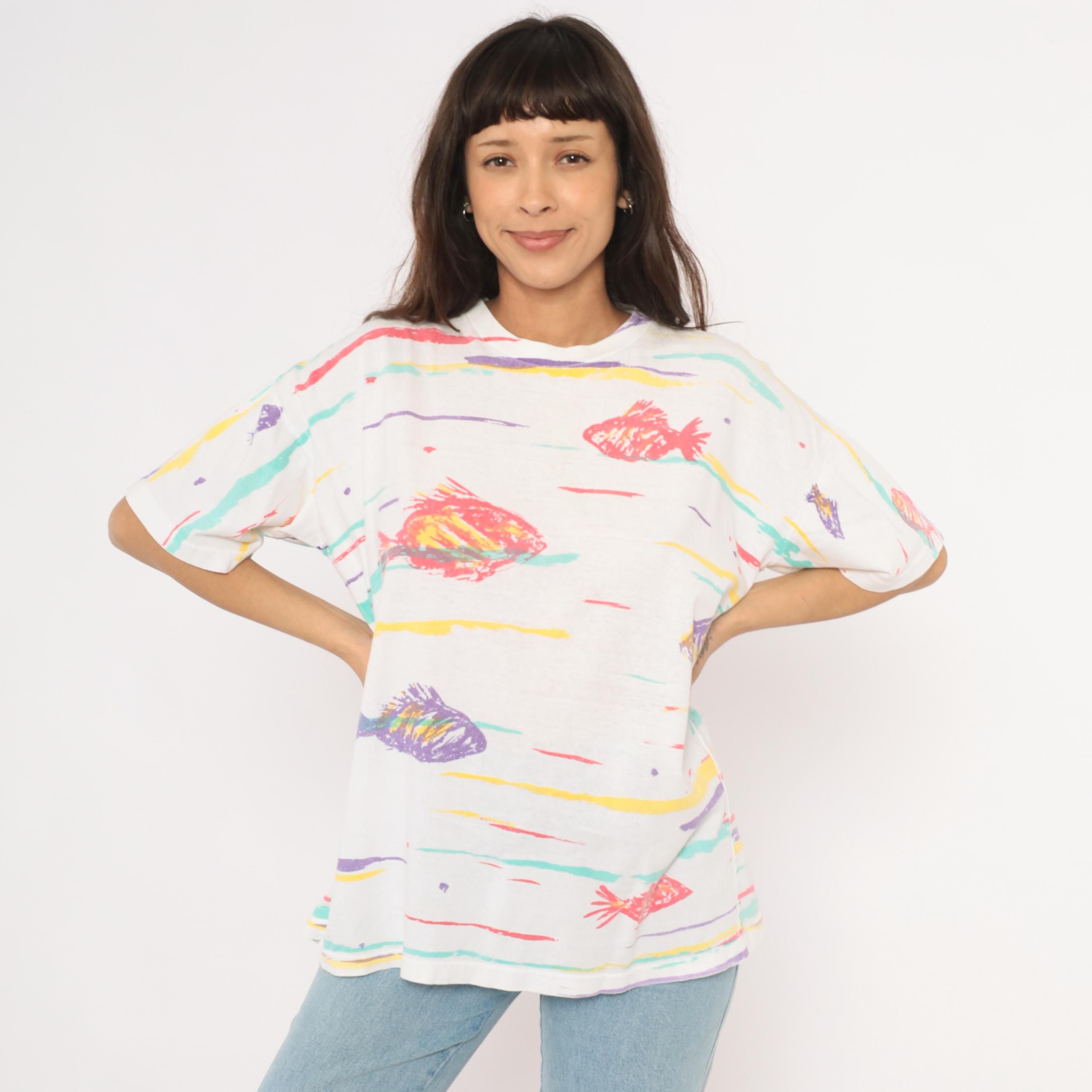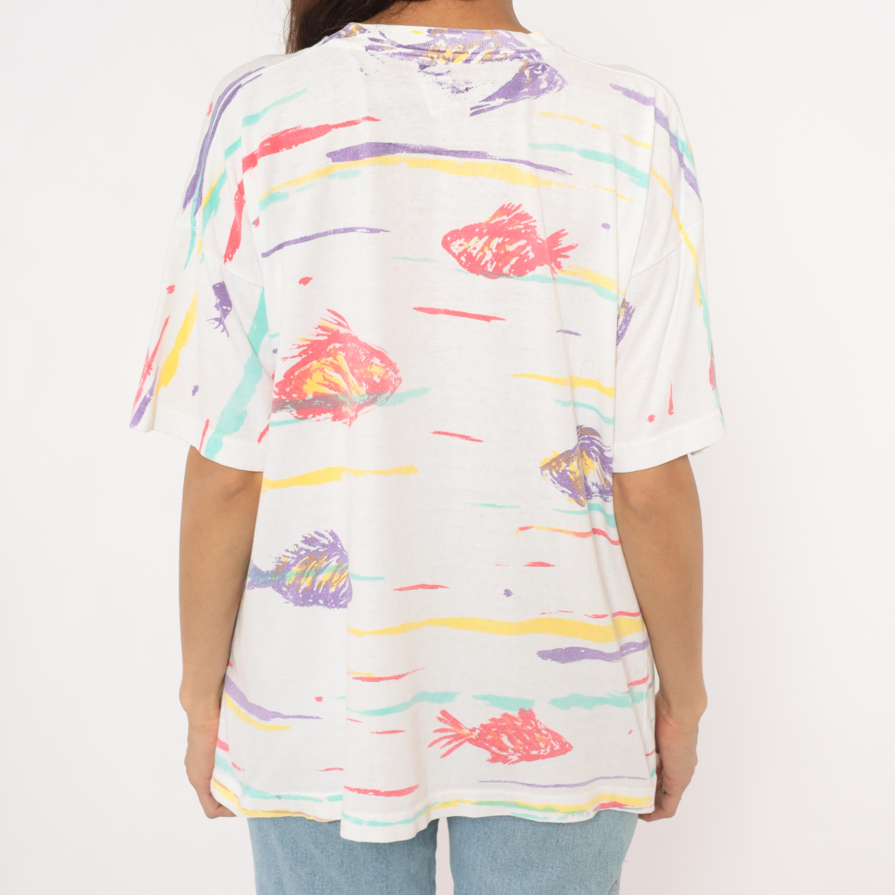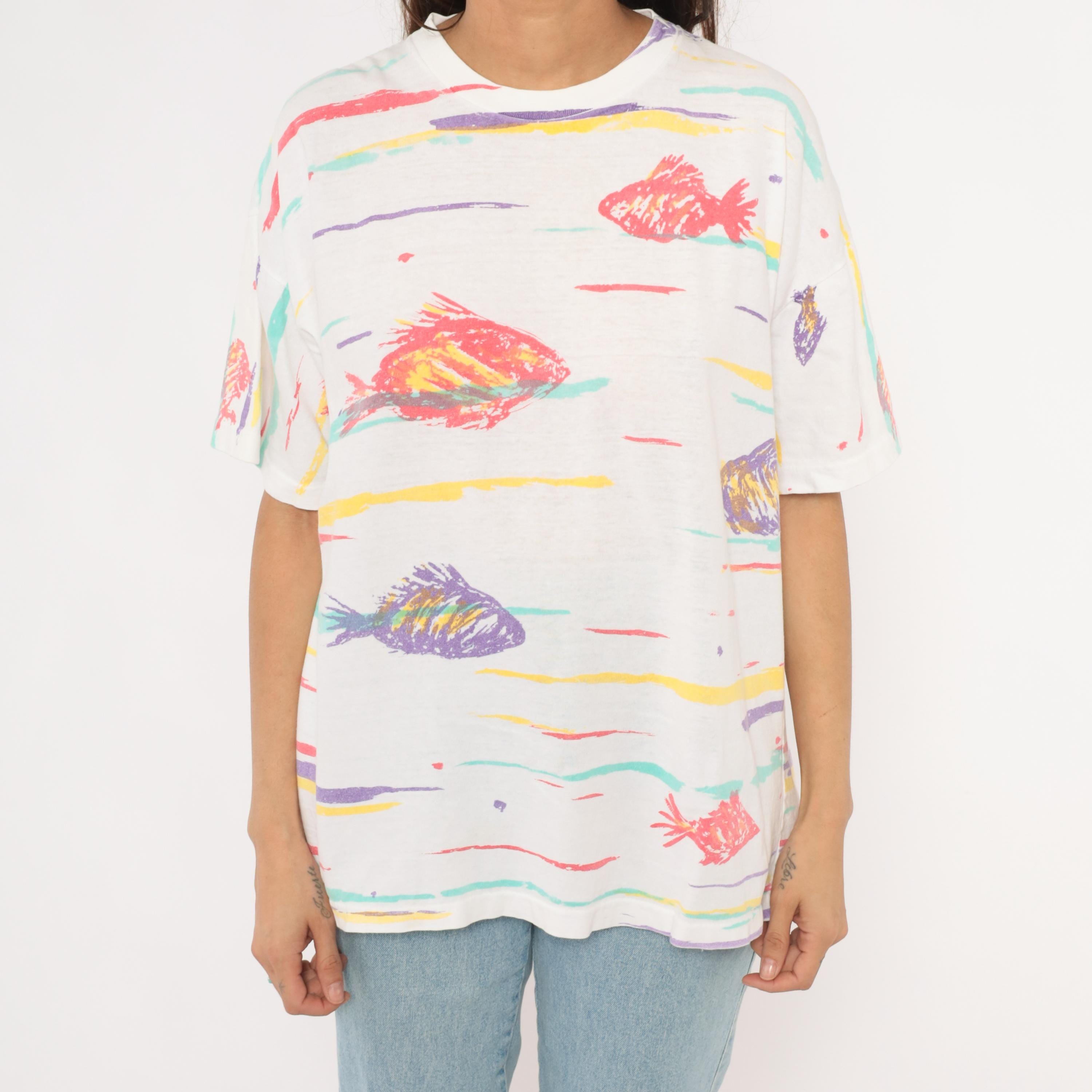90s white crew neck tee with an allover painterly fish print in coral red, purple, yellow, and seafoam green. Tropical fish in various sizes swim across the fabric alongside brushstroke wave lines in coordinating colors.