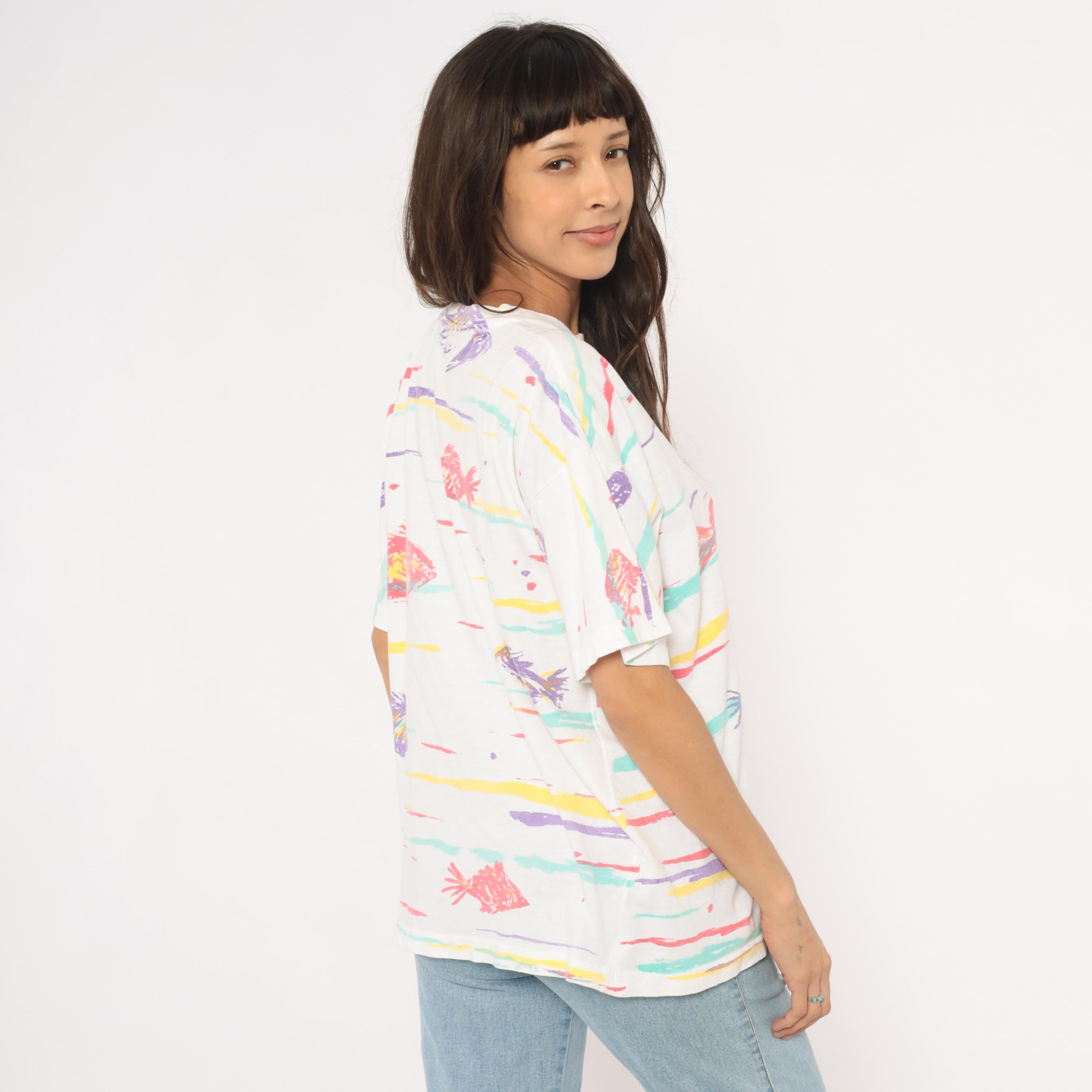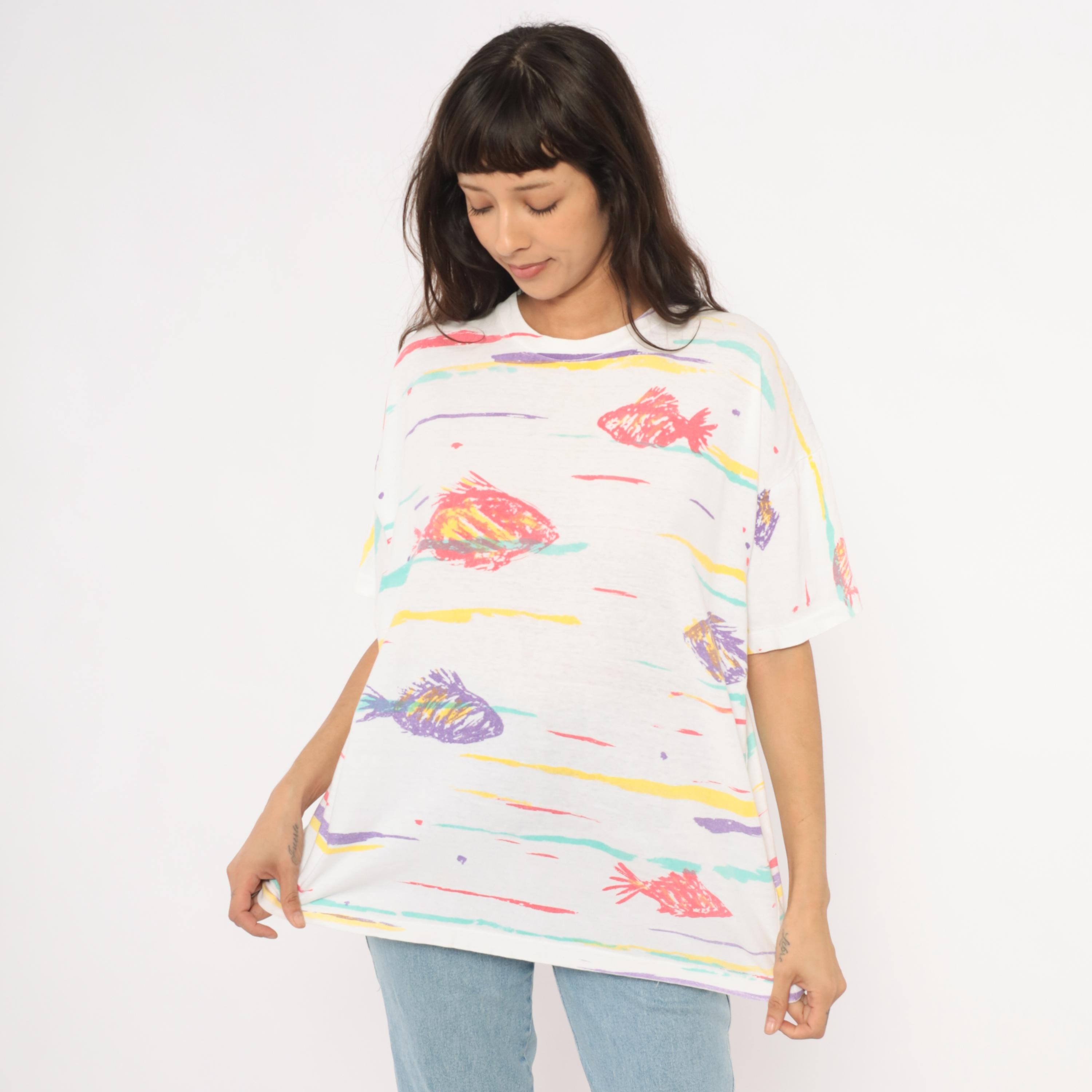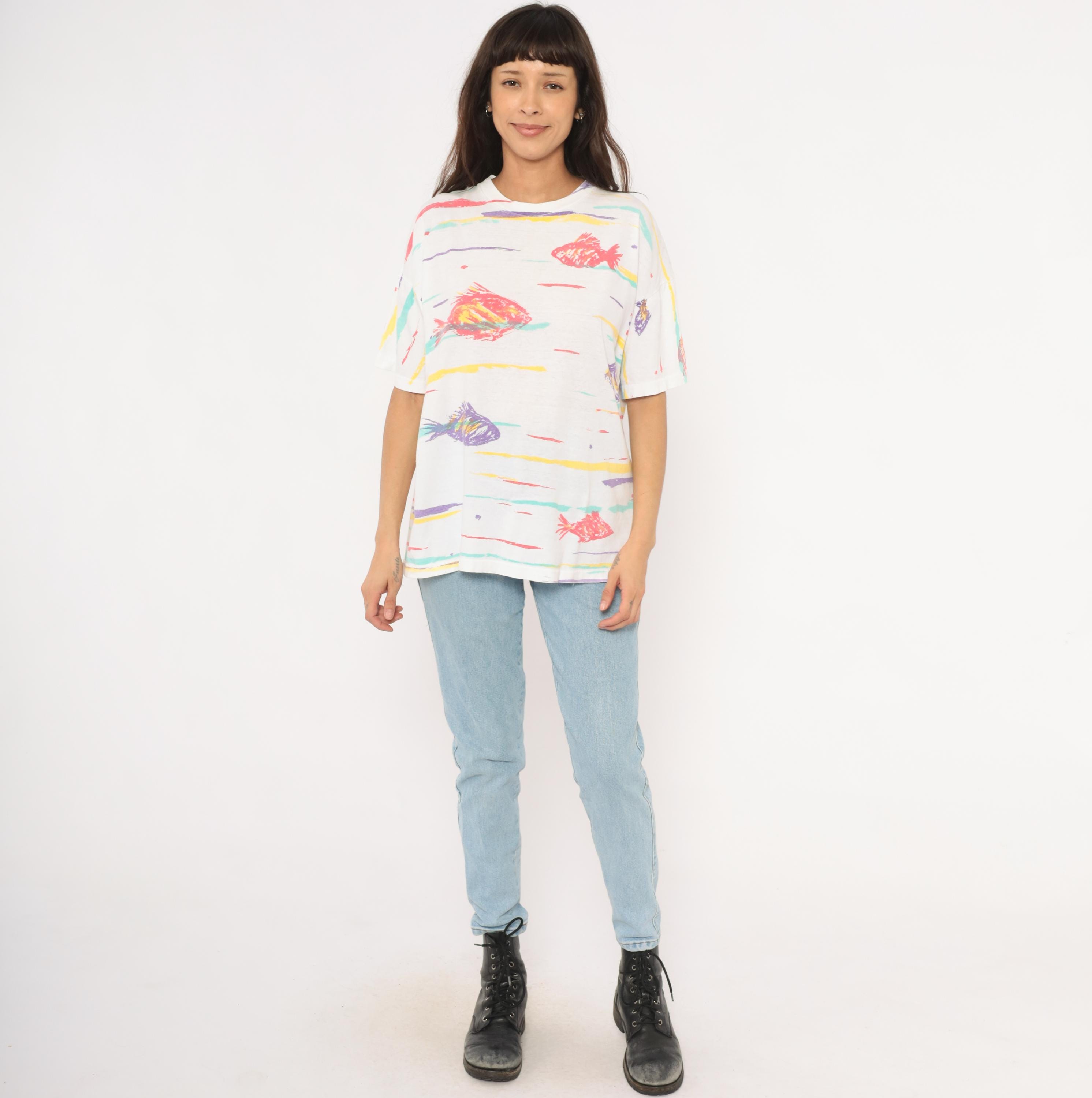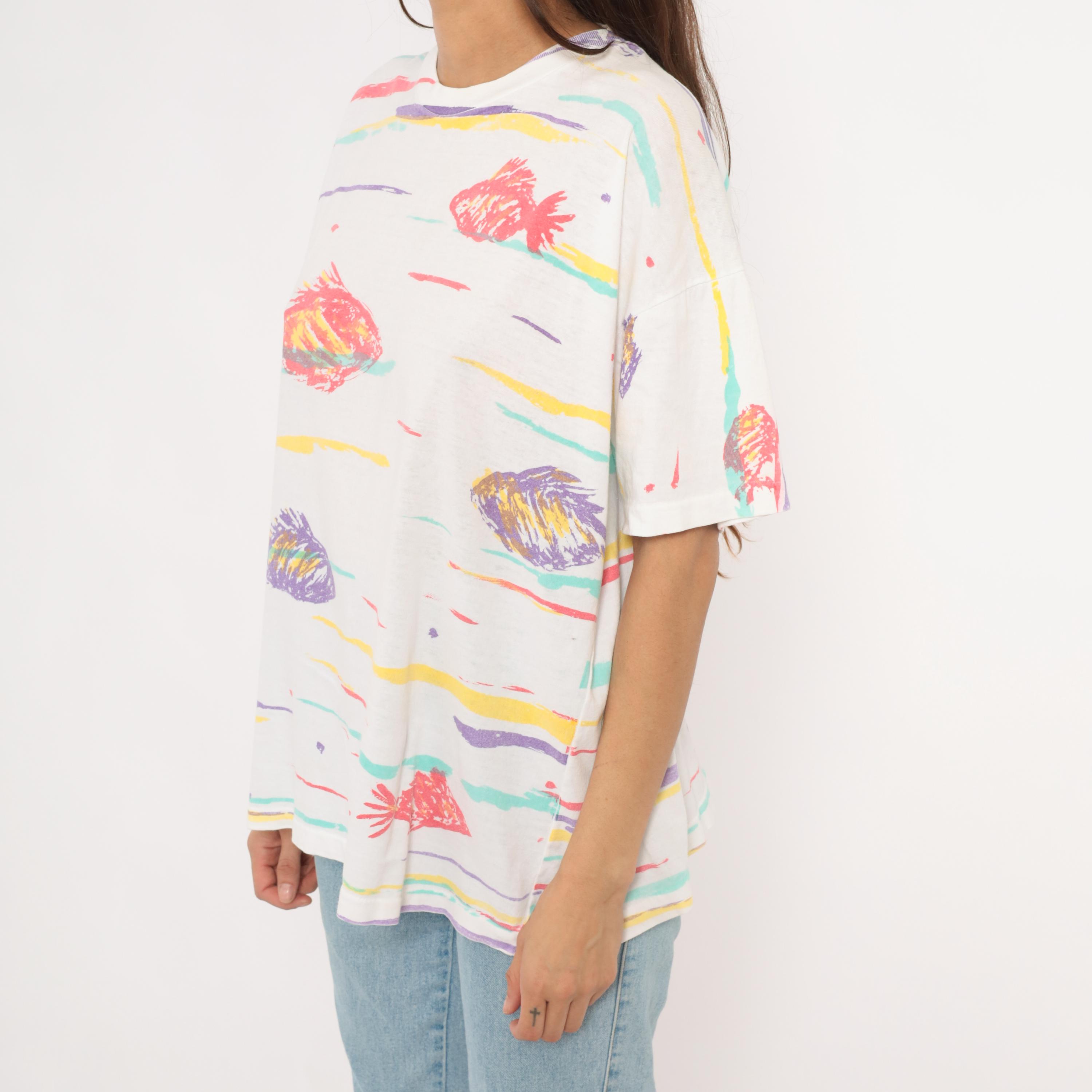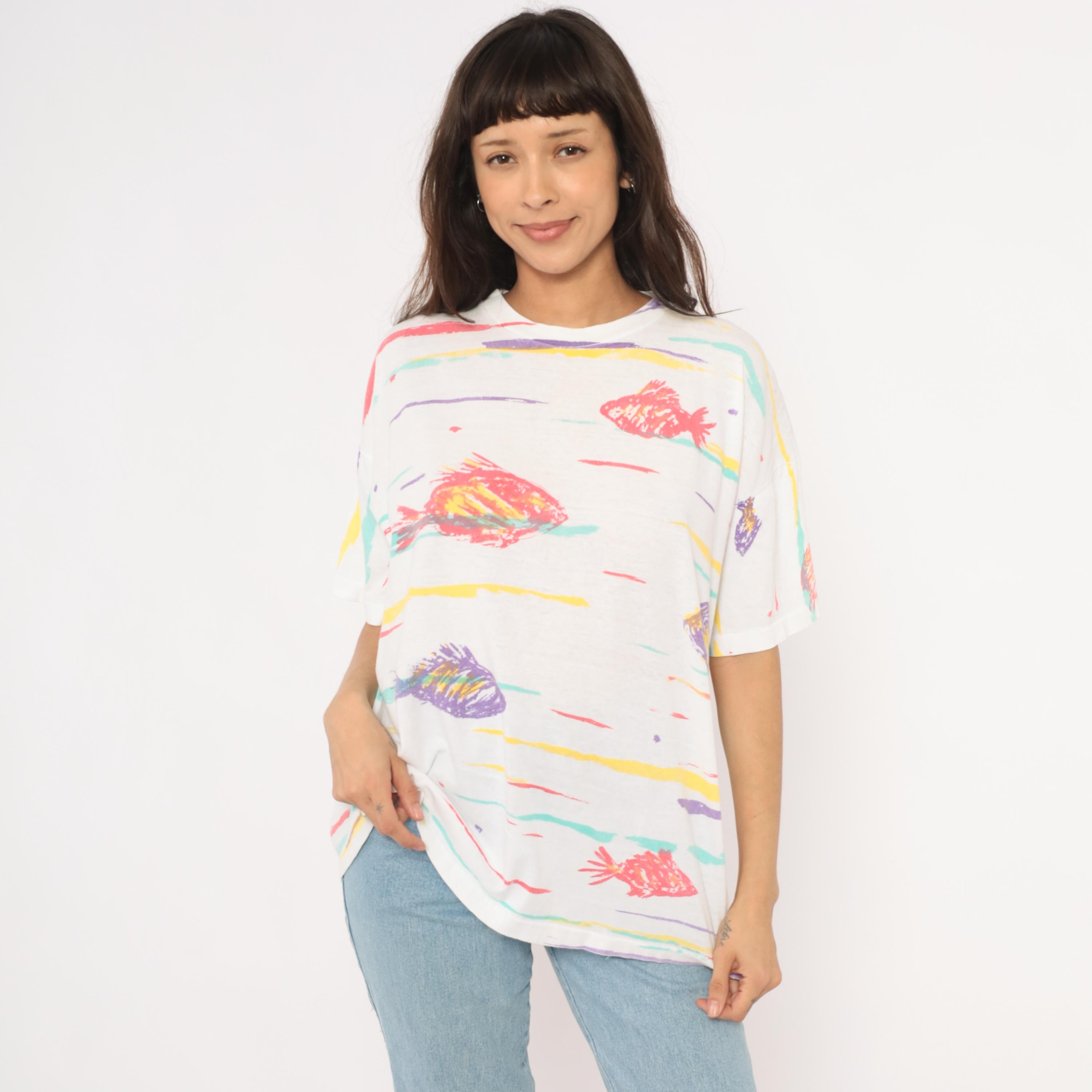 90s white crew neck tee with an allover painterly fish print in coral red, purple, yellow, and seafoam green. Tropical fish in various sizes swim across the fabric alongside brushstroke wave lines in coordinating colors.