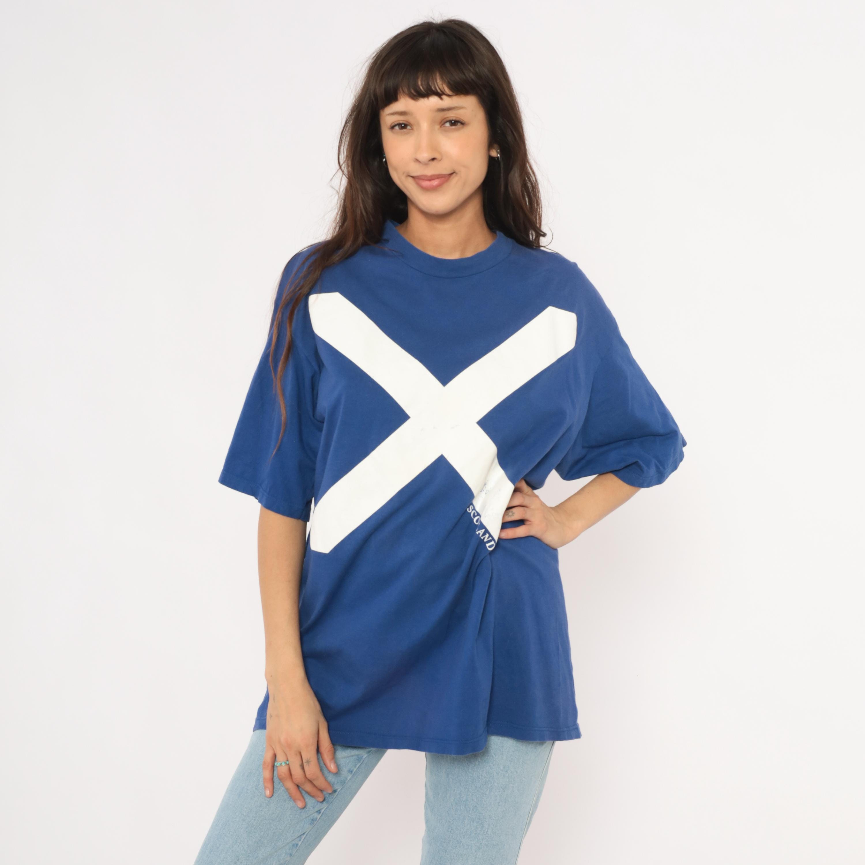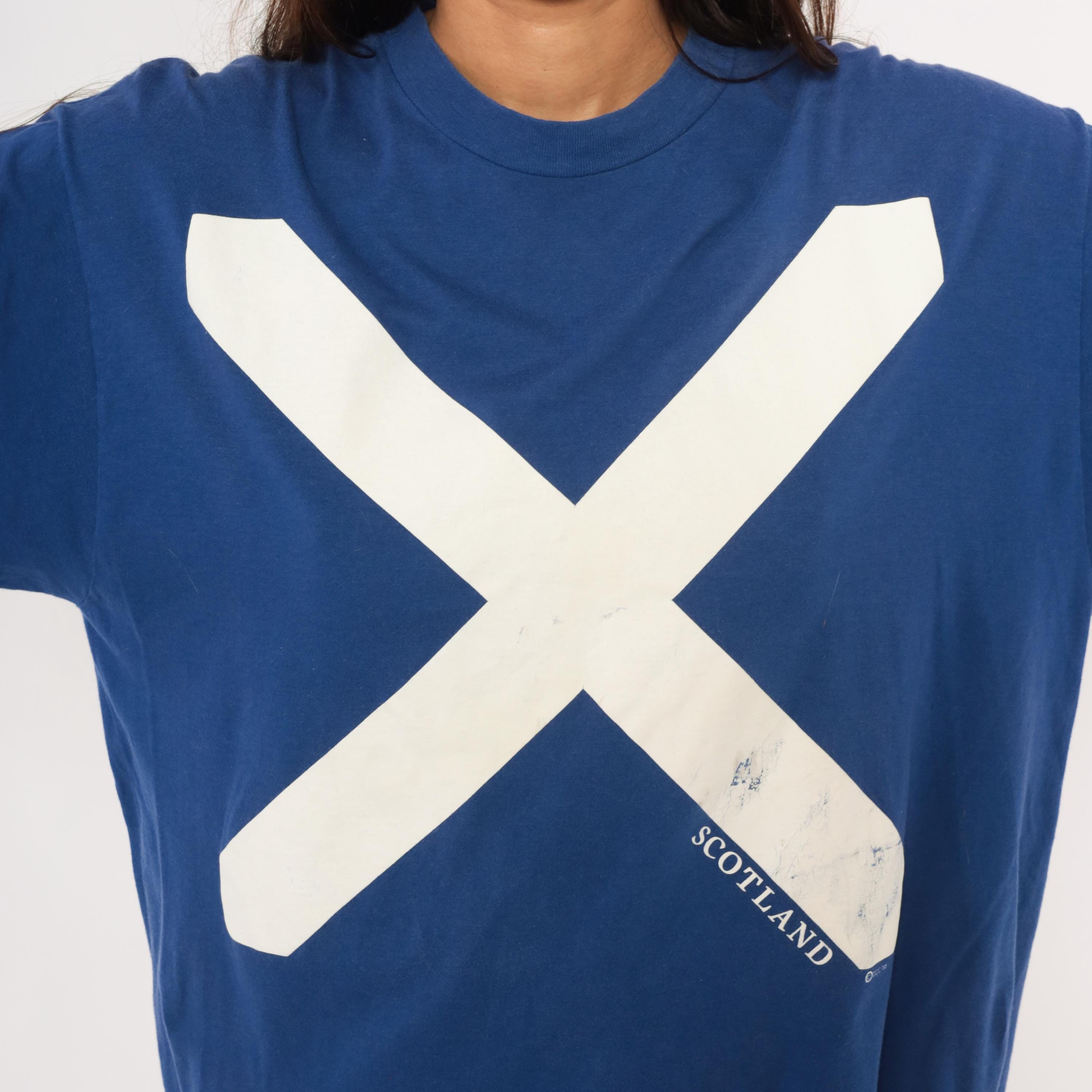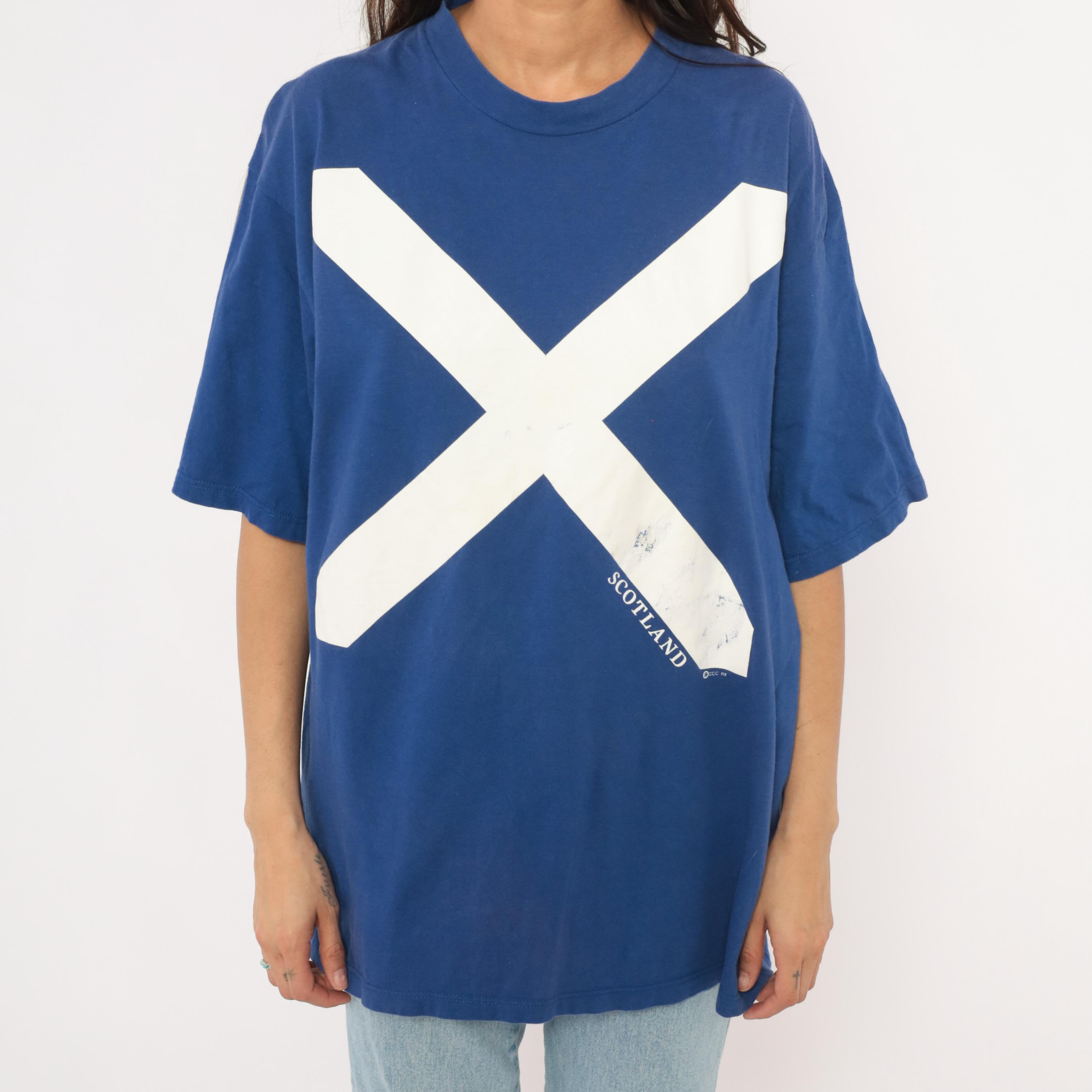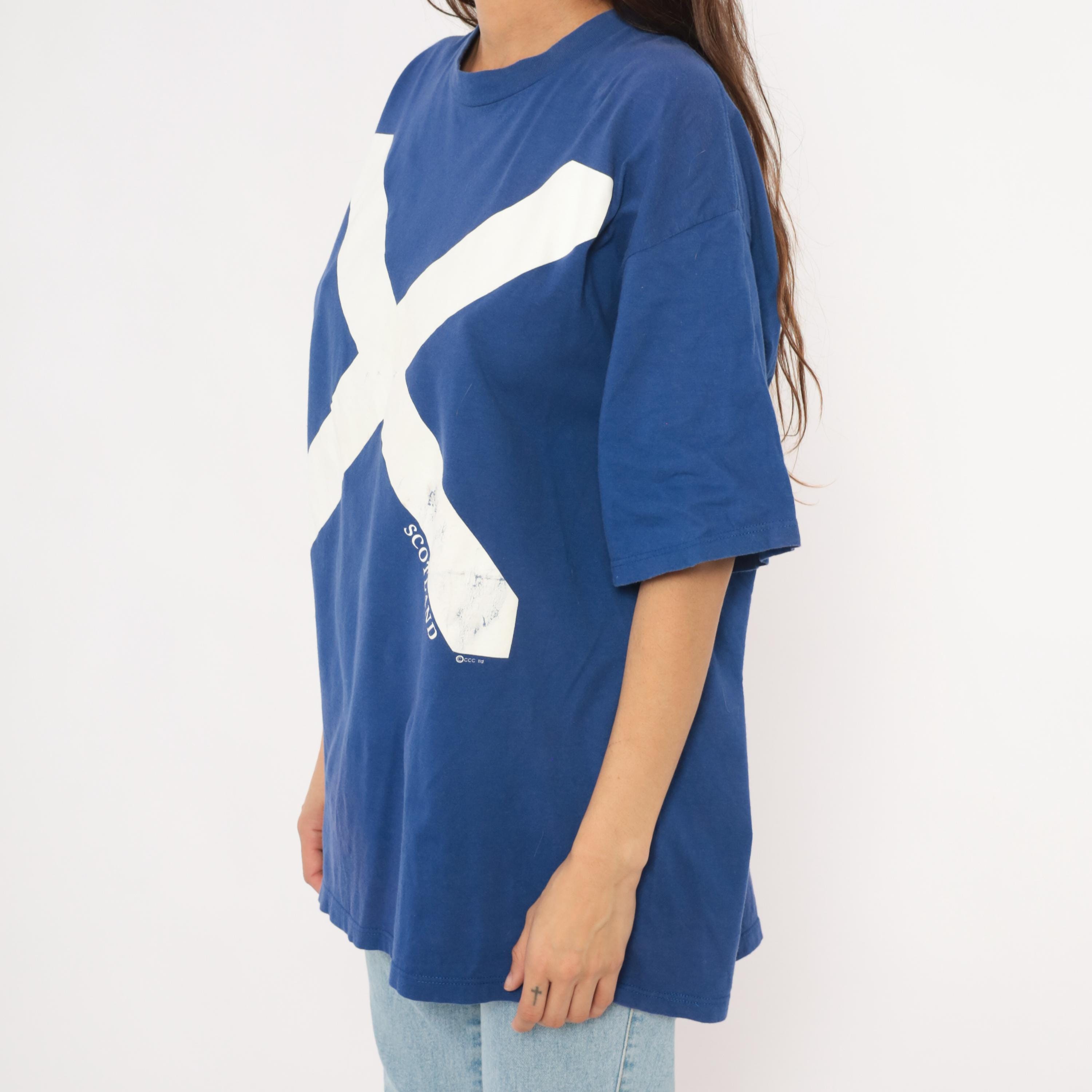 90s cobalt blue graphic tee from Jerzees with a large white saltire cross printed across the front, representing the Scottish flag. "SCOTLAND" text printed along the lower right diagonal of the cross. Crew neck, short sleeves, and a boxy relaxed silhouette with a plain back.